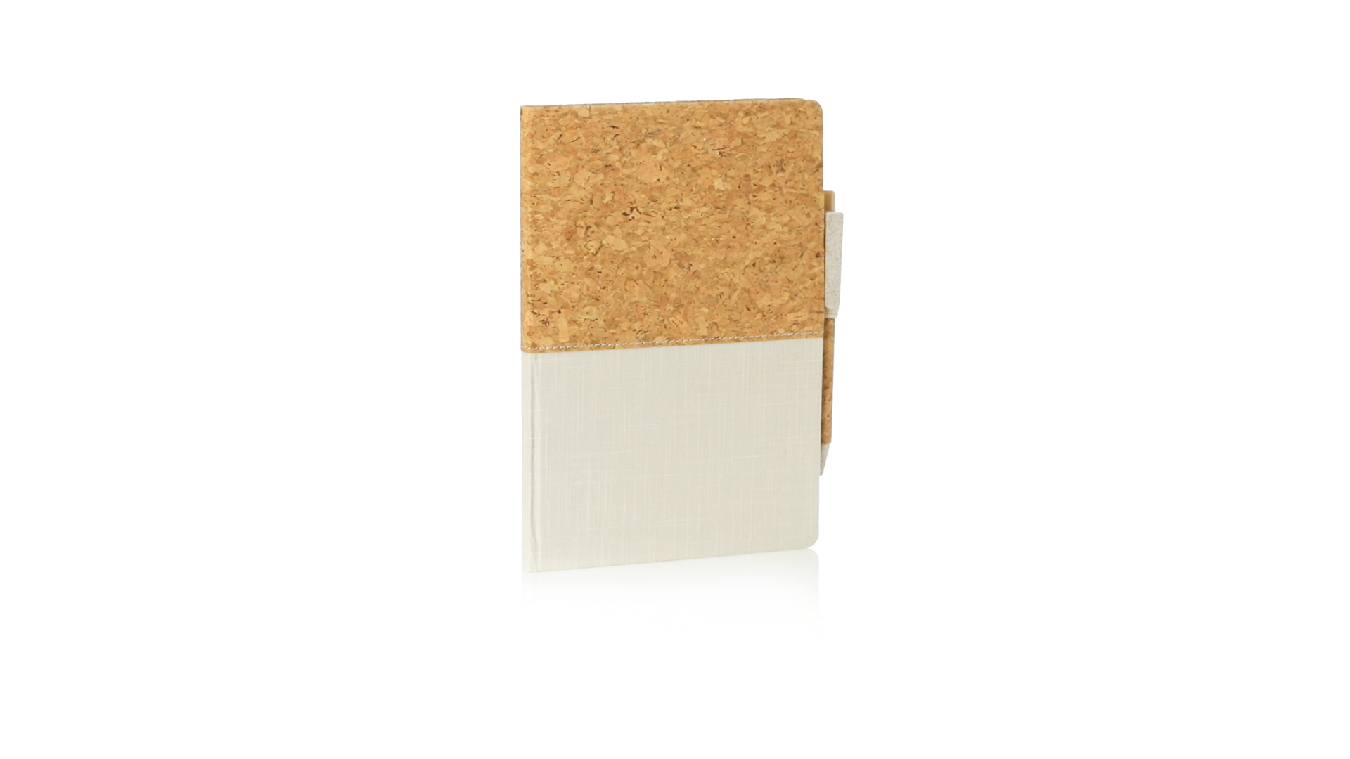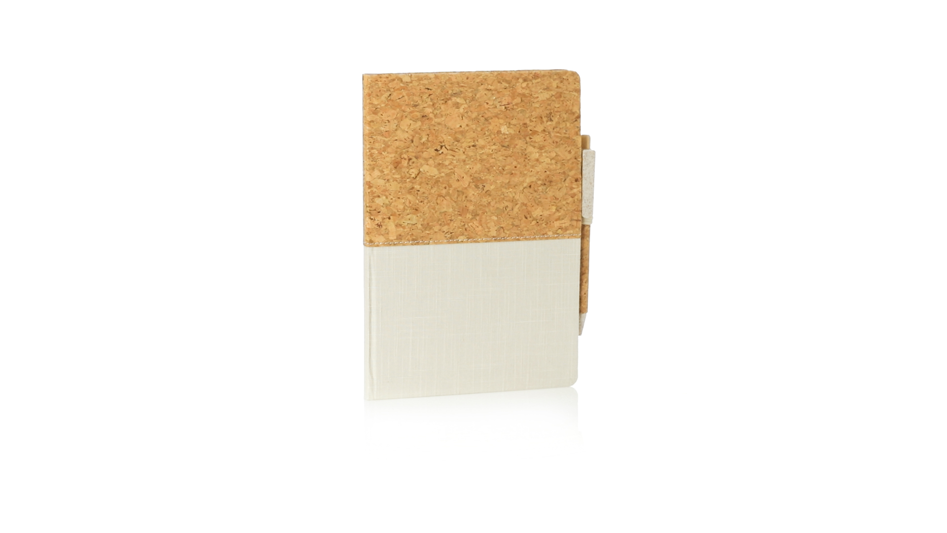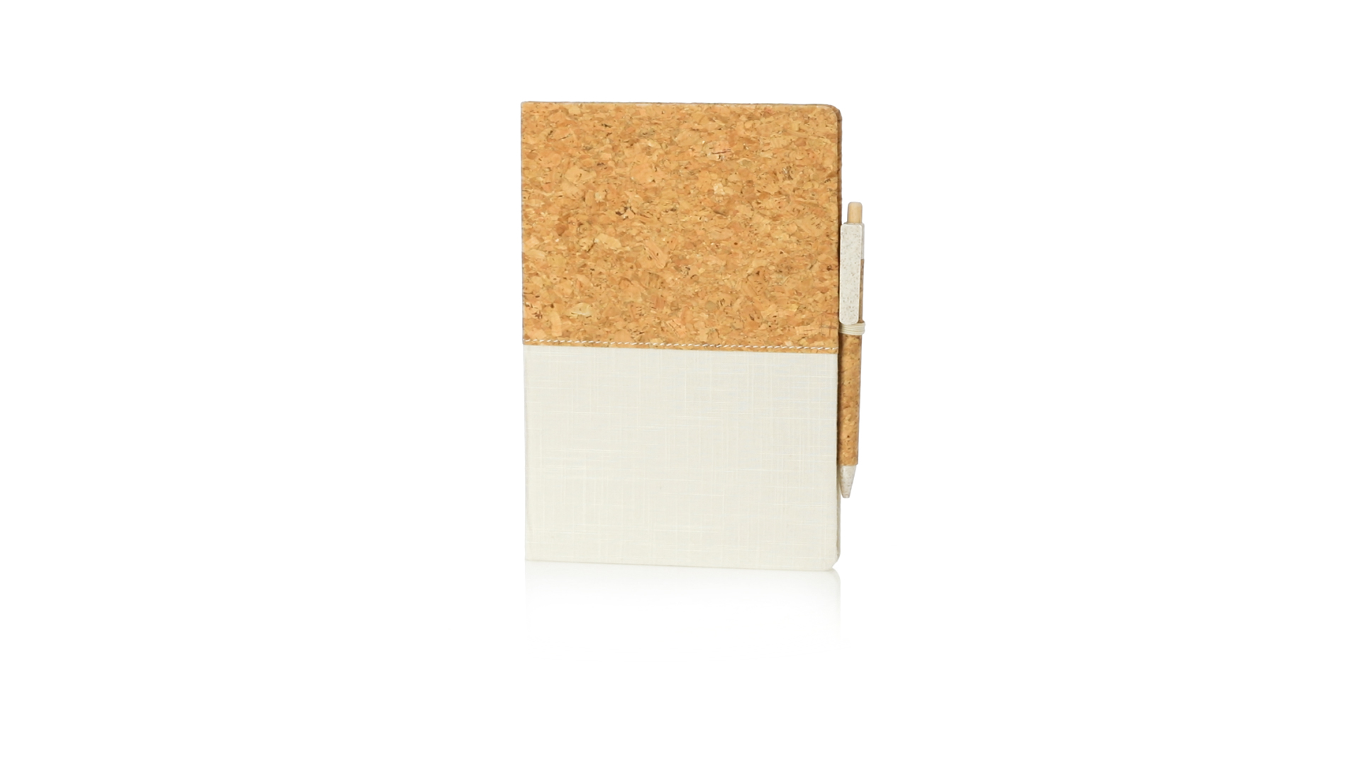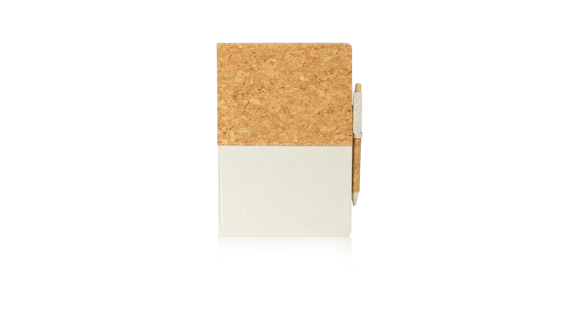 Notizblock mit Kugelschreiber aus unserer Naturlinie. Notizbuch mit festem Einband aus Naturkork und Baumwolle, mit Kugelschreiberhalter und 80 einfachen Blättern. Kugelschreiber mit Push-up-Mechanismus, mit Korkkörper aus Naturkork und Zubehör aus Weizenstroh, um die Verwendung natürlicher Rohstoffe zu fördern und die Schadstoffemissionen zu reduzieren. Schwarze Tinte.