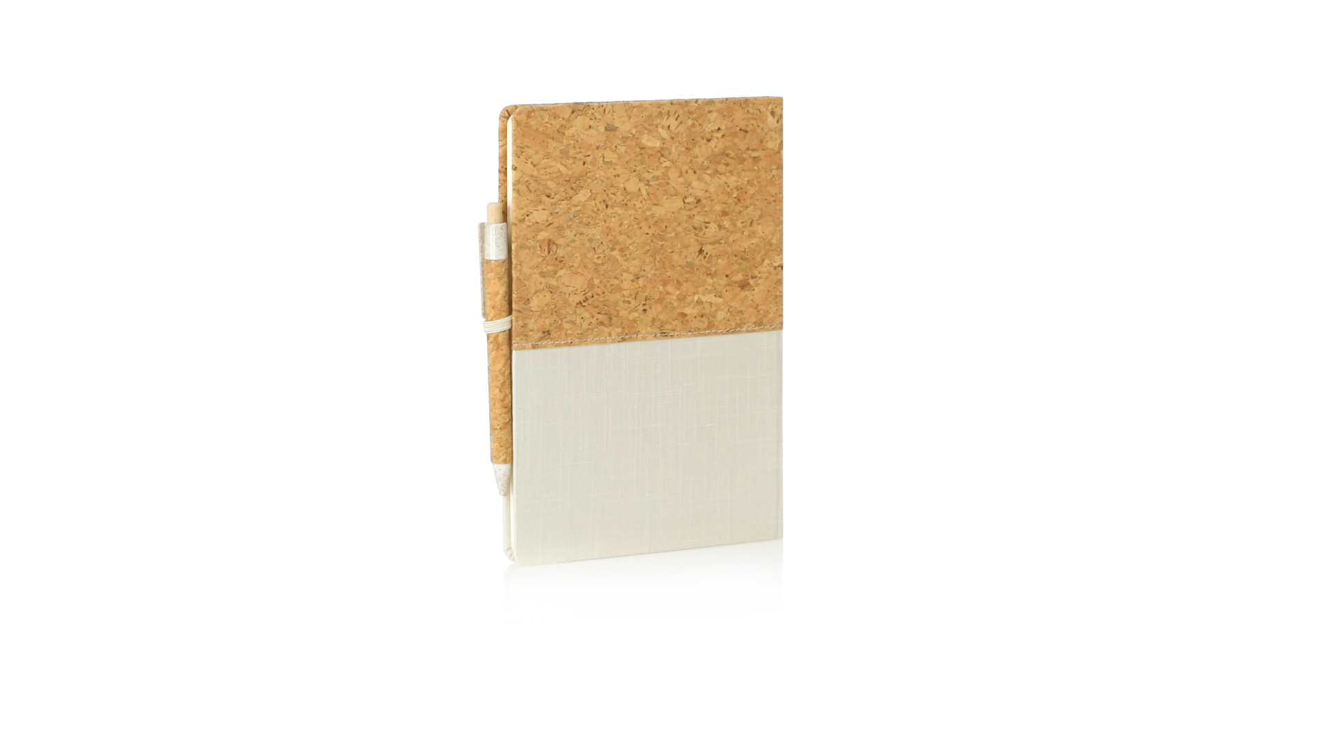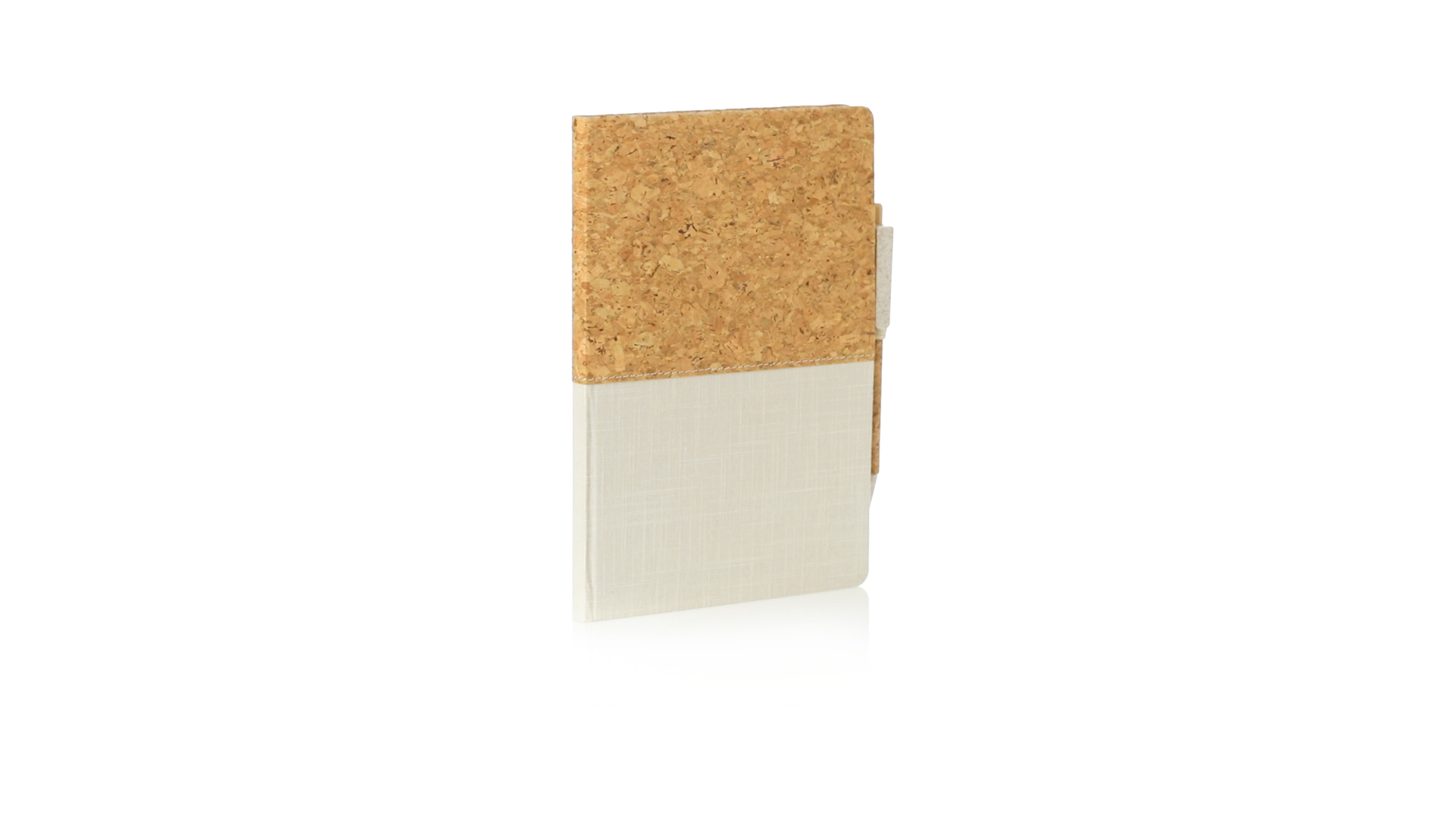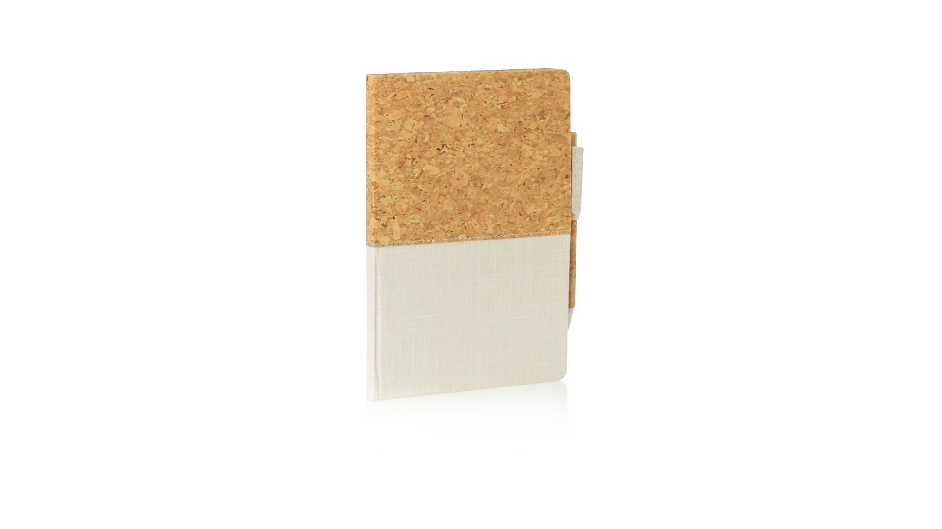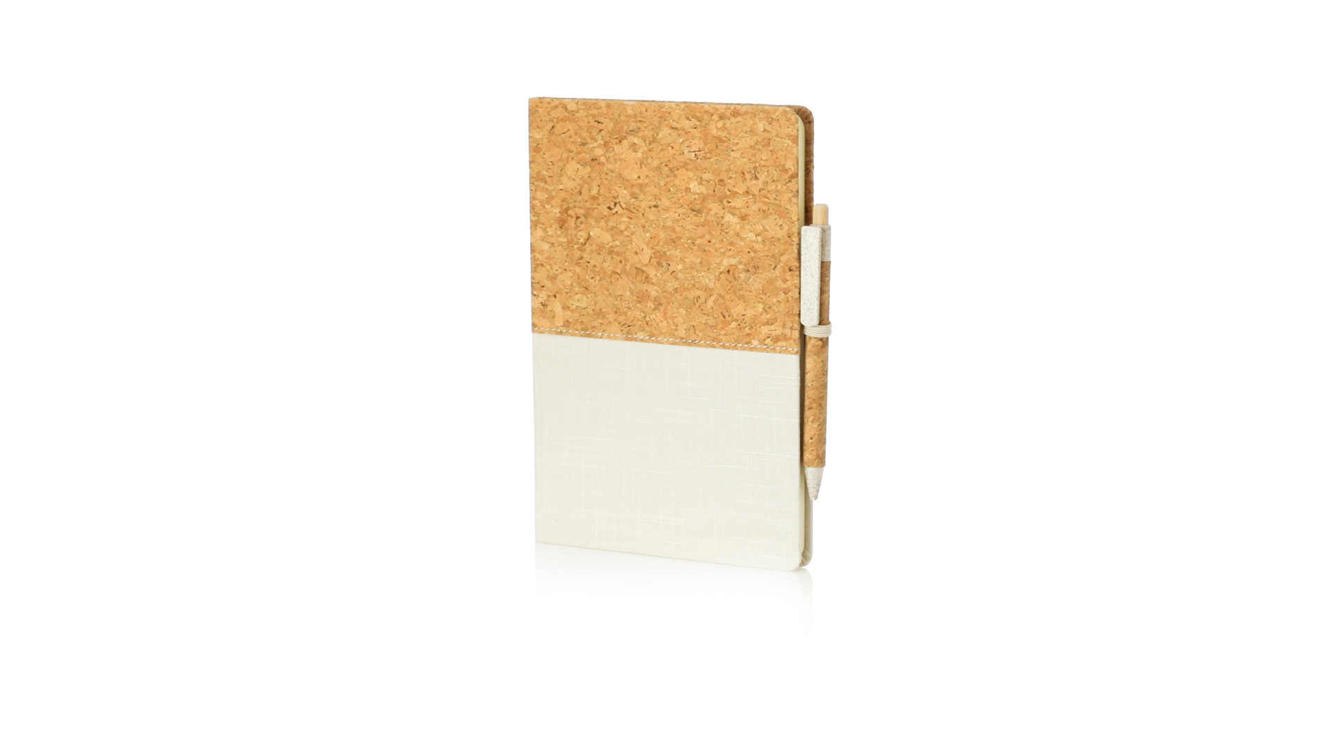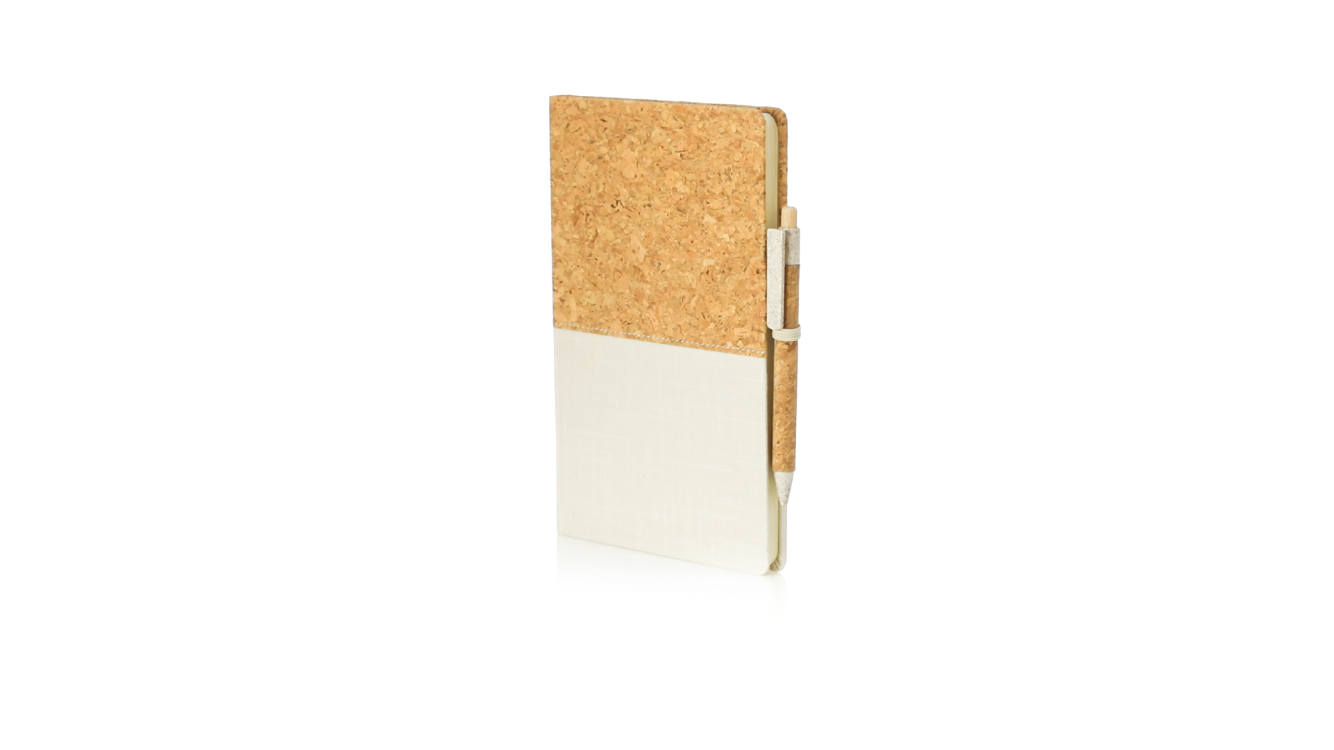 Notizblock mit Kugelschreiber aus unserer Naturlinie. Notizbuch mit festem Einband aus Naturkork und Baumwolle, mit Kugelschreiberhalter und 80 einfachen Blättern. Kugelschreiber mit Push-up-Mechanismus, mit Korkkörper aus Naturkork und Zubehör aus Weizenstroh, um die Verwendung natürlicher Rohstoffe zu fördern und die Schadstoffemissionen zu reduzieren. Schwarze Tinte.