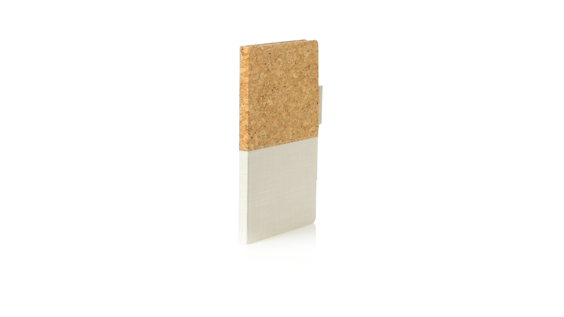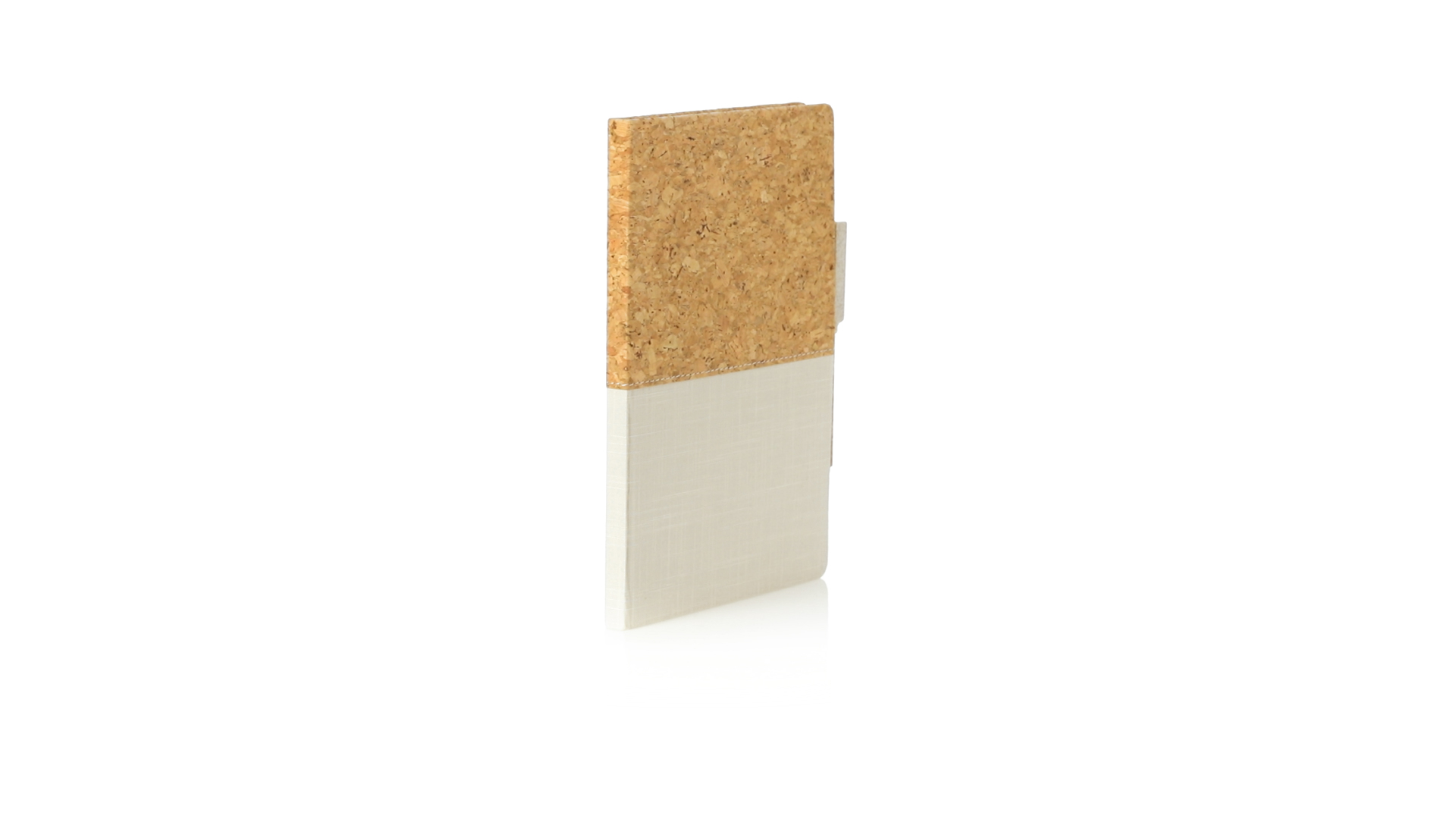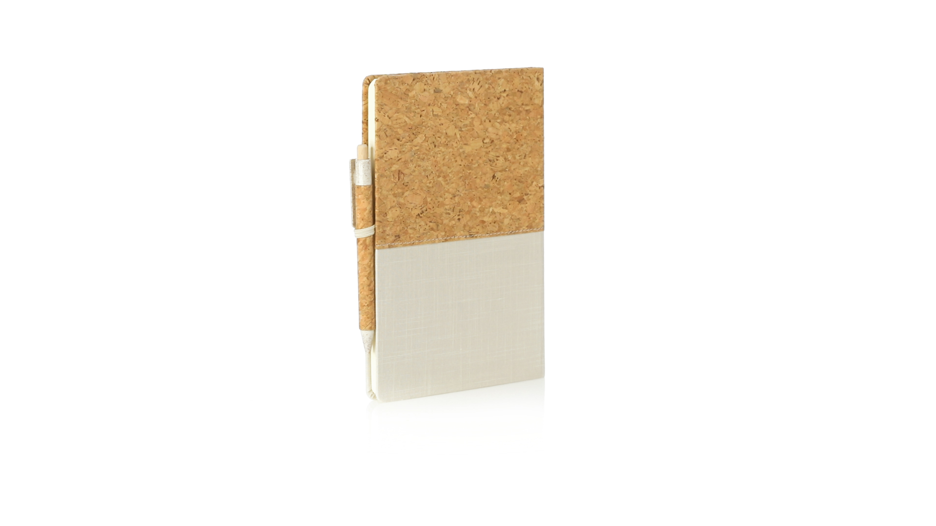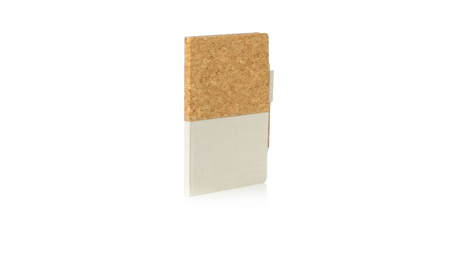Notizblock mit Kugelschreiber aus unserer Naturlinie. Notizbuch mit festem Einband aus Naturkork und Baumwolle, mit Kugelschreiberhalter und 80 einfachen Blättern. Kugelschreiber mit Push-up-Mechanismus, mit Korkkörper aus Naturkork und Zubehör aus Weizenstroh, um die Verwendung natürlicher Rohstoffe zu fördern und die Schadstoffemissionen zu reduzieren. Schwarze Tinte.
