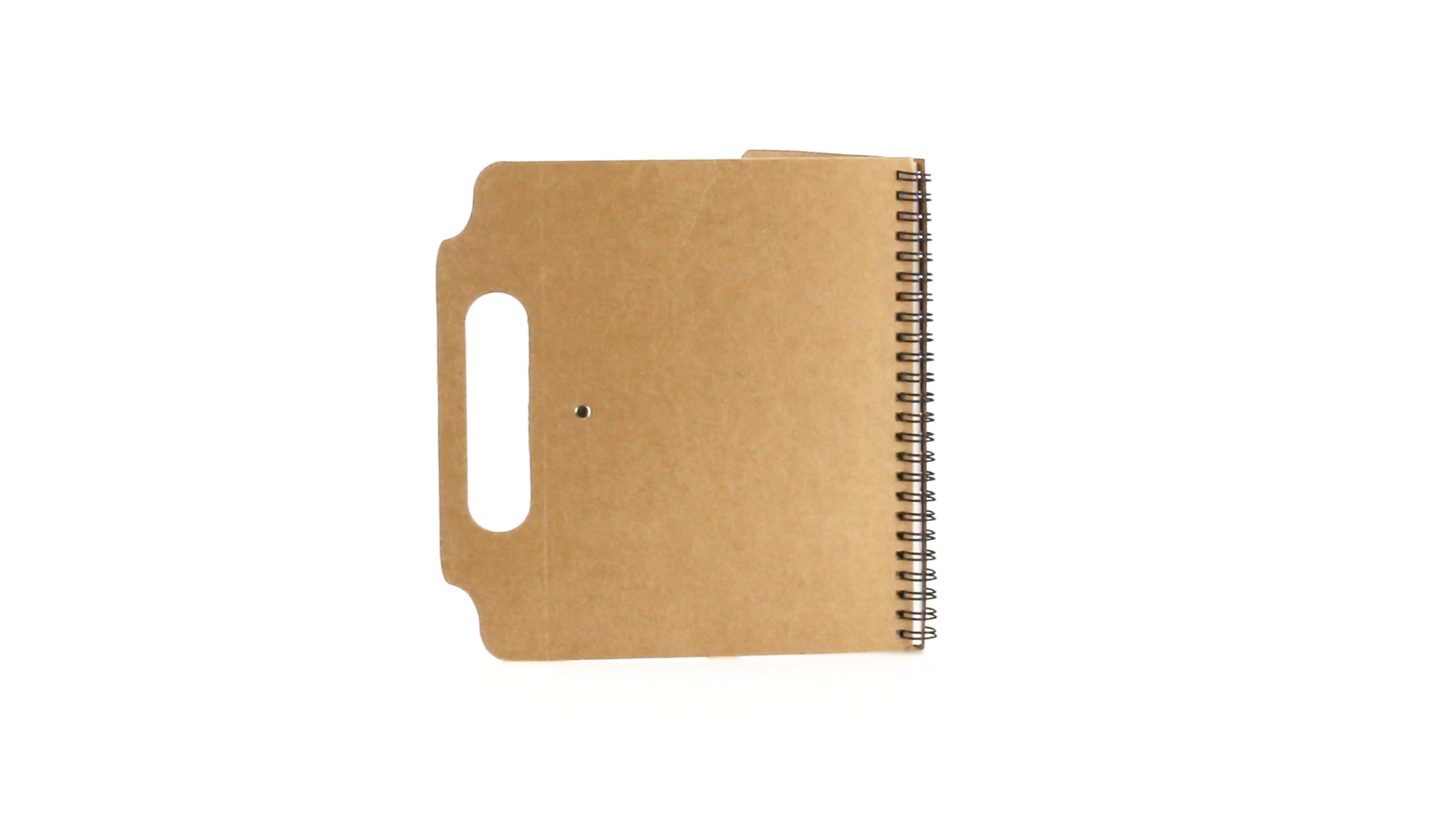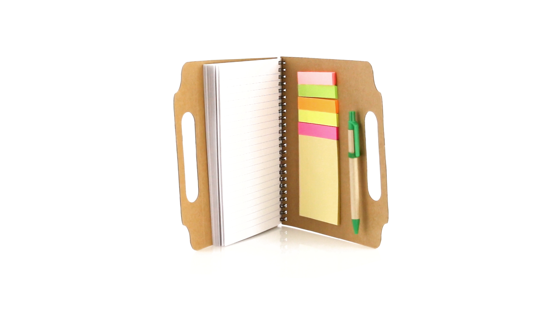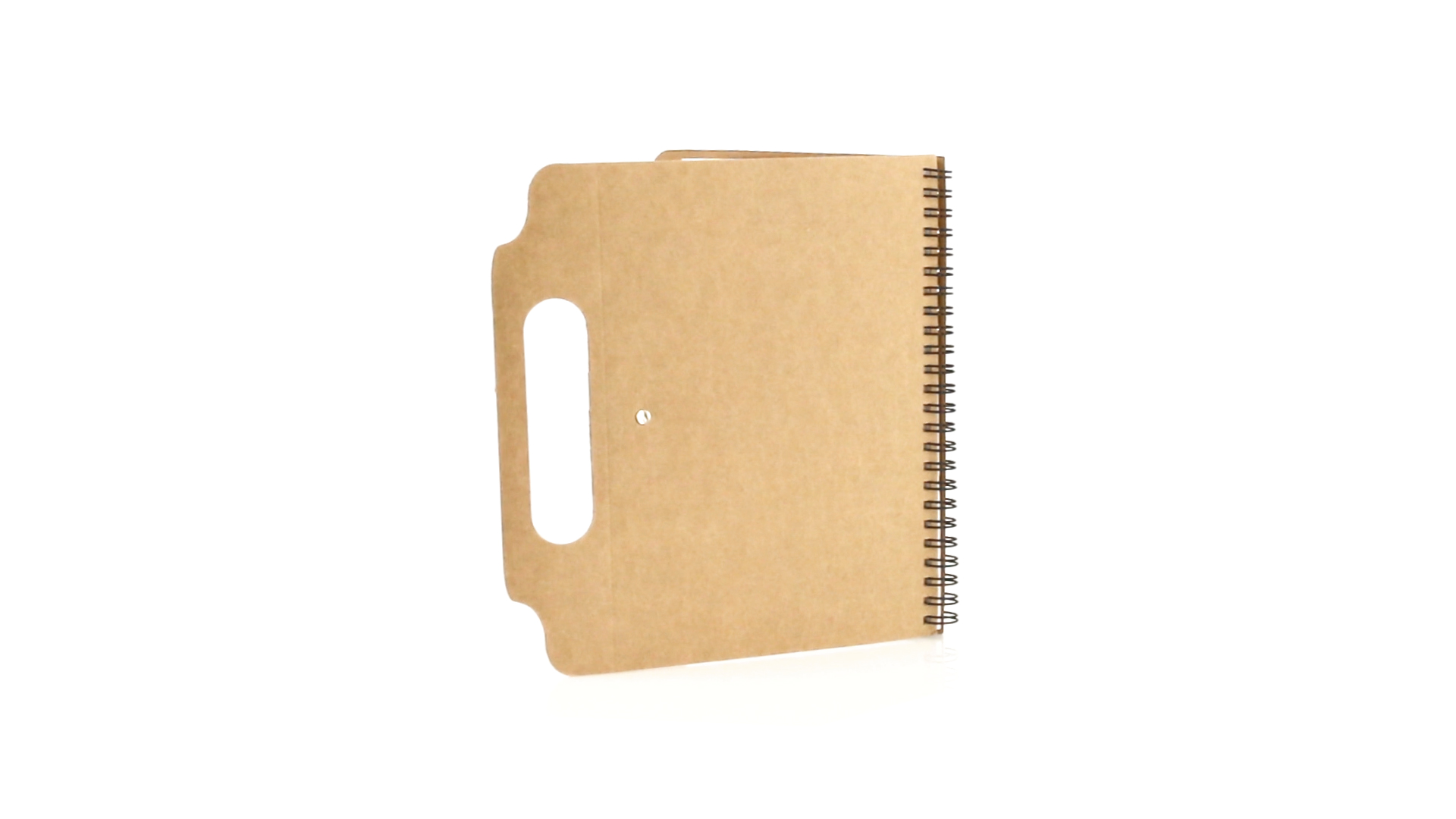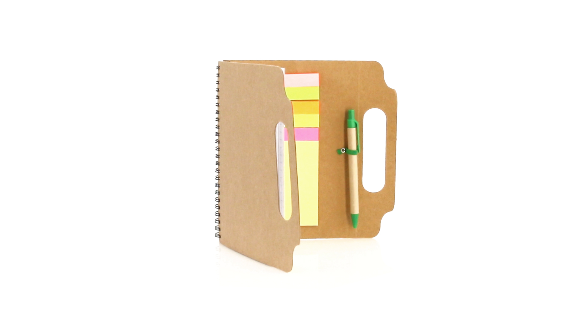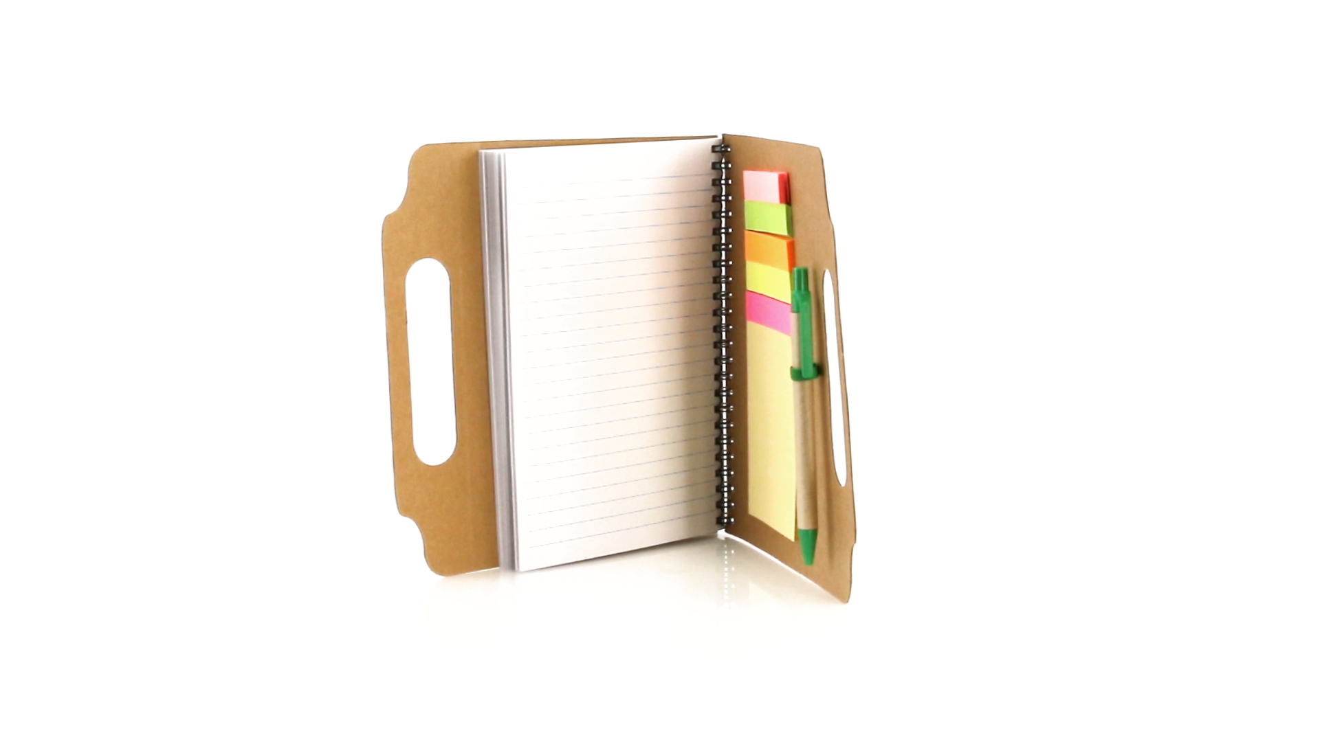 Ring-Notizblock mit Haftnotizen am Deckelinneren sowie Kugelschreiber aus Recyclingkarton. Originelles Design mit gestanztem Tragegriff und Soft-Touch-Cover aus widerstandsfähigem, stabilem Recyclingkarton. Mit integriertem Kugelschreiberhalter sowie 70 linierten Blättern, 25 mittelgrossen Haftnotizen und 125 Mini-Haftnotizen.