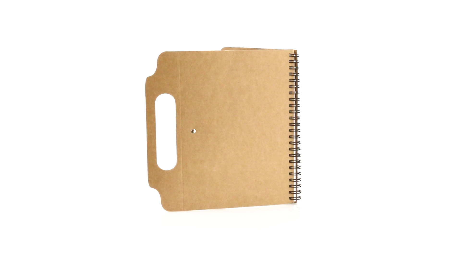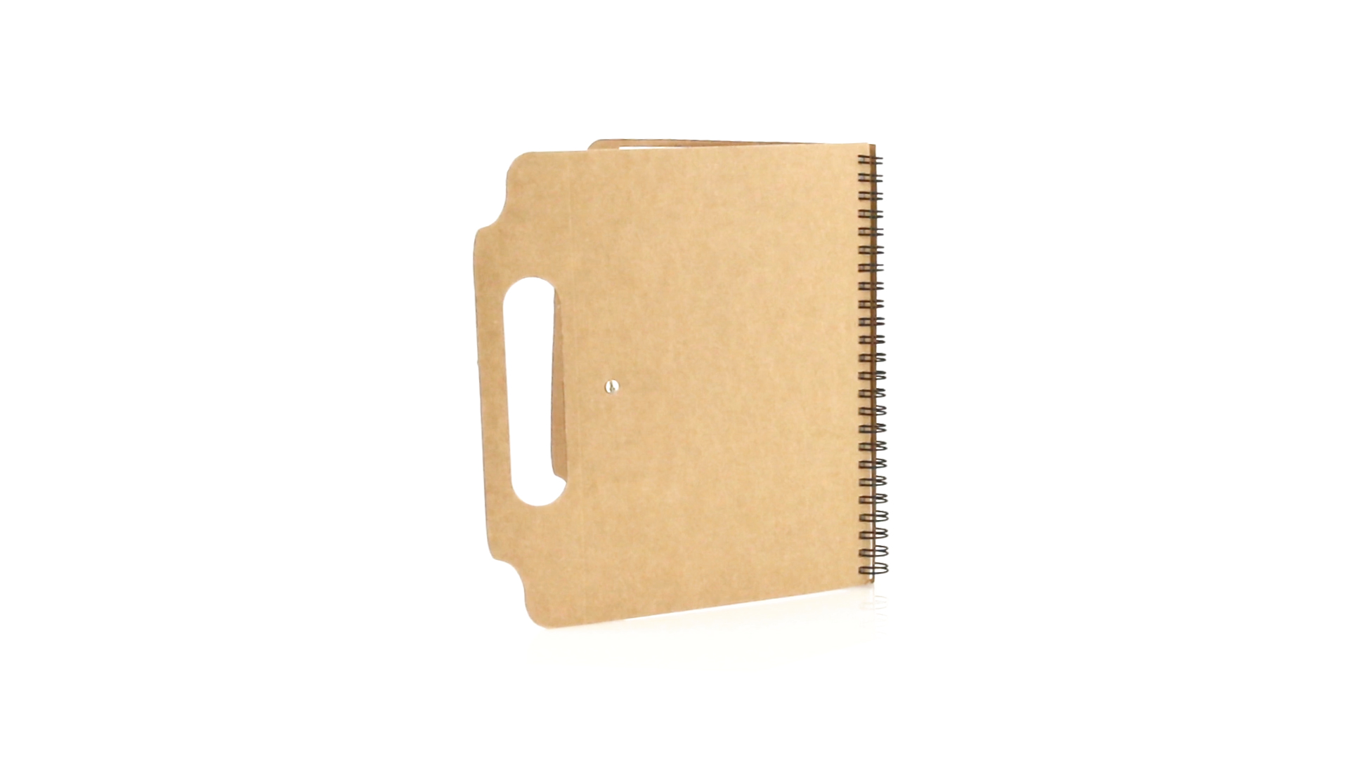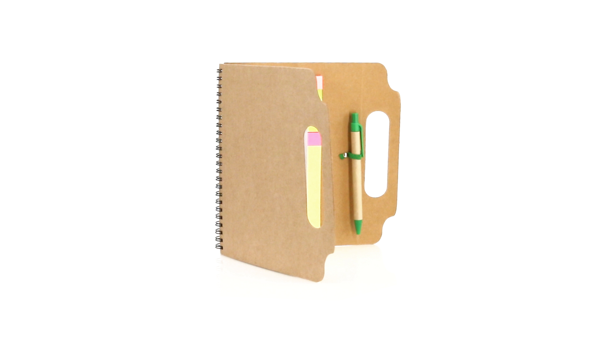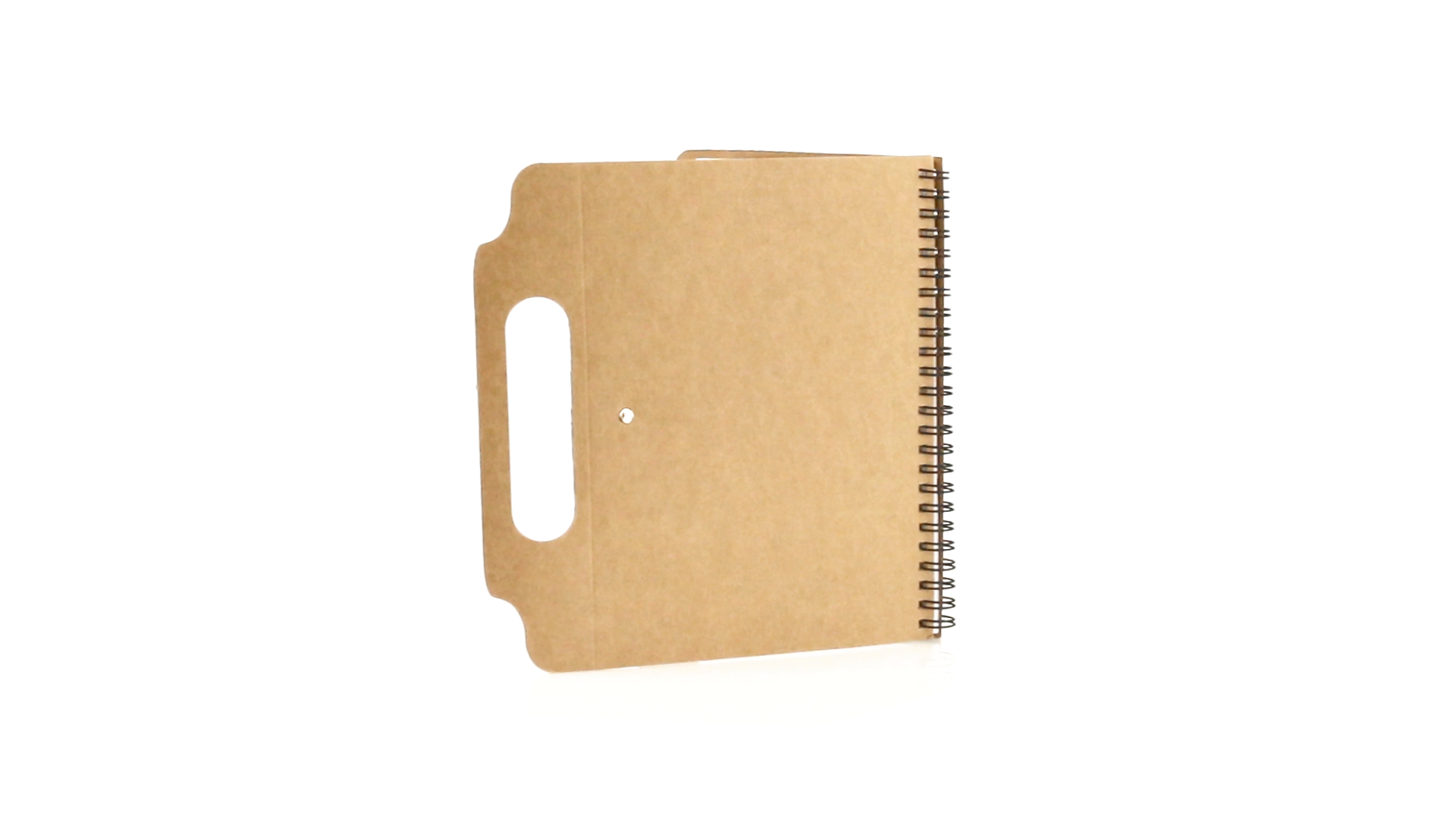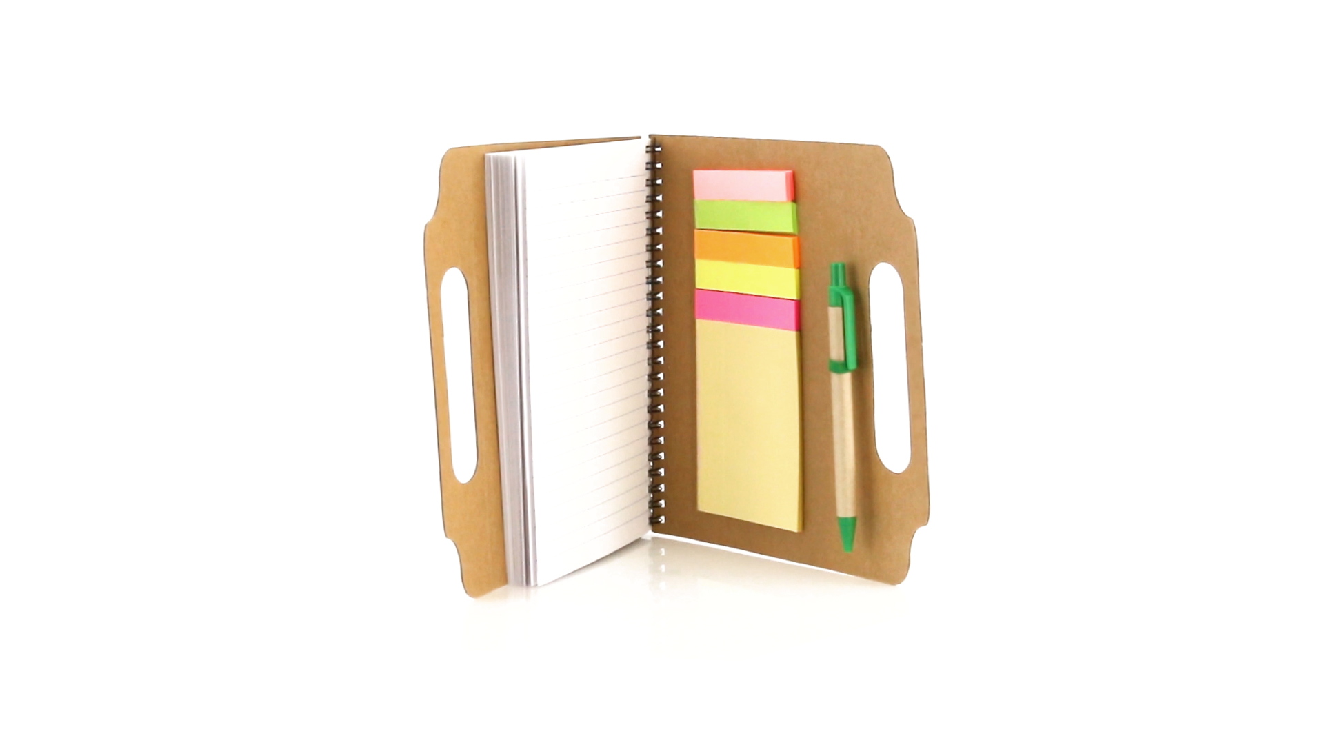 Ring-Notizblock mit Haftnotizen am Deckelinneren sowie Kugelschreiber aus Recyclingkarton. Originelles Design mit gestanztem Tragegriff und Soft-Touch-Cover aus widerstandsfähigem, stabilem Recyclingkarton. Mit integriertem Kugelschreiberhalter sowie 70 linierten Blättern, 25 mittelgrossen Haftnotizen und 125 Mini-Haftnotizen.