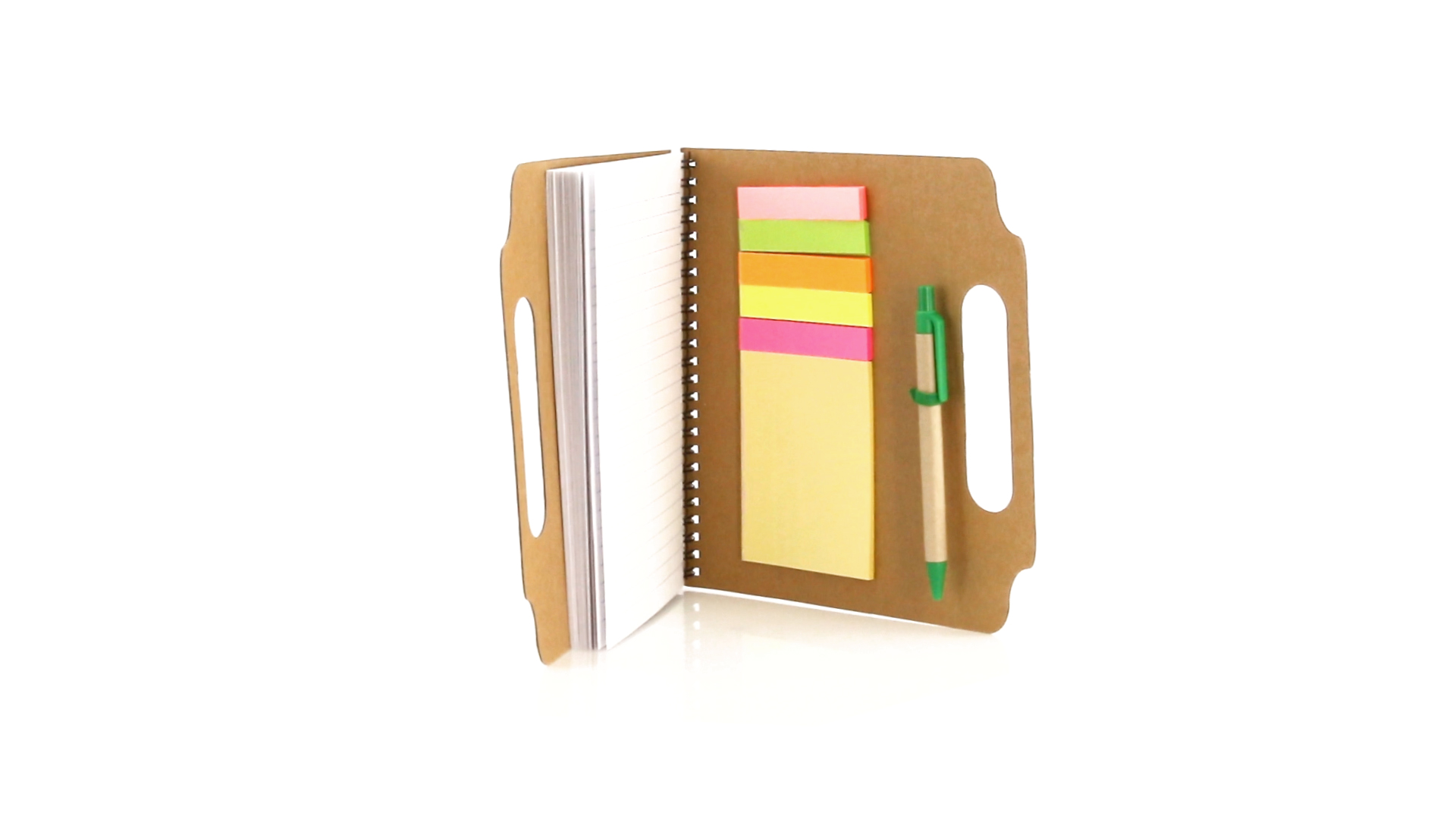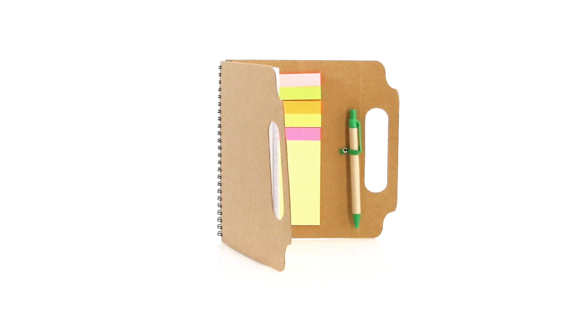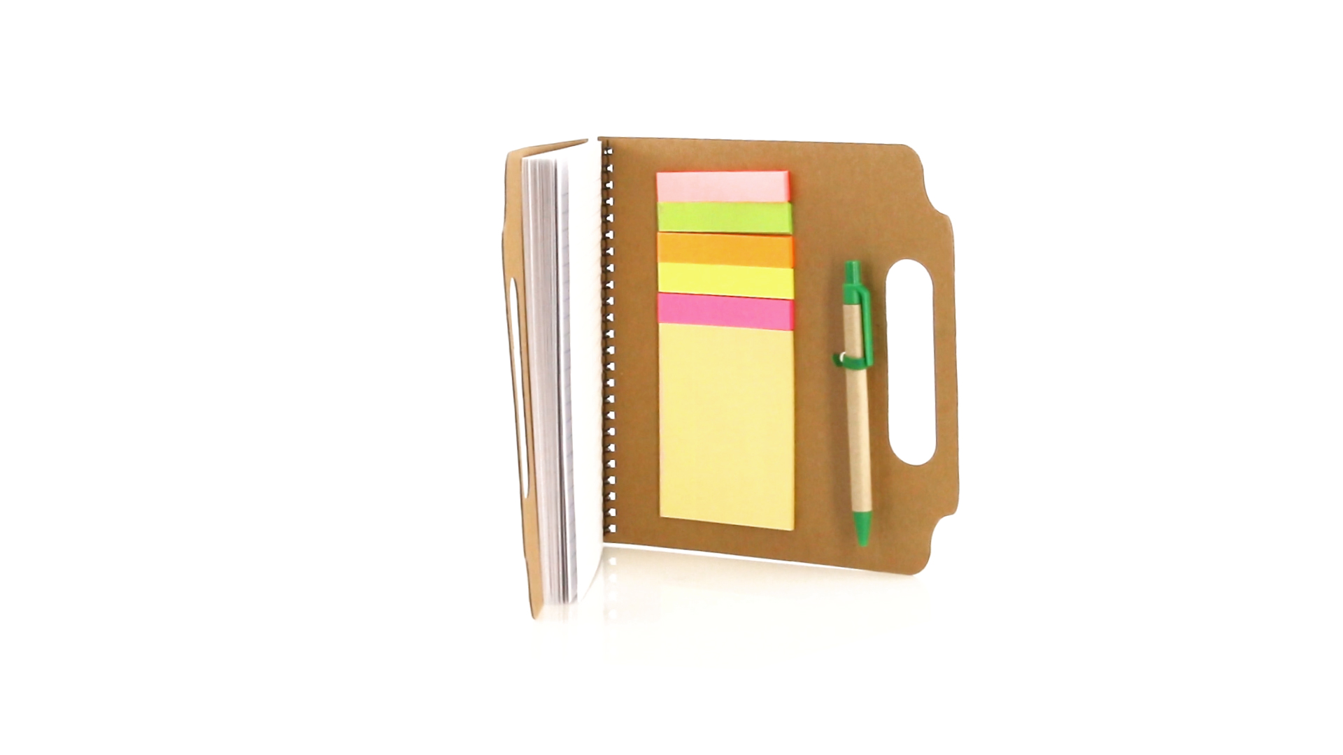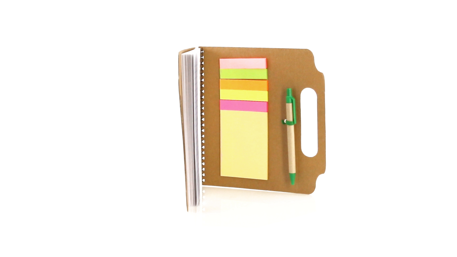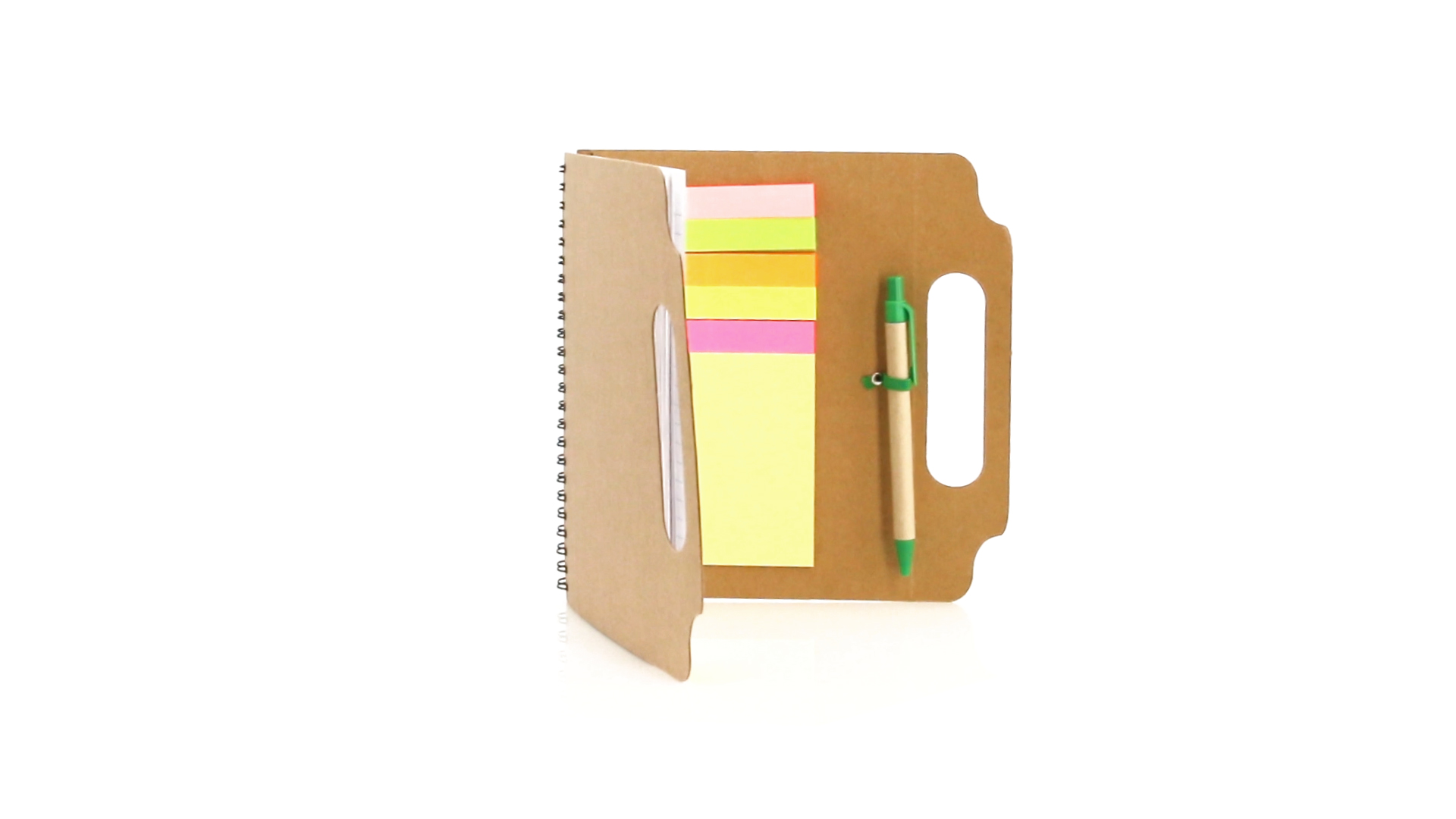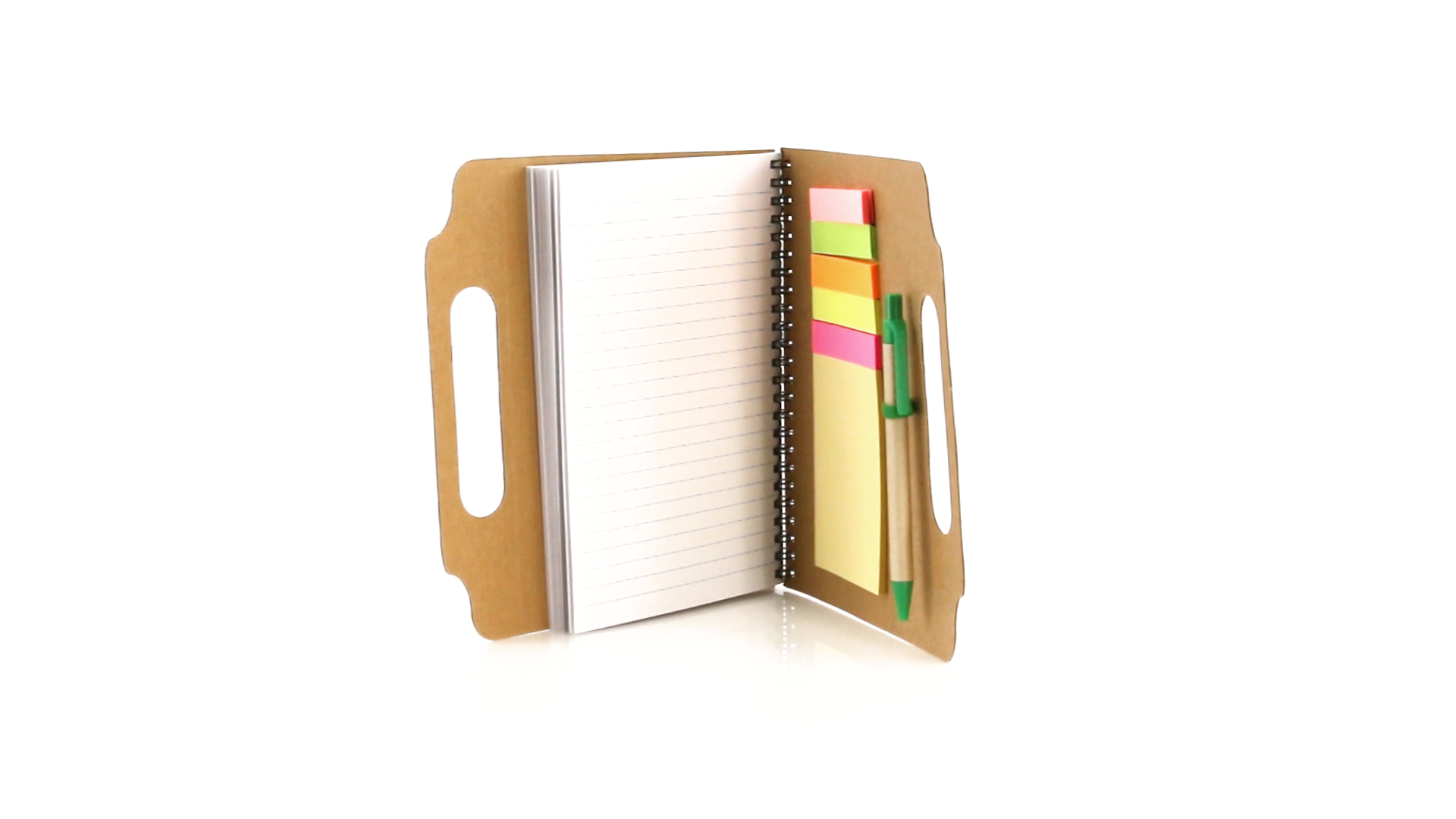 Ring-Notizblock mit Haftnotizen am Deckelinneren sowie Kugelschreiber aus Recyclingkarton. Originelles Design mit gestanztem Tragegriff und Soft-Touch-Cover aus widerstandsfähigem, stabilem Recyclingkarton. Mit integriertem Kugelschreiberhalter sowie 70 linierten Blättern, 25 mittelgrossen Haftnotizen und 125 Mini-Haftnotizen.
