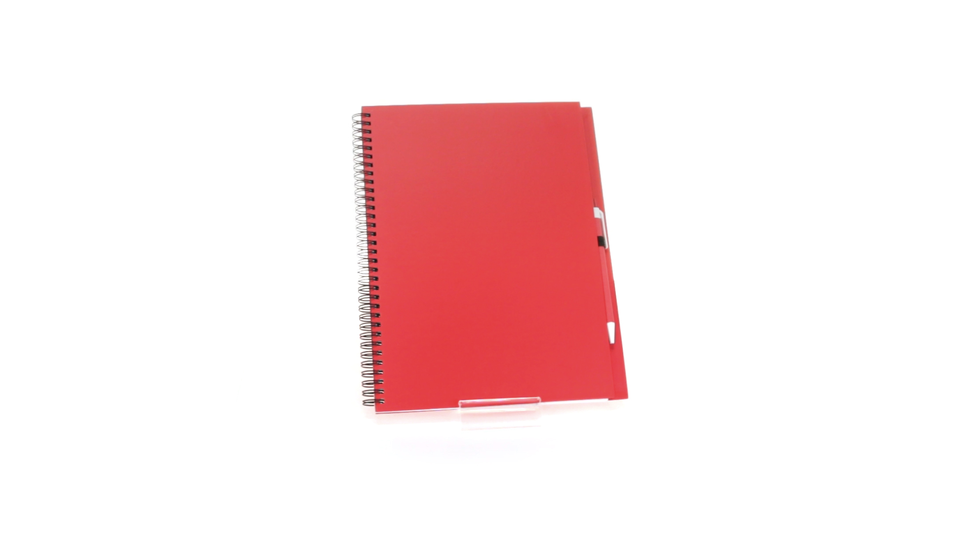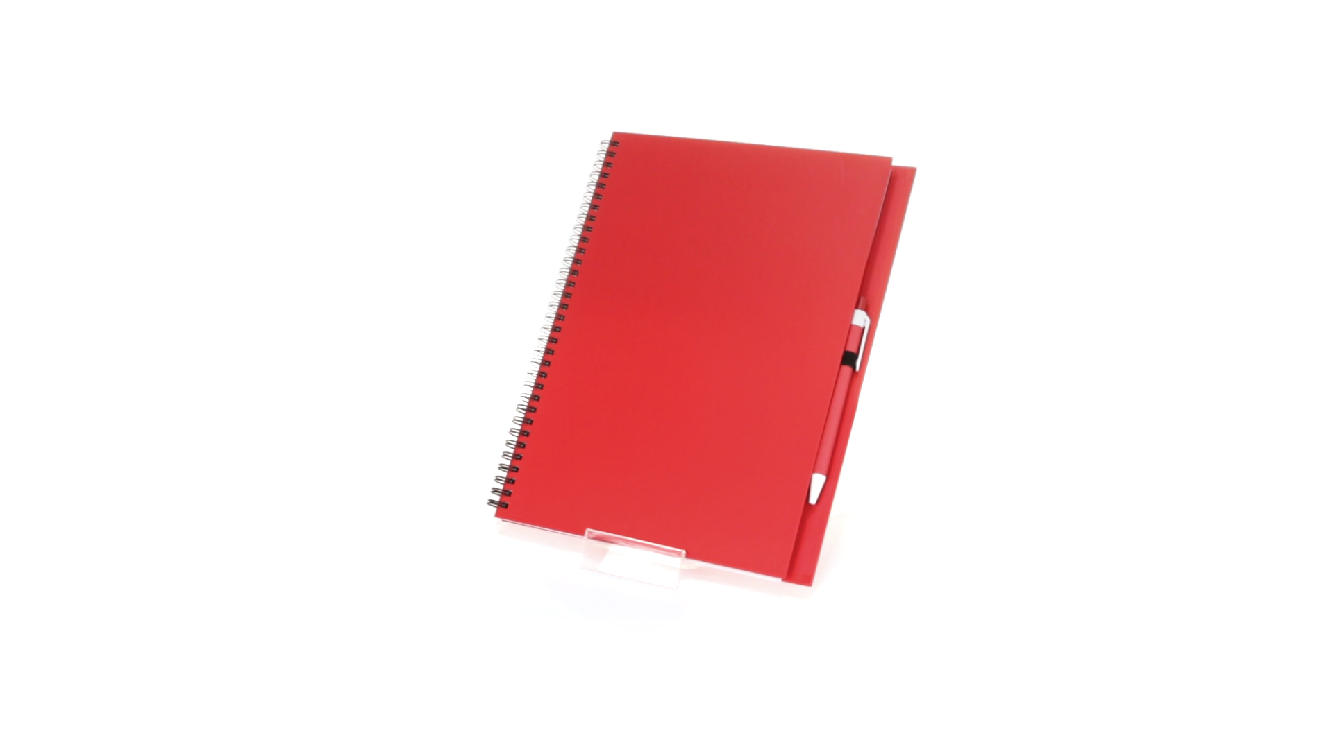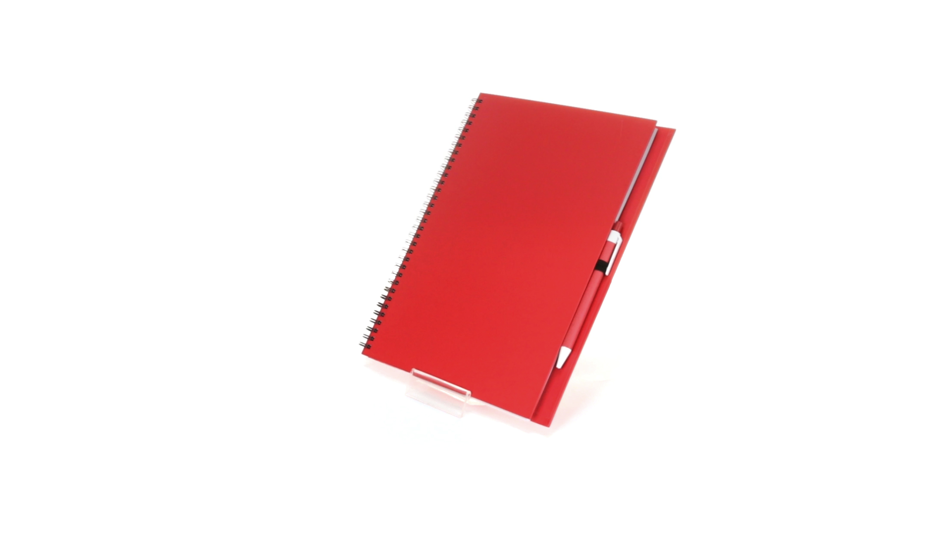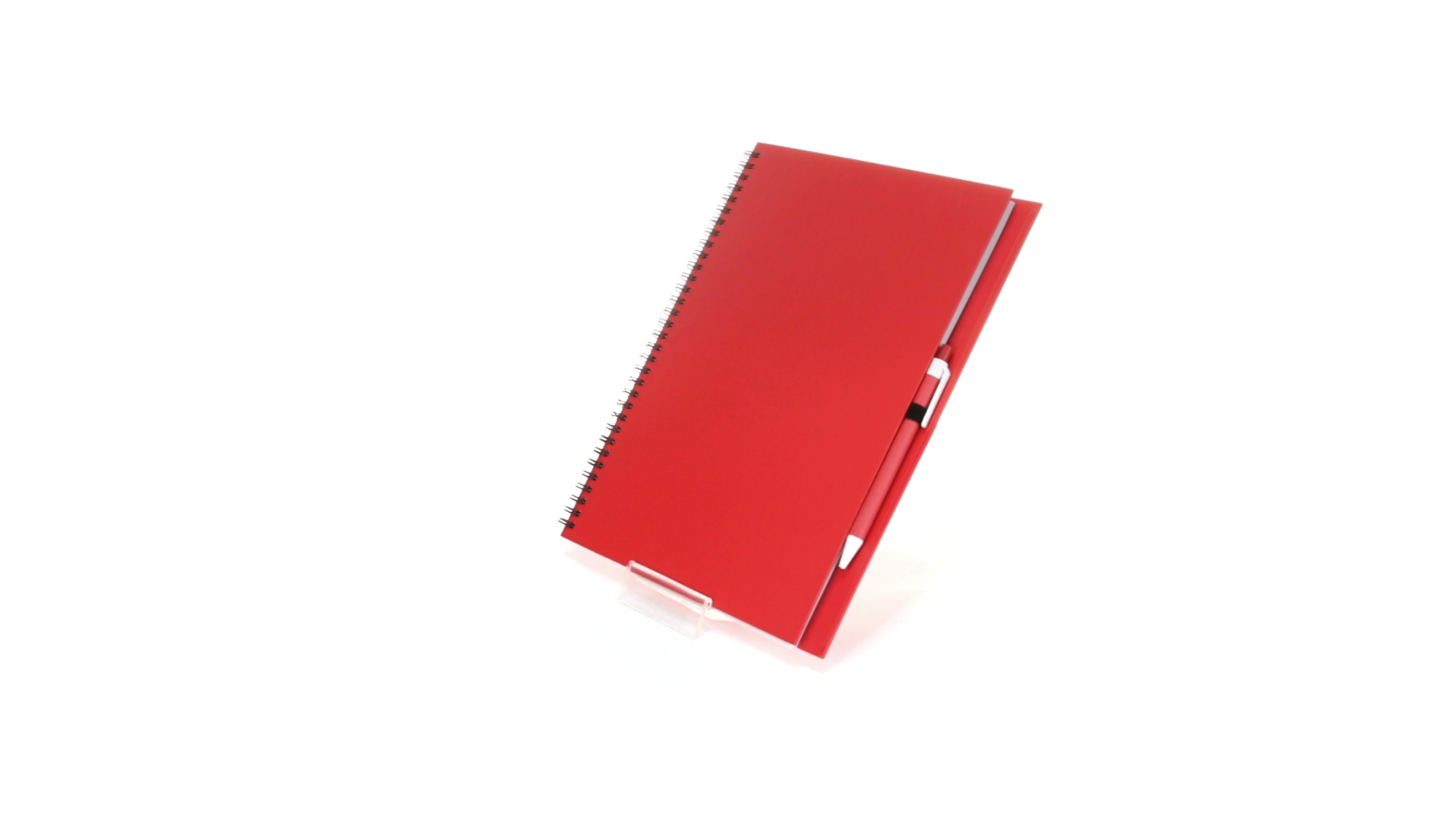 Ring-Notizbuch mit Soft-Touch-Cover aus resistentem Recyclingkarton und Kugelschreiber aus dem gleichen Material in passender Farbe. Mit 80 Blättern sowie Stifthalter auf der Rückseite. Verfügbar in verschiedenen auffälligen Farben.