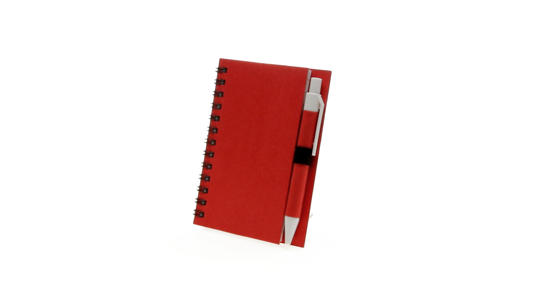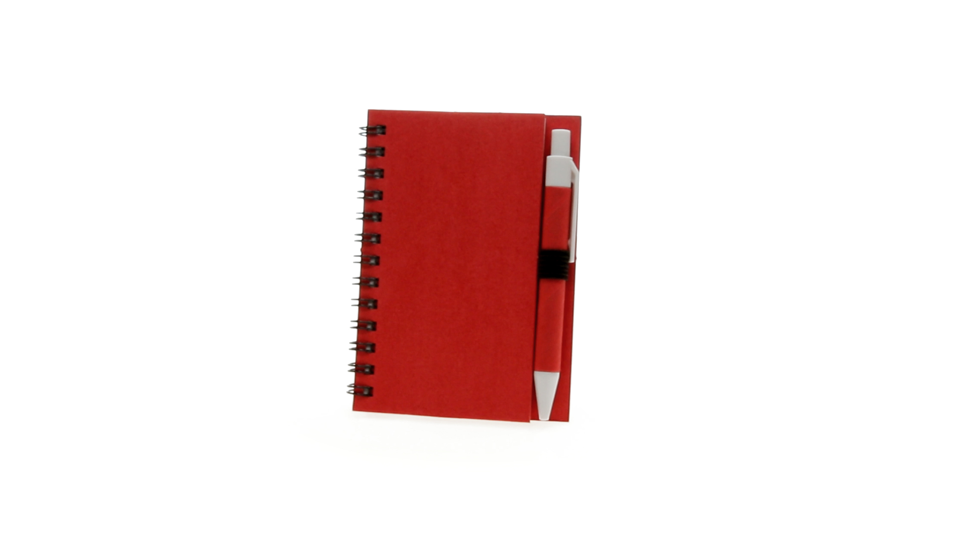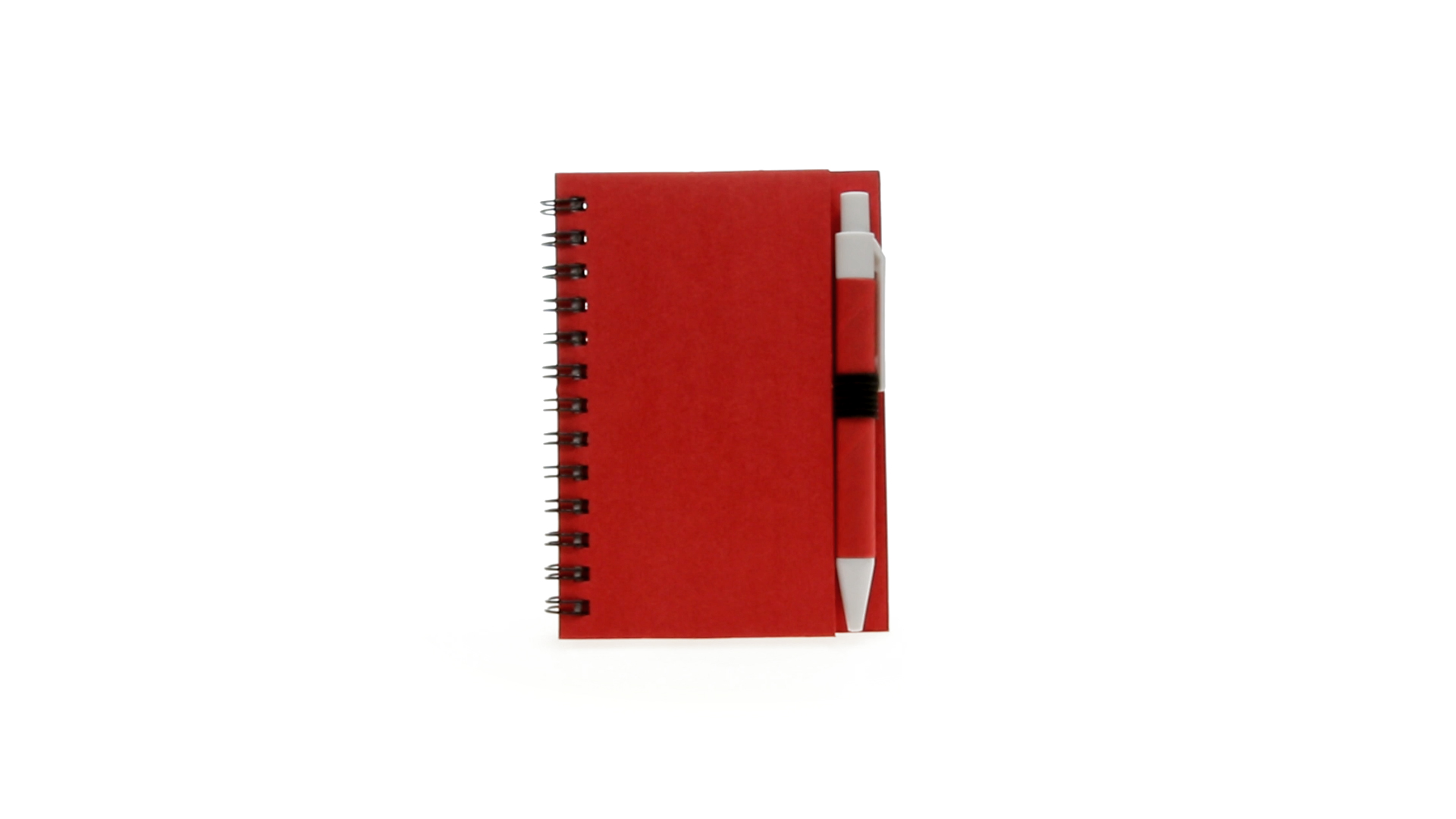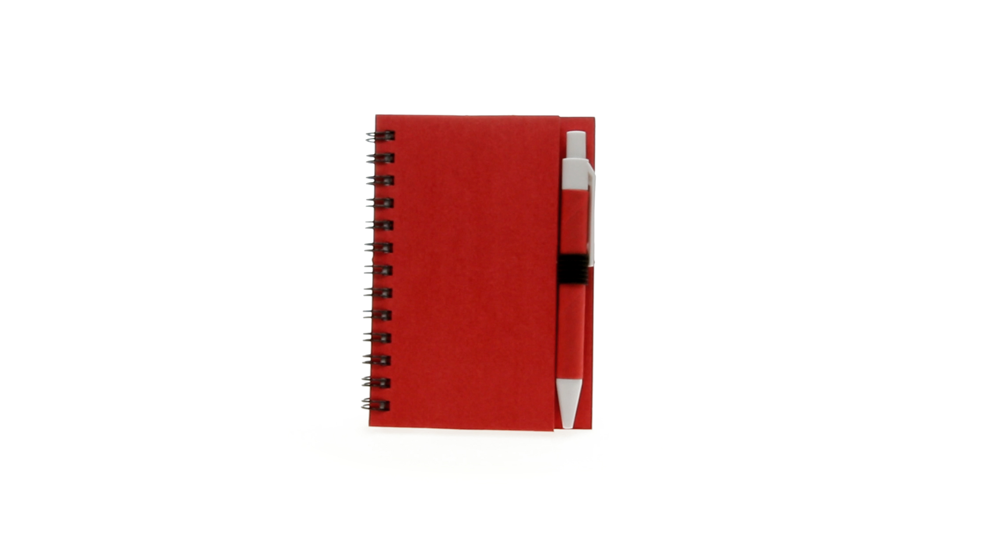 Ring-Notizbuch mit Soft-Touch-Cover aus resistentem Recyclingkarton und Kugelschreiber aus farblich passendem Recyclingkarton. In auffälligen Farben und mit 50 linierten Blättern sowie Kugelschreiberhalter auf der Rückseite.