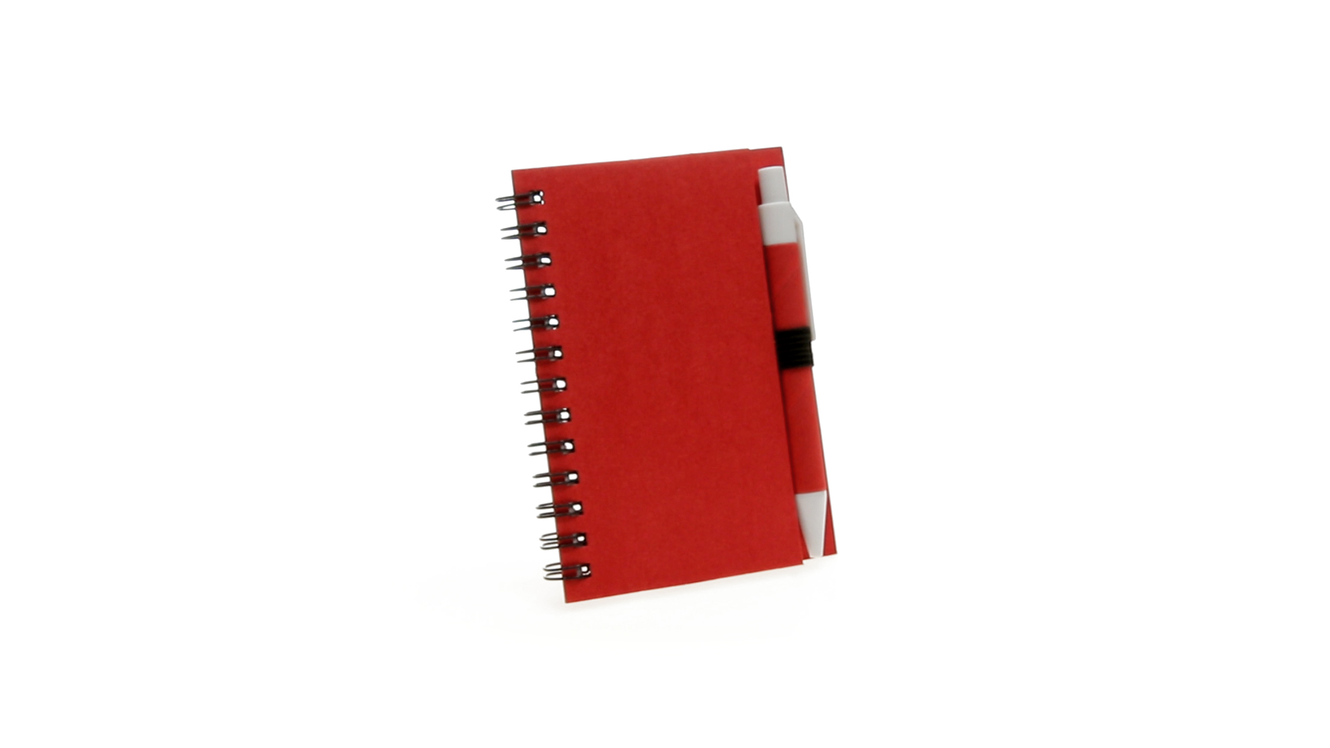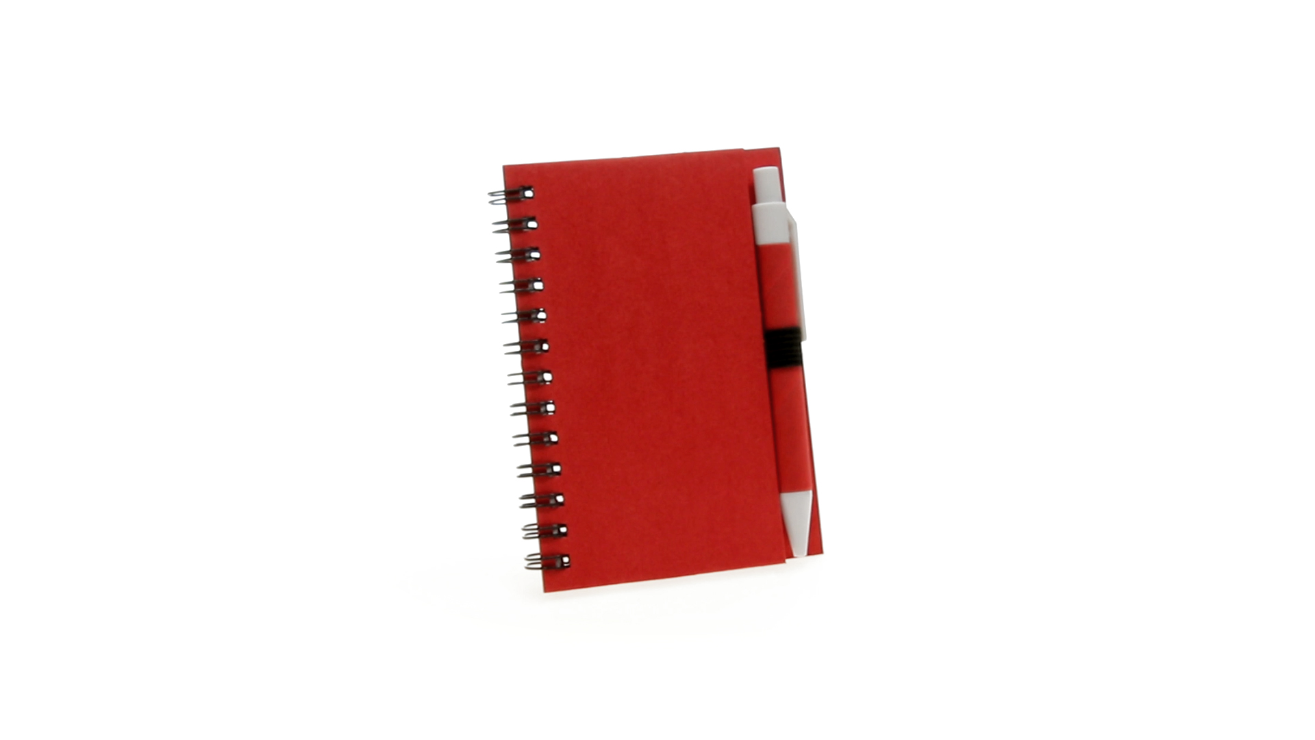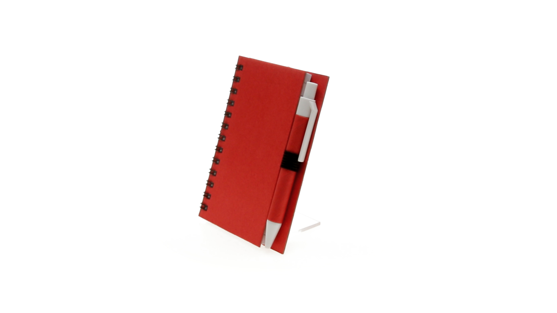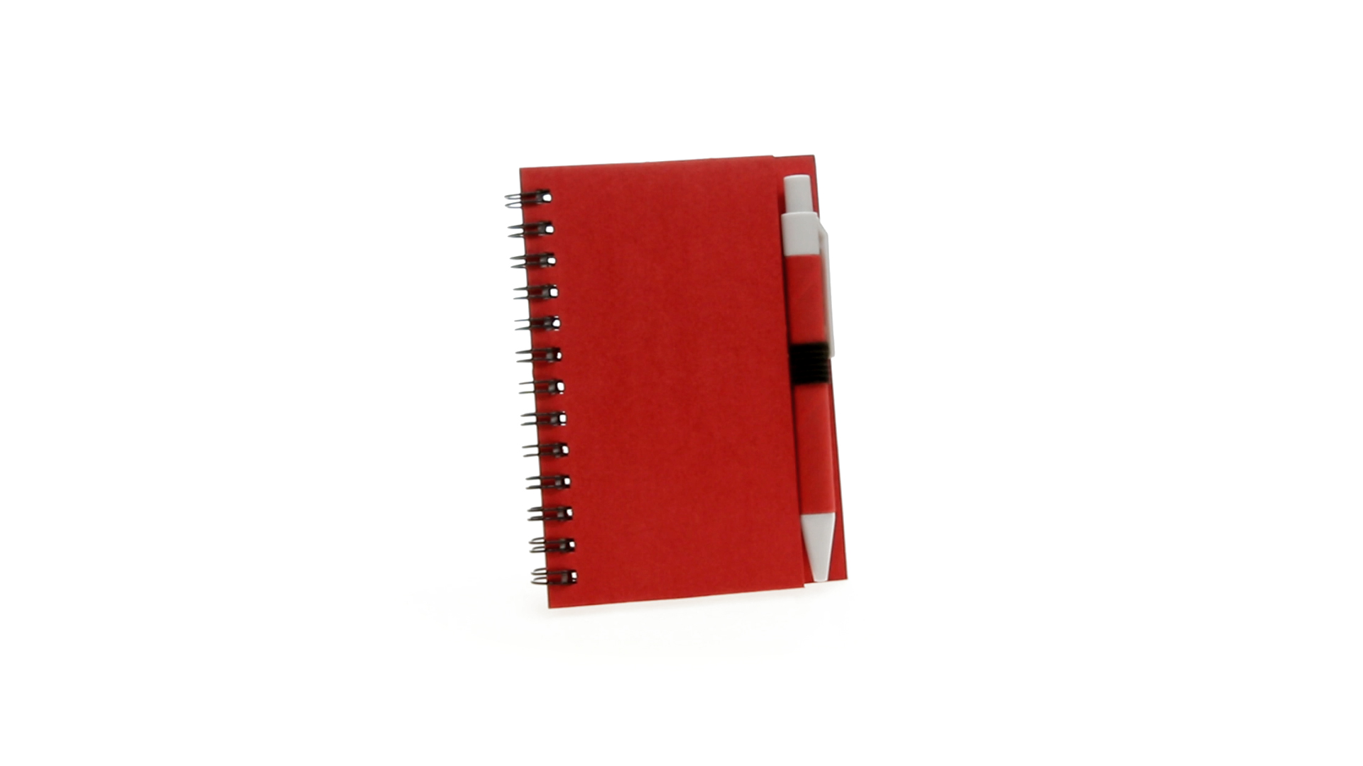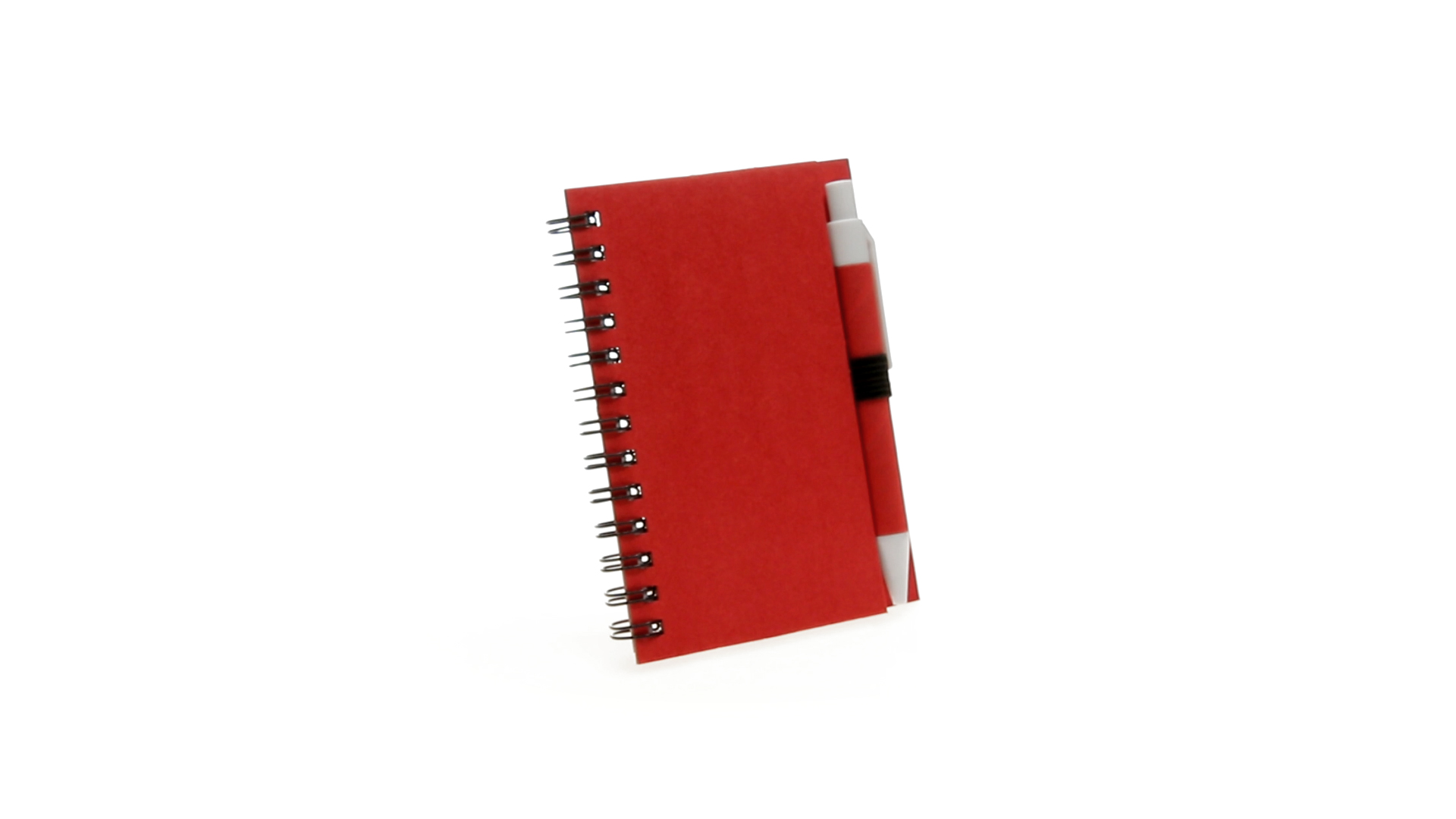 Ring-Notizbuch mit Soft-Touch-Cover aus resistentem Recyclingkarton und Kugelschreiber aus farblich passendem Recyclingkarton. In auffälligen Farben und mit 50 linierten Blättern sowie Kugelschreiberhalter auf der Rückseite.