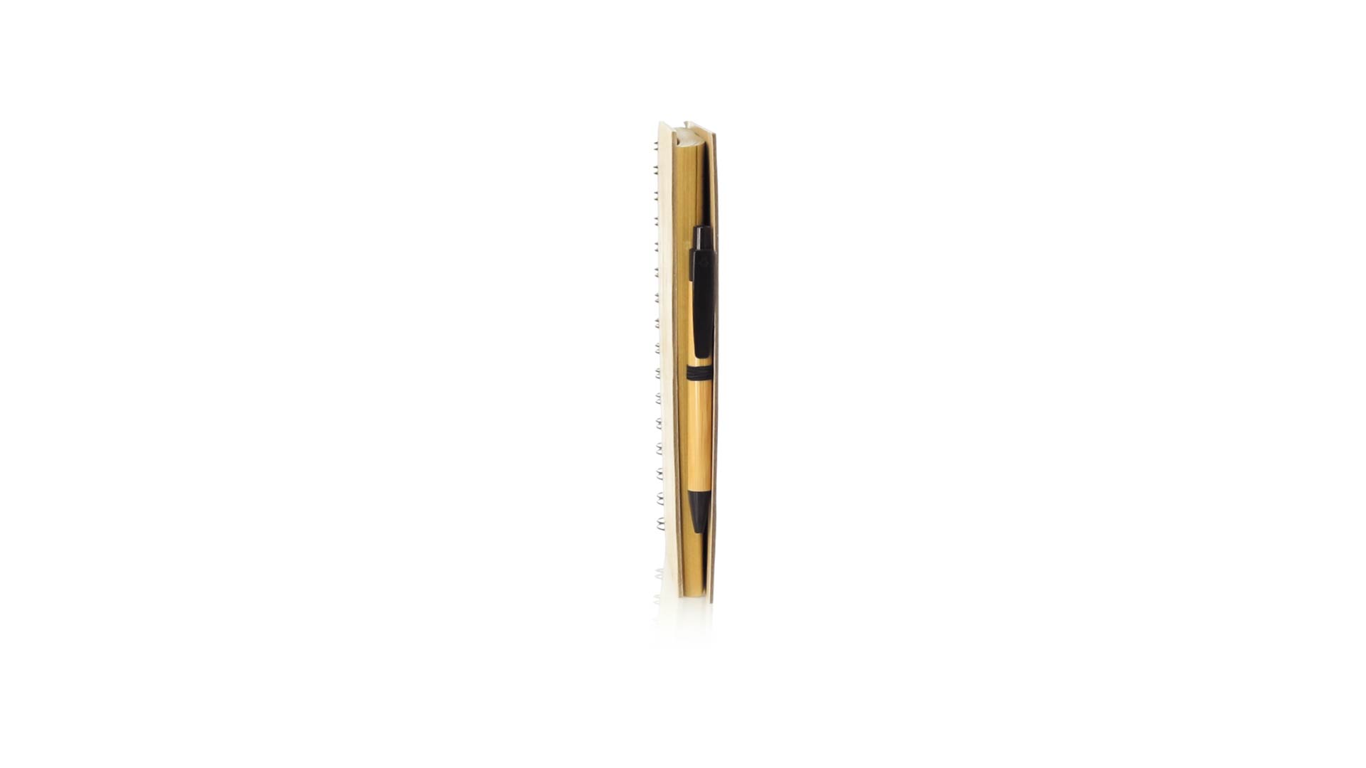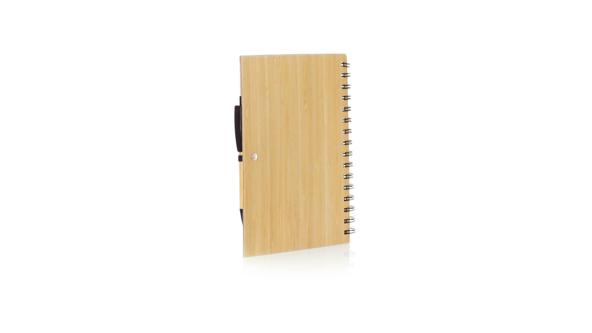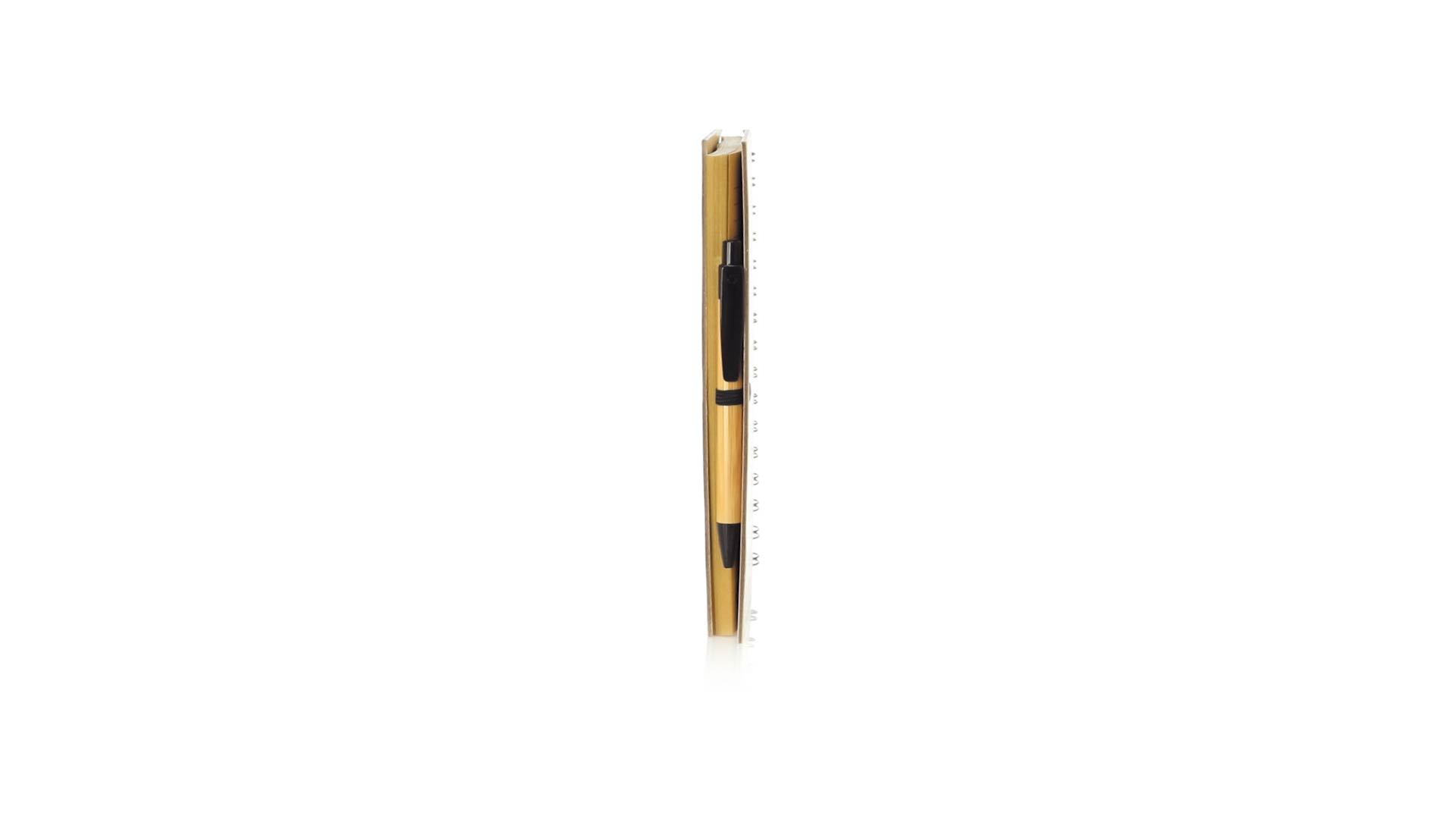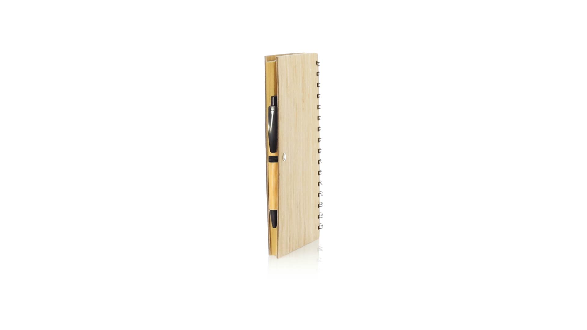 Notizbuch mit Kugelschreiber aus unserer Naturlinie. Ringbuch mit hartem Einband aus Bambus, einschliesslich eines Kugelschreiberhalters und 80 Blatt mit gestreiftem Layout im Öko-Design. Kugelschreiber mit Push-up-Mechanismus, mit Bambusgehäuse und schwarzer Tinte.