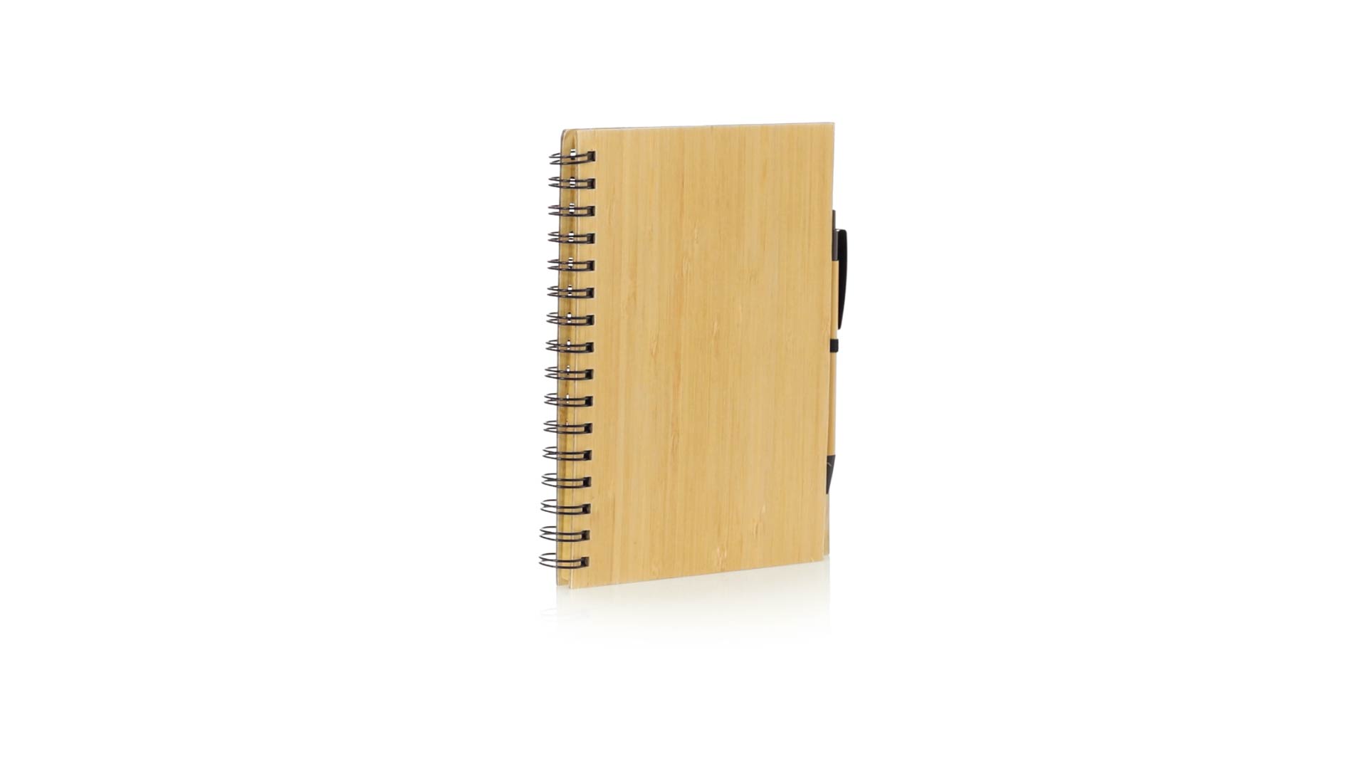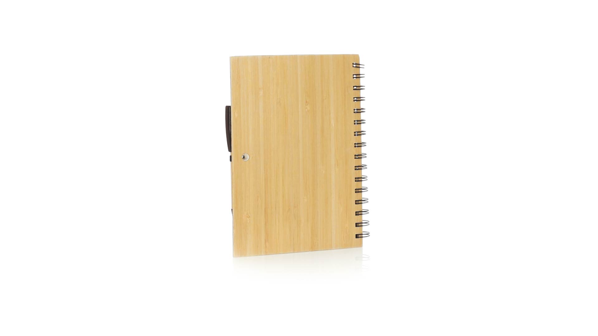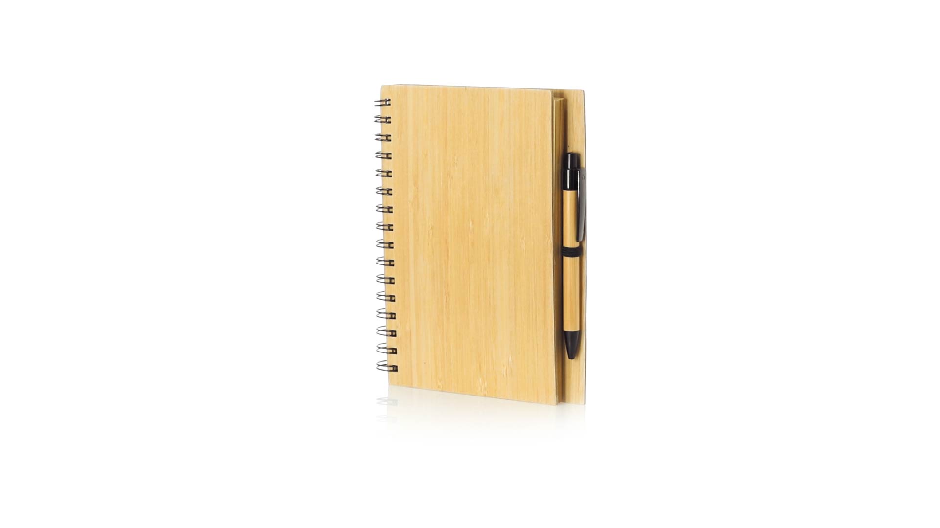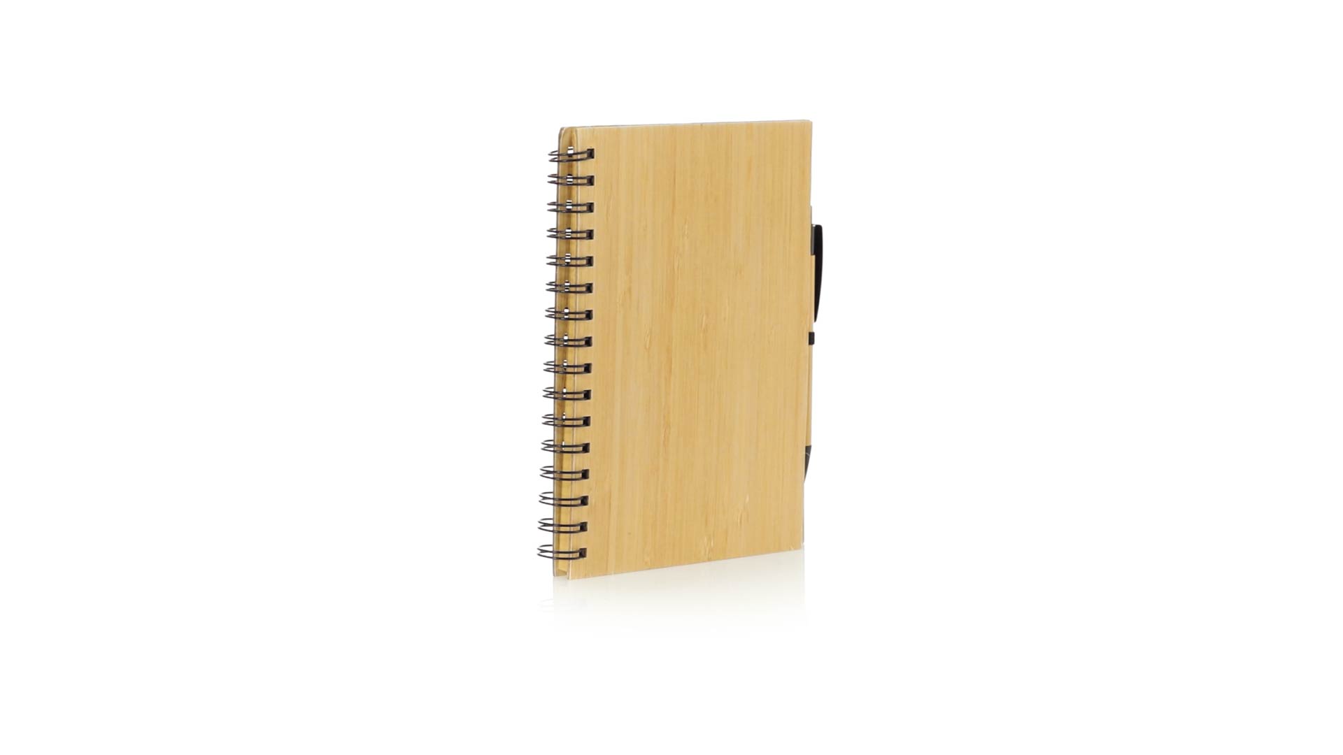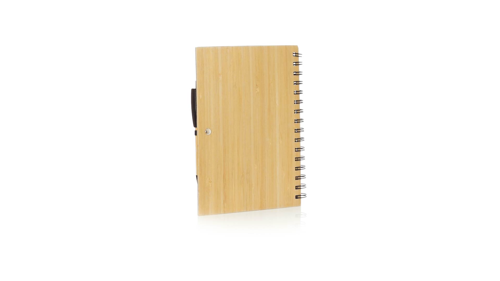 Notizbuch mit Kugelschreiber aus unserer Naturlinie. Ringbuch mit hartem Einband aus Bambus, einschliesslich eines Kugelschreiberhalters und 80 Blatt mit gestreiftem Layout im Öko-Design. Kugelschreiber mit Push-up-Mechanismus, mit Bambusgehäuse und schwarzer Tinte.