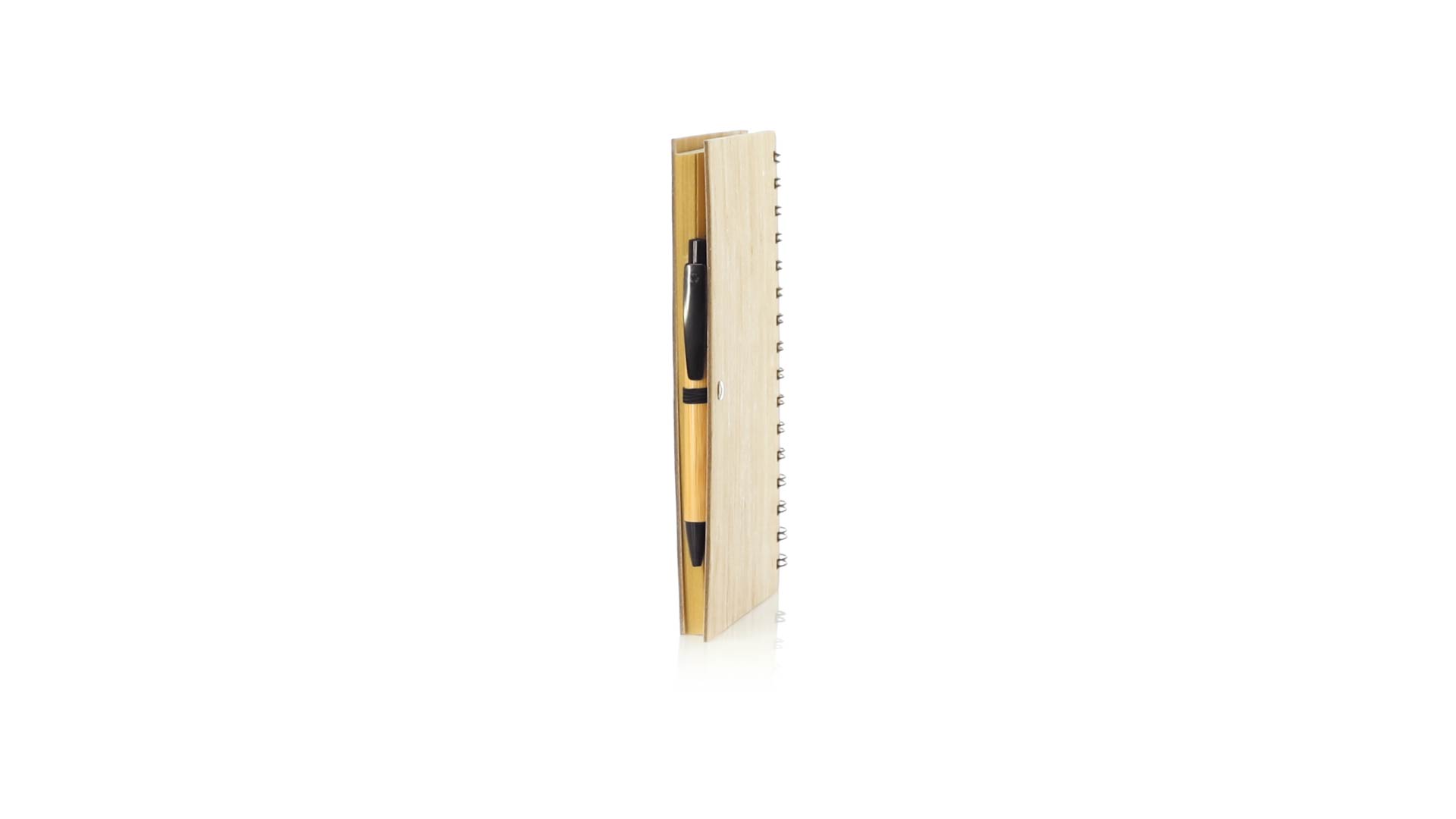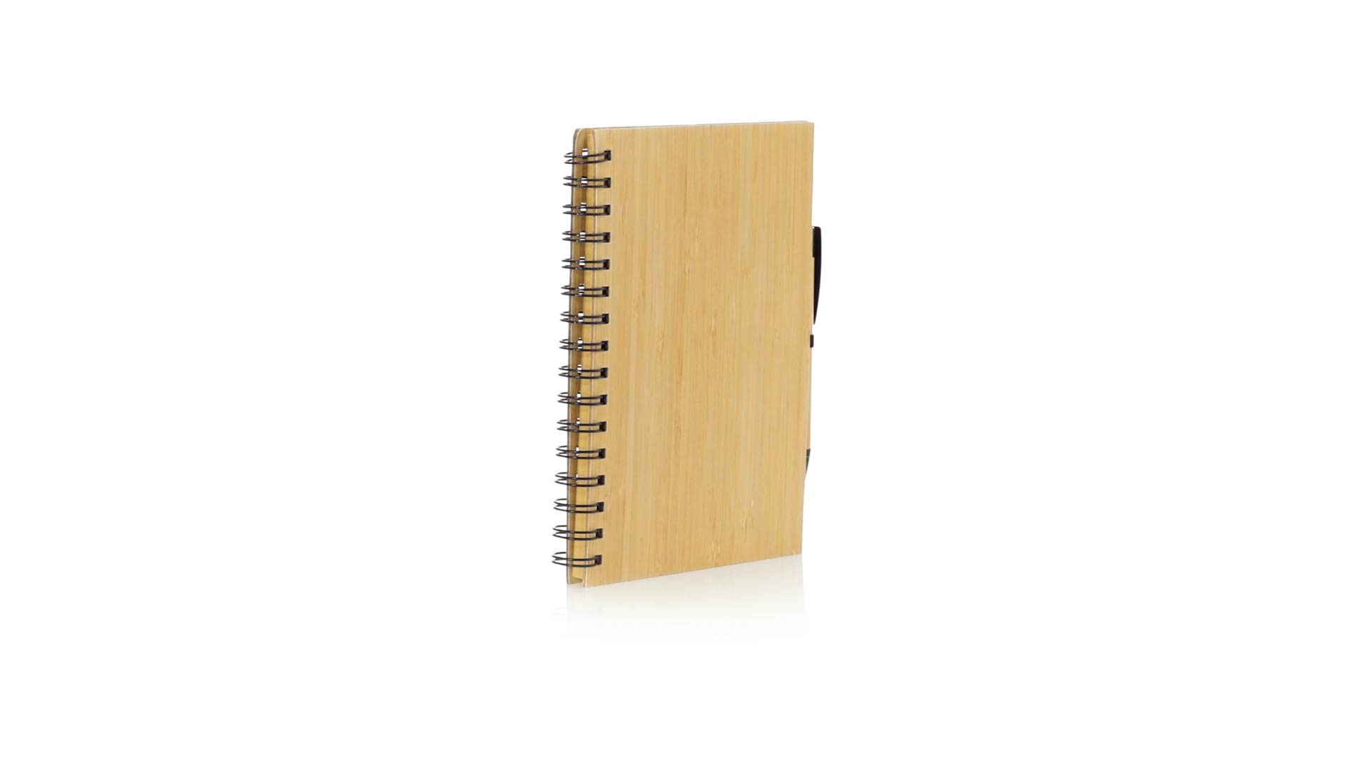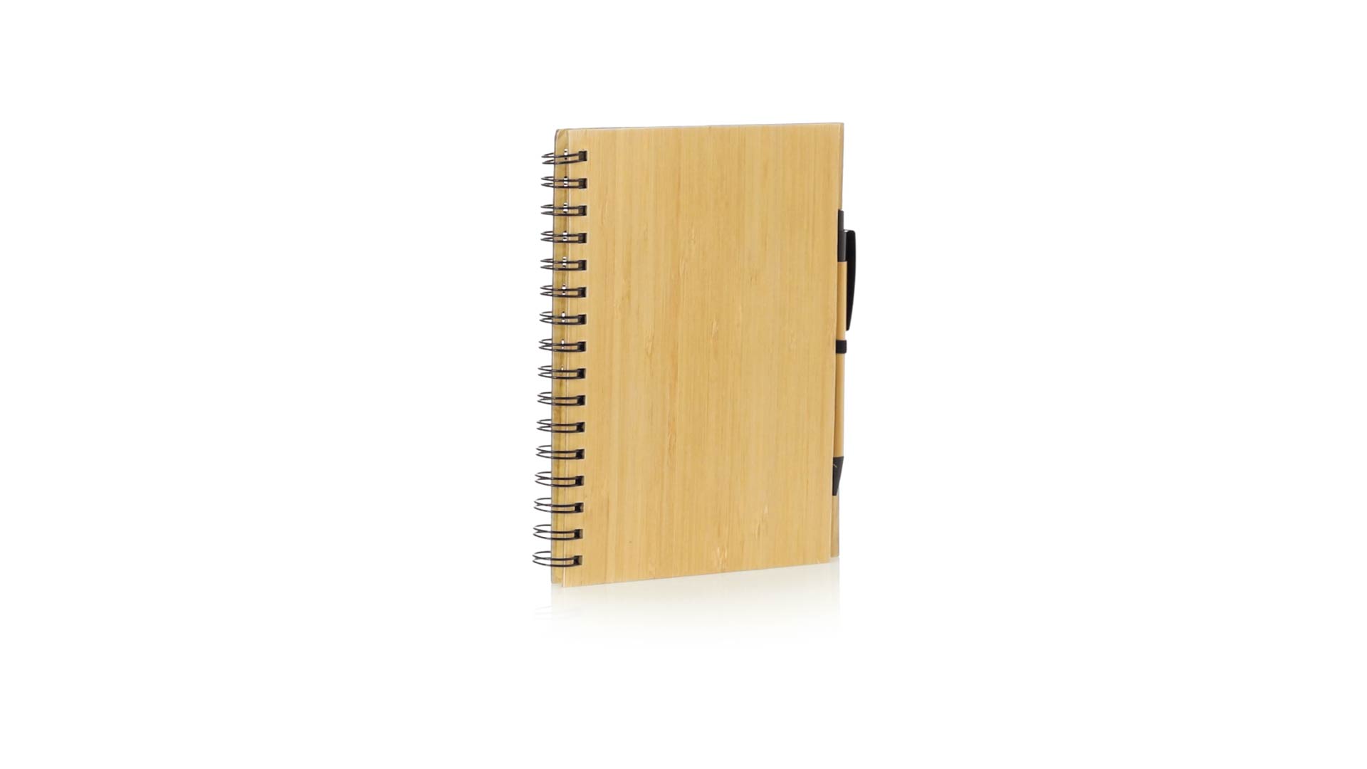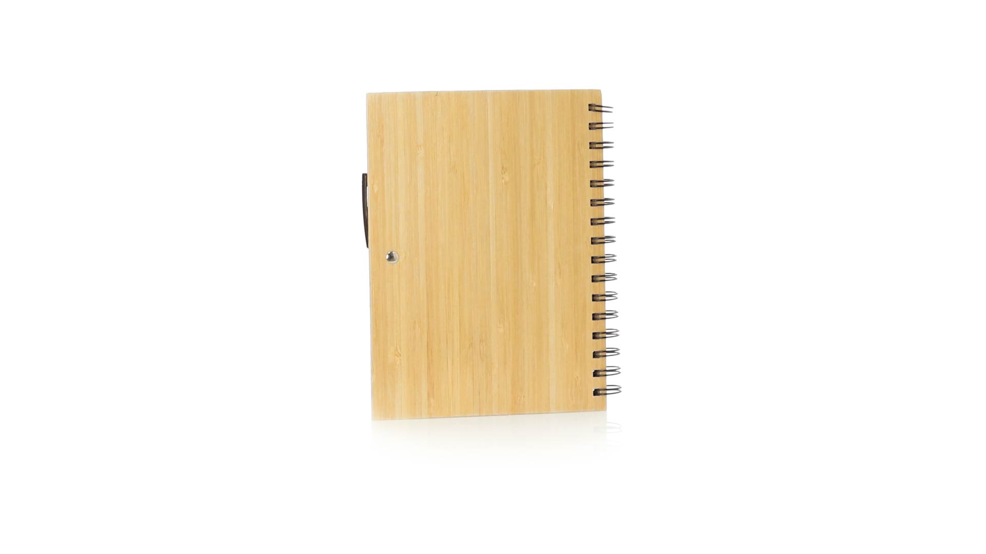 Notizbuch mit Kugelschreiber aus unserer Naturlinie. Ringbuch mit hartem Einband aus Bambus, einschliesslich eines Kugelschreiberhalters und 80 Blatt mit gestreiftem Layout im Öko-Design. Kugelschreiber mit Push-up-Mechanismus, mit Bambusgehäuse und schwarzer Tinte.