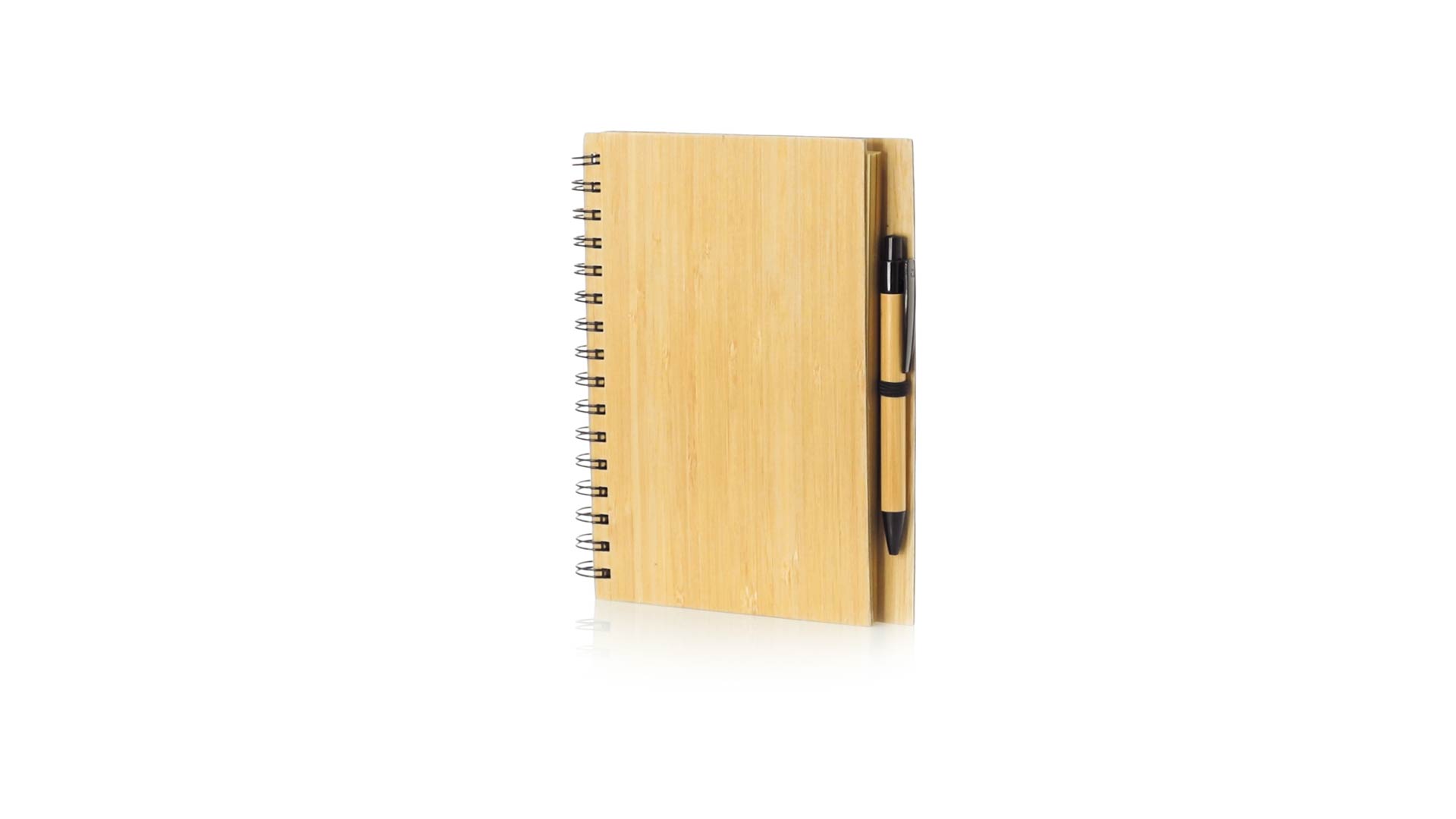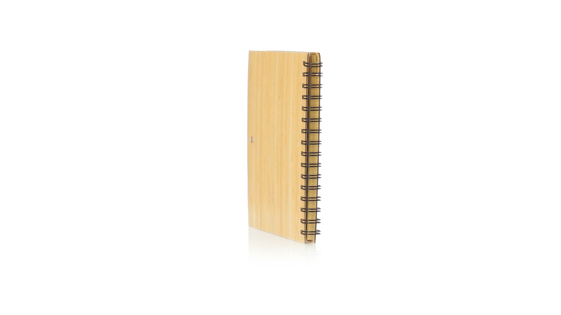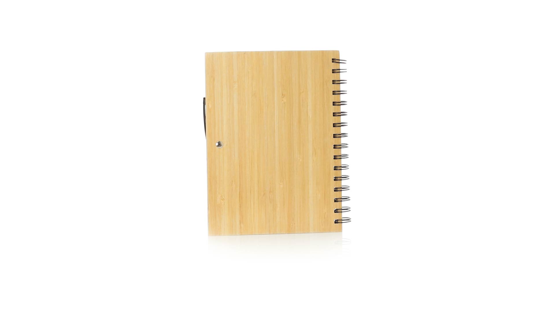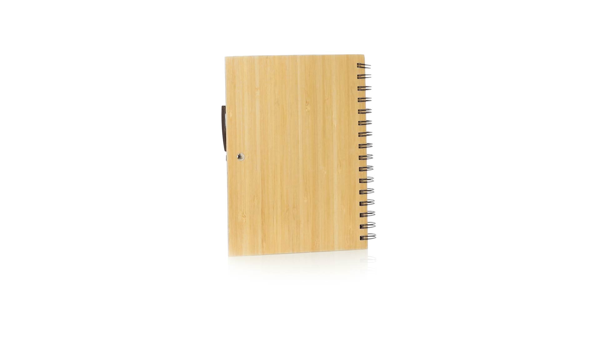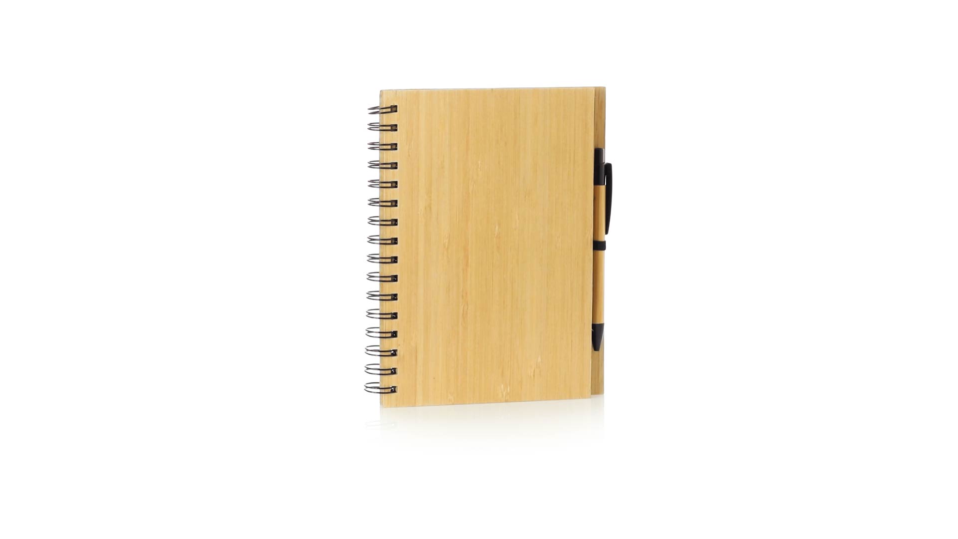 Notizbuch mit Kugelschreiber aus unserer Naturlinie. Ringbuch mit hartem Einband aus Bambus, einschliesslich eines Kugelschreiberhalters und 80 Blatt mit gestreiftem Layout im Öko-Design. Kugelschreiber mit Push-up-Mechanismus, mit Bambusgehäuse und schwarzer Tinte.