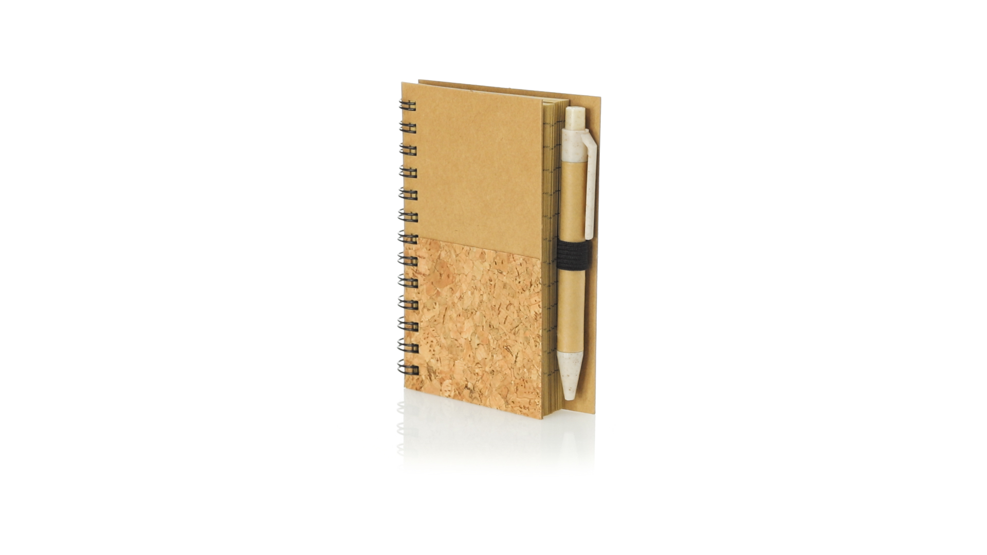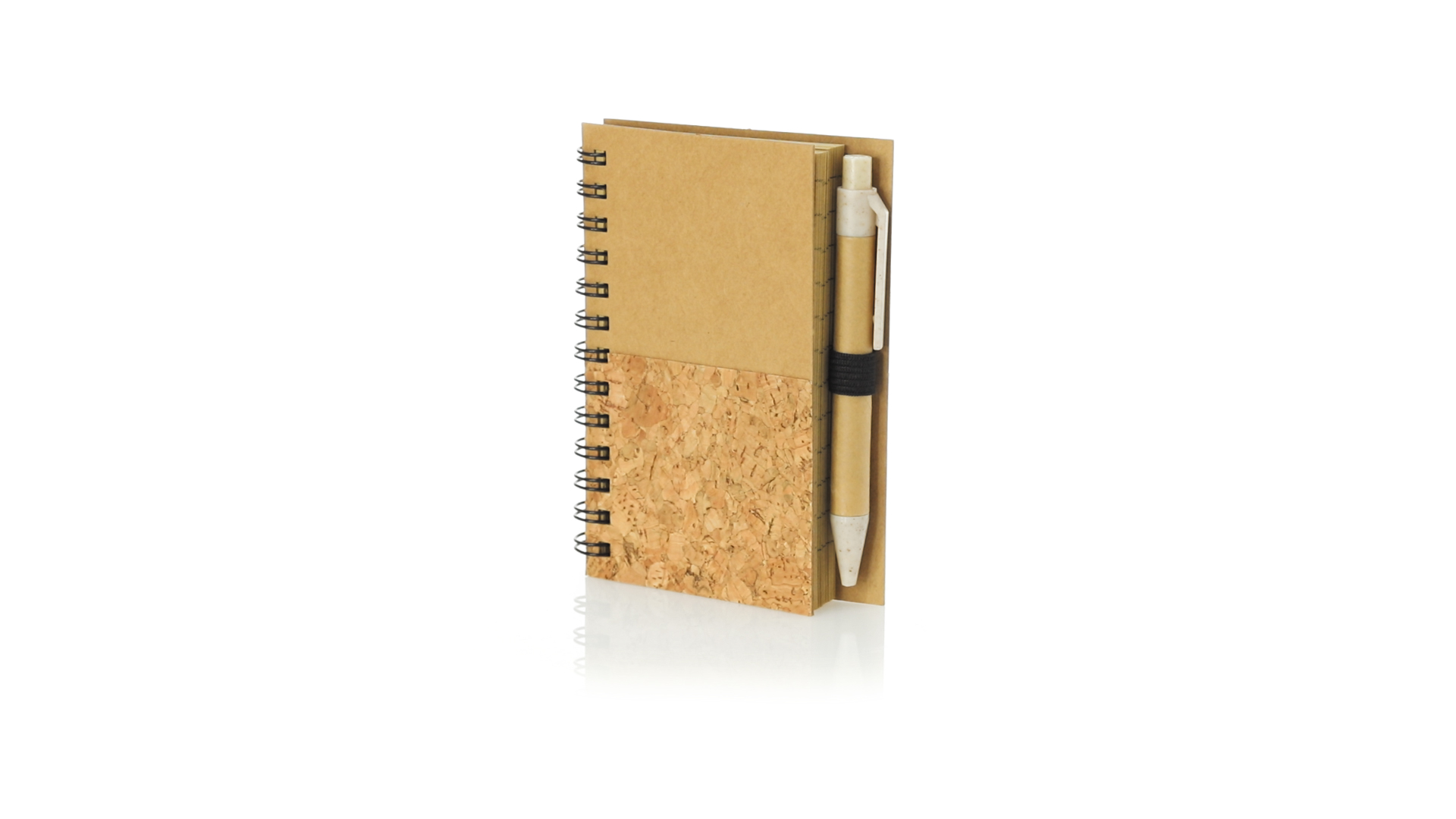 Notizbuch und Kugelschreiber Set aus unserer Naturlinie. Ringbuch mit festem Einband aus Naturkork und recyceltem Karton, mit 80 Blättern im Streifen-Layout und Öko-Design. Kugelschreiber mit Druckmechanik, mit Korpus aus recycelter Pappe und Zubehör aus Weizenstroh, um die Verwendung natürlicher Rohstoffe zu fördern und Schadstoffemissionen zu reduzieren. Blaue Tinte.