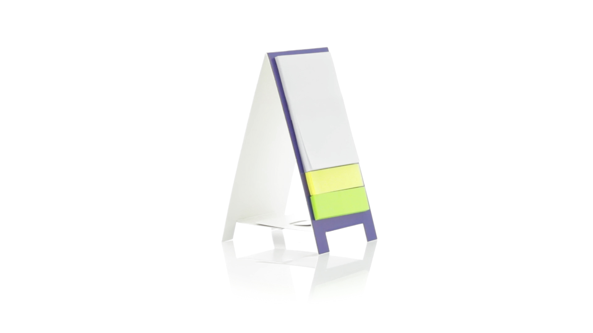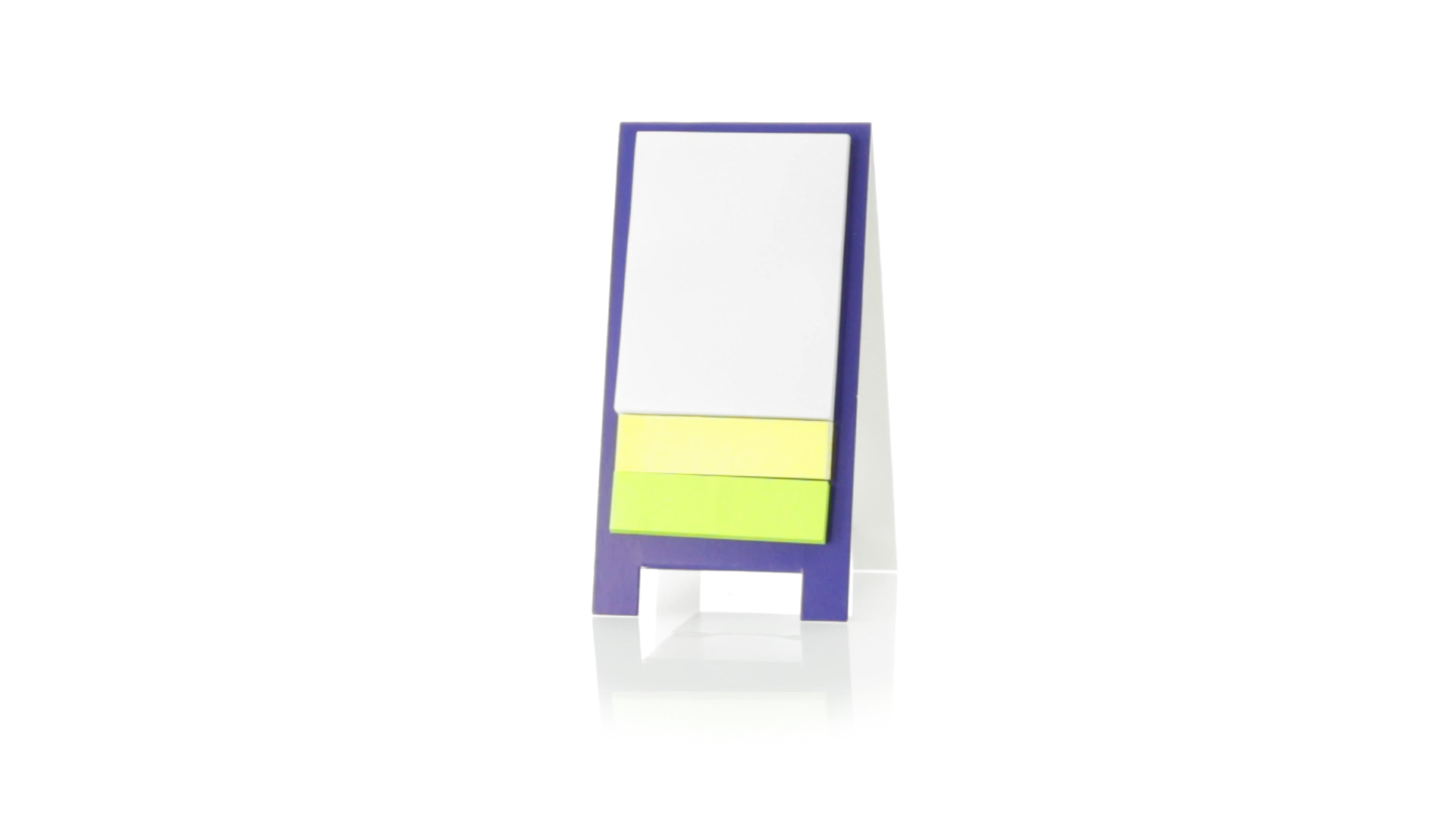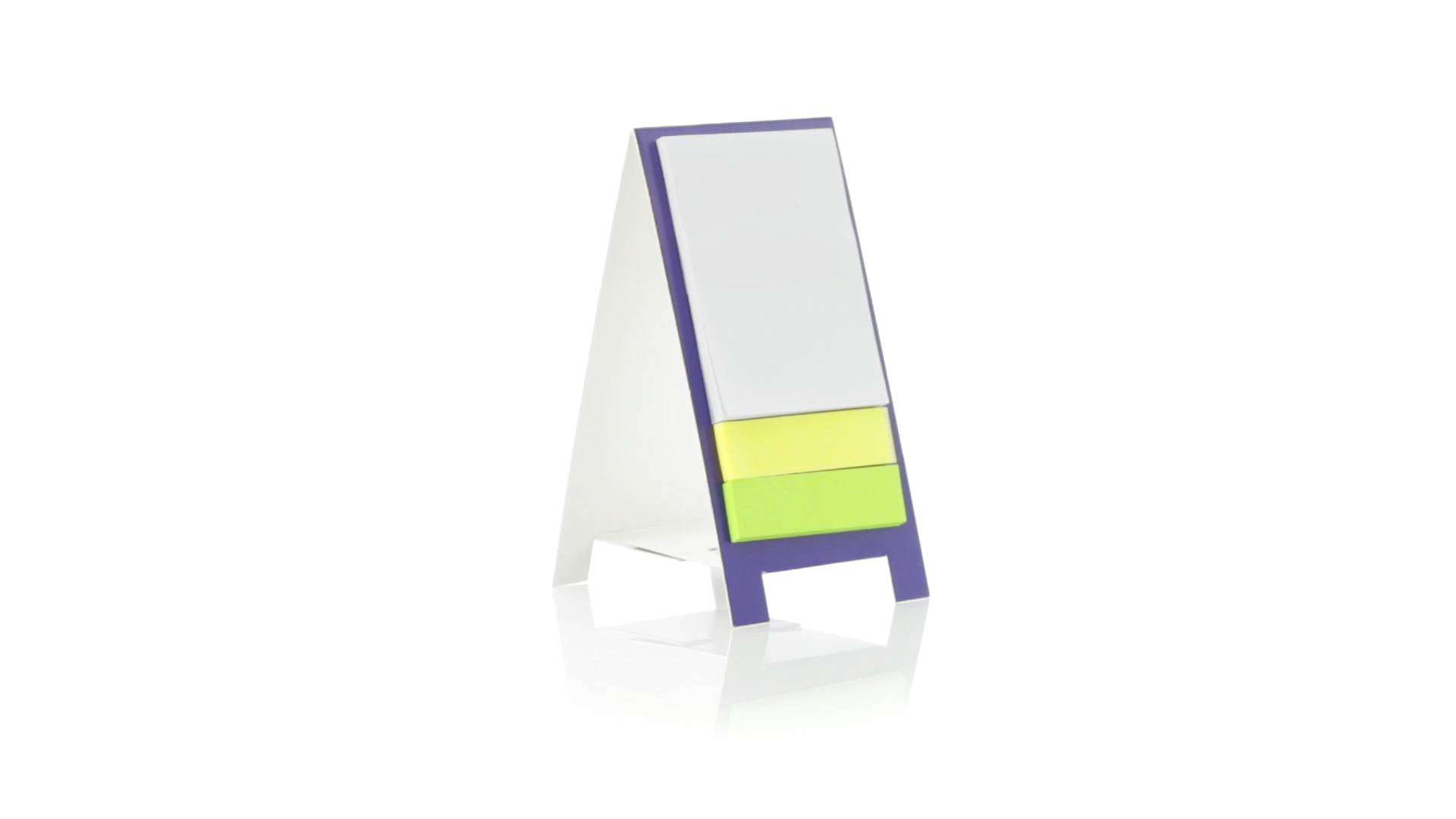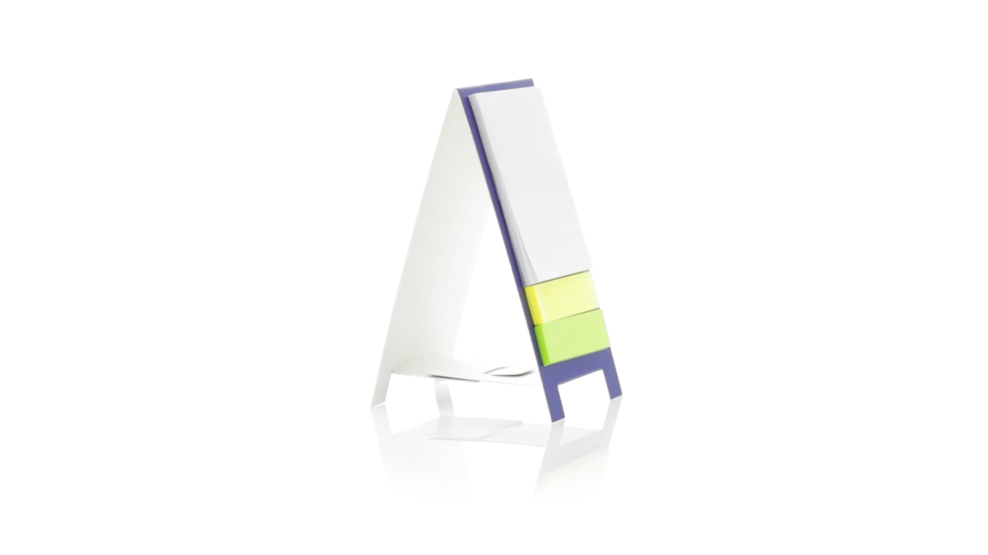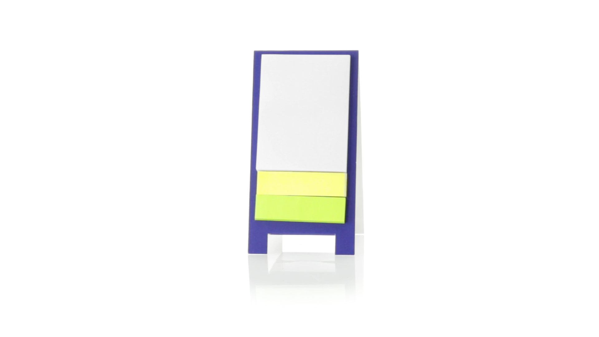 Origineller Haftnotizen-Ständer aus Karton in verschiedenen lebendigen Farben. Enthält 30 grosse und 50 Mini-Haftnotizen. Präsentiert in ungefaltetem Zustand für einfaches Bedrucken.