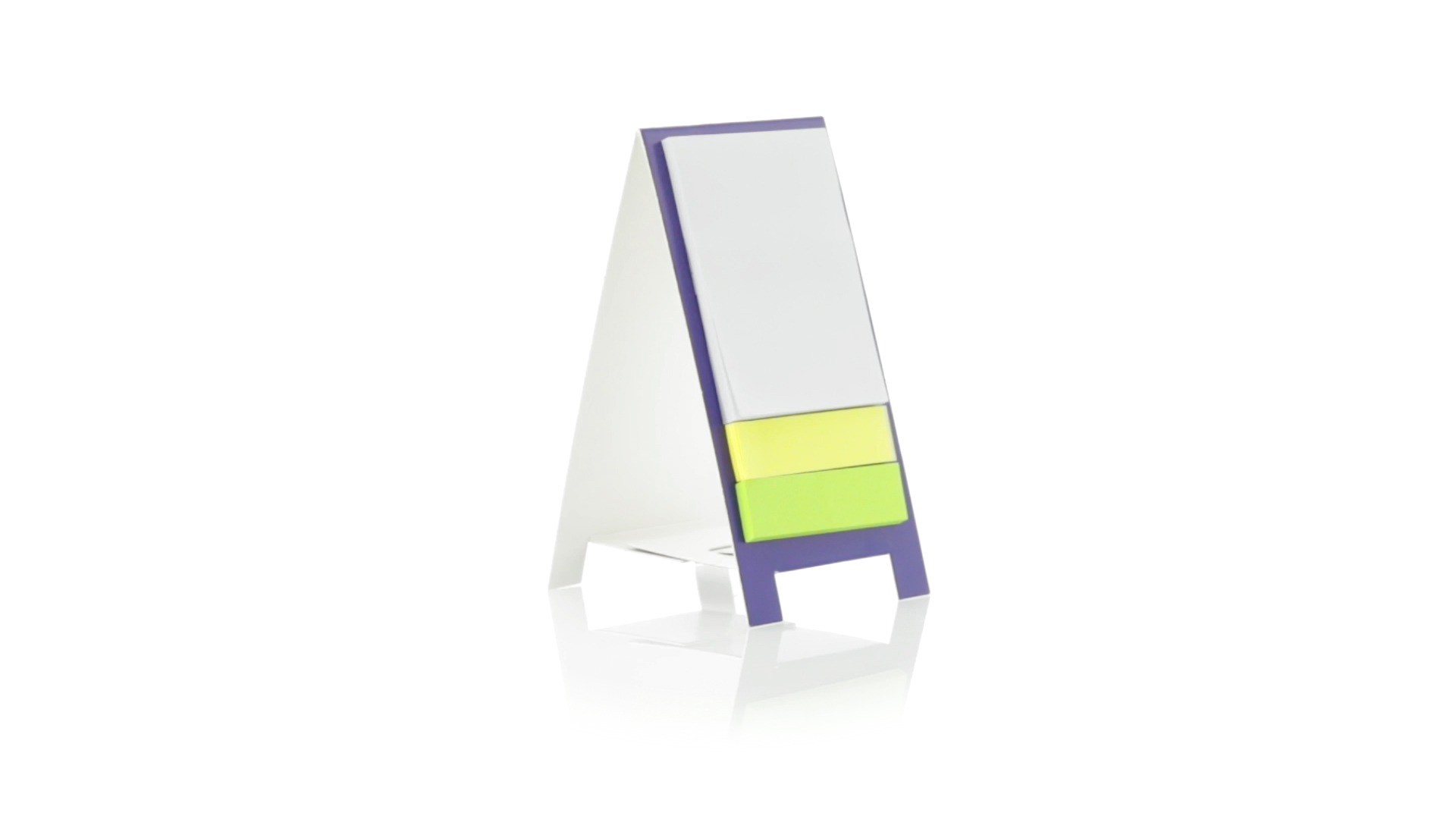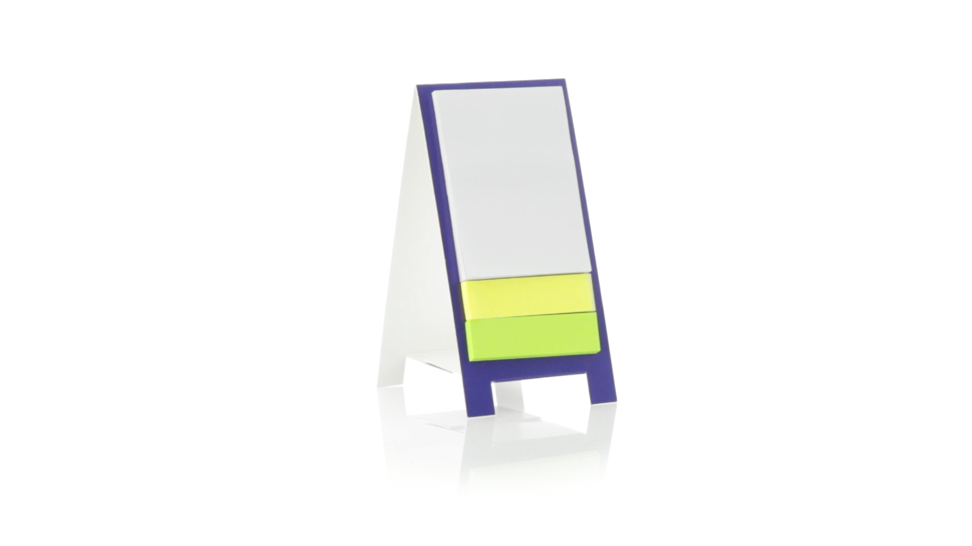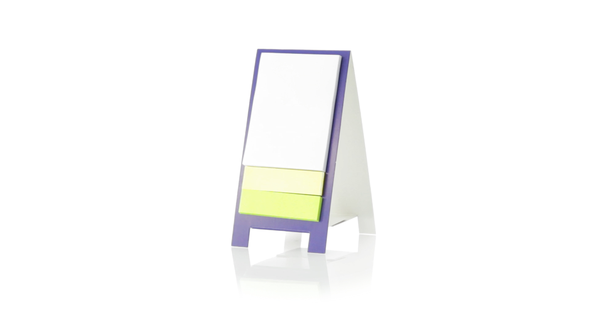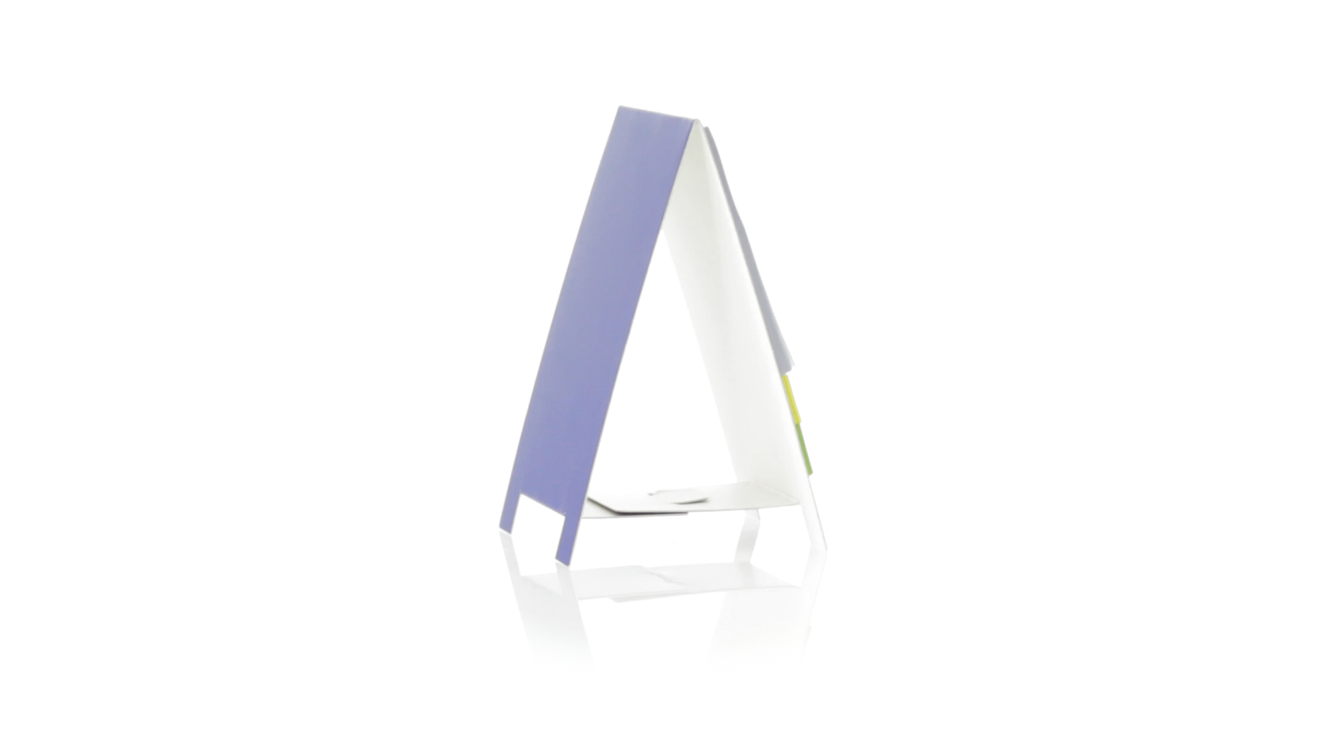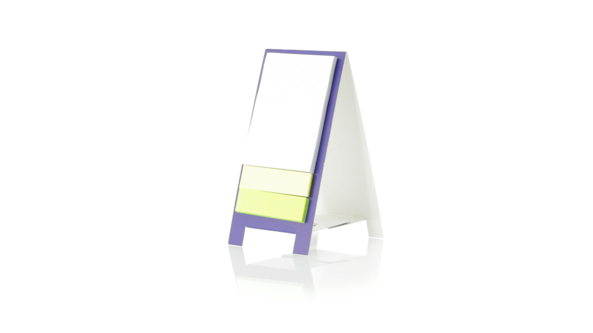 Origineller Haftnotizen-Ständer aus Karton in verschiedenen lebendigen Farben. Enthält 30 grosse und 50 Mini-Haftnotizen. Präsentiert in ungefaltetem Zustand für einfaches Bedrucken.