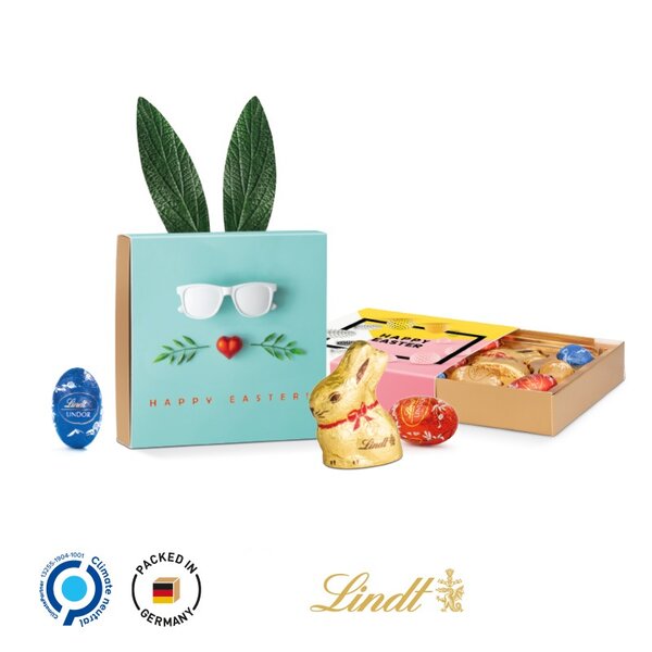 Mit der Neuheit dem Lindt Präsent für Osterüberraschungen sorgen! Die kleinen Kostbarkeiten bringen deinen Kunden grosse Freude. Befüllt mit Lindor Eiern und einem Goldhasen strahlt die Pralinenschachtel durch das Herausbrechen der Ohren ein Gefühl von Ostern aus. Durch deine individuelle Gestaltung auf weissem Karton verschenkst auch du süsse Werbebotschaften, die sicher lange in Erinnerung bleiben.