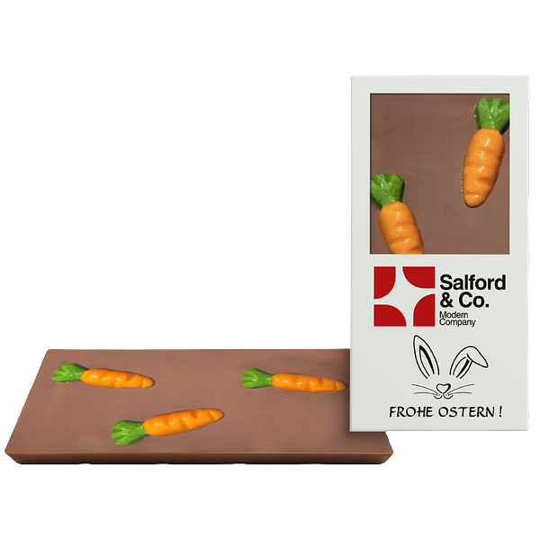 Unsere RÜEBLI-SCHOGGI bringt Osterstimmung pur. Die zarte Vollmilchschokolade mit 46 % Kakaoanteil wird mit vier liebevoll aufgeklebten Schokoladen-Karotten verziert – ein klassisches Osterdesign mit modernem Touch.