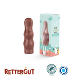 Rettergut Schoko Osterhase aus 100 % geretteter Schokolade in kompostierbarer Folie mit zertifizierter Werbebox, klimaneutral, individuell bedruckt