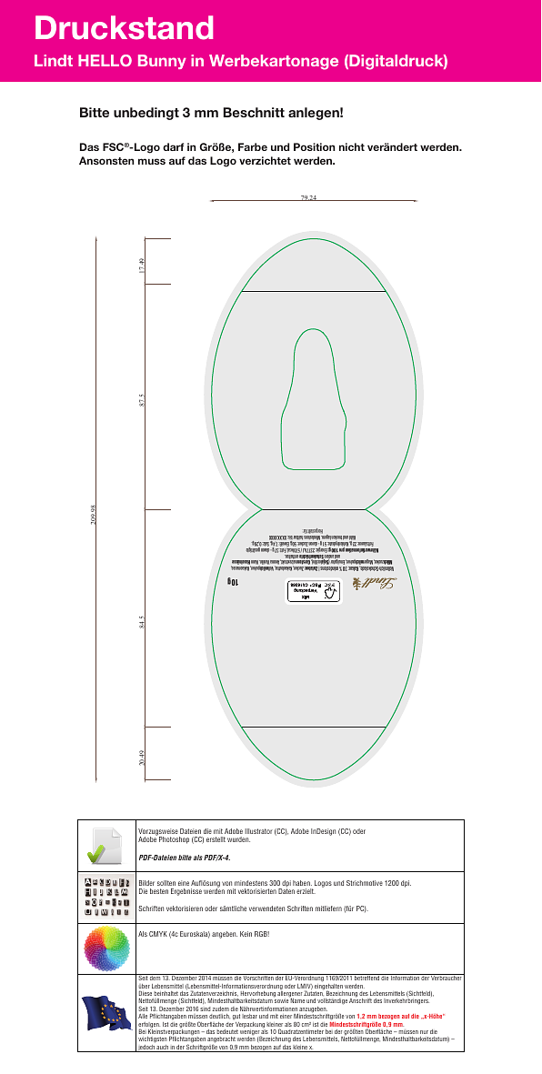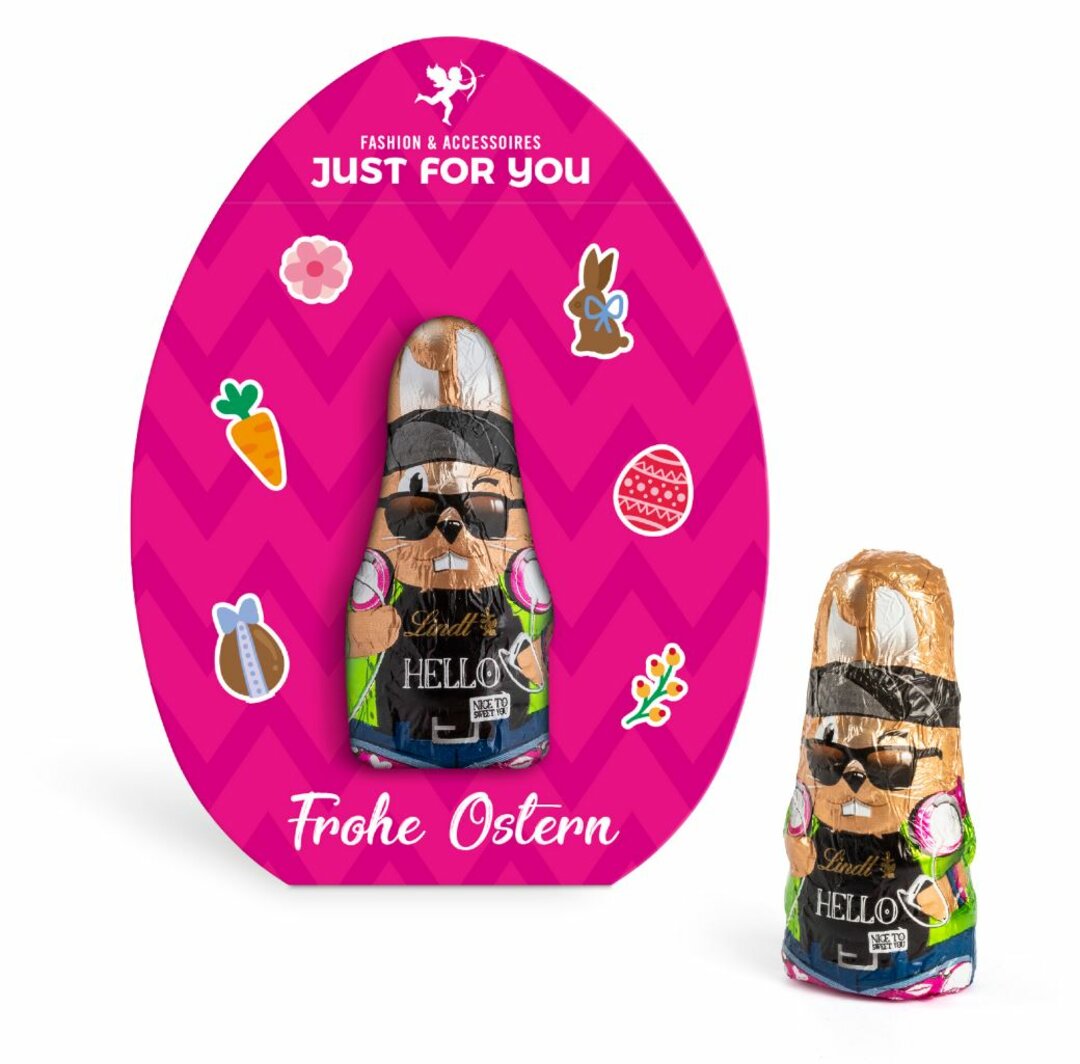 HELLO Mini Bunny aus Alpenvollmilchschokolade in individuell bedruckter Klemmkartonage in Ostereiform.