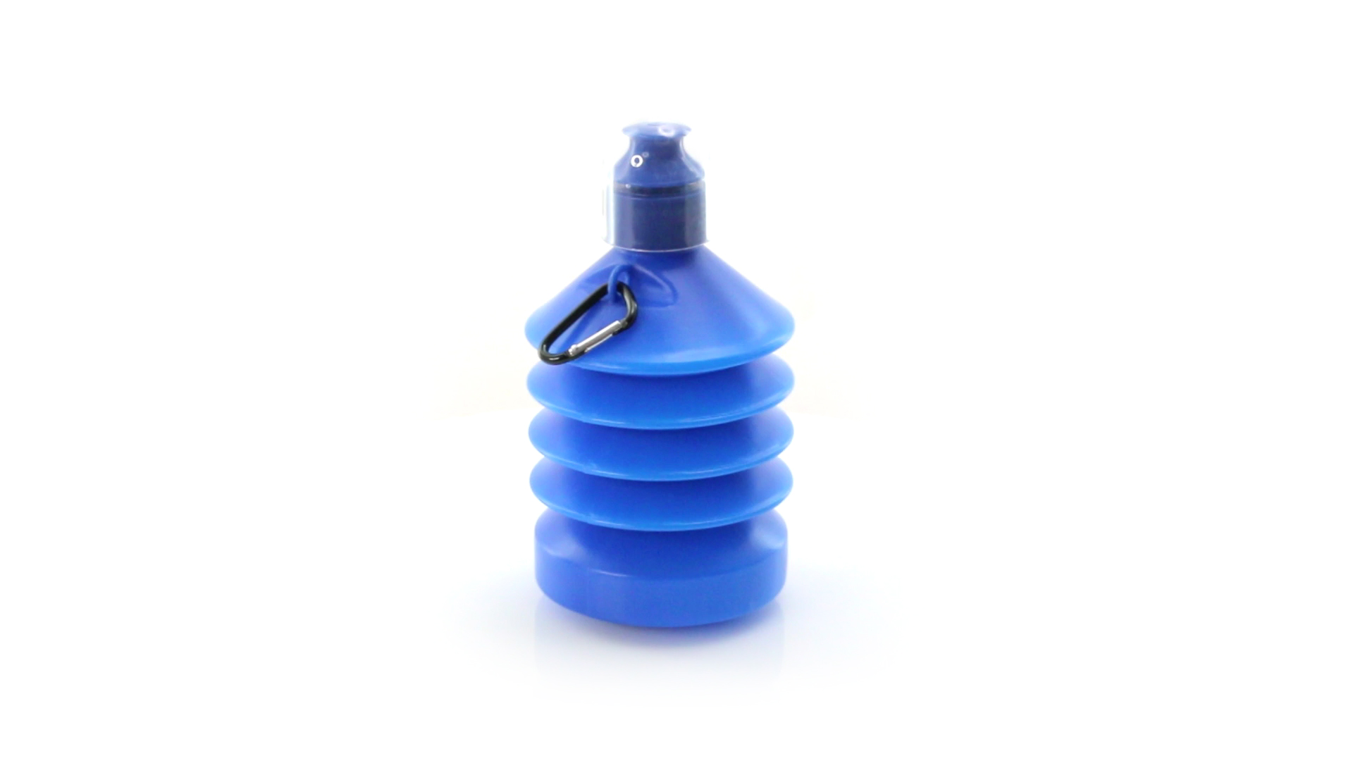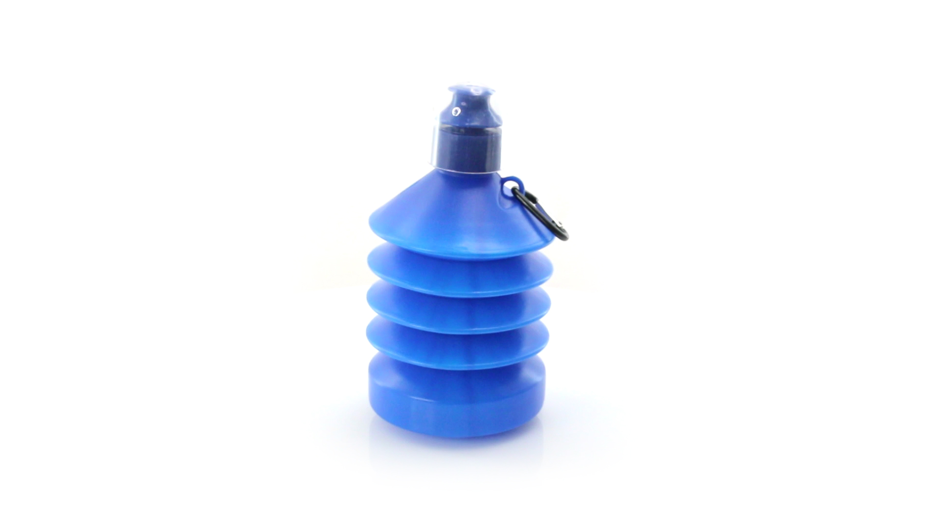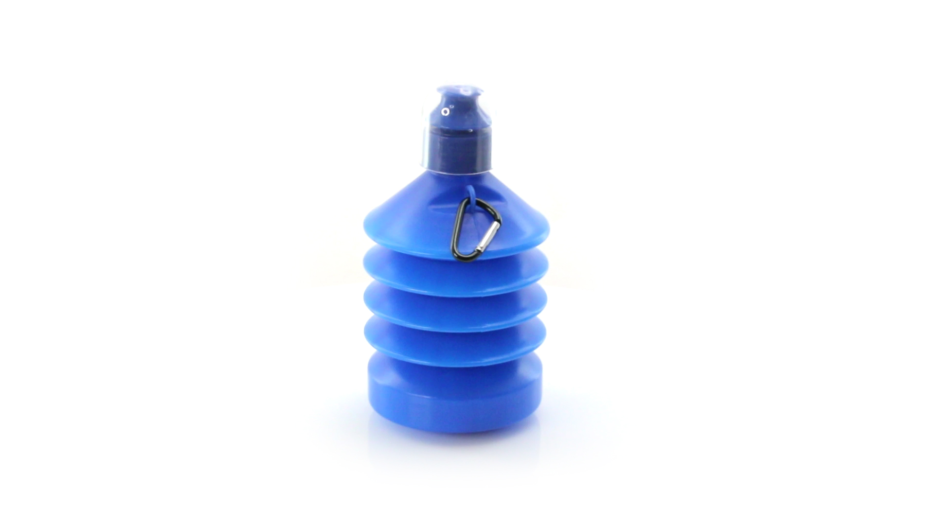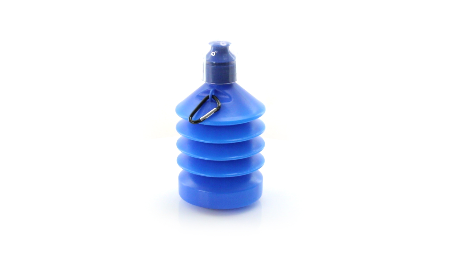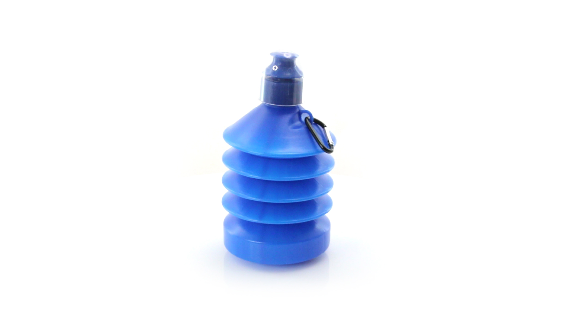 Klappbare Trinkflasche mit 570 ml Fassungsvermögen und ergonomischem Körper aus PE-Kunststoff in verschiedenen lebendigen Farben. Mit Sicherheitsspender mit Verschlusskappe sowie Befestigungskarabiner aus Metall.
