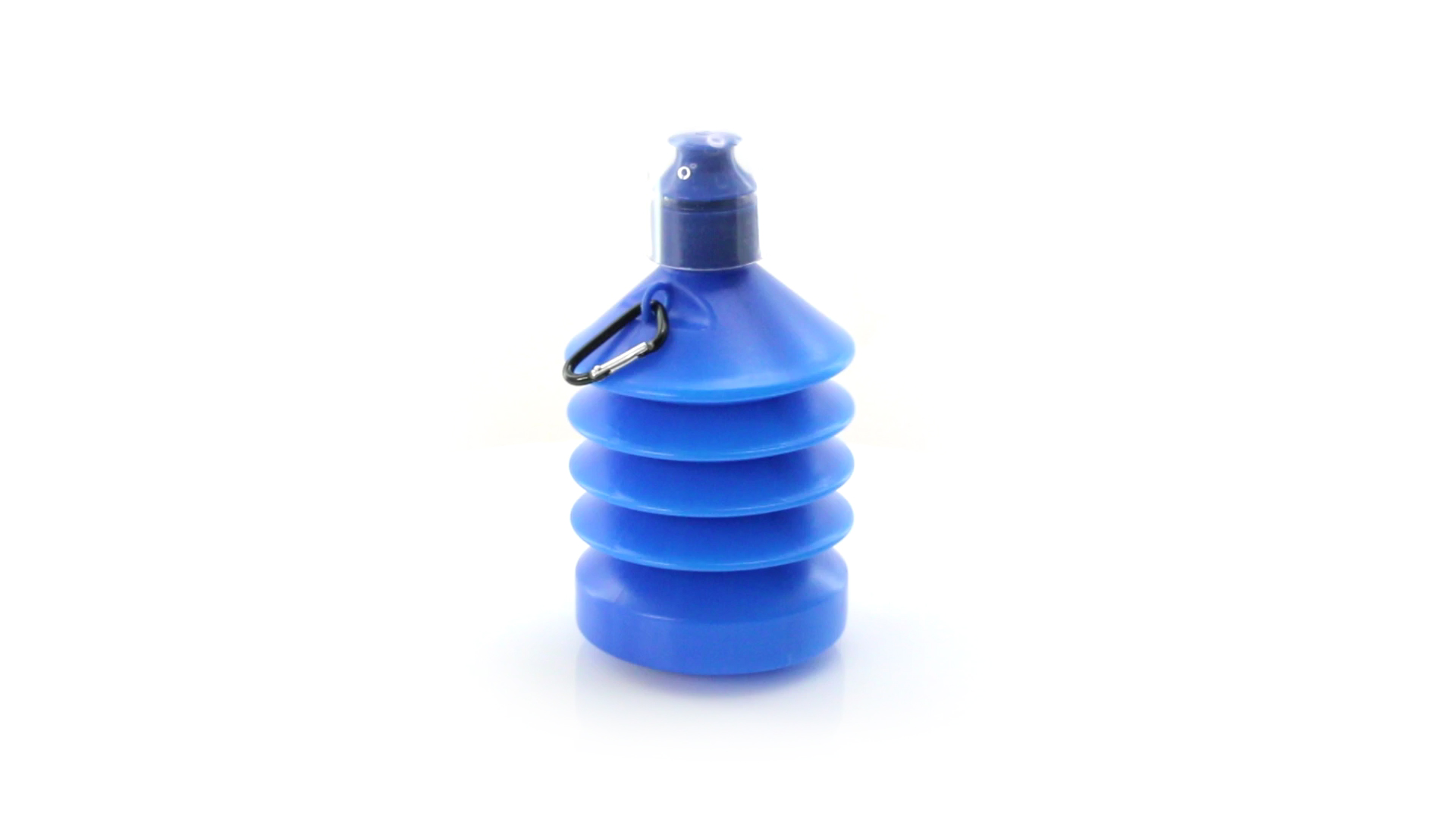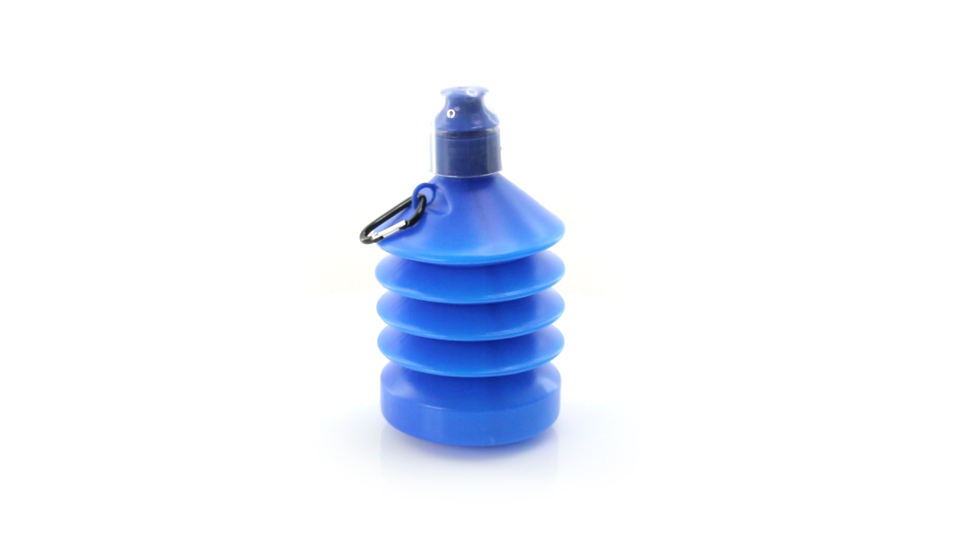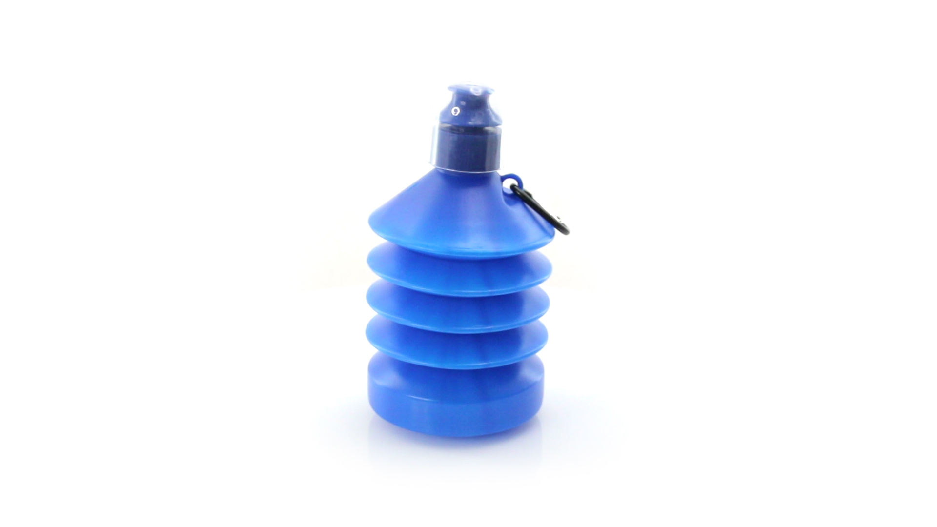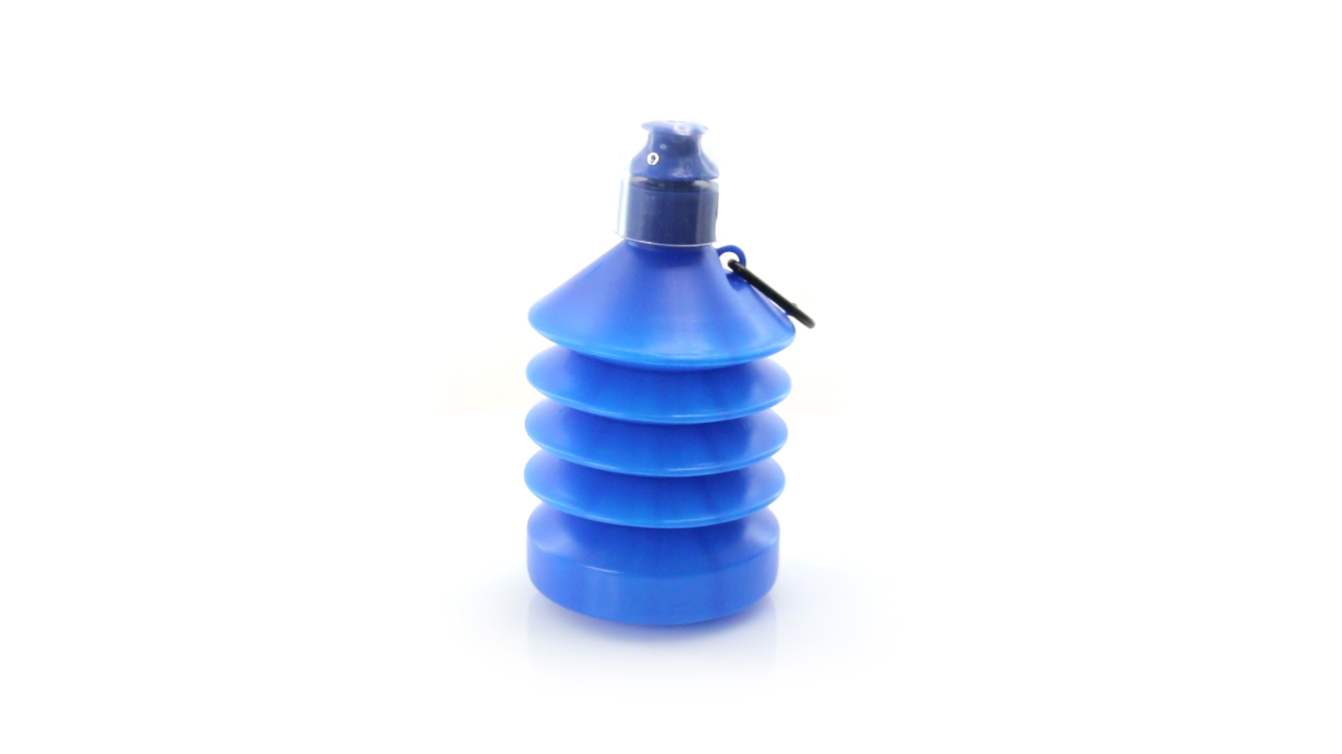 Klappbare Trinkflasche mit 570 ml Fassungsvermögen und ergonomischem Körper aus PE-Kunststoff in verschiedenen lebendigen Farben. Mit Sicherheitsspender mit Verschlusskappe sowie Befestigungskarabiner aus Metall.