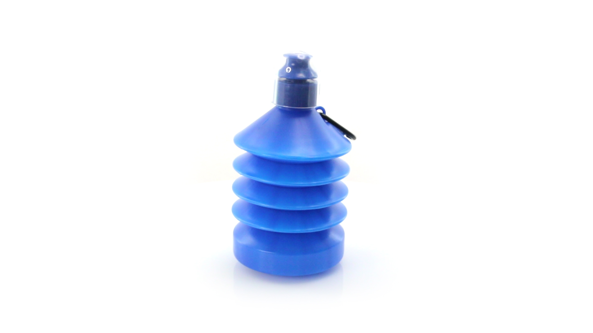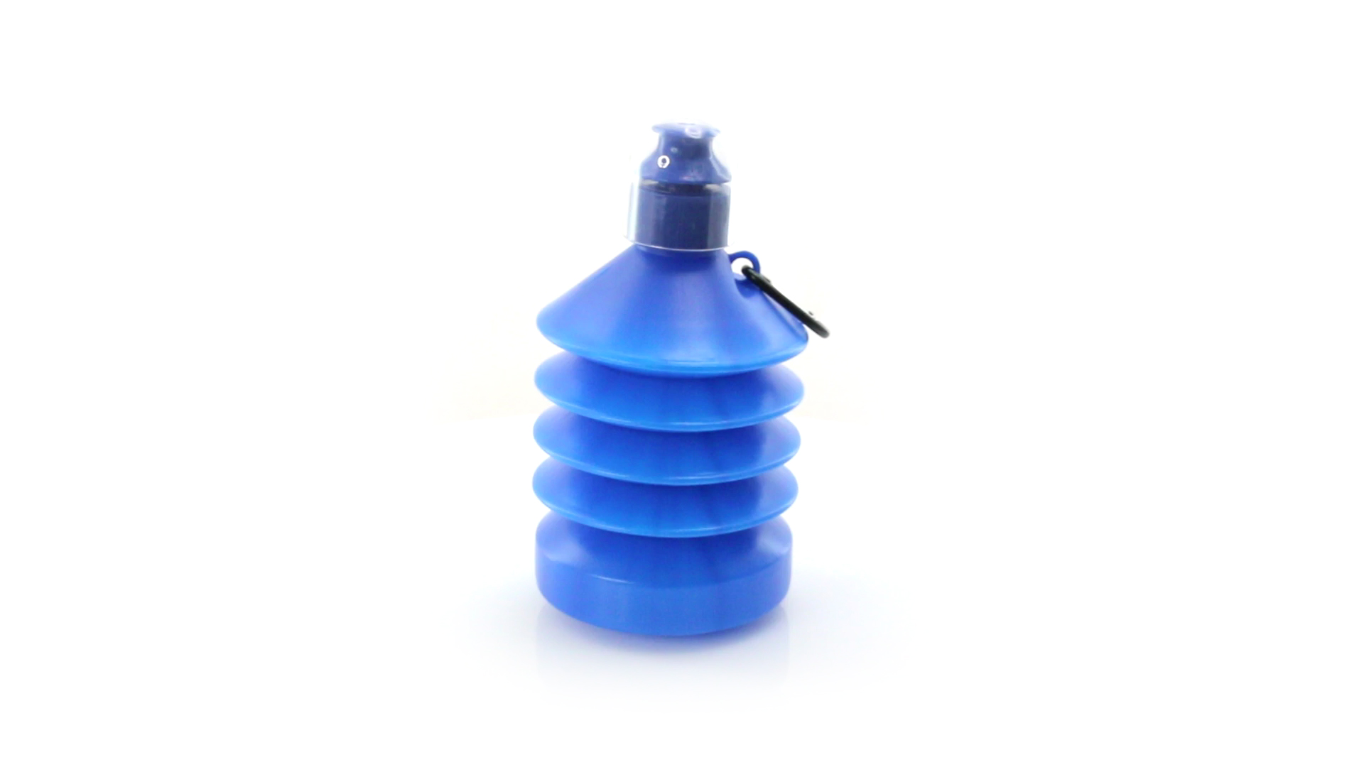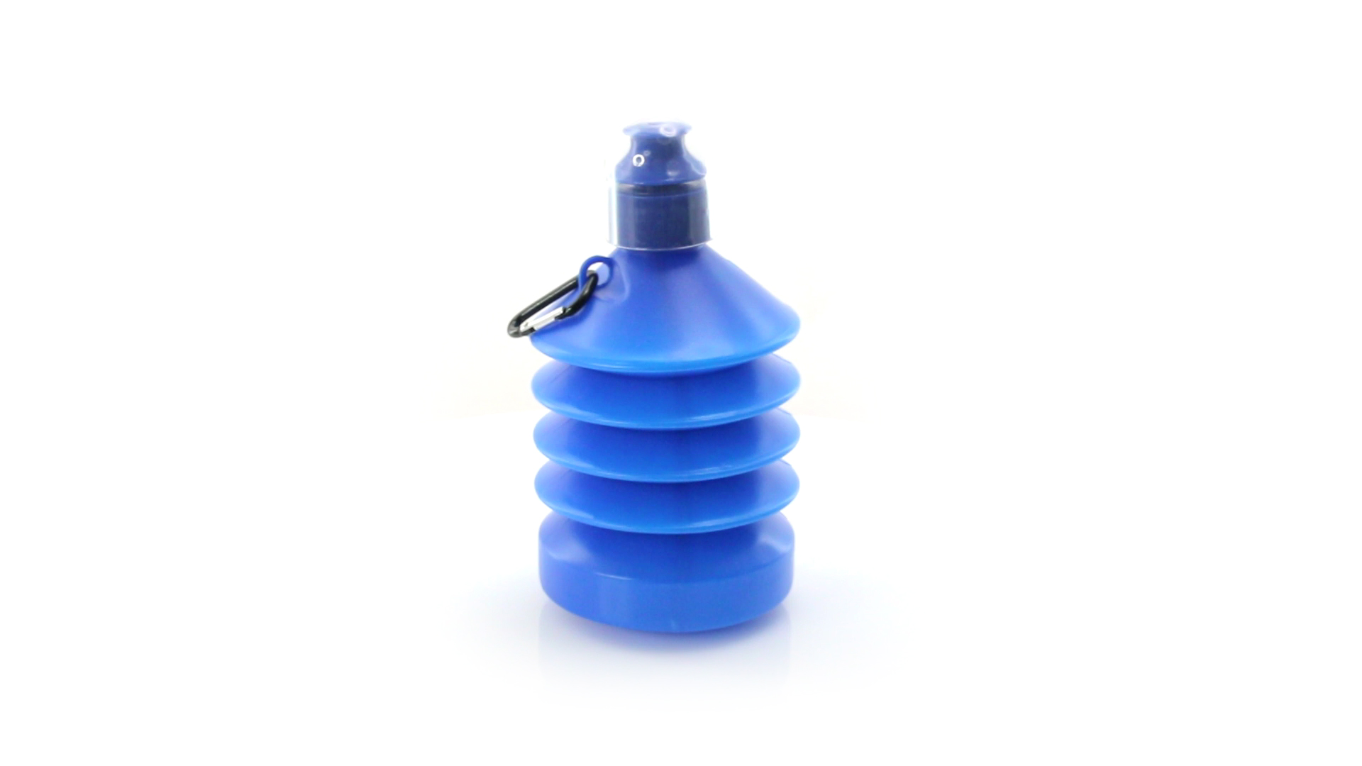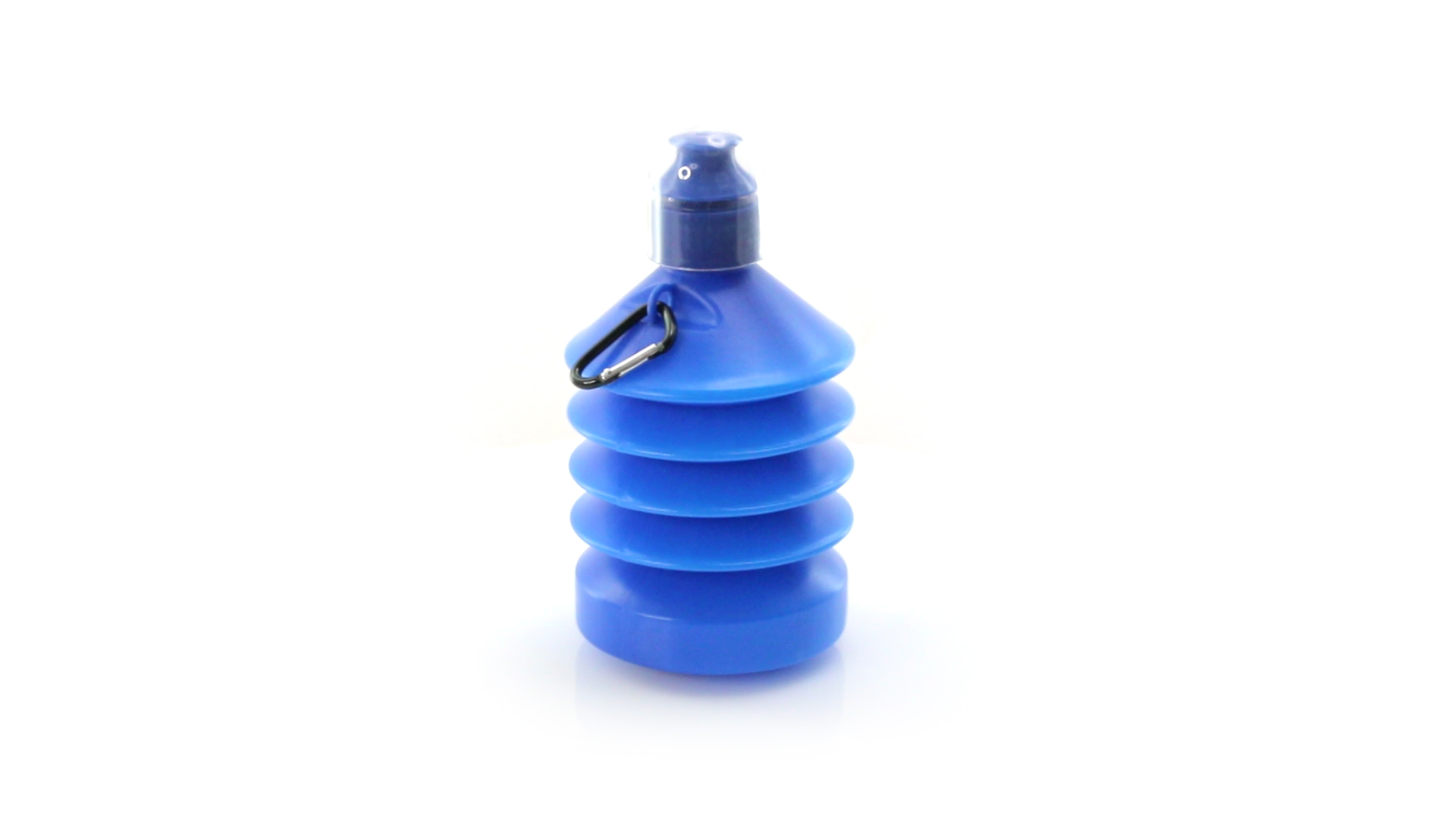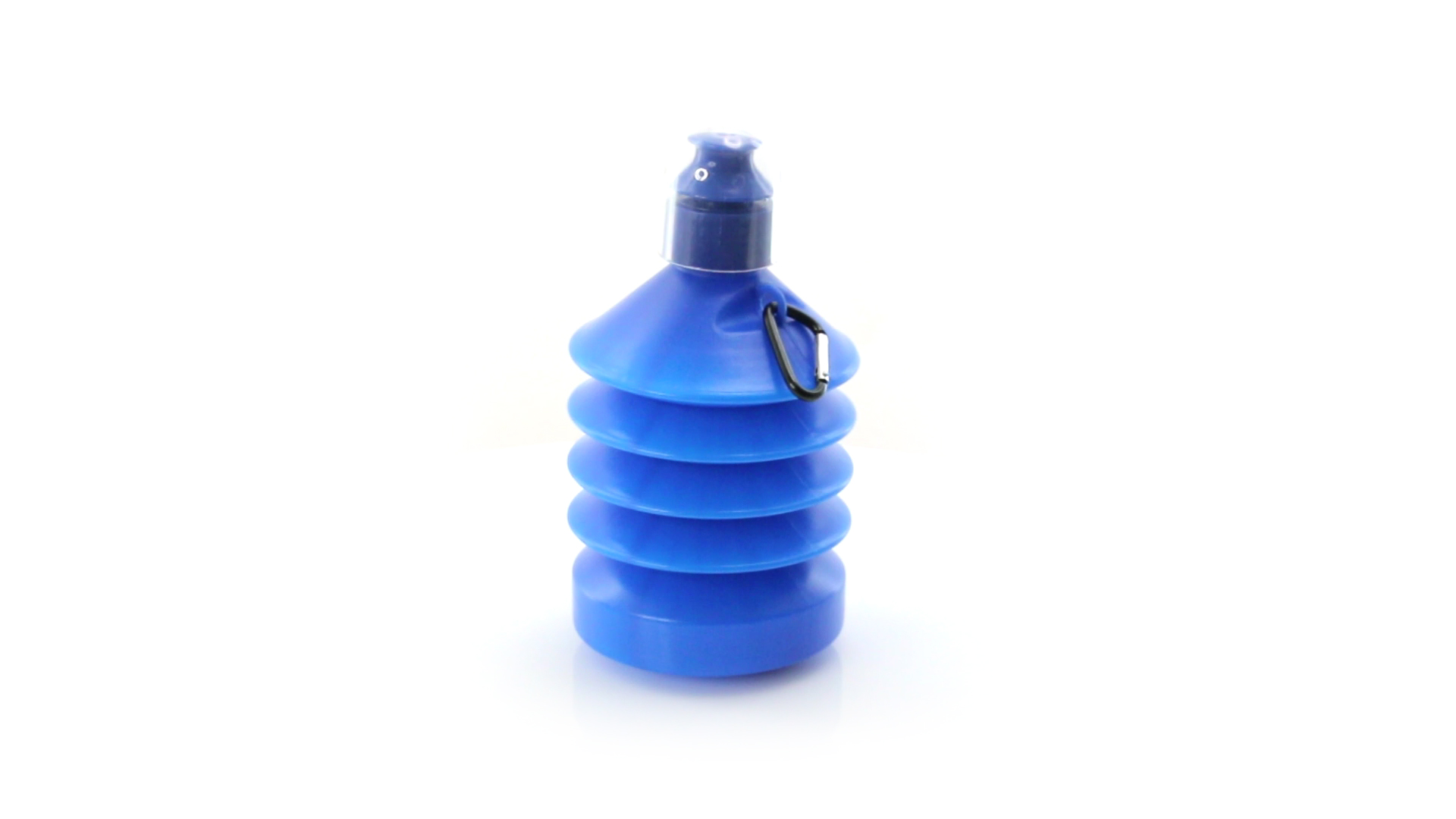 Klappbare Trinkflasche mit 570 ml Fassungsvermögen und ergonomischem Körper aus PE-Kunststoff in verschiedenen lebendigen Farben. Mit Sicherheitsspender mit Verschlusskappe sowie Befestigungskarabiner aus Metall.