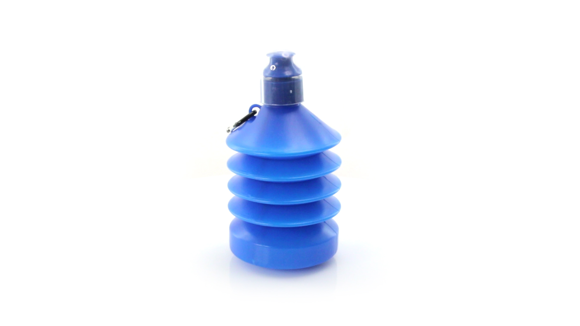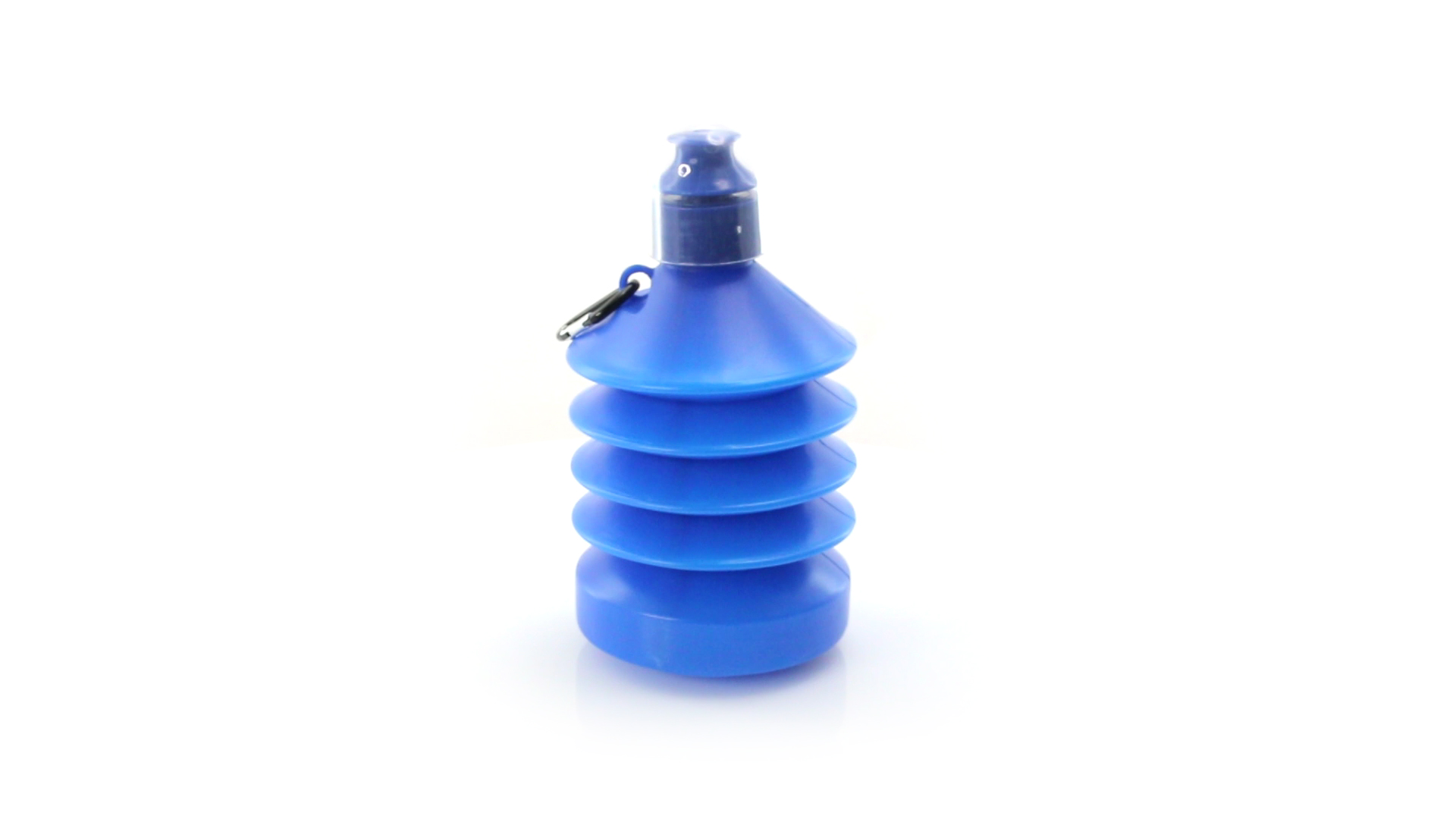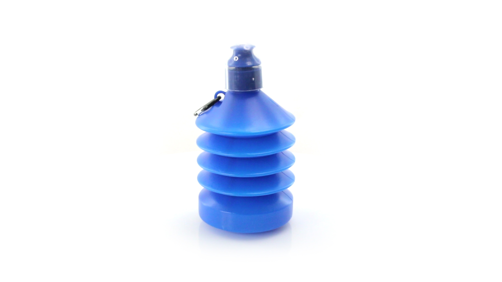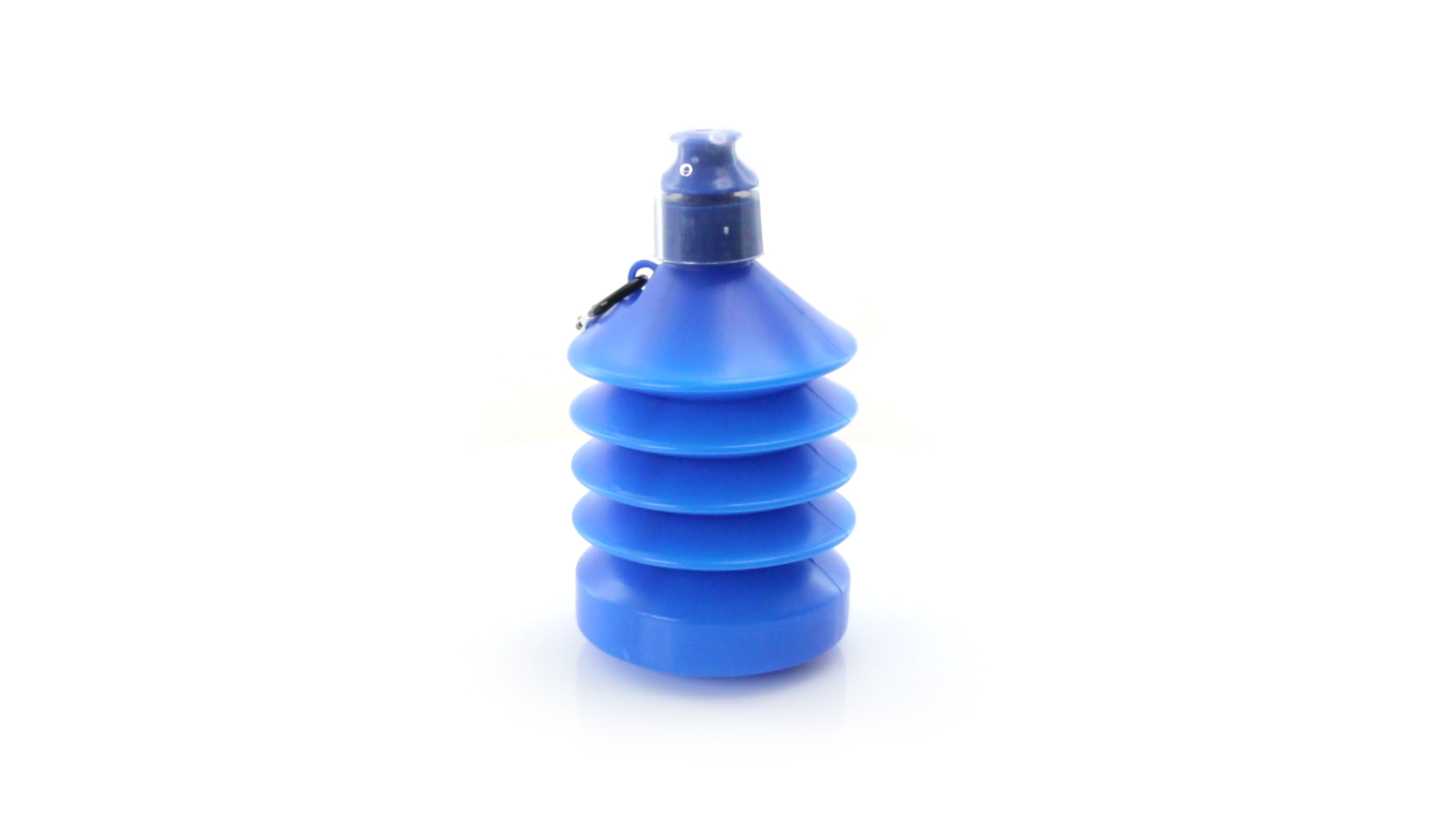 Klappbare Trinkflasche mit 570 ml Fassungsvermögen und ergonomischem Körper aus PE-Kunststoff in verschiedenen lebendigen Farben. Mit Sicherheitsspender mit Verschlusskappe sowie Befestigungskarabiner aus Metall.