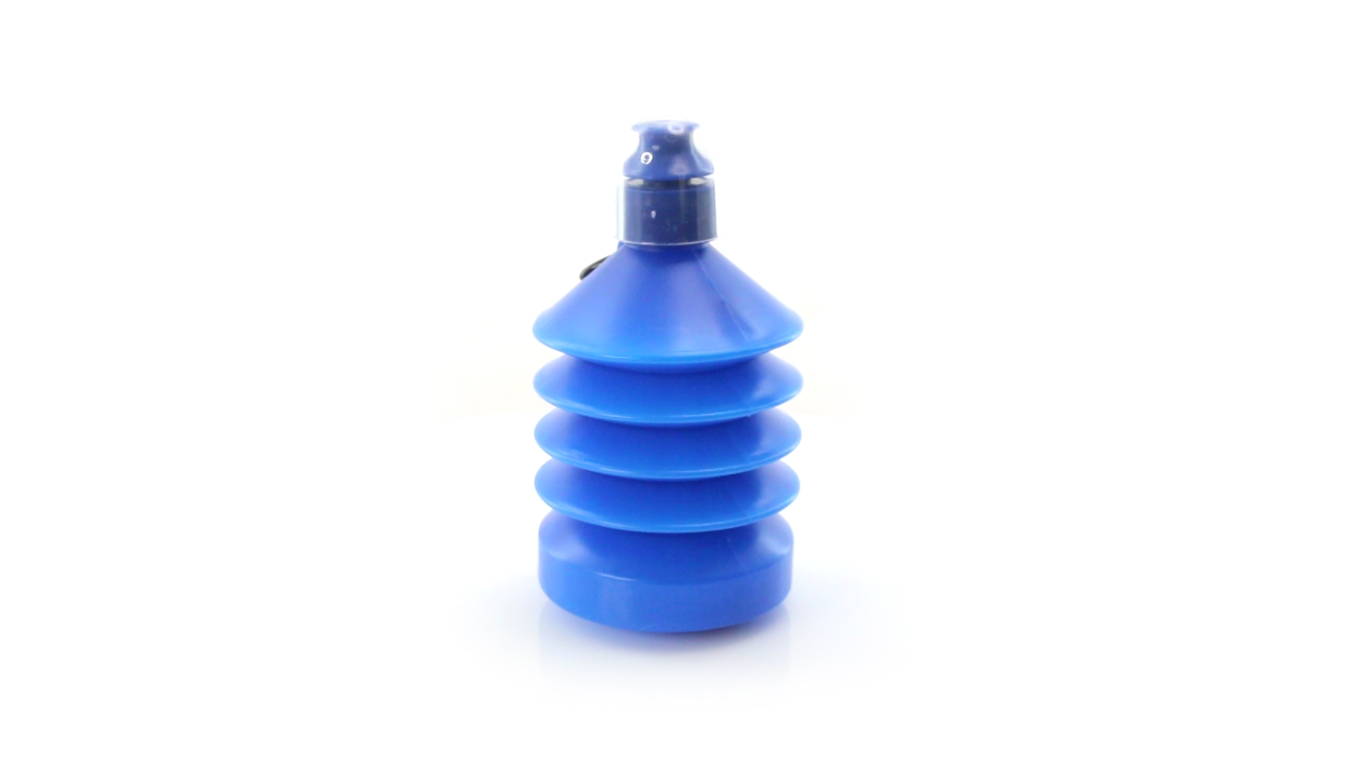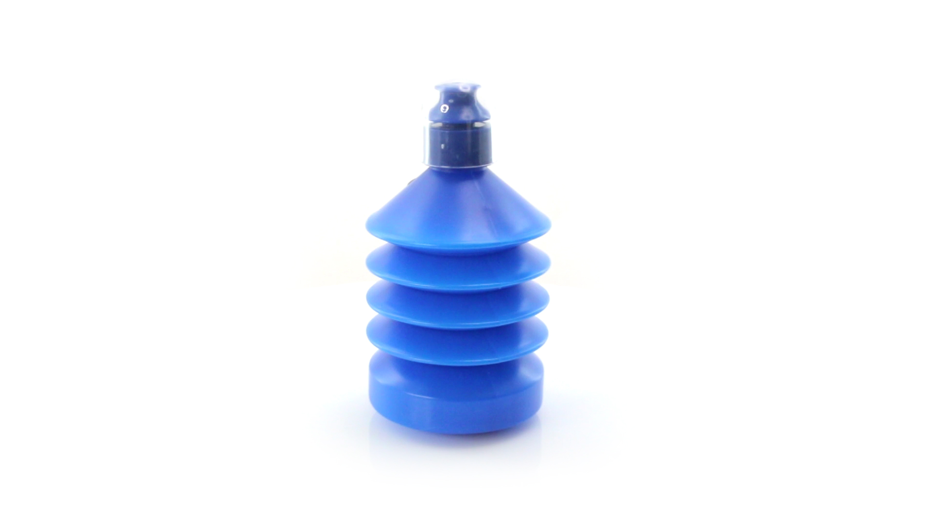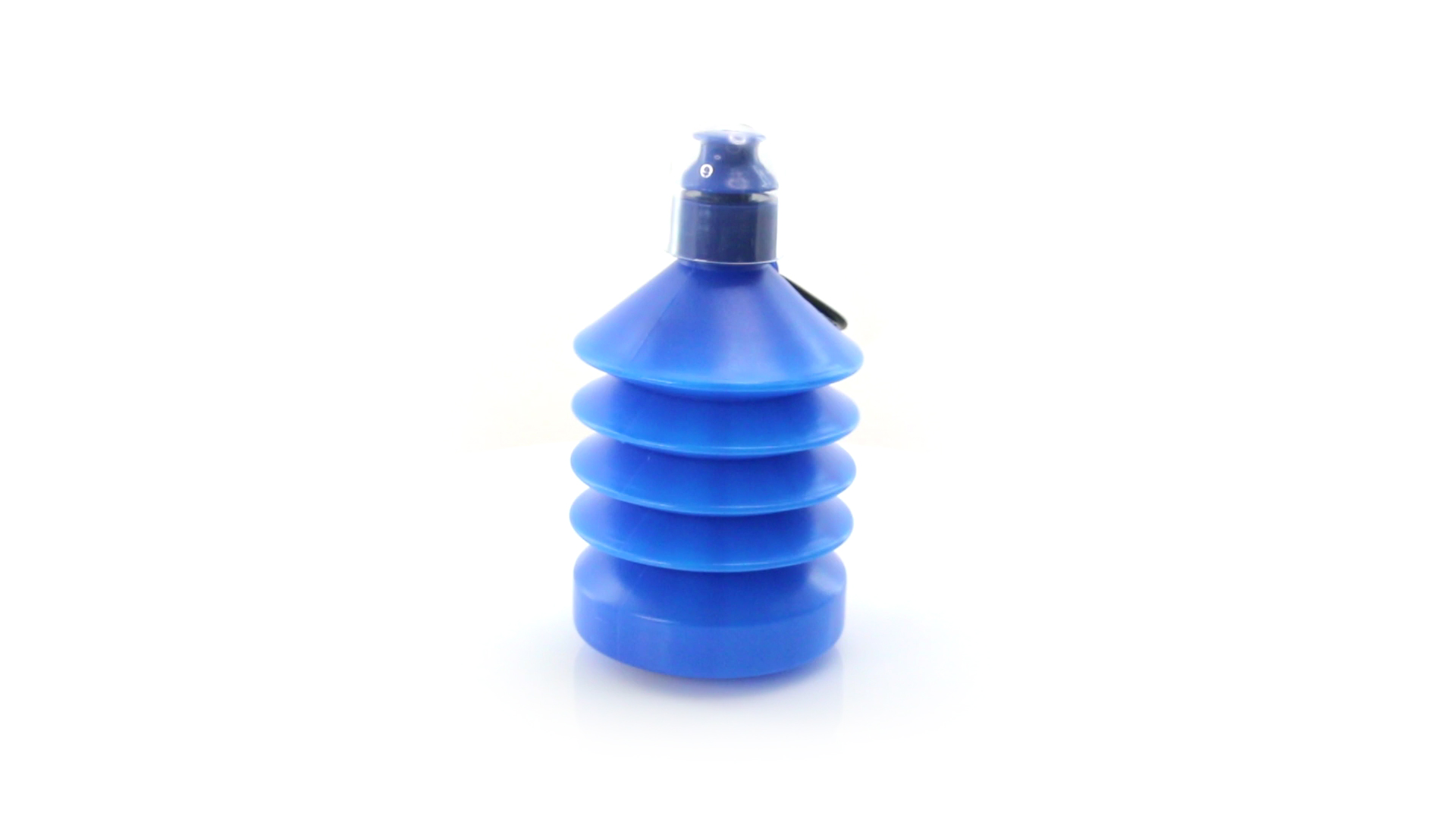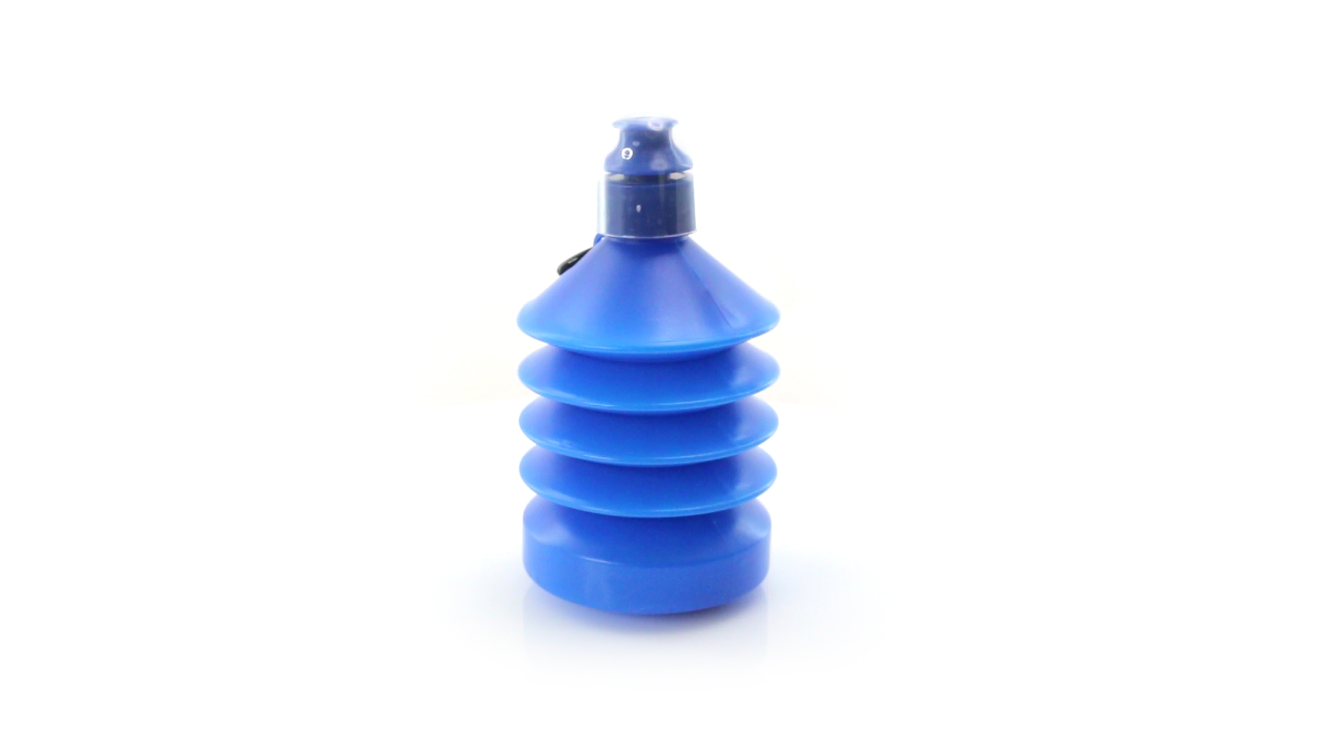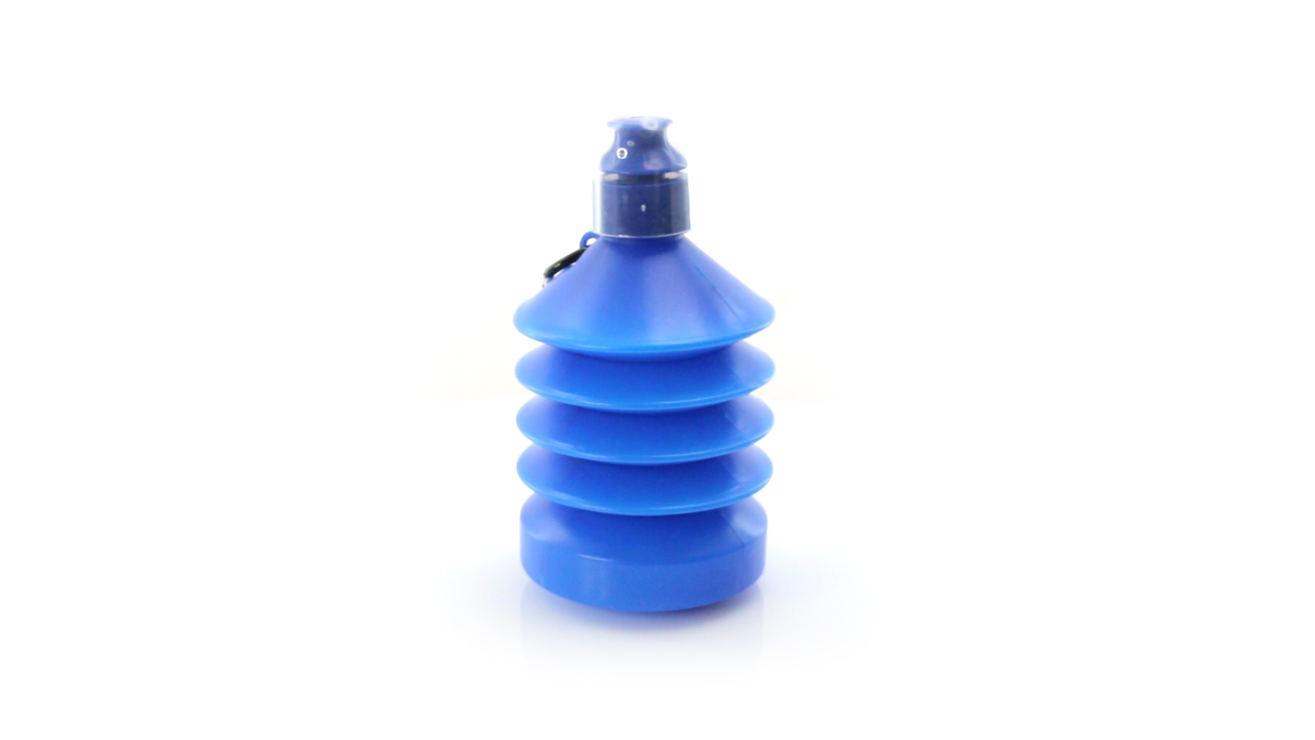 Klappbare Trinkflasche mit 570 ml Fassungsvermögen und ergonomischem Körper aus PE-Kunststoff in verschiedenen lebendigen Farben. Mit Sicherheitsspender mit Verschlusskappe sowie Befestigungskarabiner aus Metall.