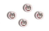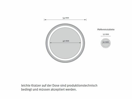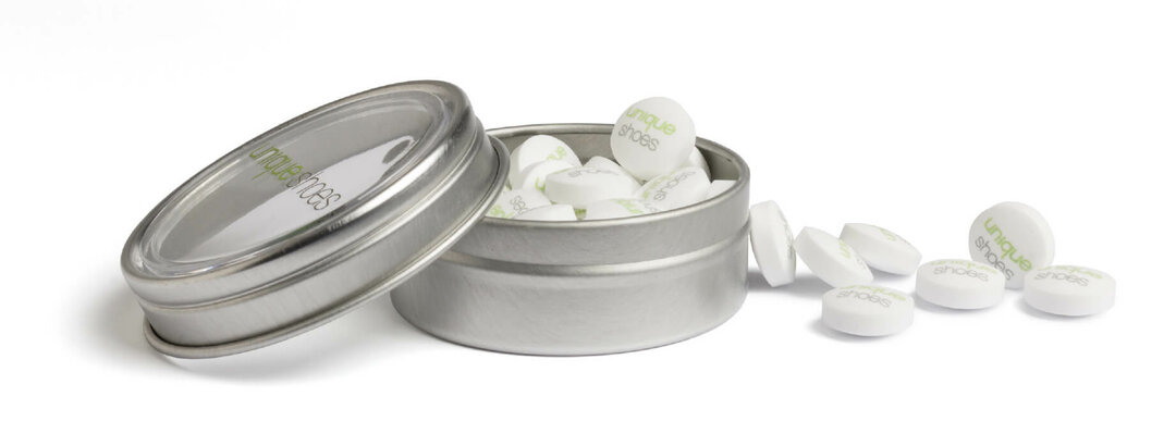 Stülpdeckeldose aus Weissblech in Blank mit Sichtfenster im Deckel aus transparentem Kunststoff gefüllt mit zuckerfreien Pfefferminz- oder Erdbeertabletten. Werbeanbringung auf Dosendeckel und Digitaldruck auf den Tabletten. Alle Druckfarben für die Tablet