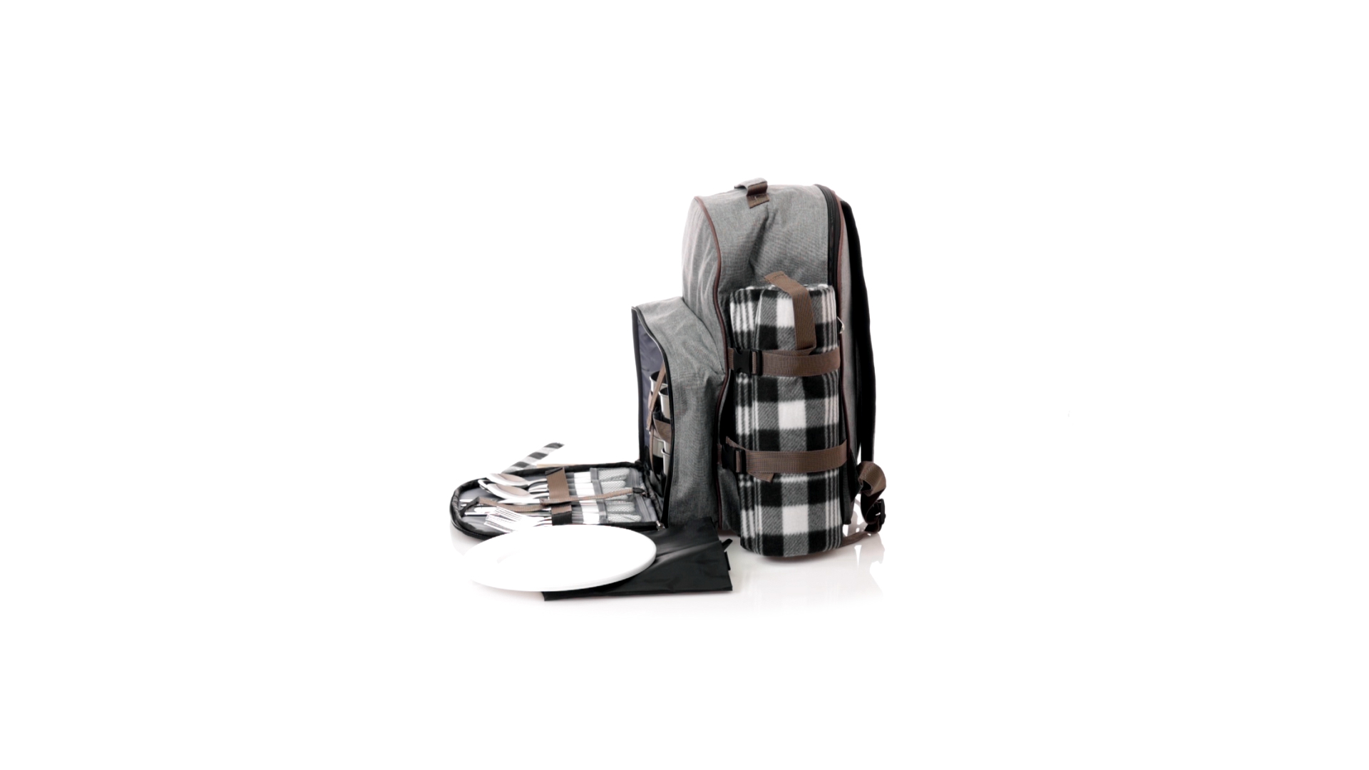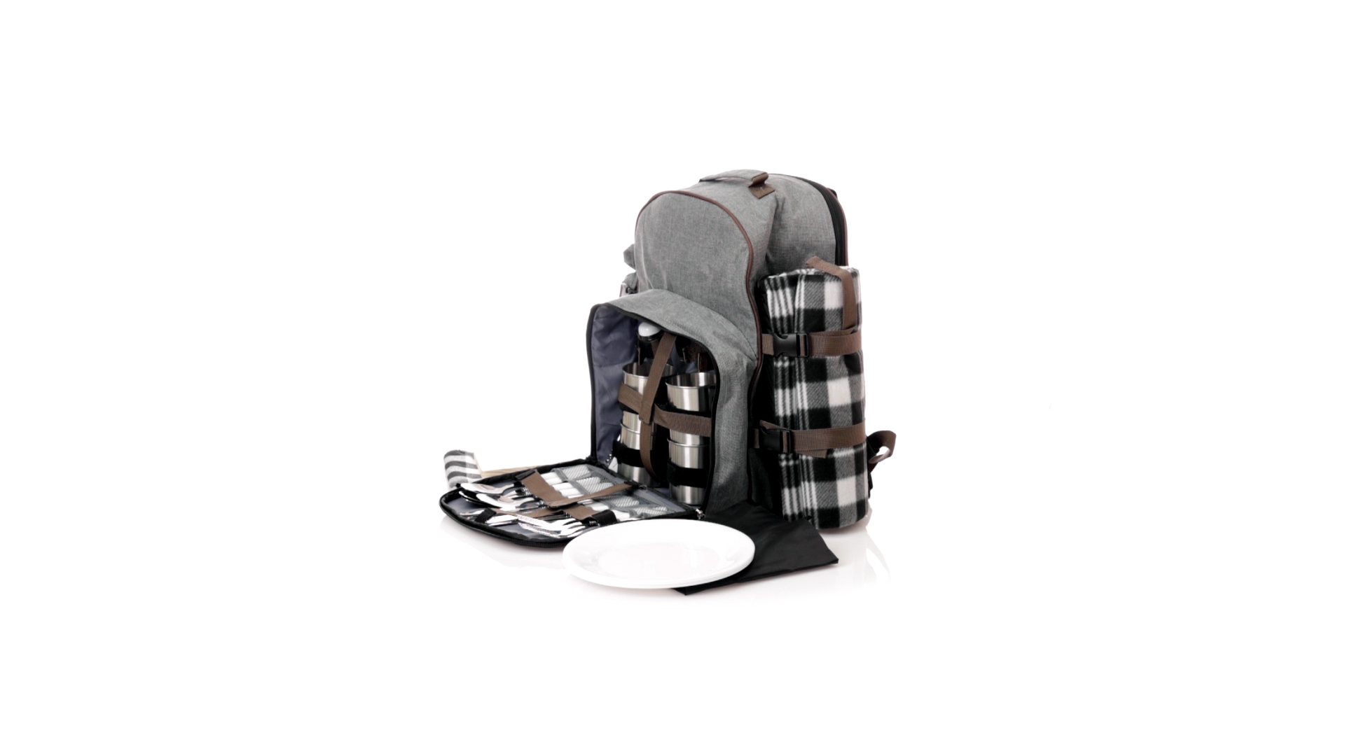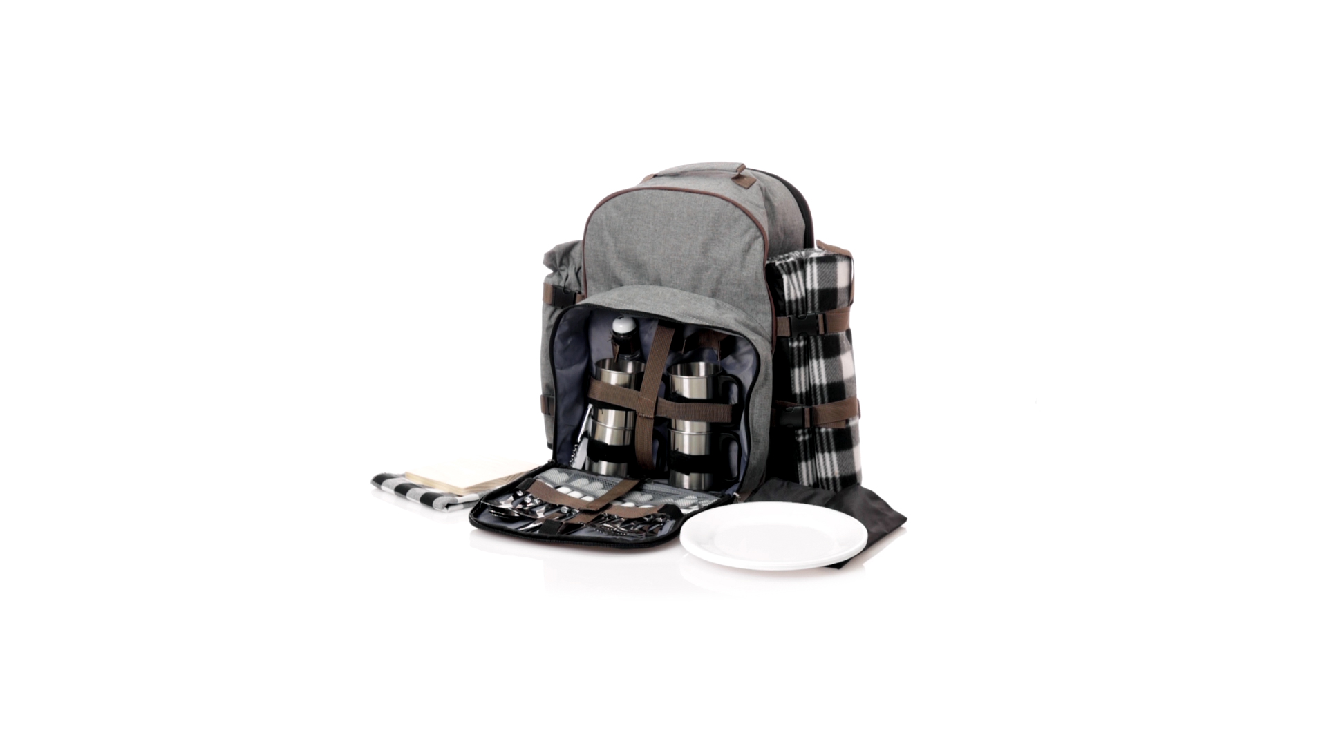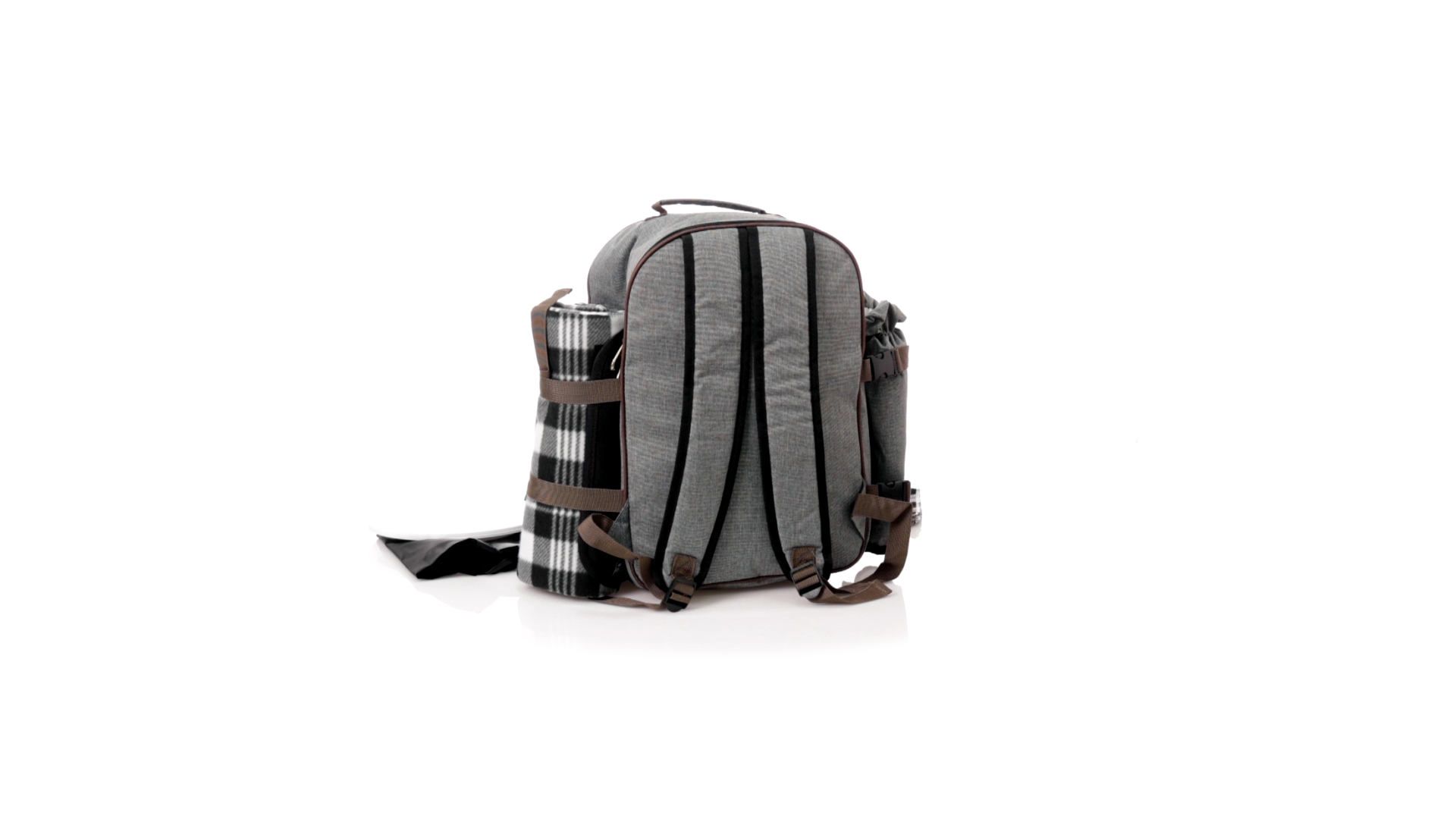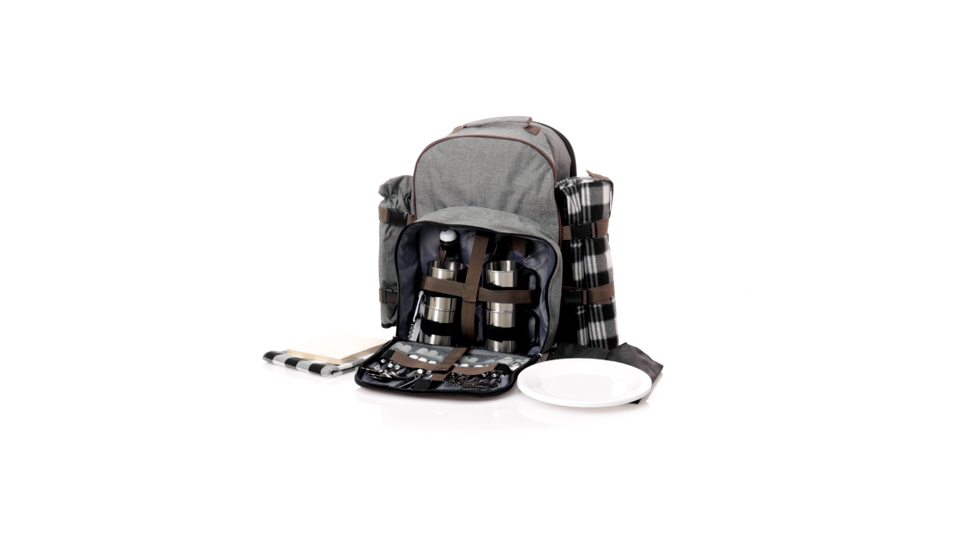 Picknick-Rucksack für 4 Personen mit komplettem Zubehör, hergestellt aus widerstandsfähigem 600D RPET. Graue Ausführung mit braunen Details Tragegriff und verstellbare gepolsterte Schultergurte. Hauptfach mit Reissverschluss und Metallzippern. Isothermisches EVA-Innen- und Aussenetikett mit dem unverwechselbaren RPET-Emblem. Einschliesslich:4 Becher aus rostfreiem Stahl.4 Löffel, 4 Messer und 4 Gabeln aus rostfreiem Stahl mit weissem PP-Griff.1 Spreizmesser aus Edelstahl mit weissem PP-Griff.4 weisse PP-Teller mit einem Durchmesser von 23 cm.4 Stoffservietten 30 x 30 cm. Mit Retro-Design im Karomuster und in einer Kombination aus schwarzen, grauen und weissen Tönen.Korkenzieheröffner aus Edelstahl mit weissem PP-Griff.Transparente Salz- und Pfefferstreuer mit weissem PP-Deckel.Schneide- und Präsentationsbrett aus Holz, Grösse 15x15 cm.Faltbare Tasche im Inneren.Passender Thermoflaschenhalter auf der rechten Seite, aus RPET und abnehmbar mit Schnallenverschlüssen.Hochwertige Picknick-Decke auf der linken Seite, mit verstellbaren Schnallenverschlüssen. Grösse 120x150cm, mit Soft-Touch-Sitzseite in zweifarbigem Schottenmuster. Isolierte Unterseite aus strapazierfähigem PEVA. Leicht zu falten und kompaktes Format, einschliesslich Tragegriff und Klappe mit Klettverschluss.RPET-Material wird aus recyceltem Kunststoff hergestellt, um die Wiederverwendung von Kunststoffabfällen zu fördern und die Nachhaltigkeit unseres Planeten zu unterstützen.