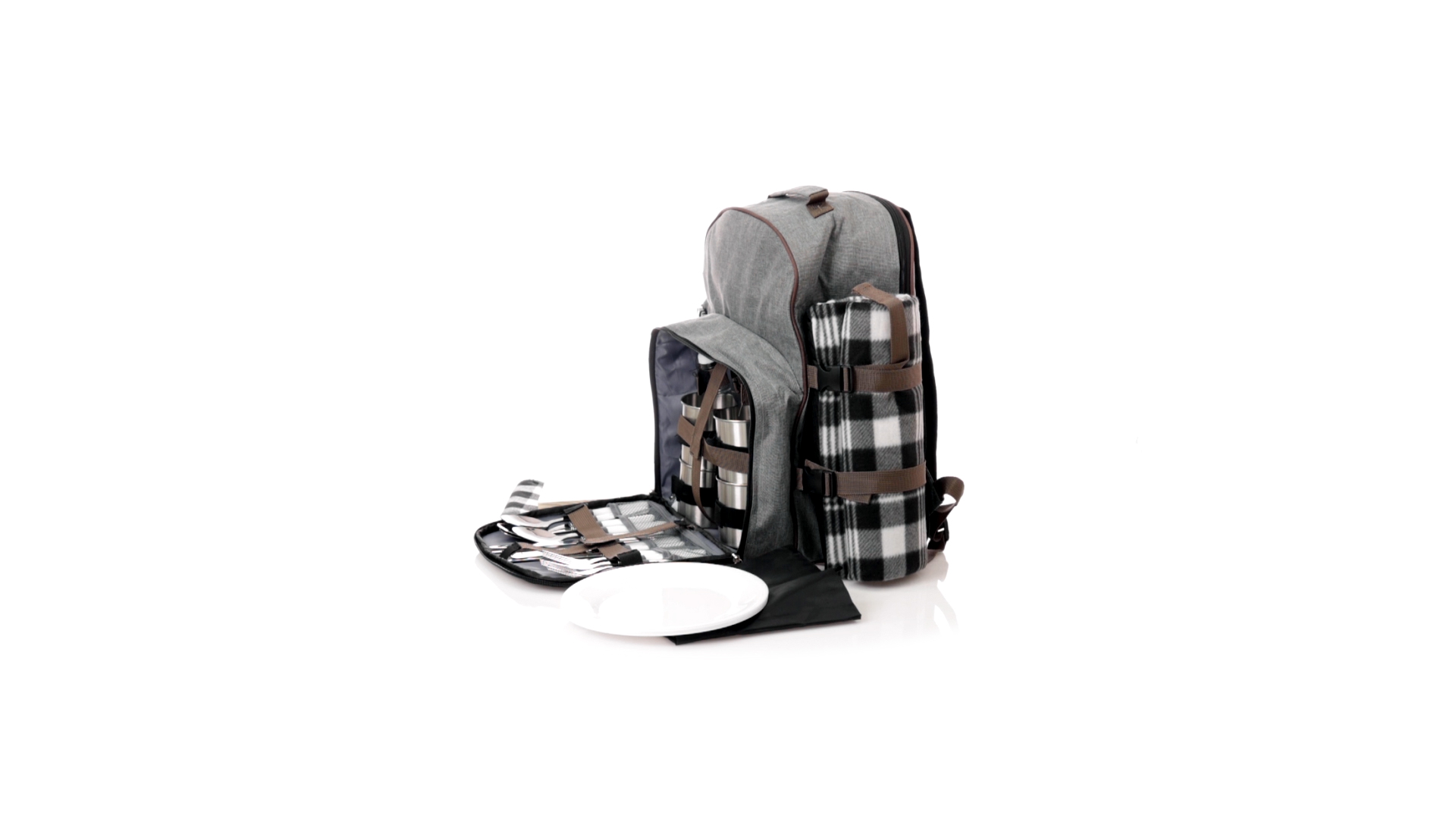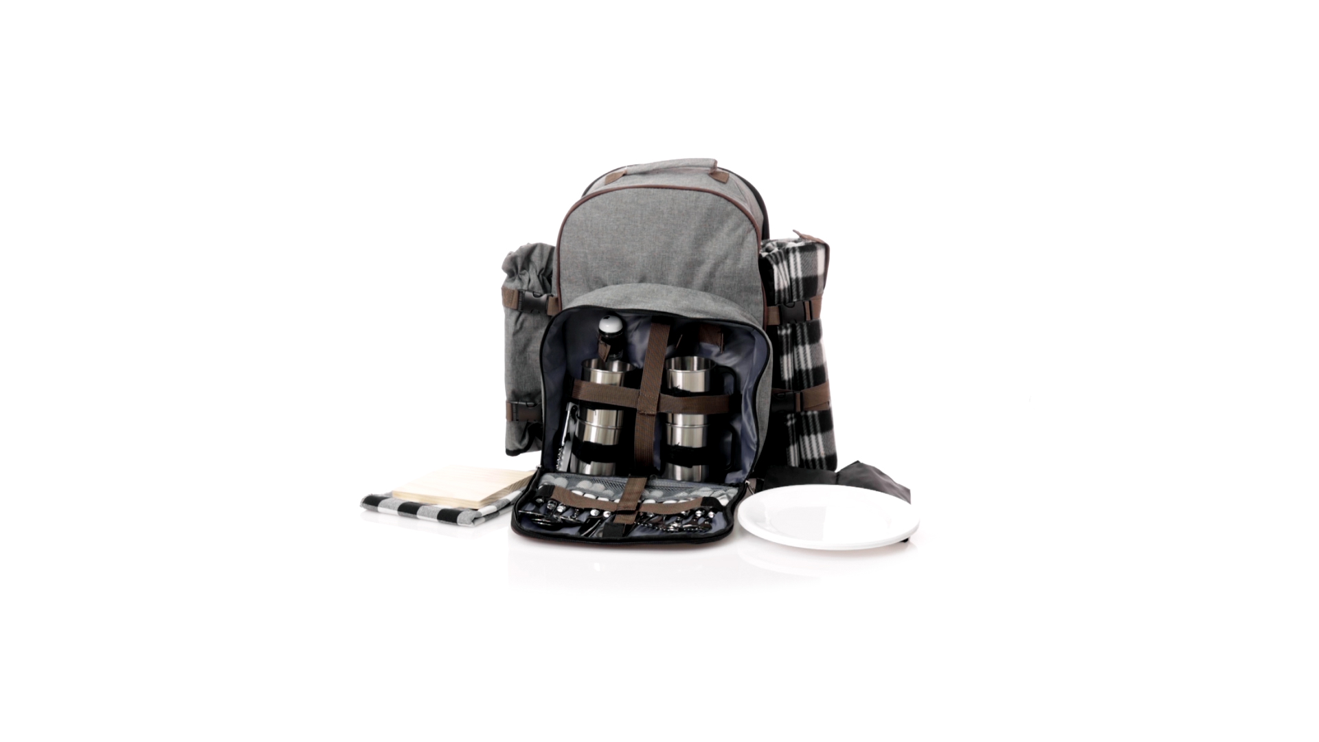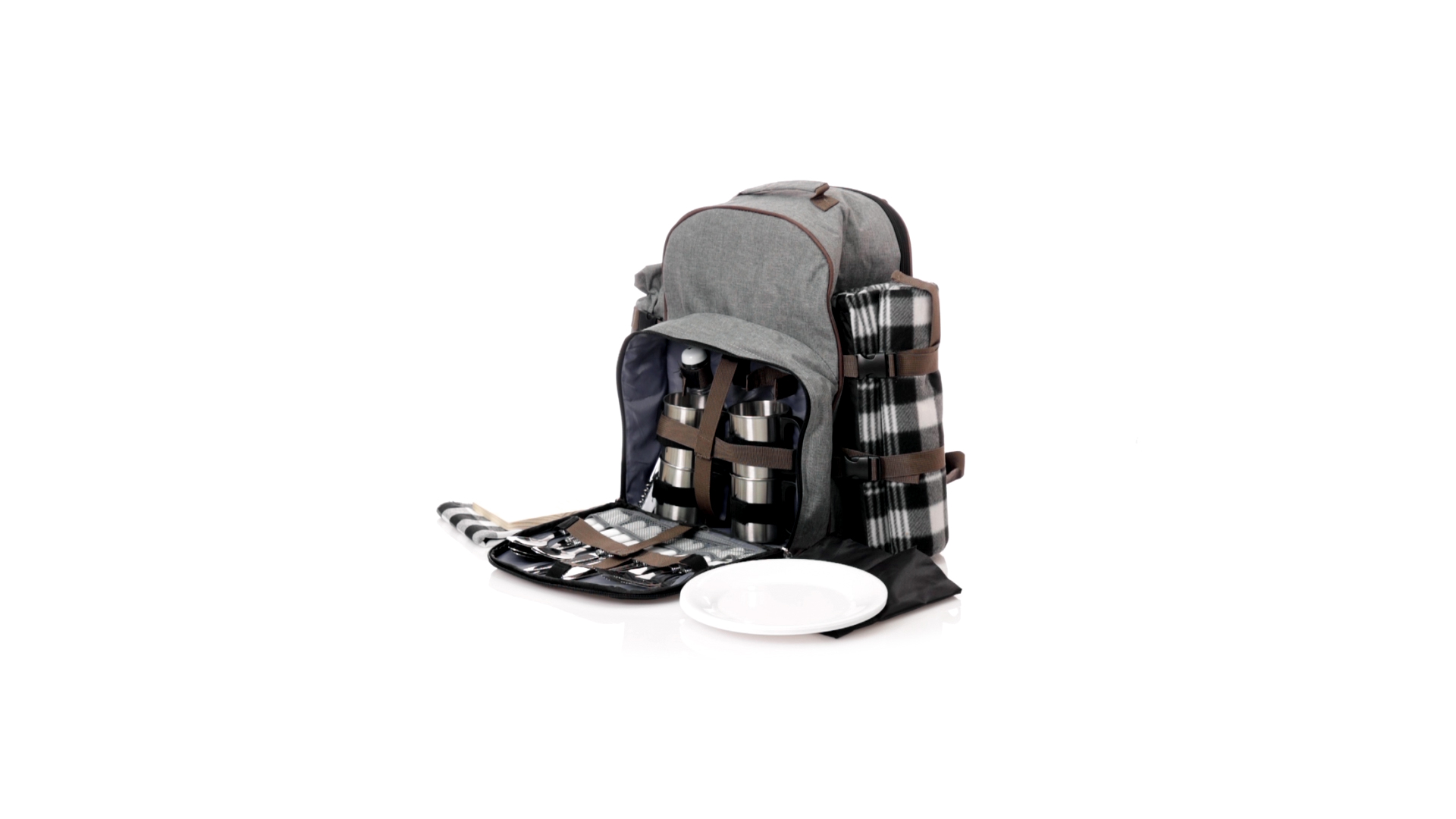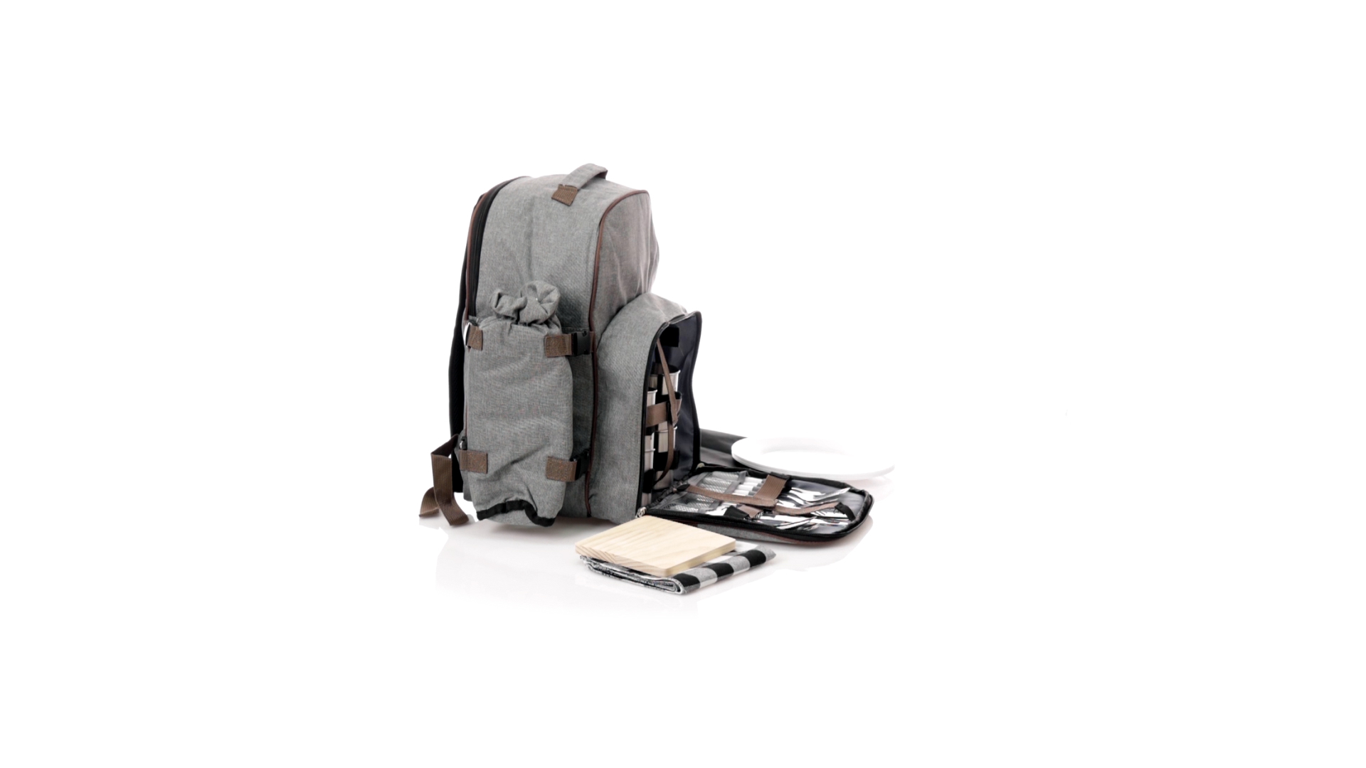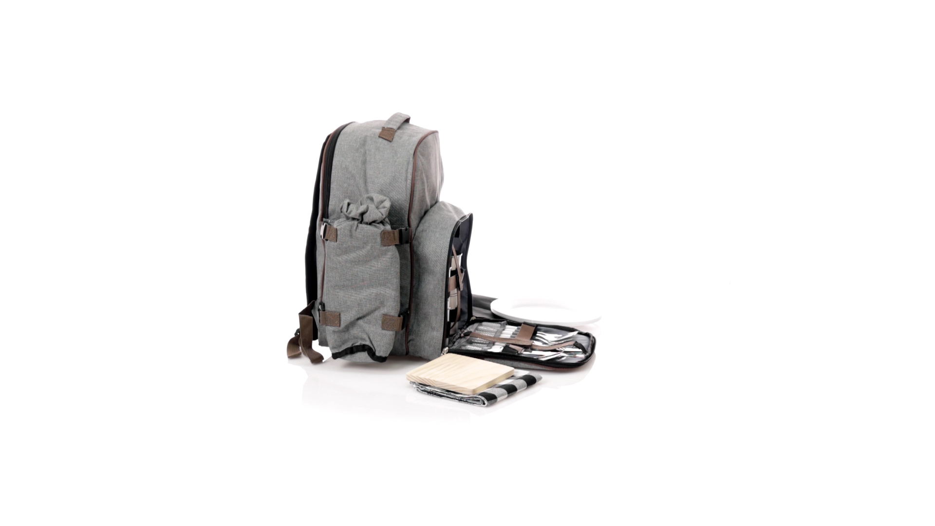 Picknick-Rucksack für 4 Personen mit komplettem Zubehör, hergestellt aus widerstandsfähigem 600D RPET. Graue Ausführung mit braunen Details Tragegriff und verstellbare gepolsterte Schultergurte. Hauptfach mit Reissverschluss und Metallzippern. Isothermisches EVA-Innen- und Aussenetikett mit dem unverwechselbaren RPET-Emblem. Einschliesslich:4 Becher aus rostfreiem Stahl.4 Löffel, 4 Messer und 4 Gabeln aus rostfreiem Stahl mit weissem PP-Griff.1 Spreizmesser aus Edelstahl mit weissem PP-Griff.4 weisse PP-Teller mit einem Durchmesser von 23 cm.4 Stoffservietten 30 x 30 cm. Mit Retro-Design im Karomuster und in einer Kombination aus schwarzen, grauen und weissen Tönen.Korkenzieheröffner aus Edelstahl mit weissem PP-Griff.Transparente Salz- und Pfefferstreuer mit weissem PP-Deckel.Schneide- und Präsentationsbrett aus Holz, Grösse 15x15 cm.Faltbare Tasche im Inneren.Passender Thermoflaschenhalter auf der rechten Seite, aus RPET und abnehmbar mit Schnallenverschlüssen.Hochwertige Picknick-Decke auf der linken Seite, mit verstellbaren Schnallenverschlüssen. Grösse 120x150cm, mit Soft-Touch-Sitzseite in zweifarbigem Schottenmuster. Isolierte Unterseite aus strapazierfähigem PEVA. Leicht zu falten und kompaktes Format, einschliesslich Tragegriff und Klappe mit Klettverschluss.RPET-Material wird aus recyceltem Kunststoff hergestellt, um die Wiederverwendung von Kunststoffabfällen zu fördern und die Nachhaltigkeit unseres Planeten zu unterstützen.