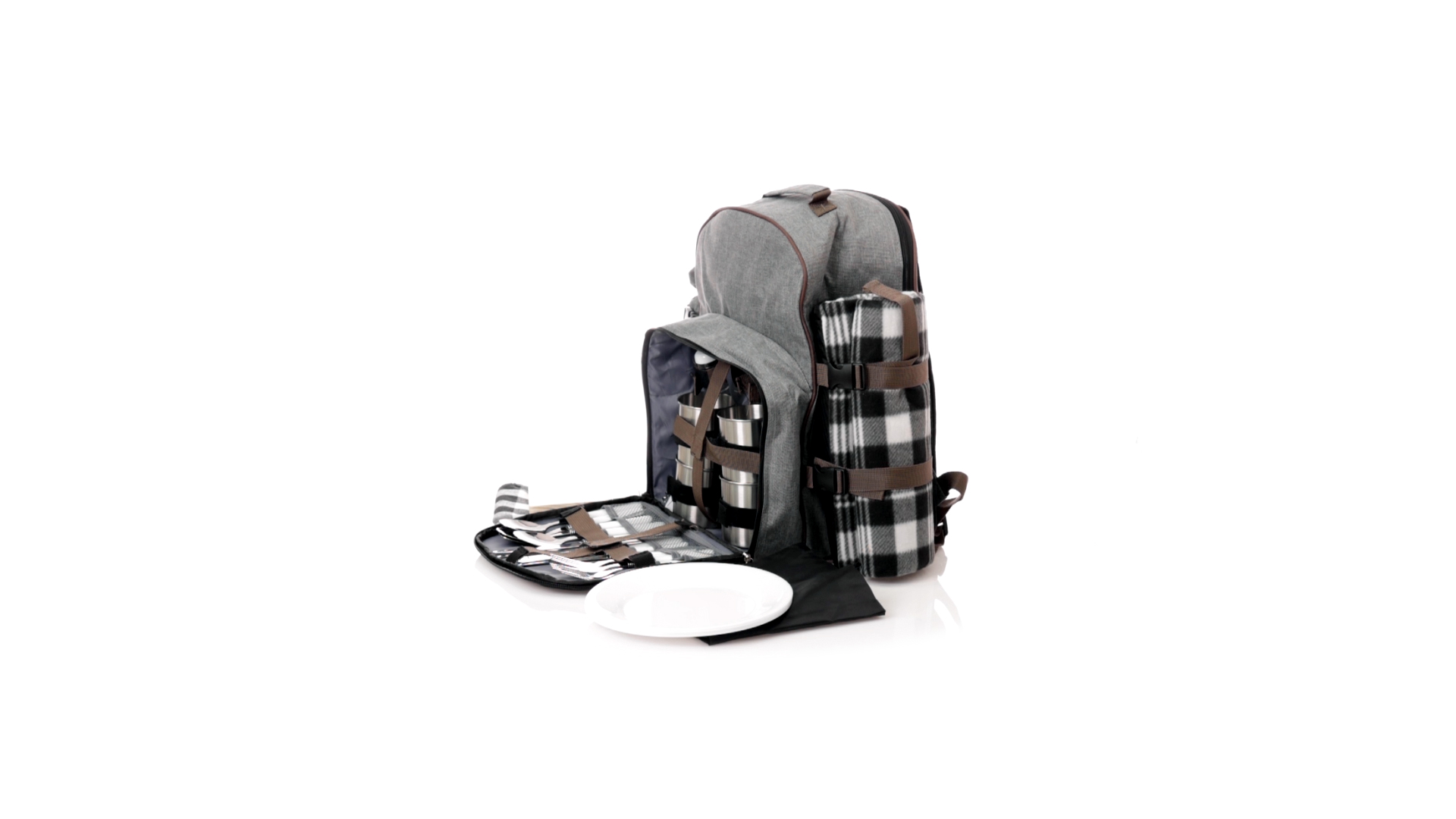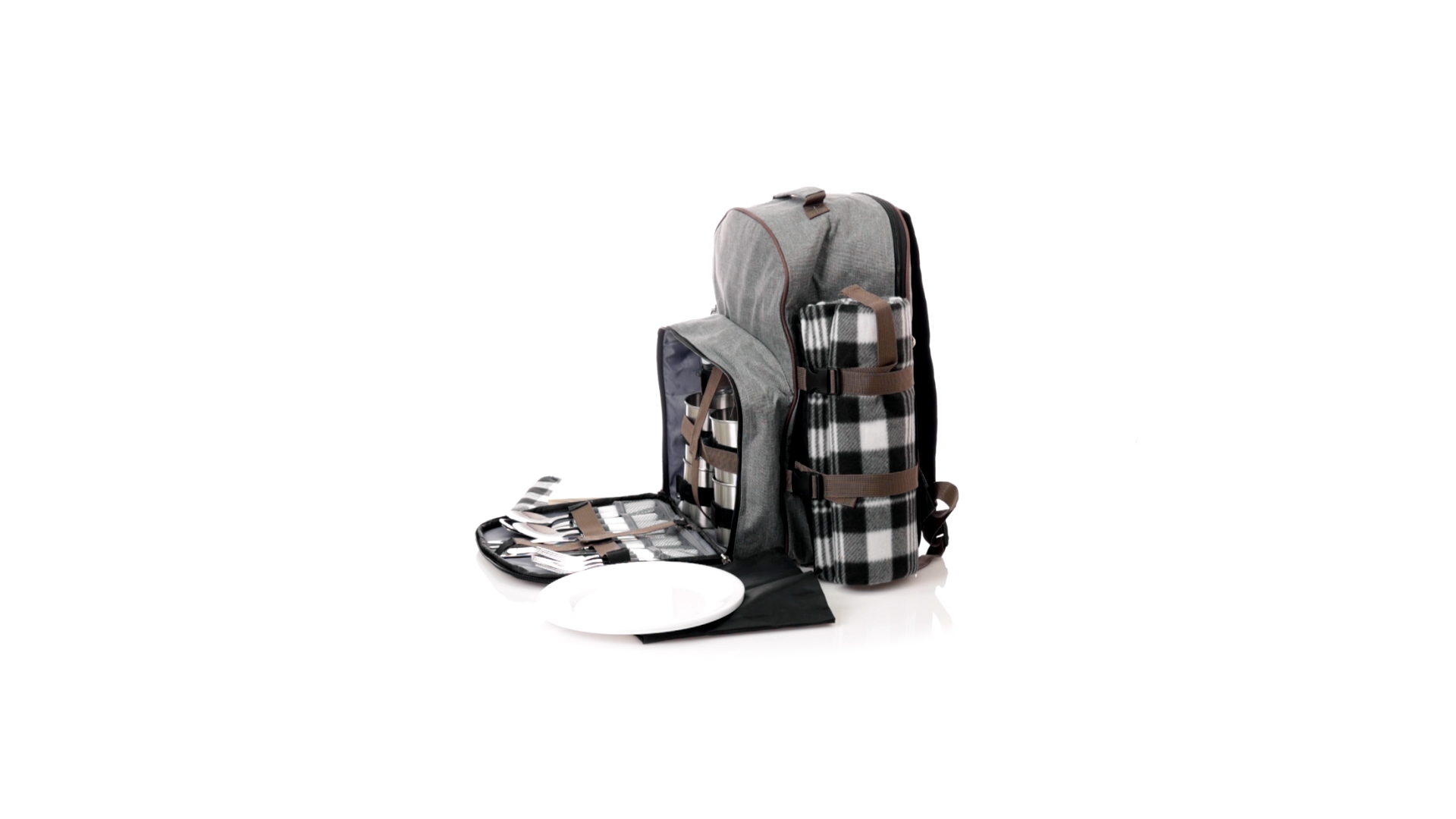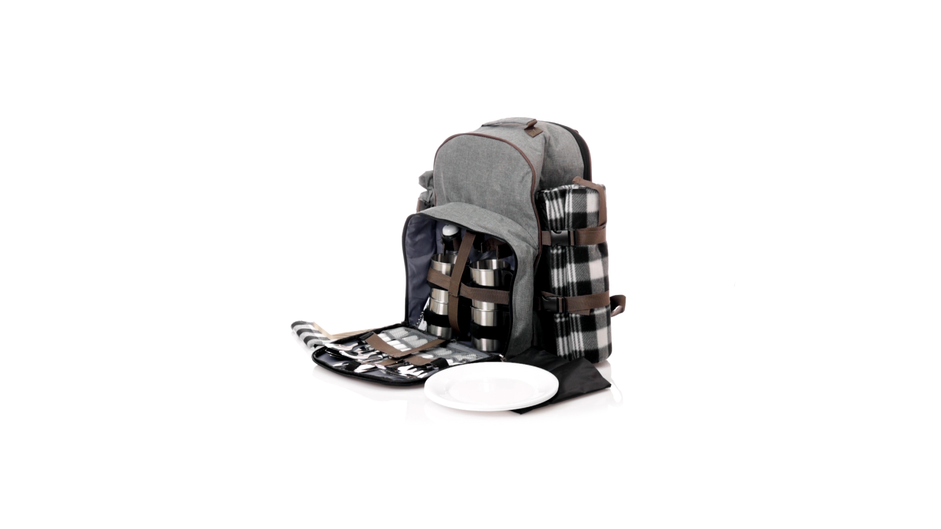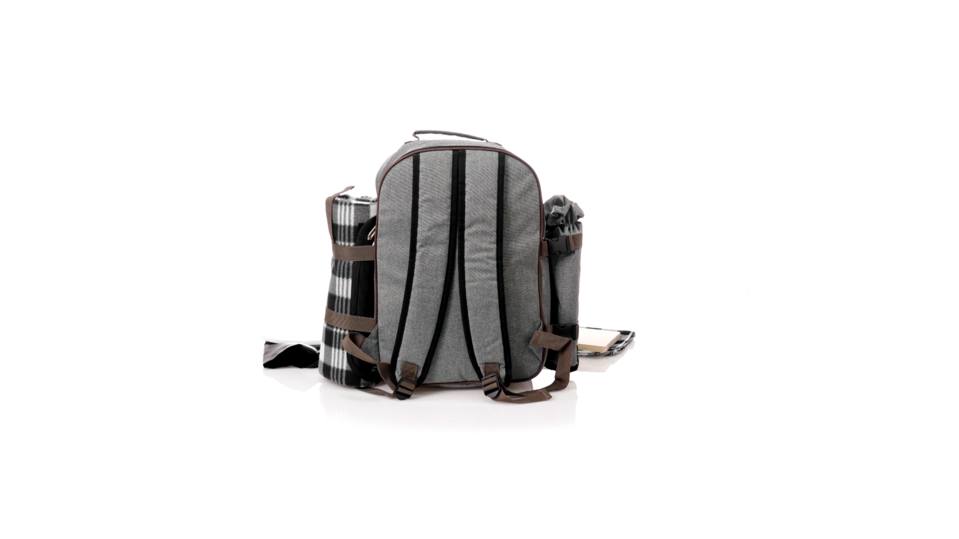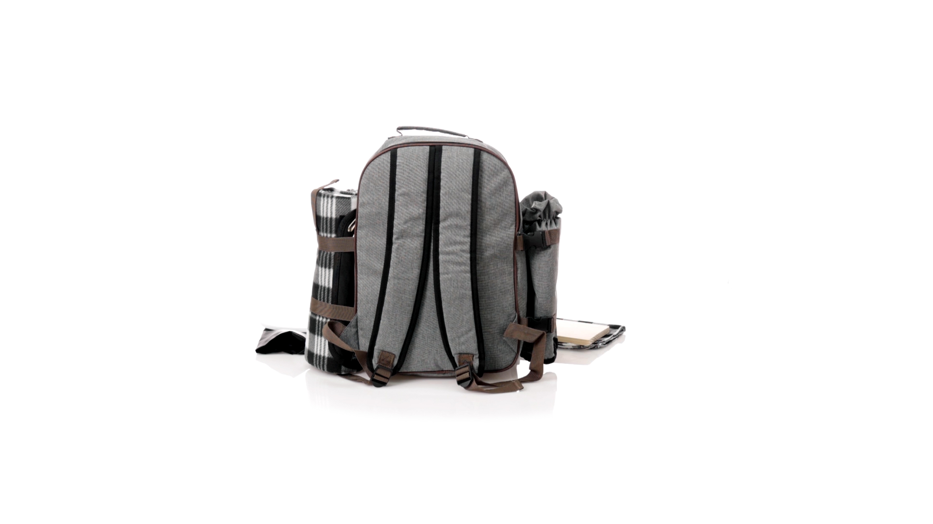 Picknick-Rucksack für 4 Personen mit komplettem Zubehör, hergestellt aus widerstandsfähigem 600D RPET. Graue Ausführung mit braunen Details Tragegriff und verstellbare gepolsterte Schultergurte. Hauptfach mit Reissverschluss und Metallzippern. Isothermisches EVA-Innen- und Aussenetikett mit dem unverwechselbaren RPET-Emblem. Einschliesslich:4 Becher aus rostfreiem Stahl.4 Löffel, 4 Messer und 4 Gabeln aus rostfreiem Stahl mit weissem PP-Griff.1 Spreizmesser aus Edelstahl mit weissem PP-Griff.4 weisse PP-Teller mit einem Durchmesser von 23 cm.4 Stoffservietten 30 x 30 cm. Mit Retro-Design im Karomuster und in einer Kombination aus schwarzen, grauen und weissen Tönen.Korkenzieheröffner aus Edelstahl mit weissem PP-Griff.Transparente Salz- und Pfefferstreuer mit weissem PP-Deckel.Schneide- und Präsentationsbrett aus Holz, Grösse 15x15 cm.Faltbare Tasche im Inneren.Passender Thermoflaschenhalter auf der rechten Seite, aus RPET und abnehmbar mit Schnallenverschlüssen.Hochwertige Picknick-Decke auf der linken Seite, mit verstellbaren Schnallenverschlüssen. Grösse 120x150cm, mit Soft-Touch-Sitzseite in zweifarbigem Schottenmuster. Isolierte Unterseite aus strapazierfähigem PEVA. Leicht zu falten und kompaktes Format, einschliesslich Tragegriff und Klappe mit Klettverschluss.RPET-Material wird aus recyceltem Kunststoff hergestellt, um die Wiederverwendung von Kunststoffabfällen zu fördern und die Nachhaltigkeit unseres Planeten zu unterstützen.