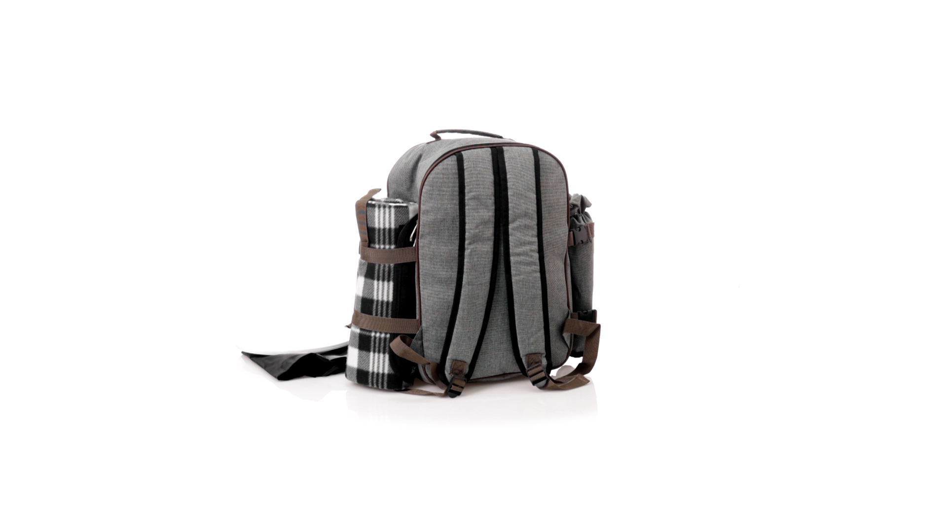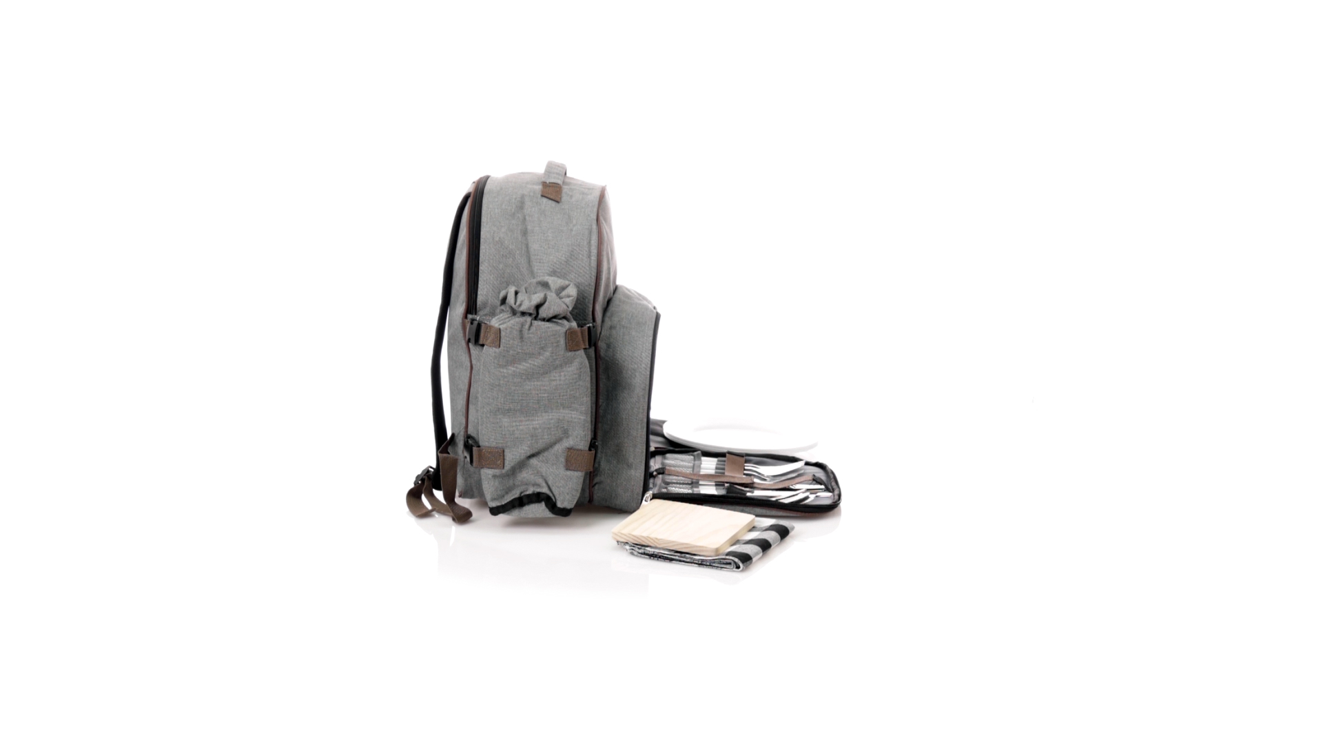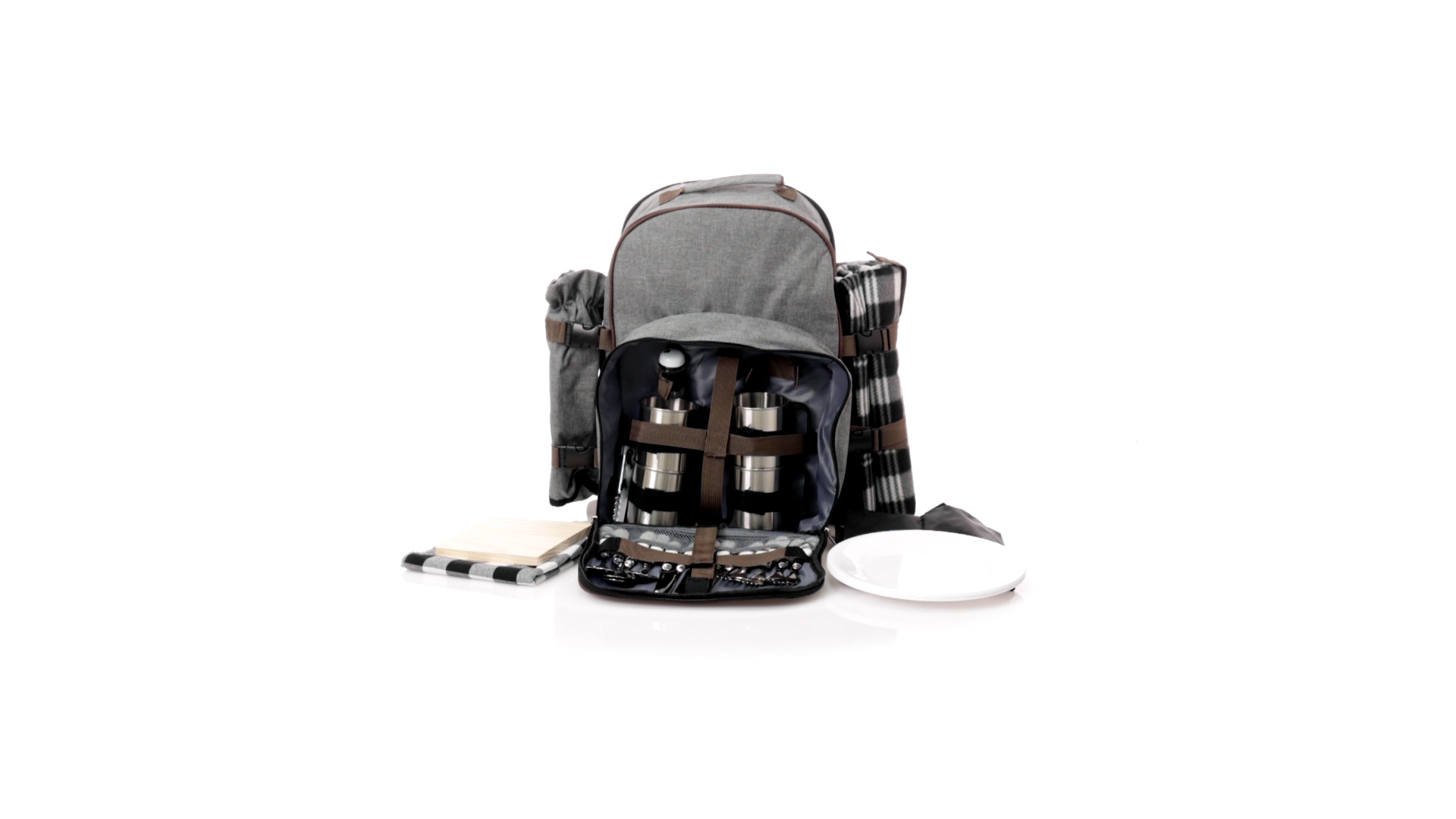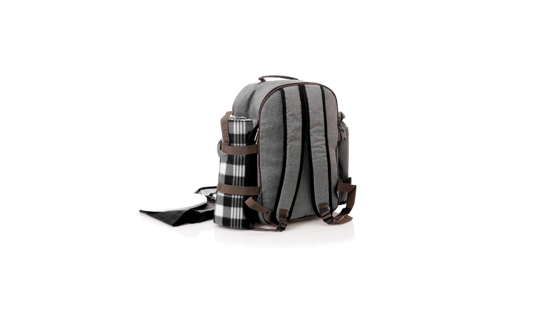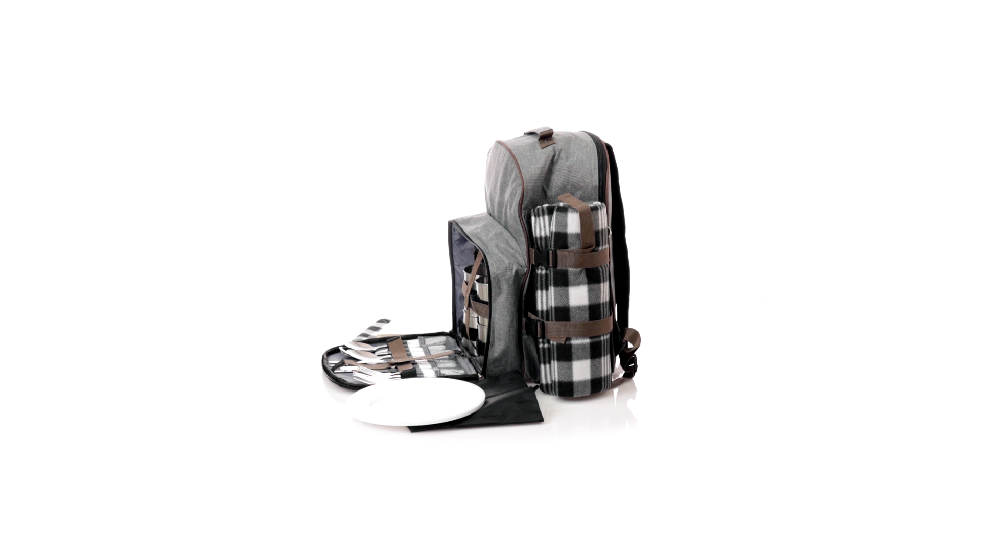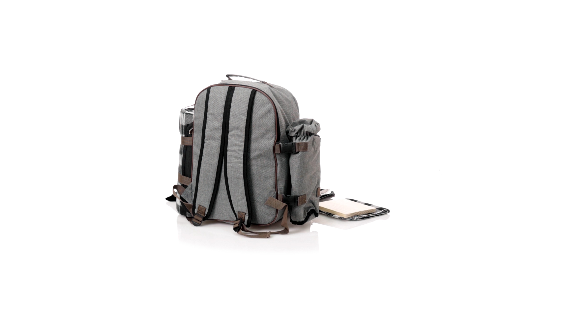 Picknick-Rucksack für 4 Personen mit komplettem Zubehör, hergestellt aus widerstandsfähigem 600D RPET. Graue Ausführung mit braunen Details Tragegriff und verstellbare gepolsterte Schultergurte. Hauptfach mit Reissverschluss und Metallzippern. Isothermisches EVA-Innen- und Aussenetikett mit dem unverwechselbaren RPET-Emblem. Einschliesslich:4 Becher aus rostfreiem Stahl.4 Löffel, 4 Messer und 4 Gabeln aus rostfreiem Stahl mit weissem PP-Griff.1 Spreizmesser aus Edelstahl mit weissem PP-Griff.4 weisse PP-Teller mit einem Durchmesser von 23 cm.4 Stoffservietten 30 x 30 cm. Mit Retro-Design im Karomuster und in einer Kombination aus schwarzen, grauen und weissen Tönen.Korkenzieheröffner aus Edelstahl mit weissem PP-Griff.Transparente Salz- und Pfefferstreuer mit weissem PP-Deckel.Schneide- und Präsentationsbrett aus Holz, Grösse 15x15 cm.Faltbare Tasche im Inneren.Passender Thermoflaschenhalter auf der rechten Seite, aus RPET und abnehmbar mit Schnallenverschlüssen.Hochwertige Picknick-Decke auf der linken Seite, mit verstellbaren Schnallenverschlüssen. Grösse 120x150cm, mit Soft-Touch-Sitzseite in zweifarbigem Schottenmuster. Isolierte Unterseite aus strapazierfähigem PEVA. Leicht zu falten und kompaktes Format, einschliesslich Tragegriff und Klappe mit Klettverschluss.RPET-Material wird aus recyceltem Kunststoff hergestellt, um die Wiederverwendung von Kunststoffabfällen zu fördern und die Nachhaltigkeit unseres Planeten zu unterstützen.