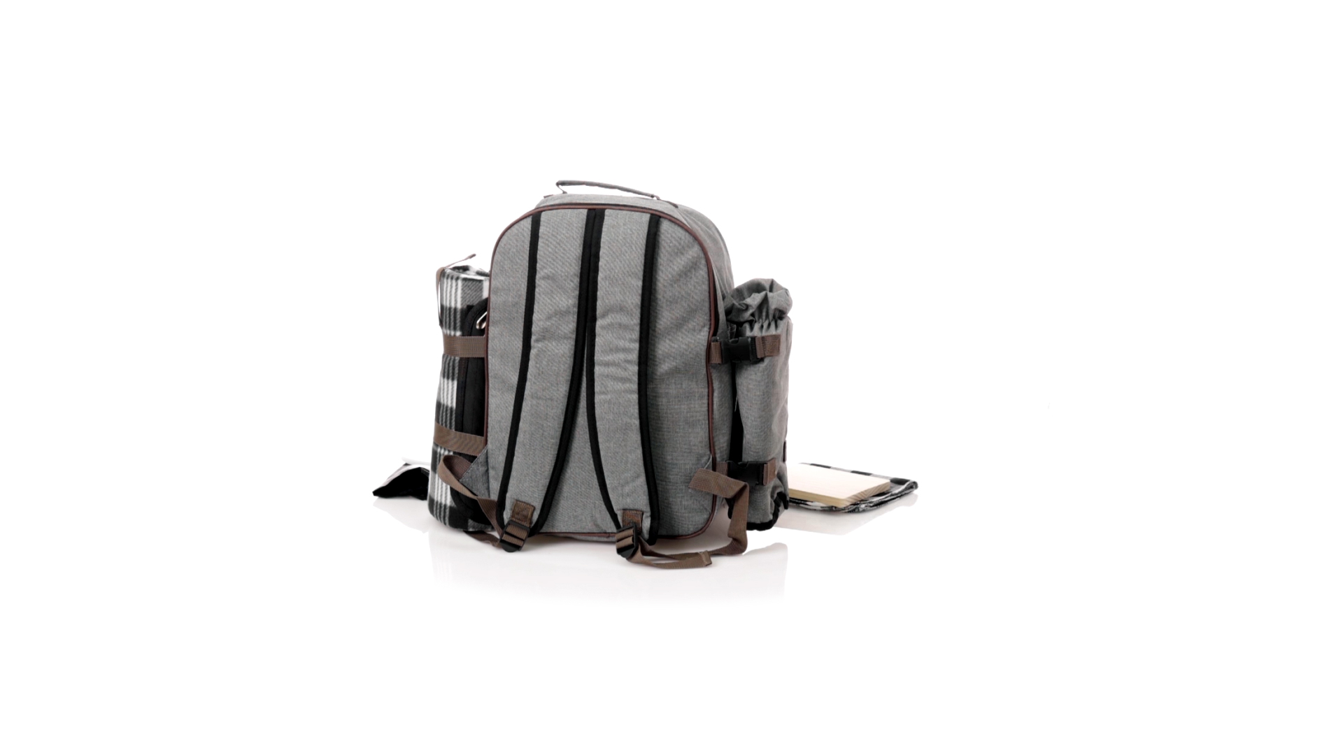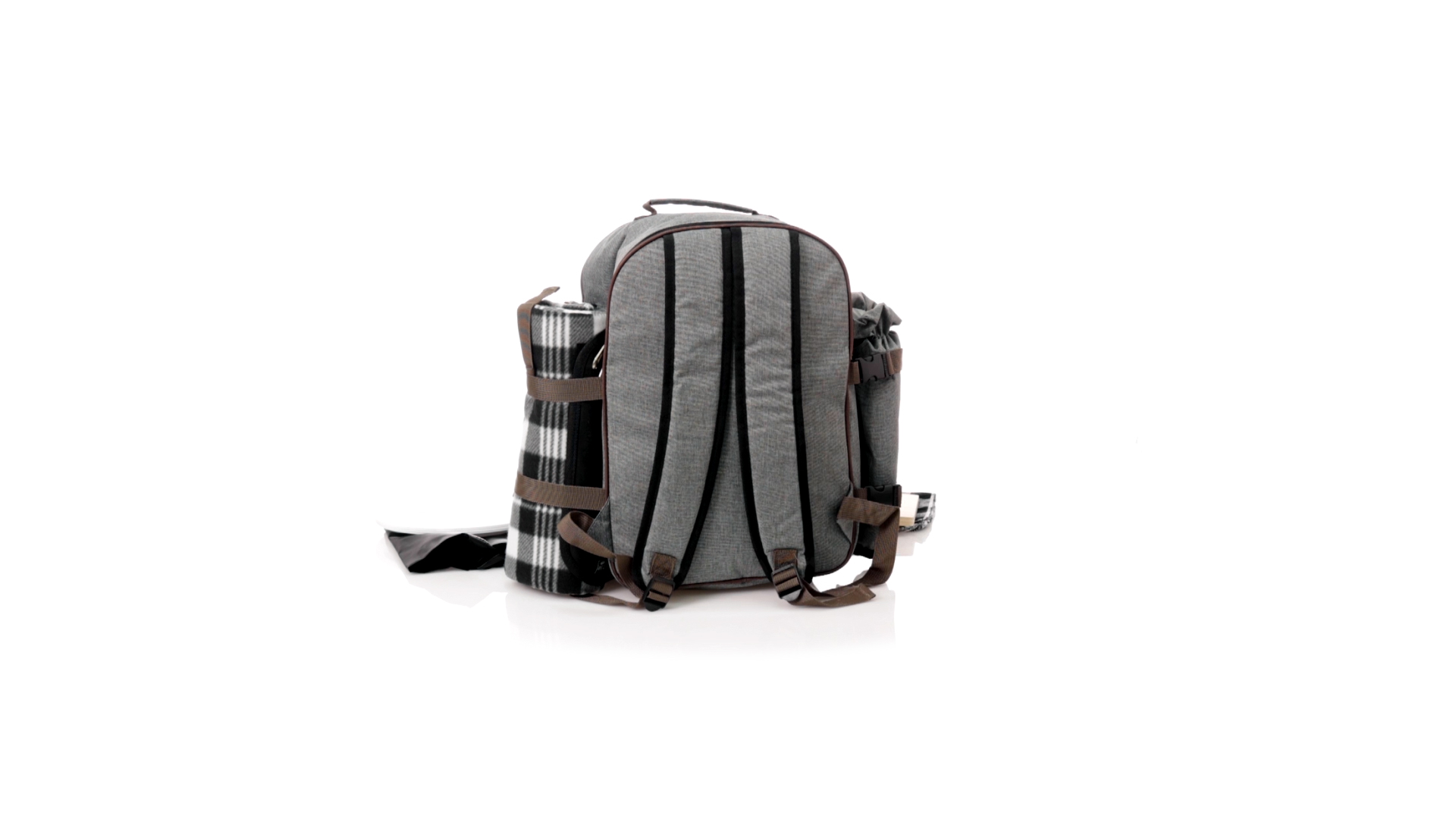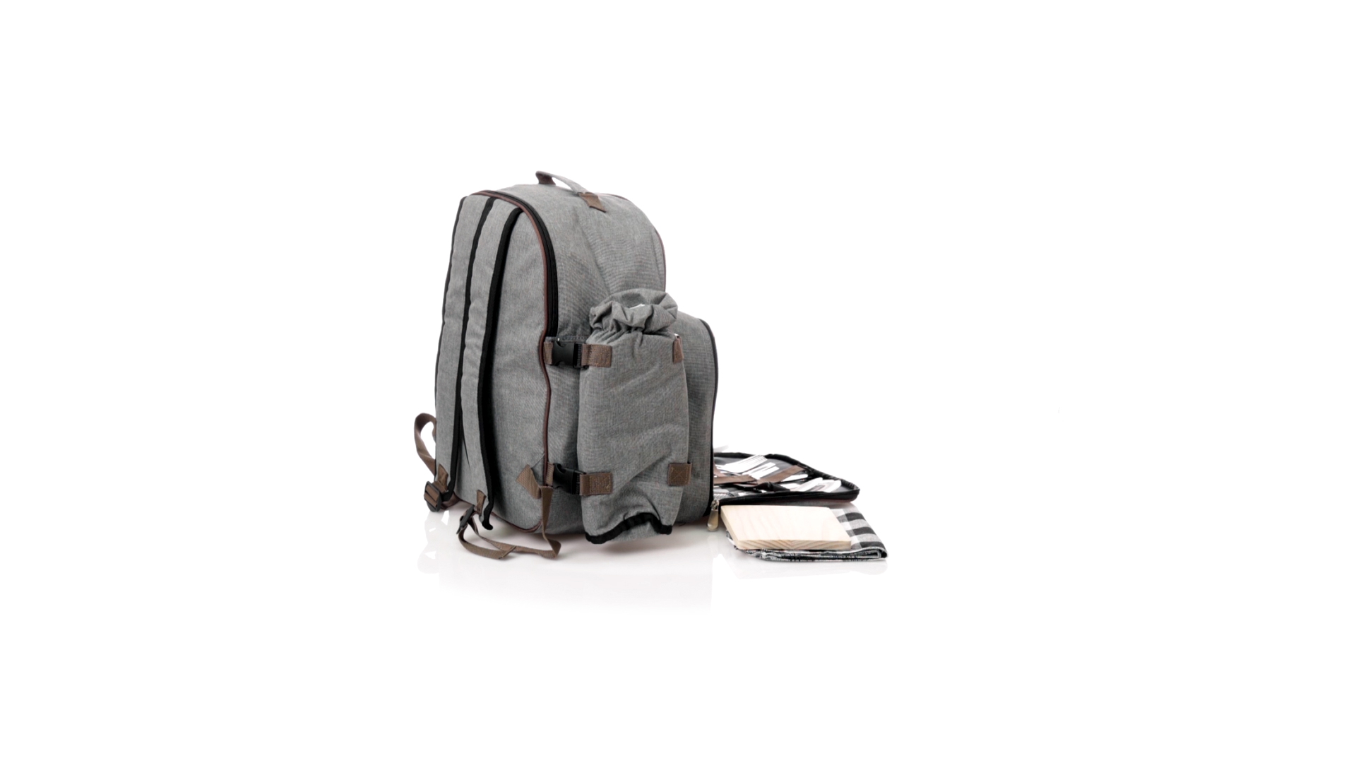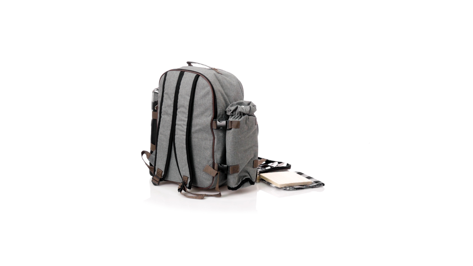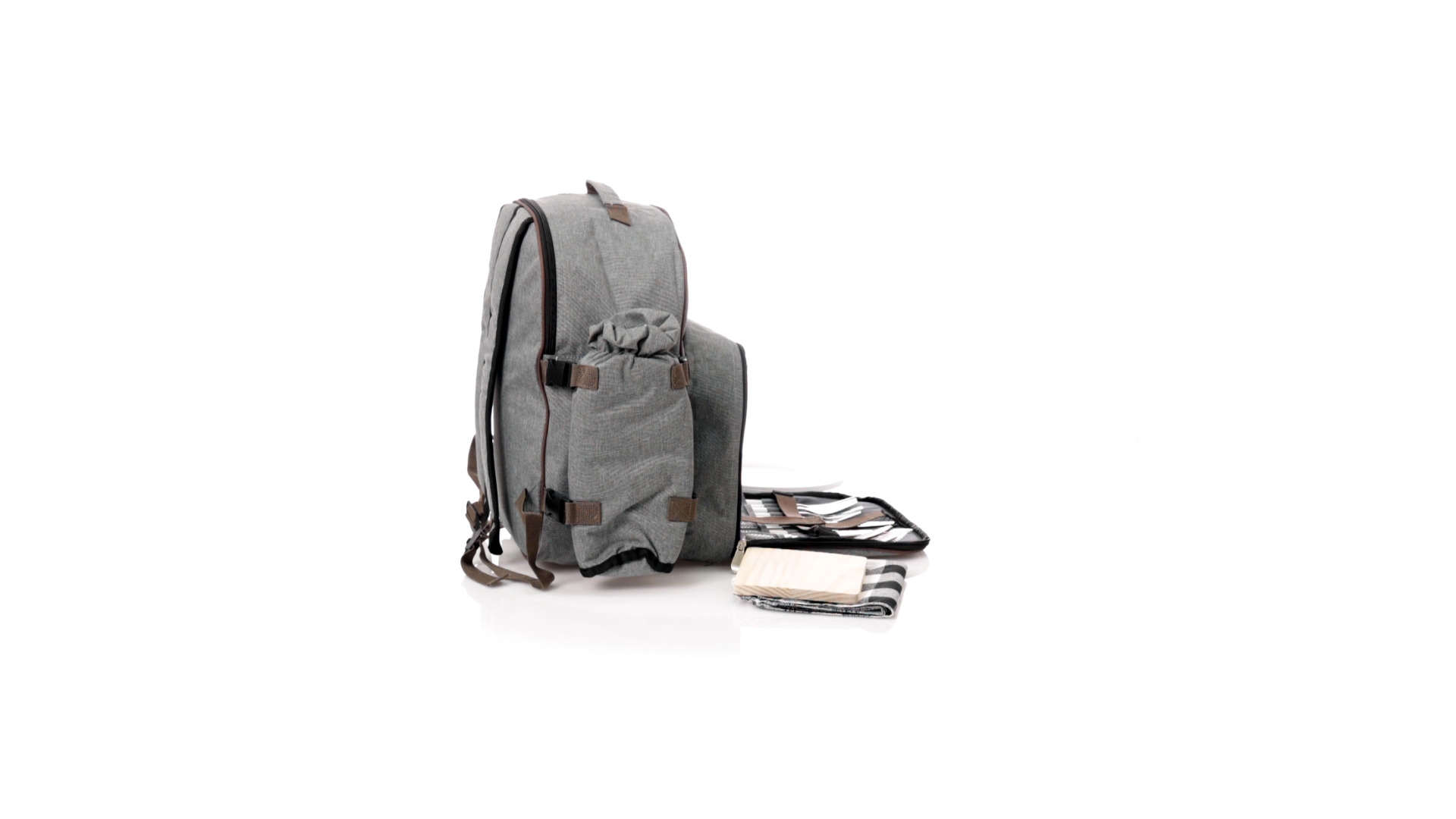 Picknick-Rucksack für 4 Personen mit komplettem Zubehör, hergestellt aus widerstandsfähigem 600D RPET. Graue Ausführung mit braunen Details Tragegriff und verstellbare gepolsterte Schultergurte. Hauptfach mit Reissverschluss und Metallzippern. Isothermisches EVA-Innen- und Aussenetikett mit dem unverwechselbaren RPET-Emblem. Einschliesslich:4 Becher aus rostfreiem Stahl.4 Löffel, 4 Messer und 4 Gabeln aus rostfreiem Stahl mit weissem PP-Griff.1 Spreizmesser aus Edelstahl mit weissem PP-Griff.4 weisse PP-Teller mit einem Durchmesser von 23 cm.4 Stoffservietten 30 x 30 cm. Mit Retro-Design im Karomuster und in einer Kombination aus schwarzen, grauen und weissen Tönen.Korkenzieheröffner aus Edelstahl mit weissem PP-Griff.Transparente Salz- und Pfefferstreuer mit weissem PP-Deckel.Schneide- und Präsentationsbrett aus Holz, Grösse 15x15 cm.Faltbare Tasche im Inneren.Passender Thermoflaschenhalter auf der rechten Seite, aus RPET und abnehmbar mit Schnallenverschlüssen.Hochwertige Picknick-Decke auf der linken Seite, mit verstellbaren Schnallenverschlüssen. Grösse 120x150cm, mit Soft-Touch-Sitzseite in zweifarbigem Schottenmuster. Isolierte Unterseite aus strapazierfähigem PEVA. Leicht zu falten und kompaktes Format, einschliesslich Tragegriff und Klappe mit Klettverschluss.RPET-Material wird aus recyceltem Kunststoff hergestellt, um die Wiederverwendung von Kunststoffabfällen zu fördern und die Nachhaltigkeit unseres Planeten zu unterstützen.
