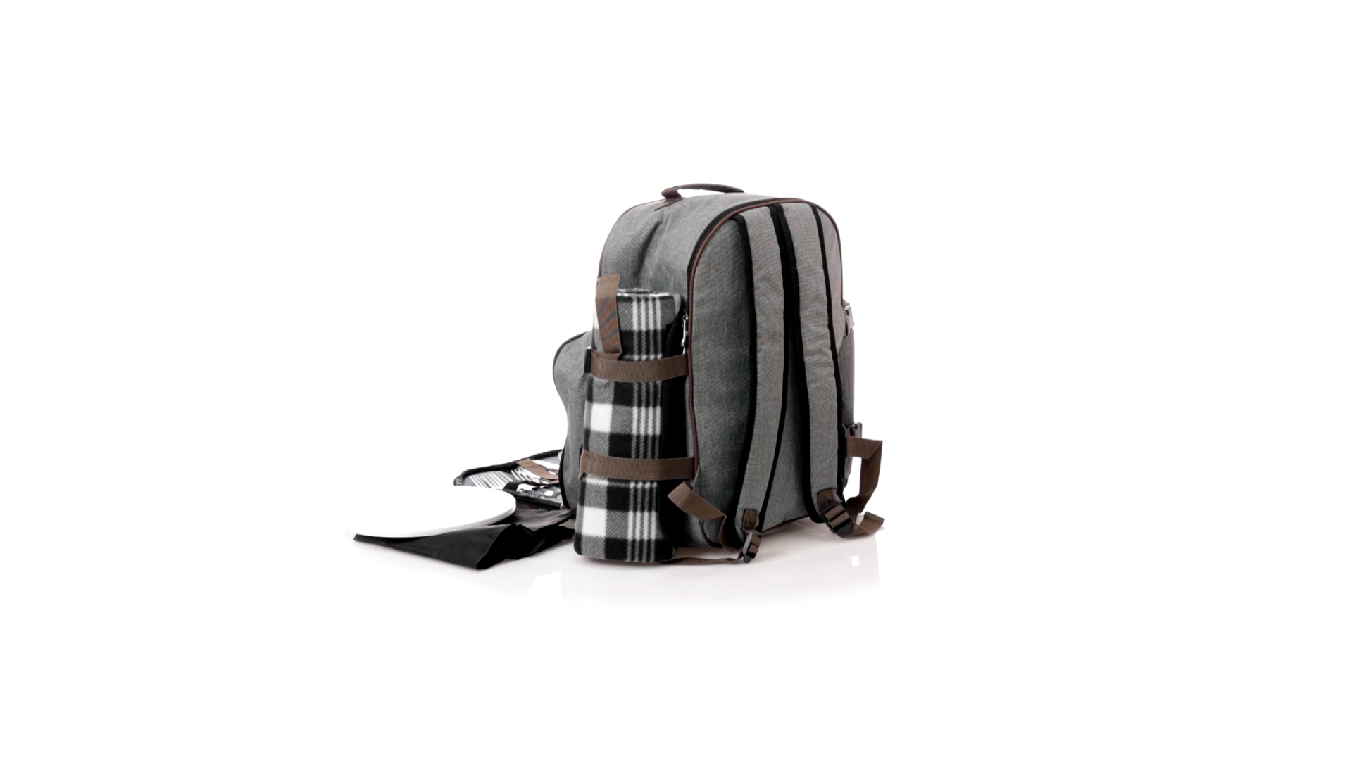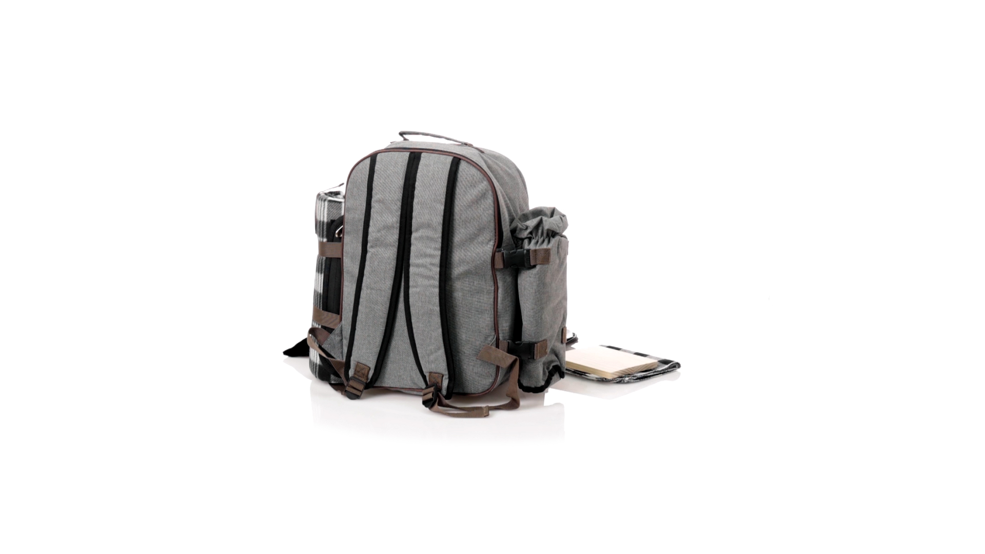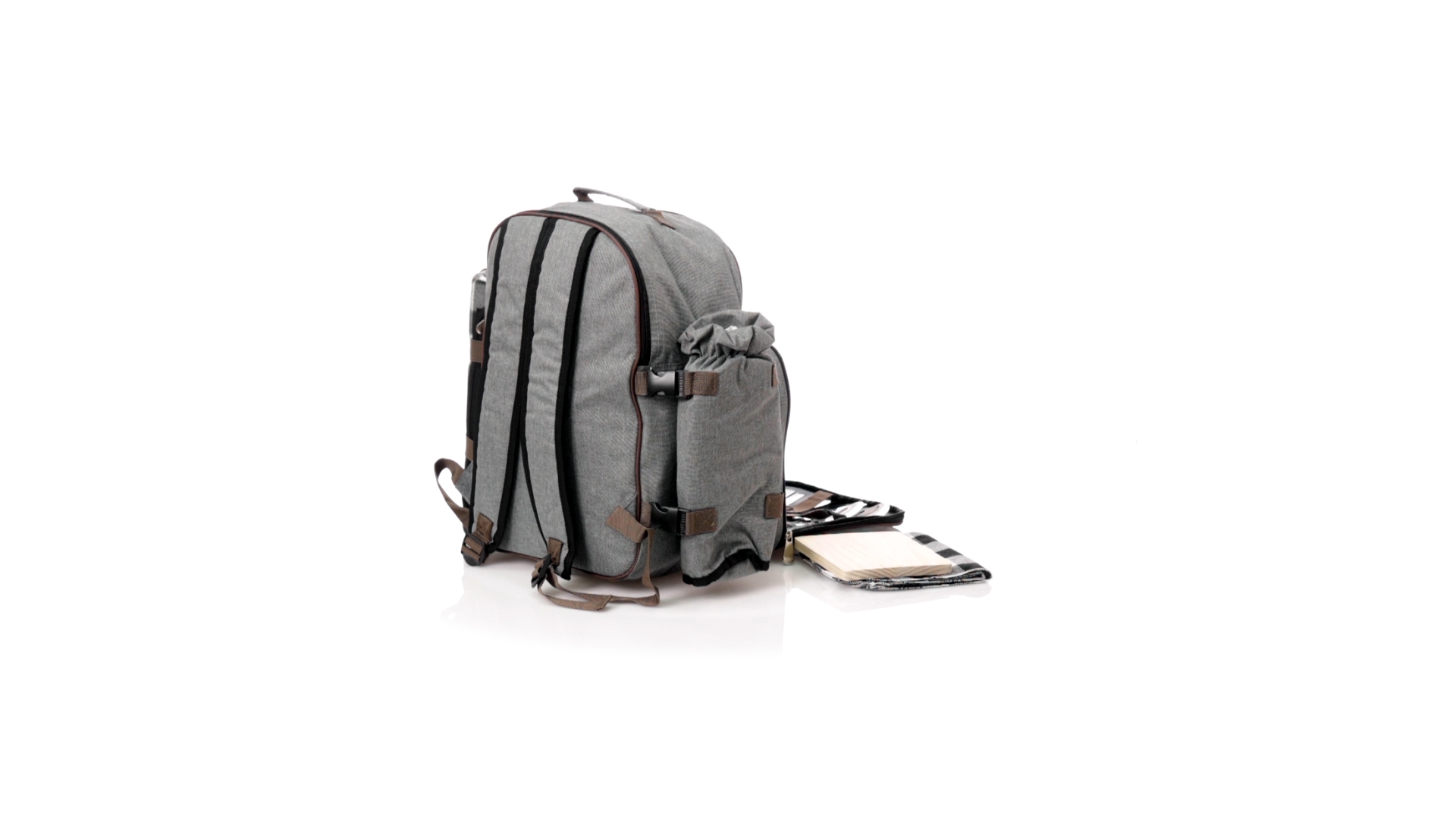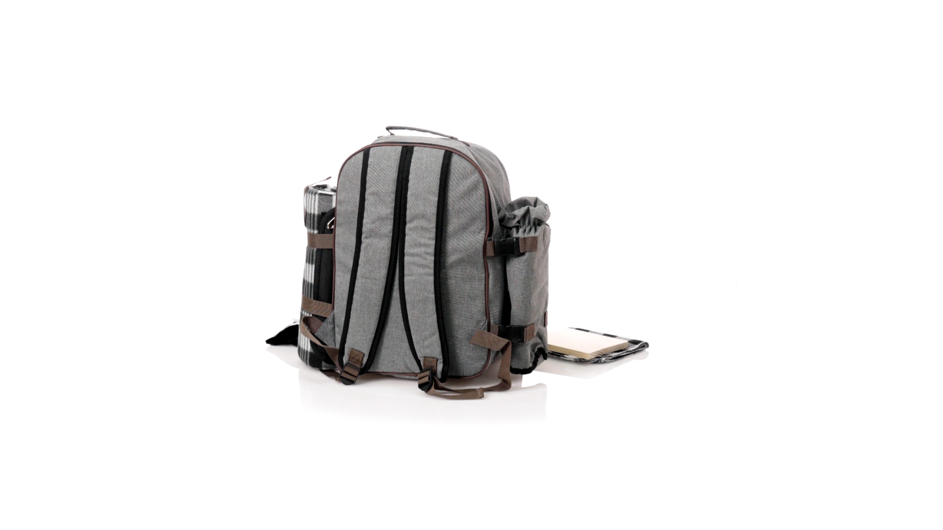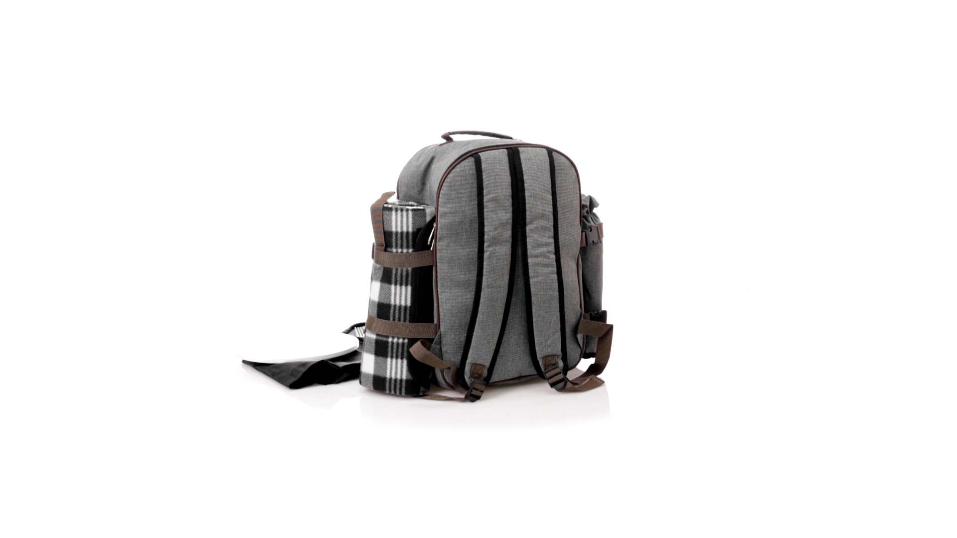 Picknick-Rucksack für 4 Personen mit komplettem Zubehör, hergestellt aus widerstandsfähigem 600D RPET. Graue Ausführung mit braunen Details Tragegriff und verstellbare gepolsterte Schultergurte. Hauptfach mit Reissverschluss und Metallzippern. Isothermisches EVA-Innen- und Aussenetikett mit dem unverwechselbaren RPET-Emblem. Einschliesslich:4 Becher aus rostfreiem Stahl.4 Löffel, 4 Messer und 4 Gabeln aus rostfreiem Stahl mit weissem PP-Griff.1 Spreizmesser aus Edelstahl mit weissem PP-Griff.4 weisse PP-Teller mit einem Durchmesser von 23 cm.4 Stoffservietten 30 x 30 cm. Mit Retro-Design im Karomuster und in einer Kombination aus schwarzen, grauen und weissen Tönen.Korkenzieheröffner aus Edelstahl mit weissem PP-Griff.Transparente Salz- und Pfefferstreuer mit weissem PP-Deckel.Schneide- und Präsentationsbrett aus Holz, Grösse 15x15 cm.Faltbare Tasche im Inneren.Passender Thermoflaschenhalter auf der rechten Seite, aus RPET und abnehmbar mit Schnallenverschlüssen.Hochwertige Picknick-Decke auf der linken Seite, mit verstellbaren Schnallenverschlüssen. Grösse 120x150cm, mit Soft-Touch-Sitzseite in zweifarbigem Schottenmuster. Isolierte Unterseite aus strapazierfähigem PEVA. Leicht zu falten und kompaktes Format, einschliesslich Tragegriff und Klappe mit Klettverschluss.RPET-Material wird aus recyceltem Kunststoff hergestellt, um die Wiederverwendung von Kunststoffabfällen zu fördern und die Nachhaltigkeit unseres Planeten zu unterstützen.