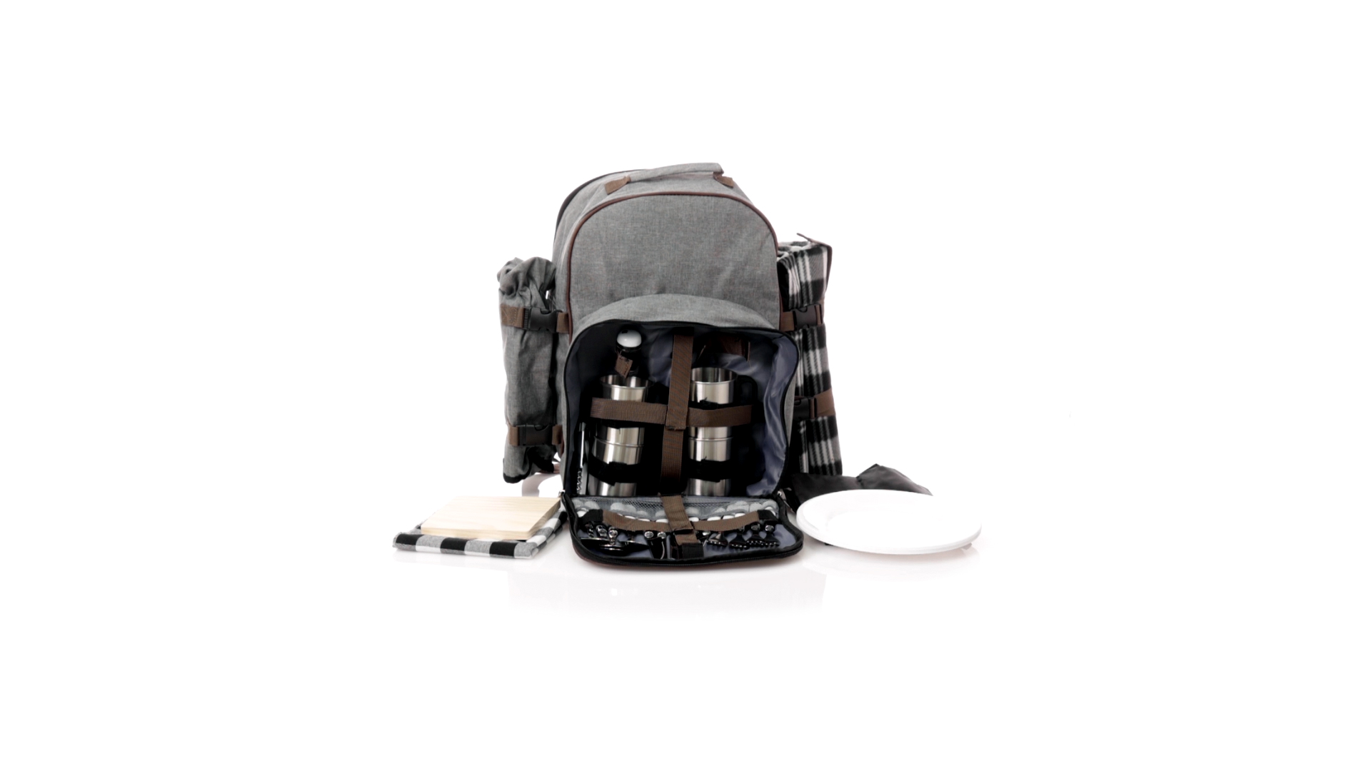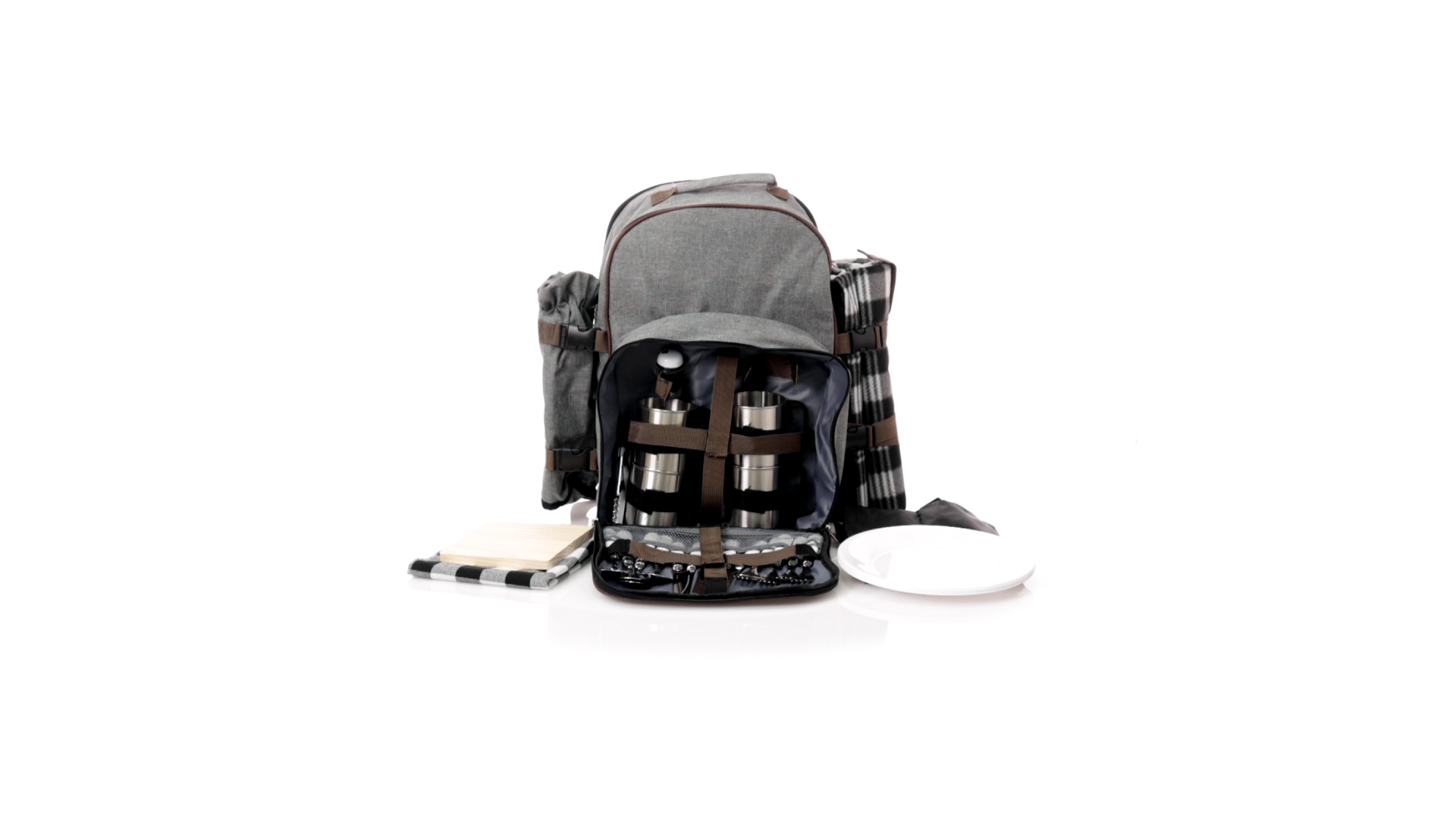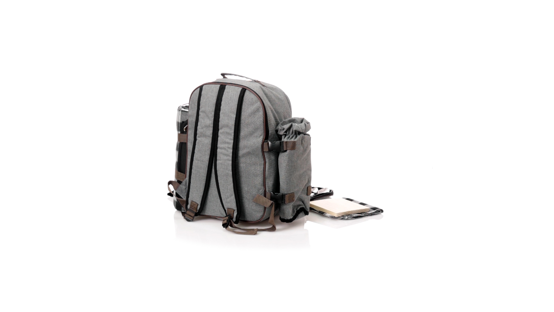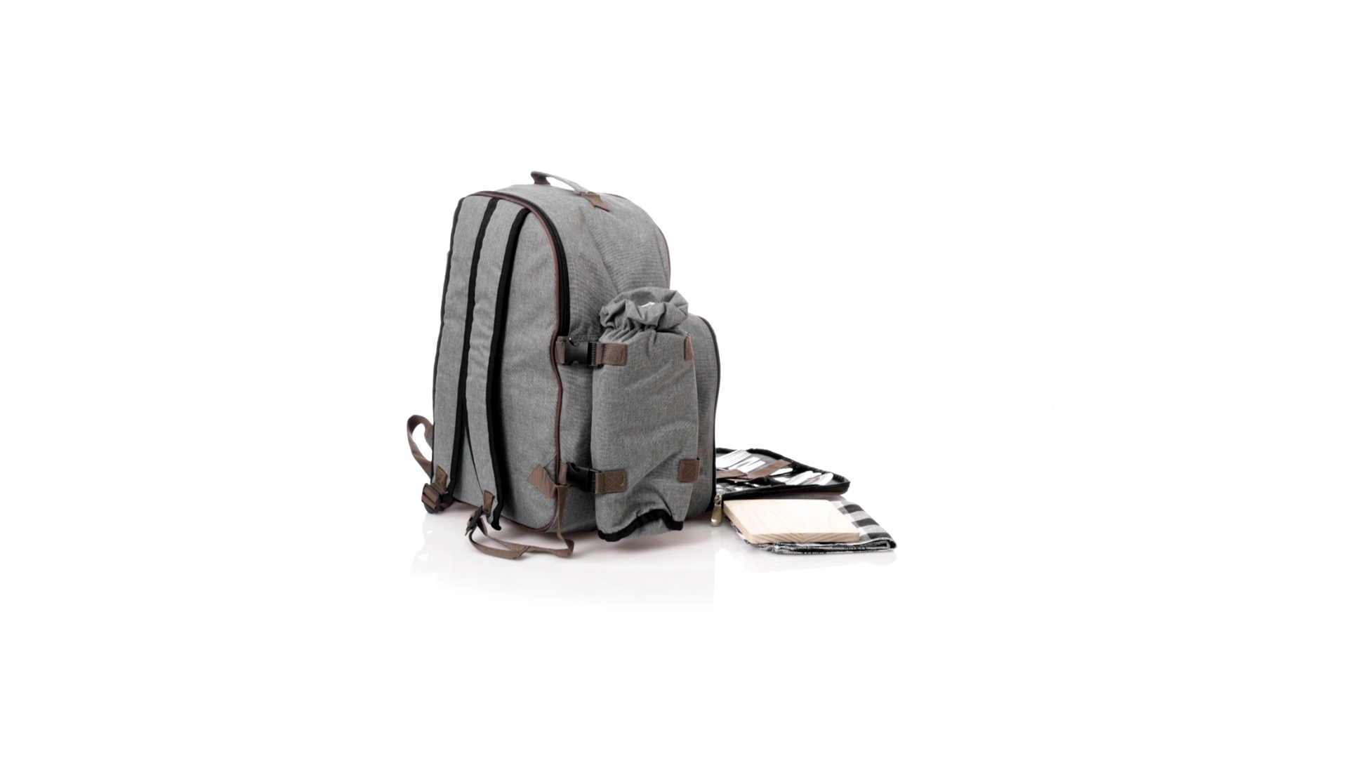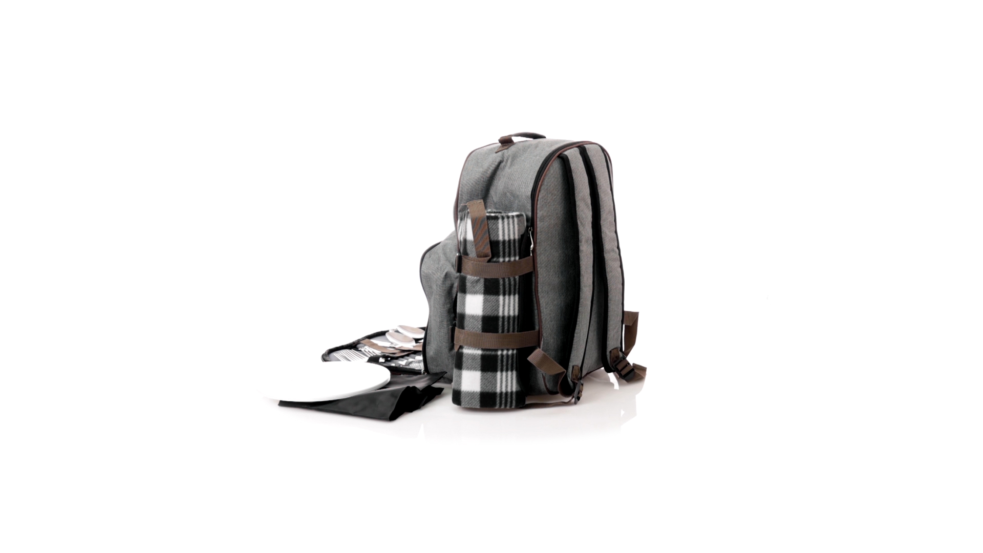 Picknick-Rucksack für 4 Personen mit komplettem Zubehör, hergestellt aus widerstandsfähigem 600D RPET. Graue Ausführung mit braunen Details Tragegriff und verstellbare gepolsterte Schultergurte. Hauptfach mit Reissverschluss und Metallzippern. Isothermisches EVA-Innen- und Aussenetikett mit dem unverwechselbaren RPET-Emblem. Einschliesslich:4 Becher aus rostfreiem Stahl.4 Löffel, 4 Messer und 4 Gabeln aus rostfreiem Stahl mit weissem PP-Griff.1 Spreizmesser aus Edelstahl mit weissem PP-Griff.4 weisse PP-Teller mit einem Durchmesser von 23 cm.4 Stoffservietten 30 x 30 cm. Mit Retro-Design im Karomuster und in einer Kombination aus schwarzen, grauen und weissen Tönen.Korkenzieheröffner aus Edelstahl mit weissem PP-Griff.Transparente Salz- und Pfefferstreuer mit weissem PP-Deckel.Schneide- und Präsentationsbrett aus Holz, Grösse 15x15 cm.Faltbare Tasche im Inneren.Passender Thermoflaschenhalter auf der rechten Seite, aus RPET und abnehmbar mit Schnallenverschlüssen.Hochwertige Picknick-Decke auf der linken Seite, mit verstellbaren Schnallenverschlüssen. Grösse 120x150cm, mit Soft-Touch-Sitzseite in zweifarbigem Schottenmuster. Isolierte Unterseite aus strapazierfähigem PEVA. Leicht zu falten und kompaktes Format, einschliesslich Tragegriff und Klappe mit Klettverschluss.RPET-Material wird aus recyceltem Kunststoff hergestellt, um die Wiederverwendung von Kunststoffabfällen zu fördern und die Nachhaltigkeit unseres Planeten zu unterstützen.