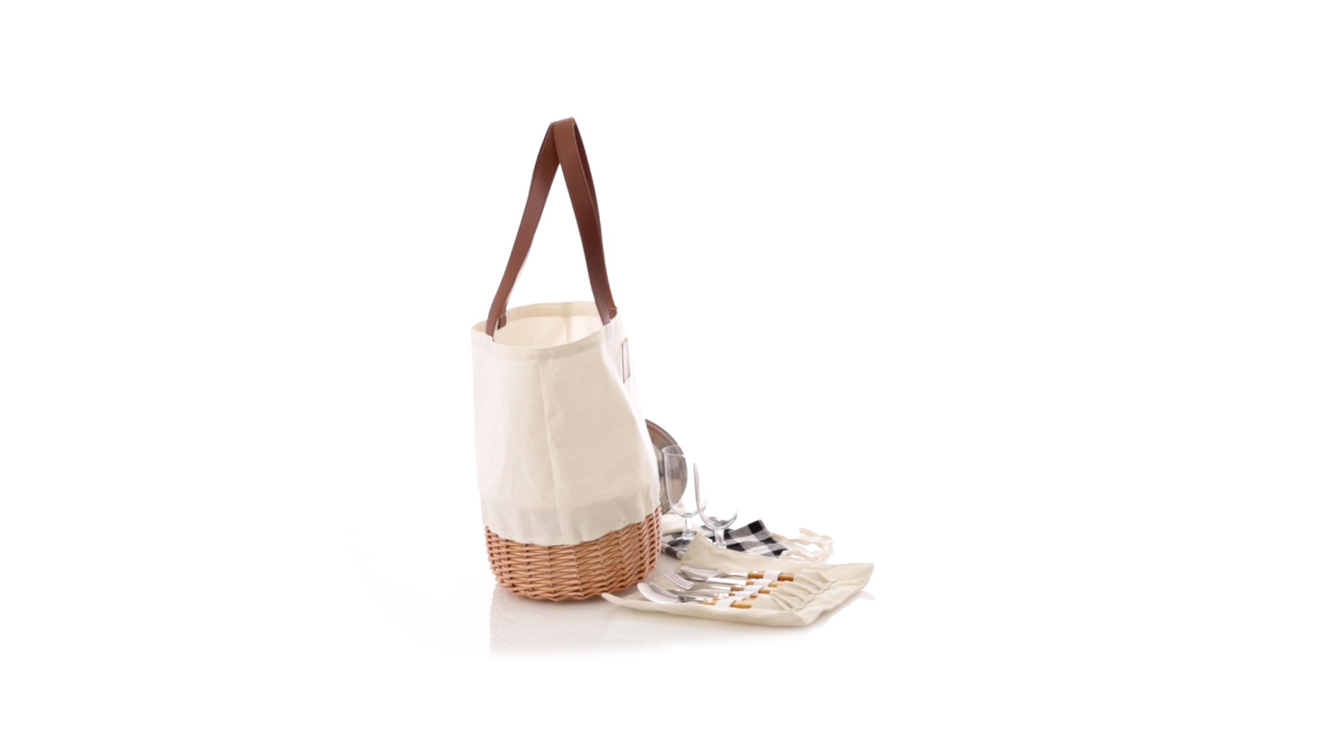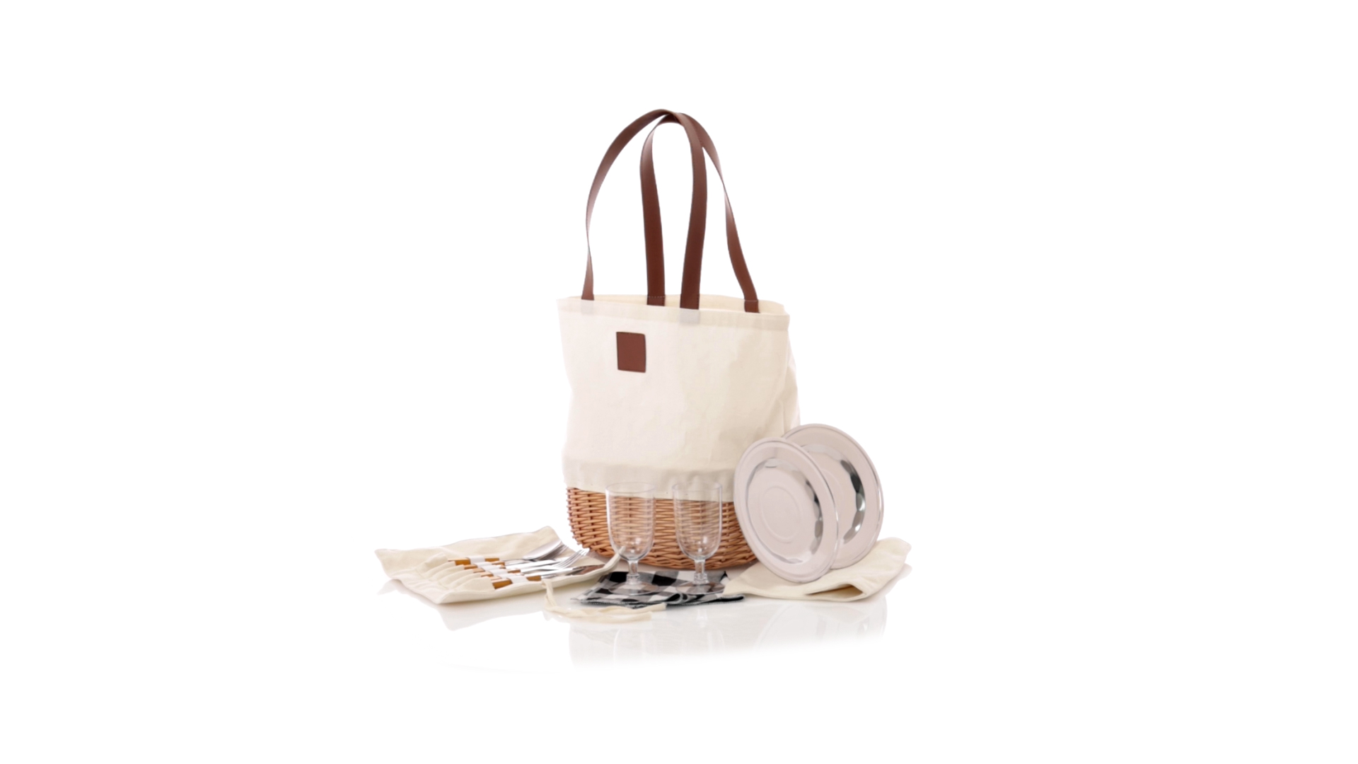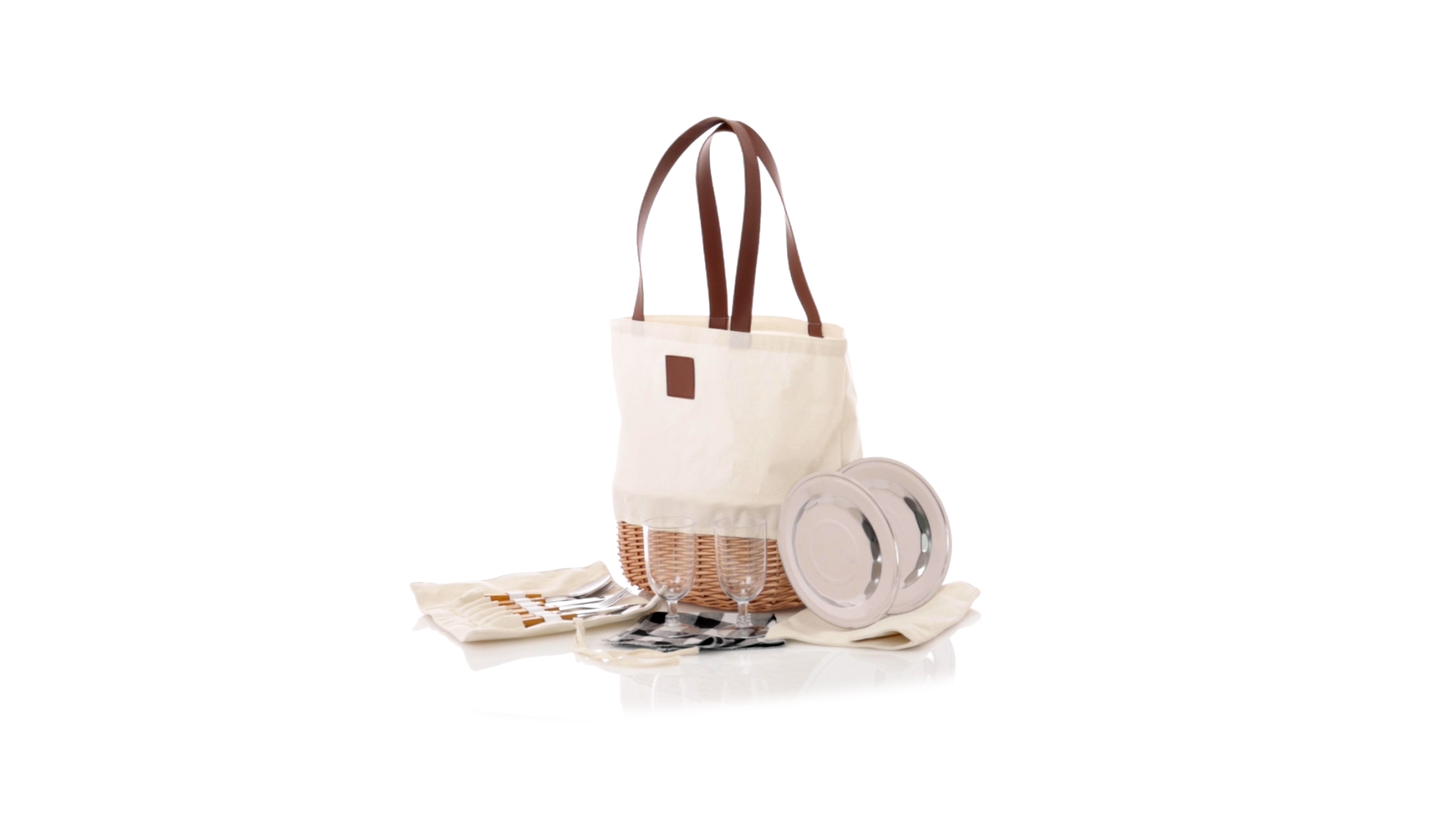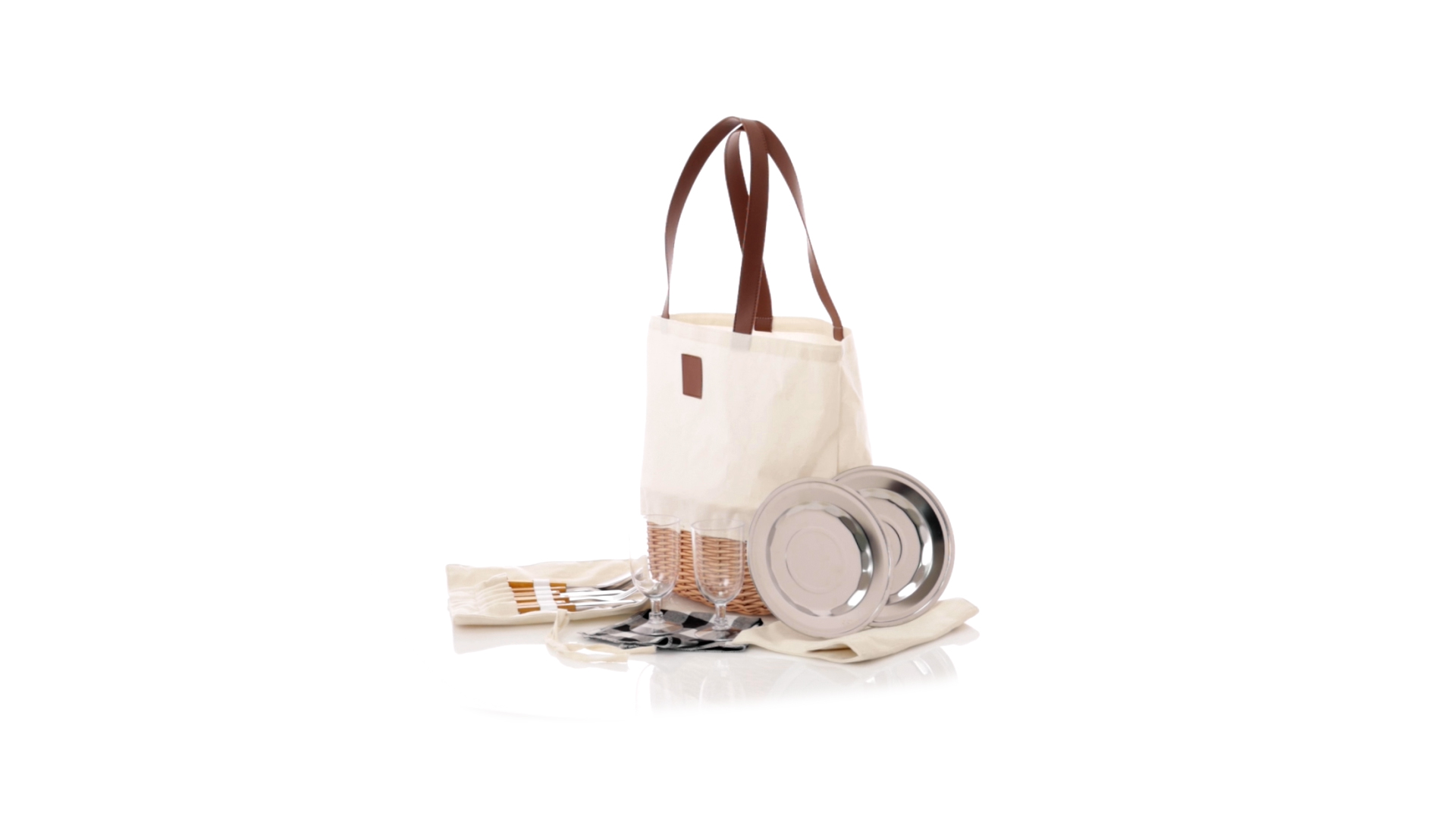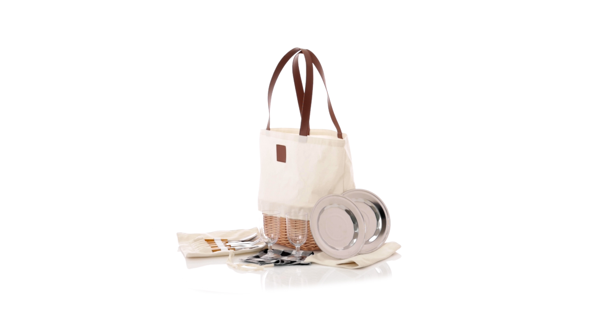 Werten Sie den Stil Ihres Picknicks mit diesem schicken Retro-Korb auf. Hergestellt aus Korbgeflecht und Baumwolle in natürlicher Ausführung, mit einem stabilen Tragegriff aus PU-Leder. Konzipiert für 2 Personen, inklusive 2 Gläser, 2 Messer, 2 Löffel, 2 Gabeln, 2 Schüsseln und 2 Stoffservietten. Präsentiert in einer einzelnen recycelten Tasche.