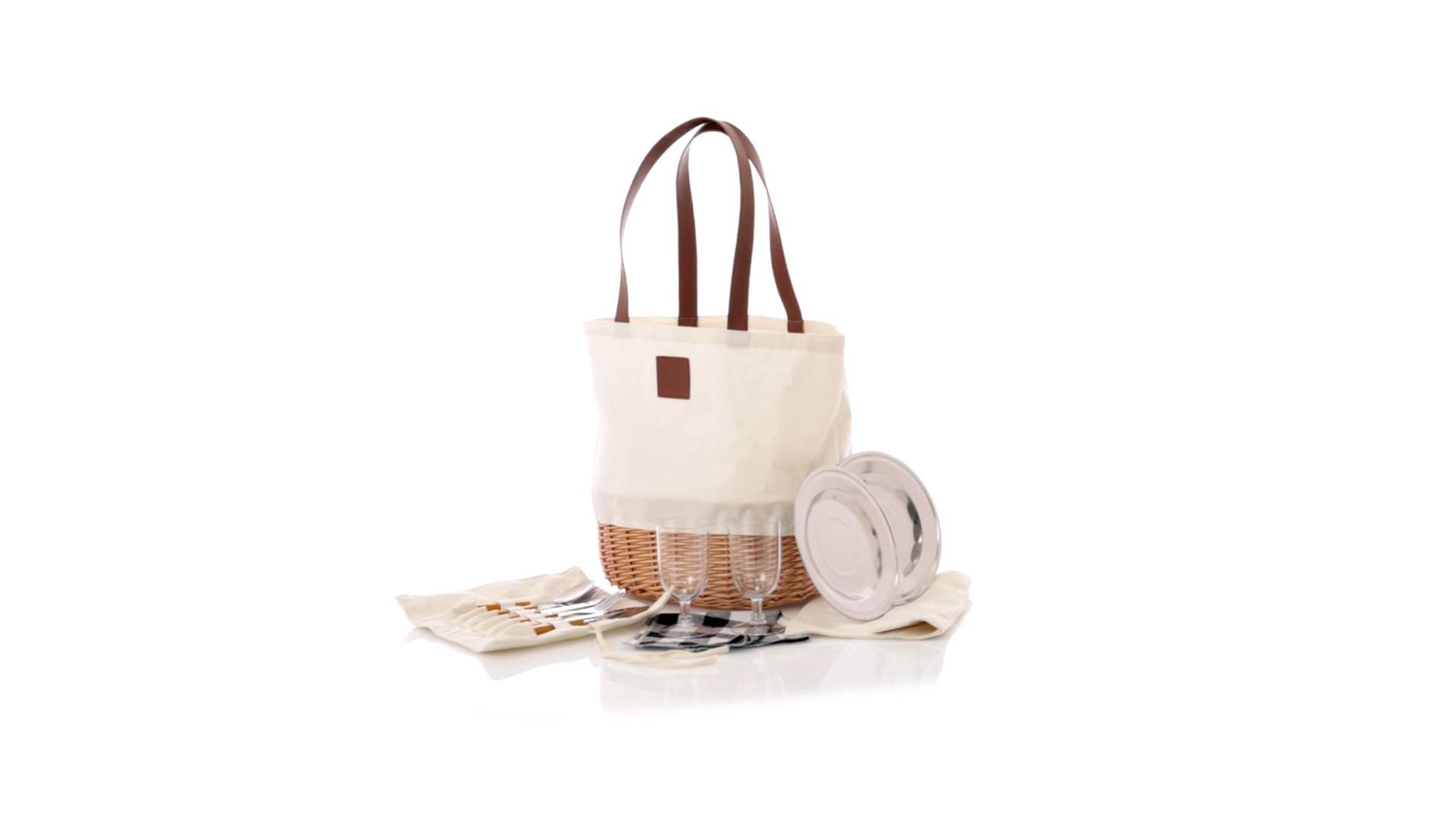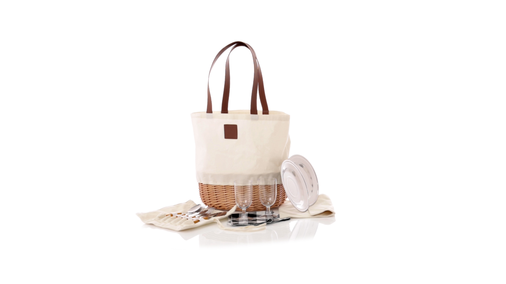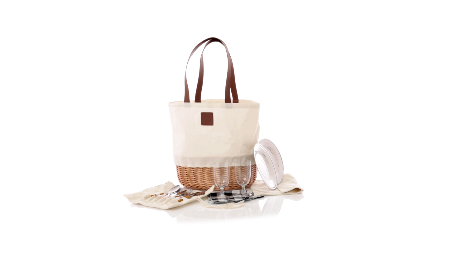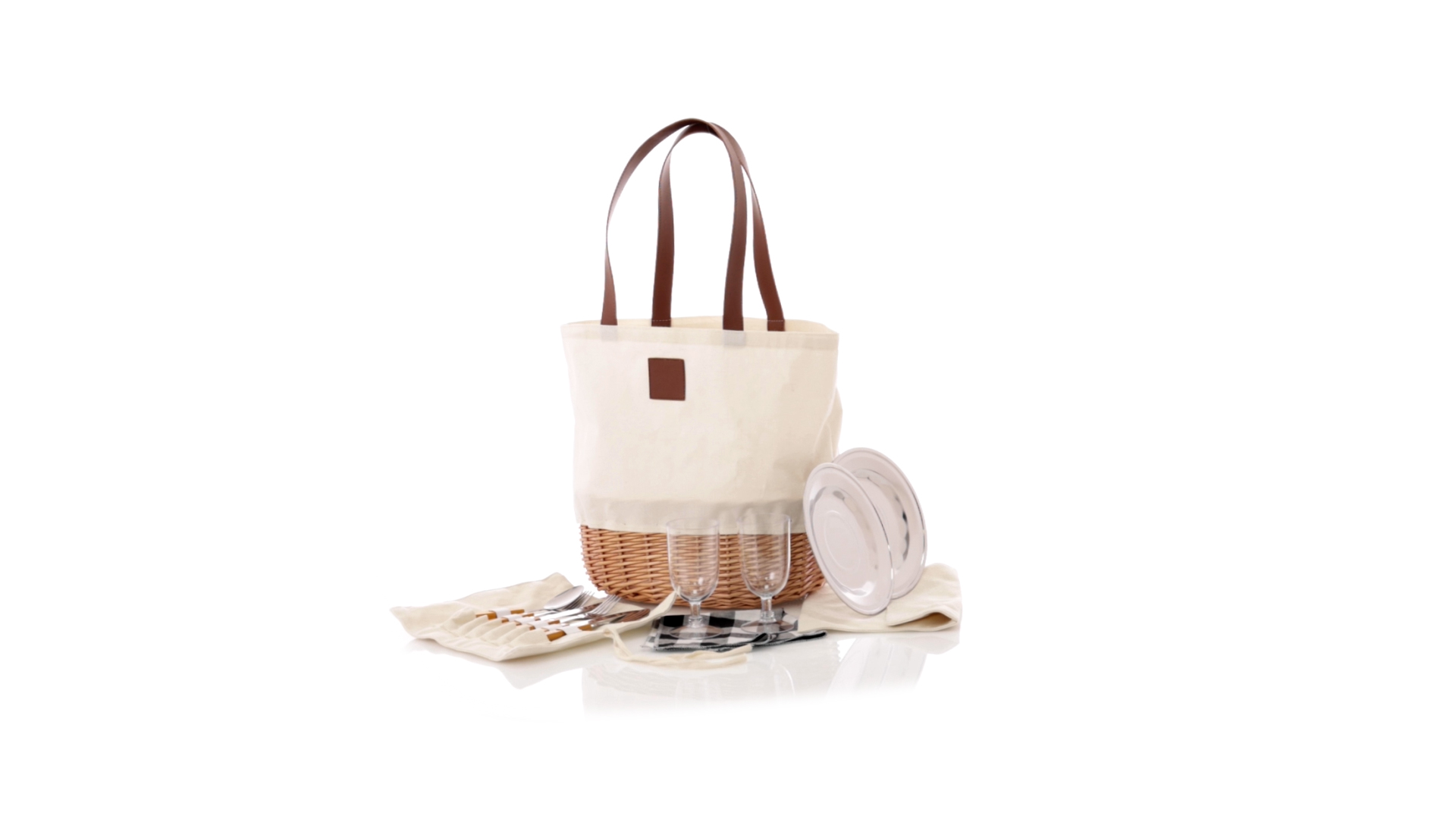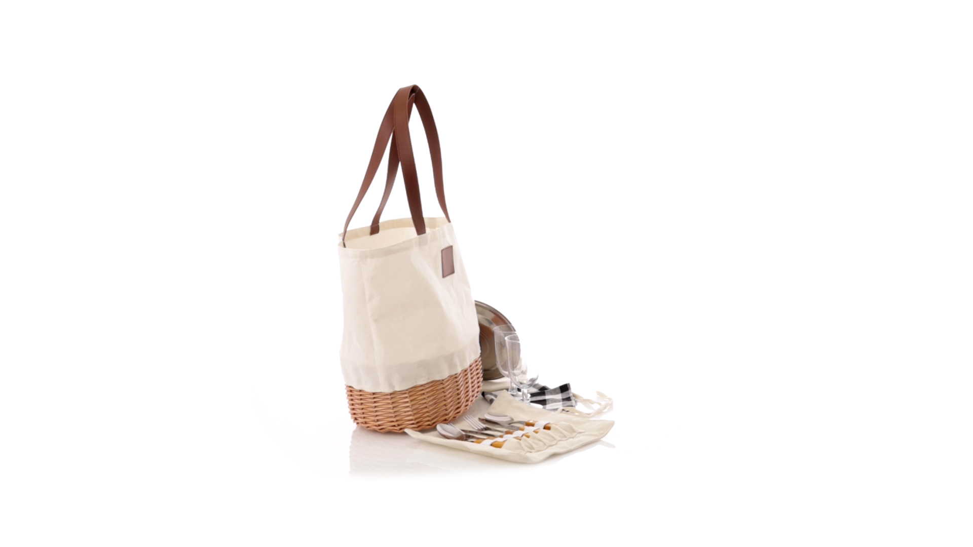 Werten Sie den Stil Ihres Picknicks mit diesem schicken Retro-Korb auf. Hergestellt aus Korbgeflecht und Baumwolle in natürlicher Ausführung, mit einem stabilen Tragegriff aus PU-Leder. Konzipiert für 2 Personen, inklusive 2 Gläser, 2 Messer, 2 Löffel, 2 Gabeln, 2 Schüsseln und 2 Stoffservietten. Präsentiert in einer einzelnen recycelten Tasche.