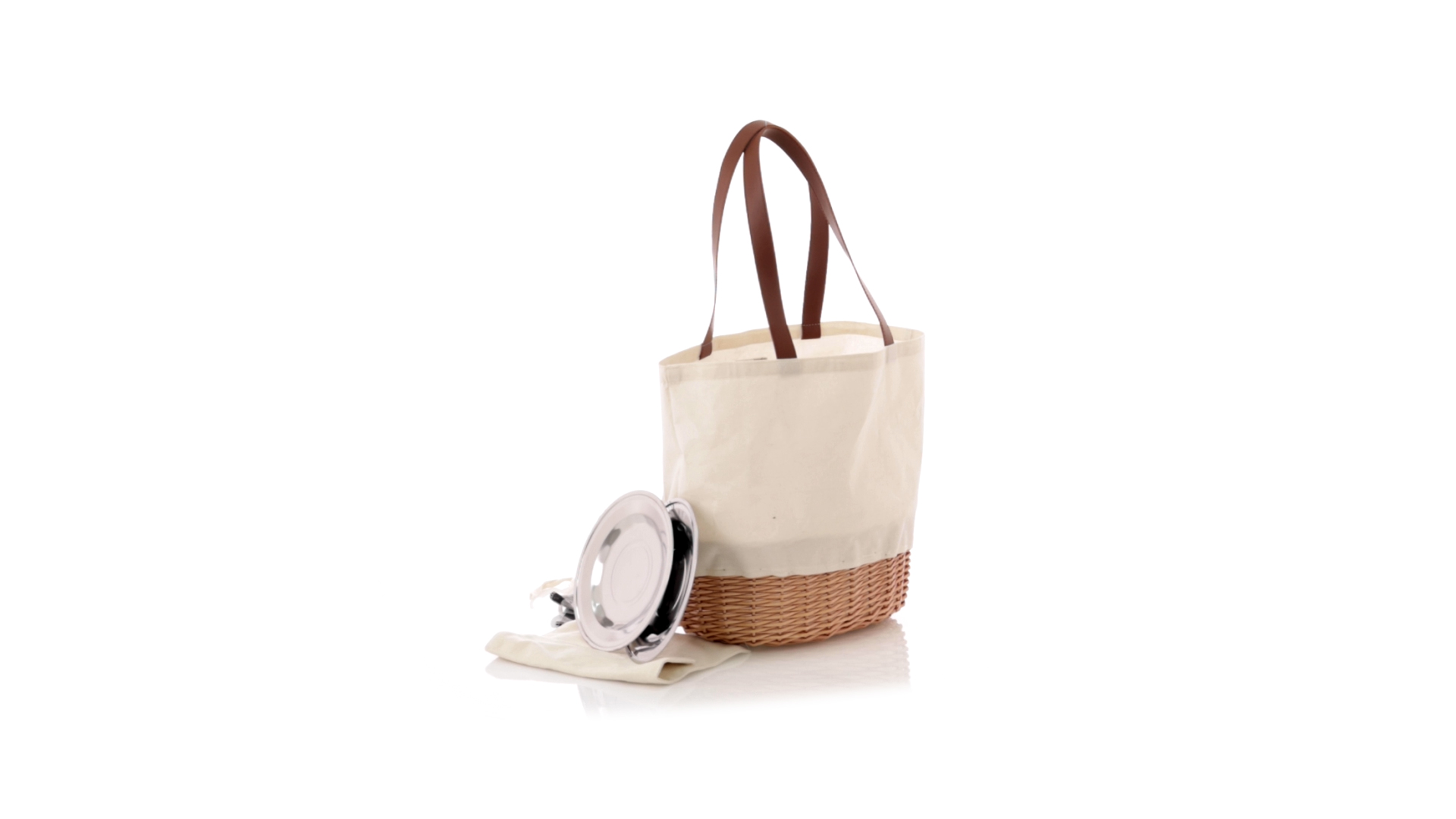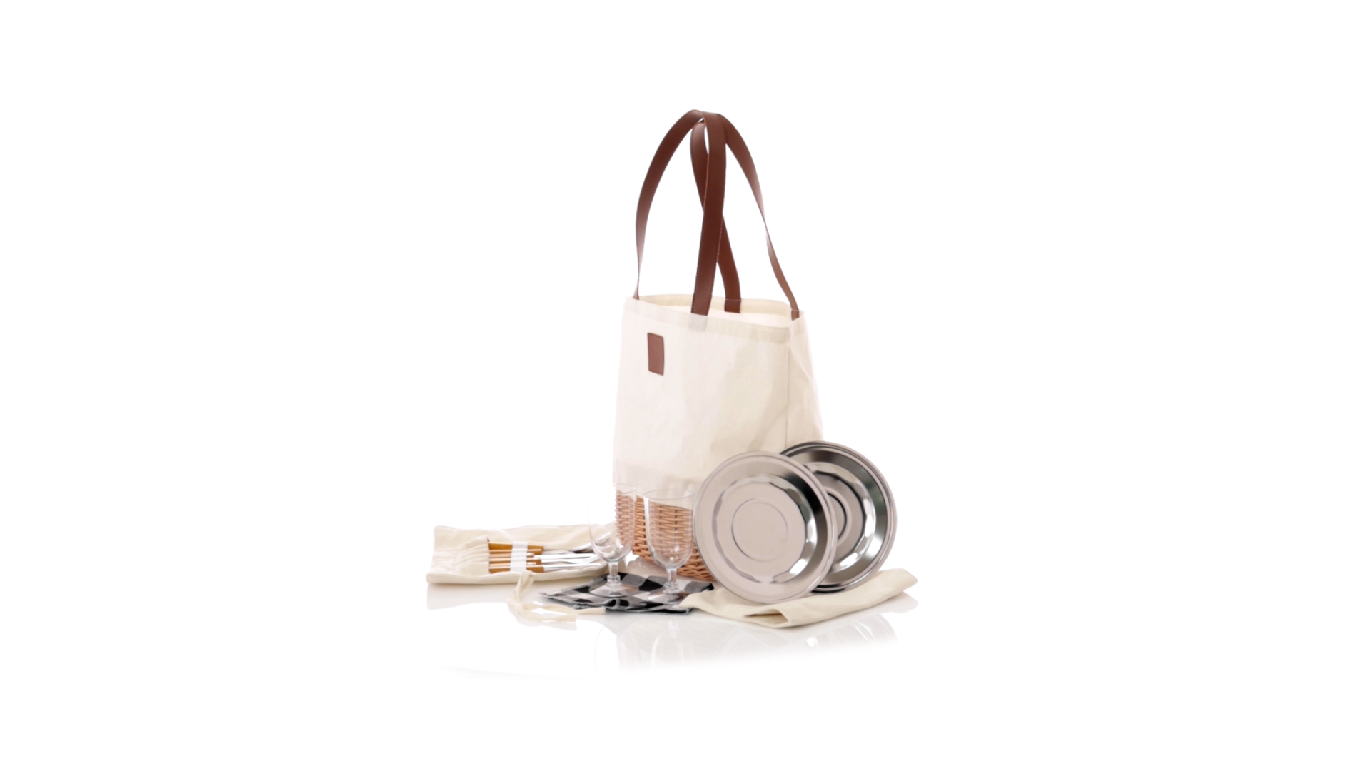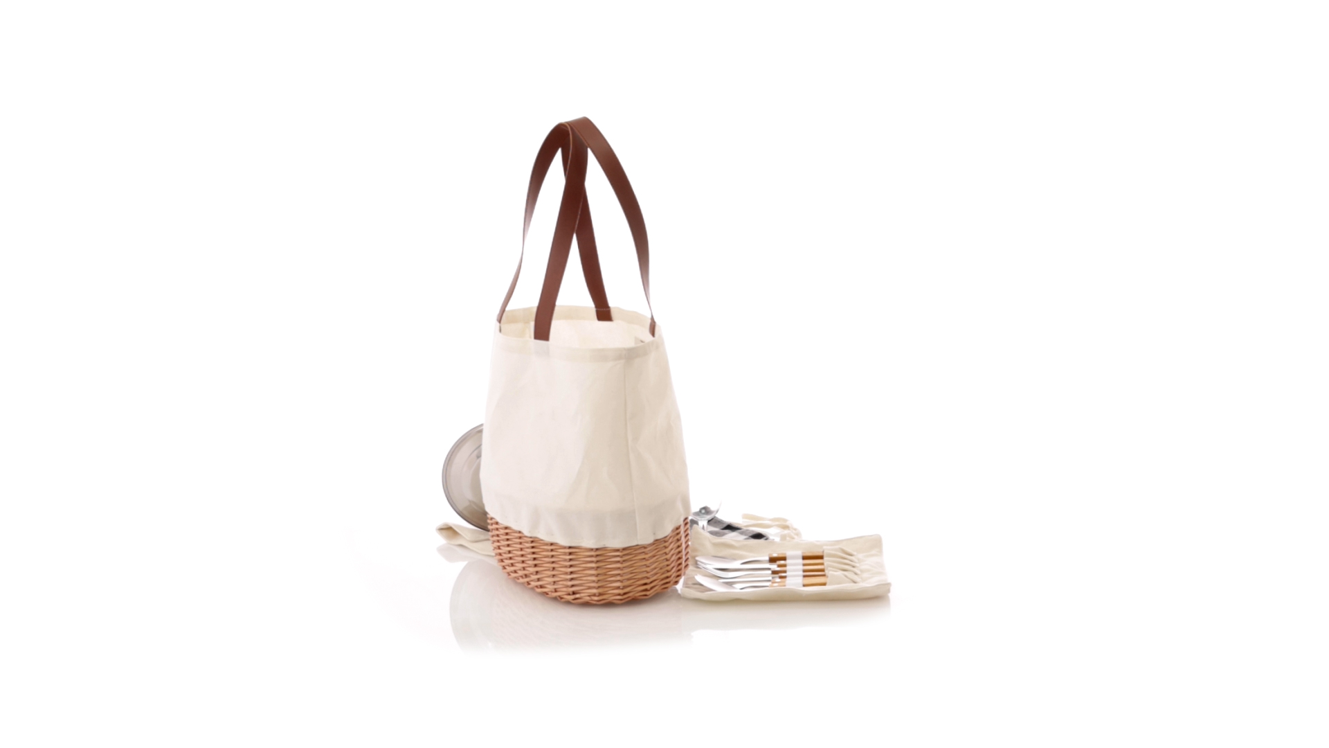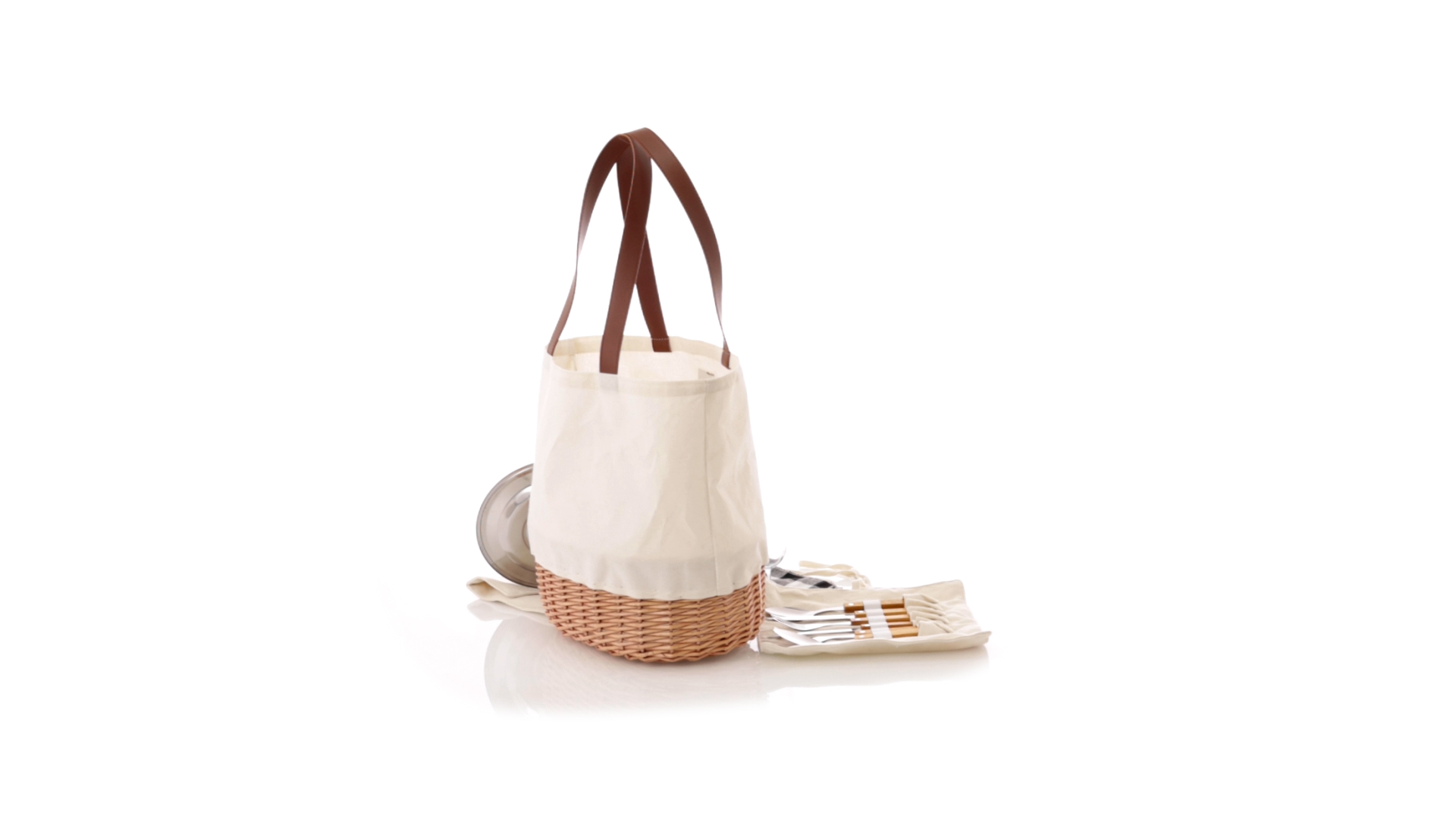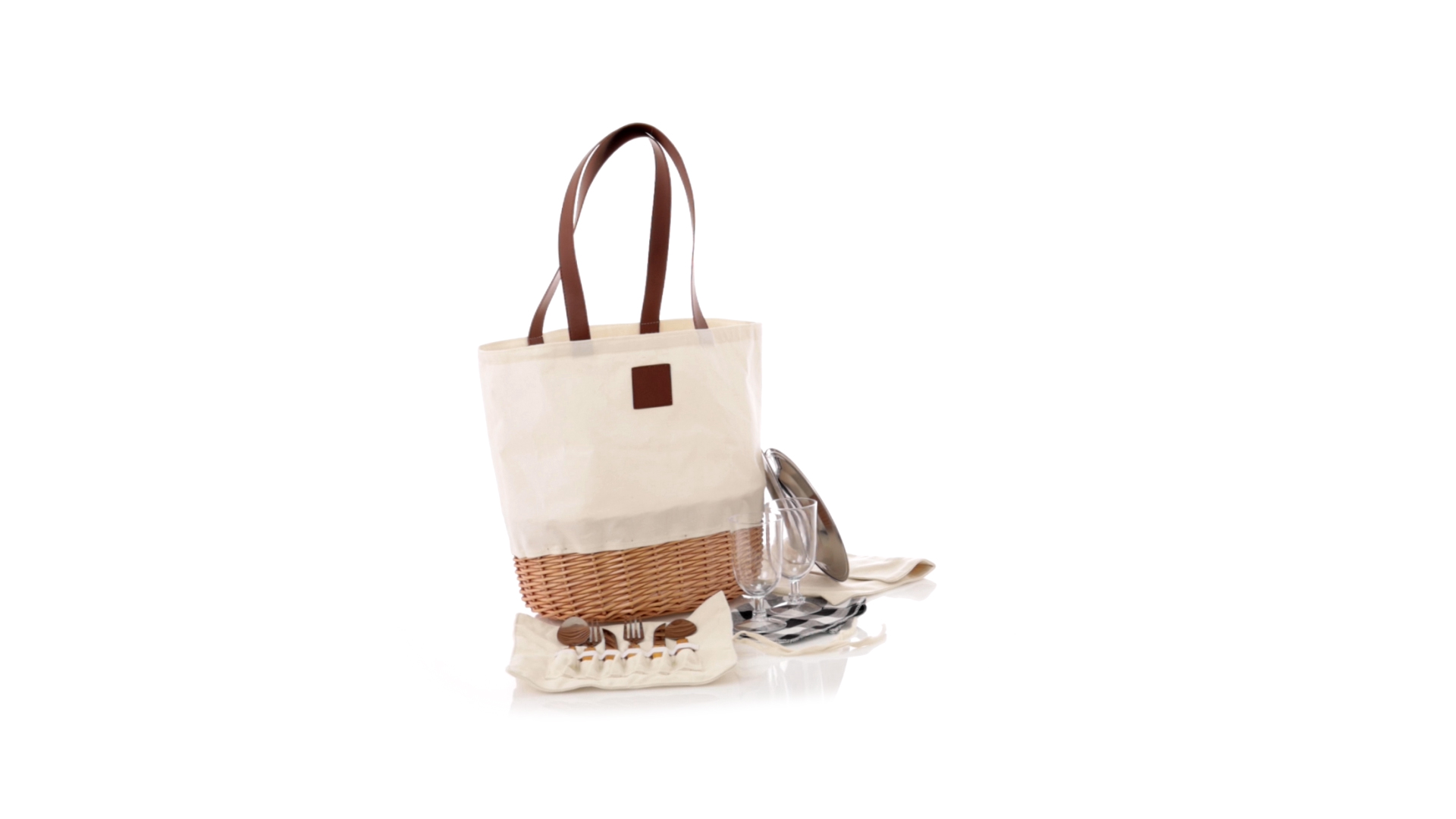 Werten Sie den Stil Ihres Picknicks mit diesem schicken Retro-Korb auf. Hergestellt aus Korbgeflecht und Baumwolle in natürlicher Ausführung, mit einem stabilen Tragegriff aus PU-Leder. Konzipiert für 2 Personen, inklusive 2 Gläser, 2 Messer, 2 Löffel, 2 Gabeln, 2 Schüsseln und 2 Stoffservietten. Präsentiert in einer einzelnen recycelten Tasche.