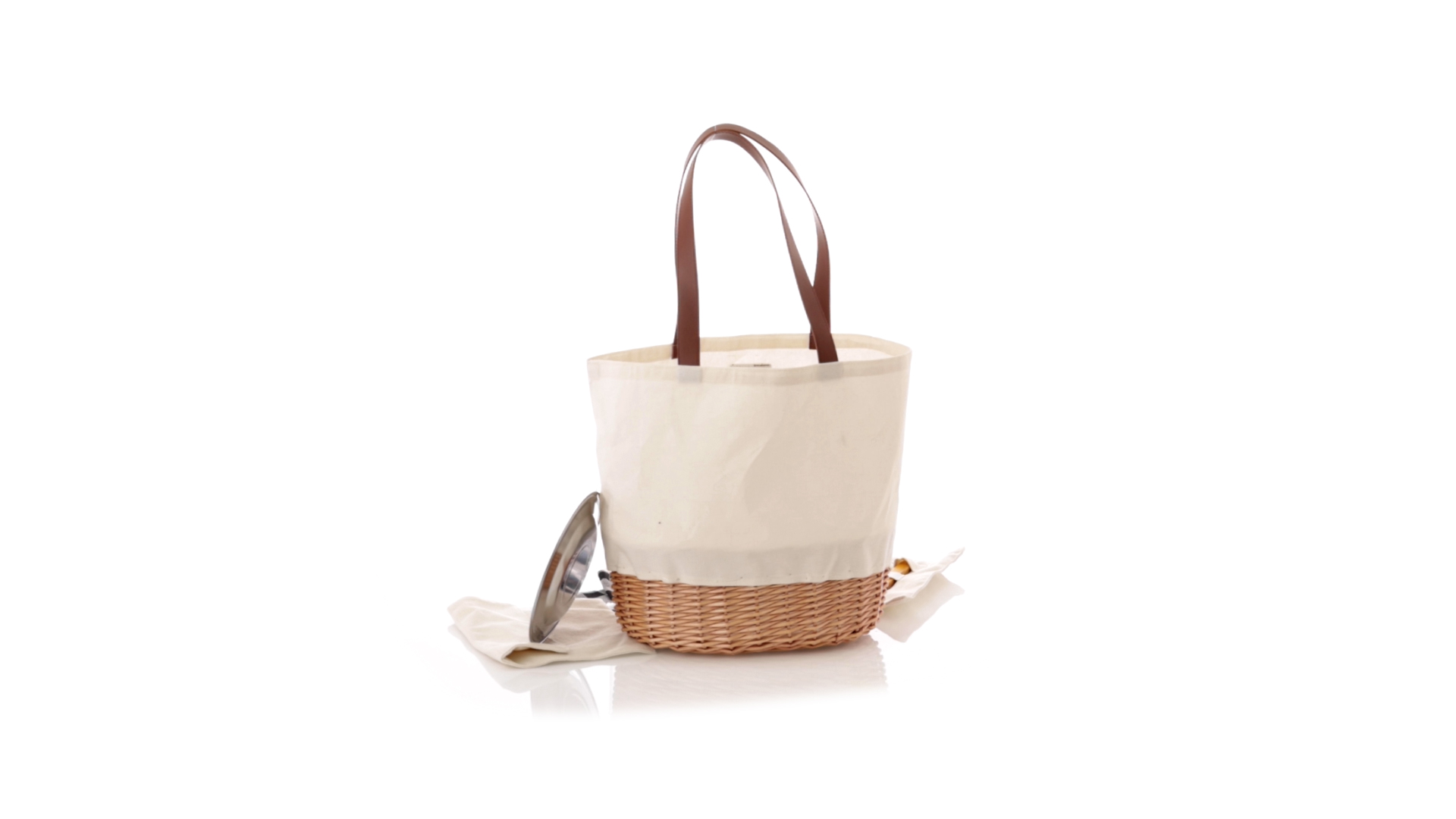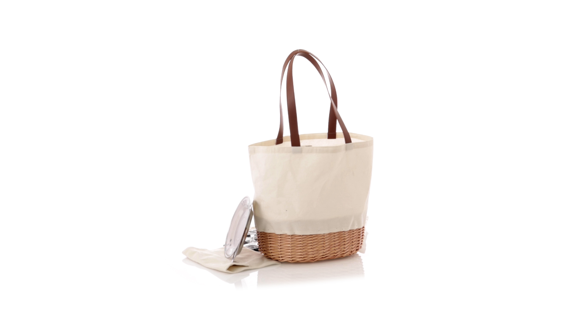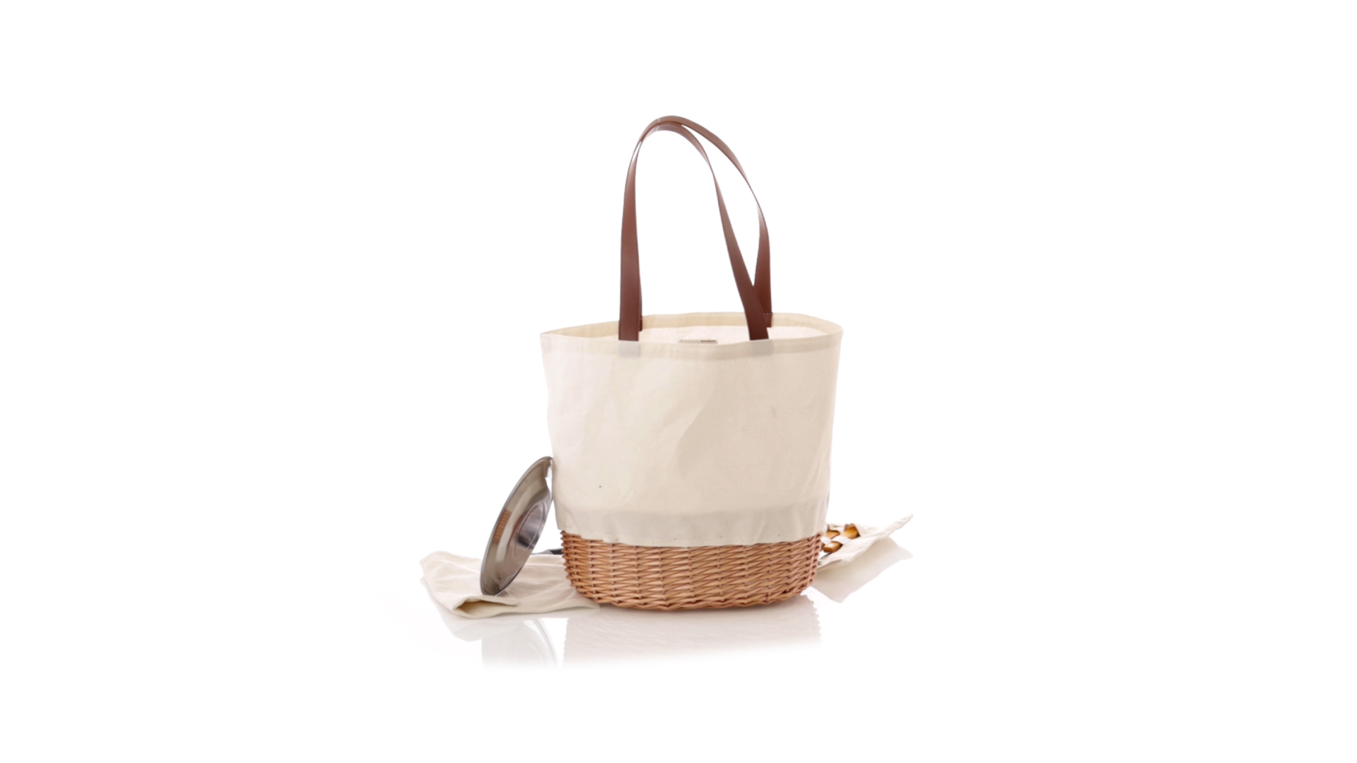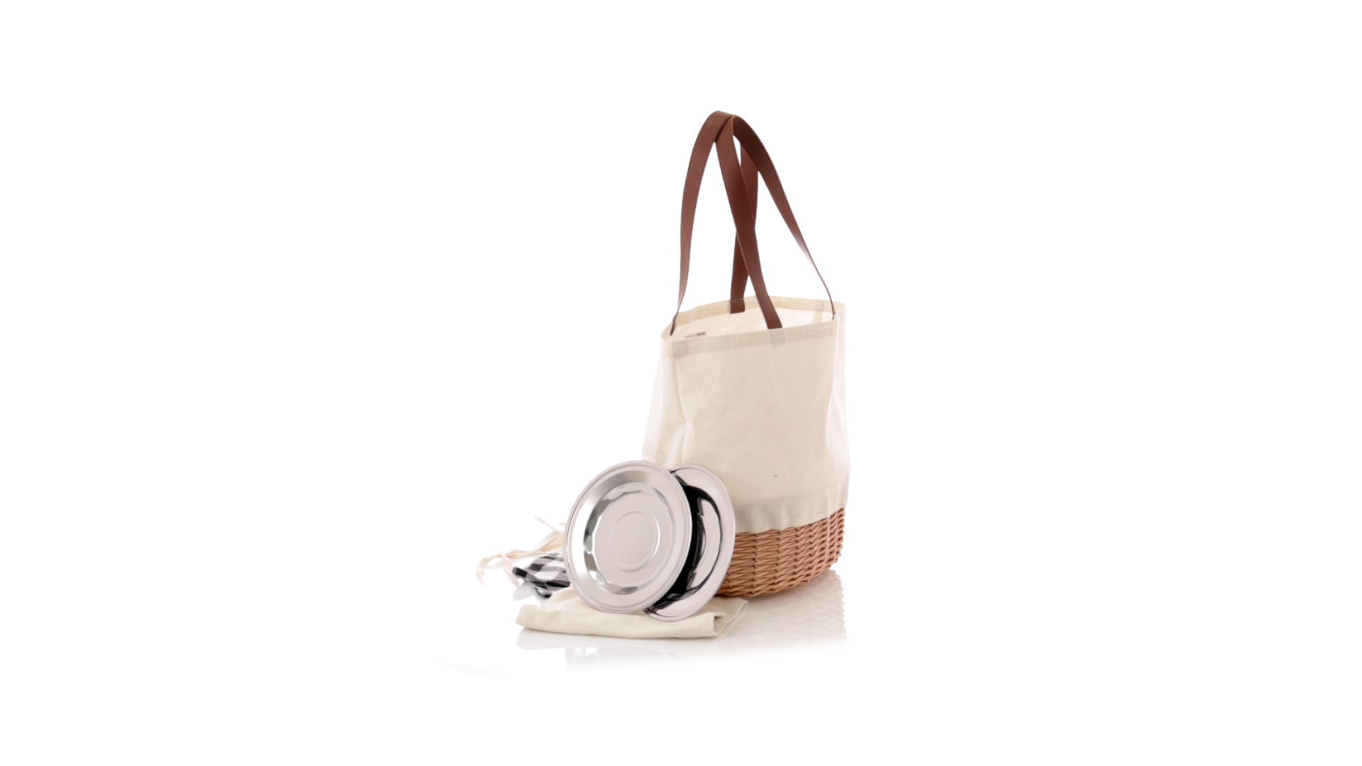 Werten Sie den Stil Ihres Picknicks mit diesem schicken Retro-Korb auf. Hergestellt aus Korbgeflecht und Baumwolle in natürlicher Ausführung, mit einem stabilen Tragegriff aus PU-Leder. Konzipiert für 2 Personen, inklusive 2 Gläser, 2 Messer, 2 Löffel, 2 Gabeln, 2 Schüsseln und 2 Stoffservietten. Präsentiert in einer einzelnen recycelten Tasche.
