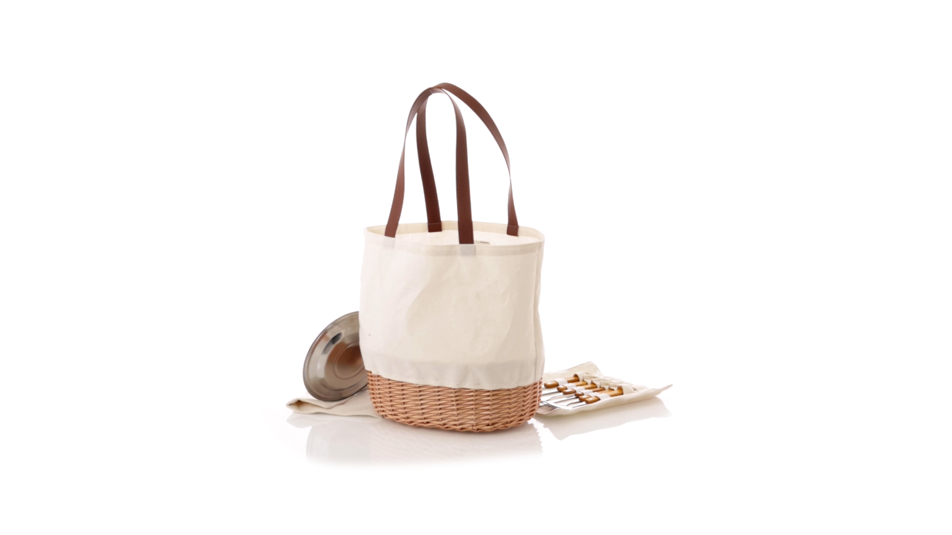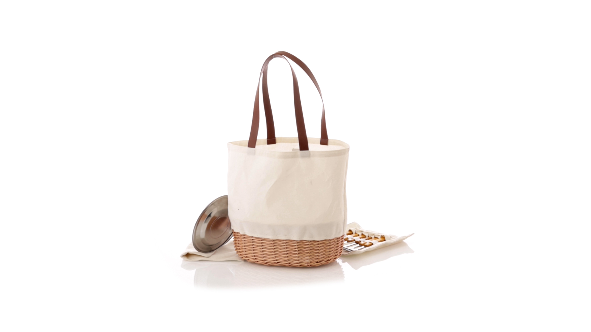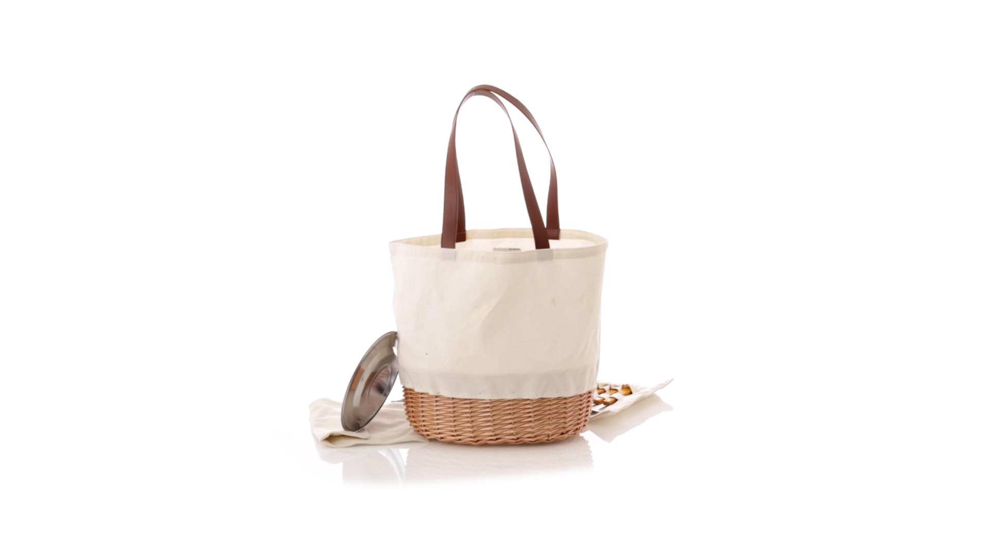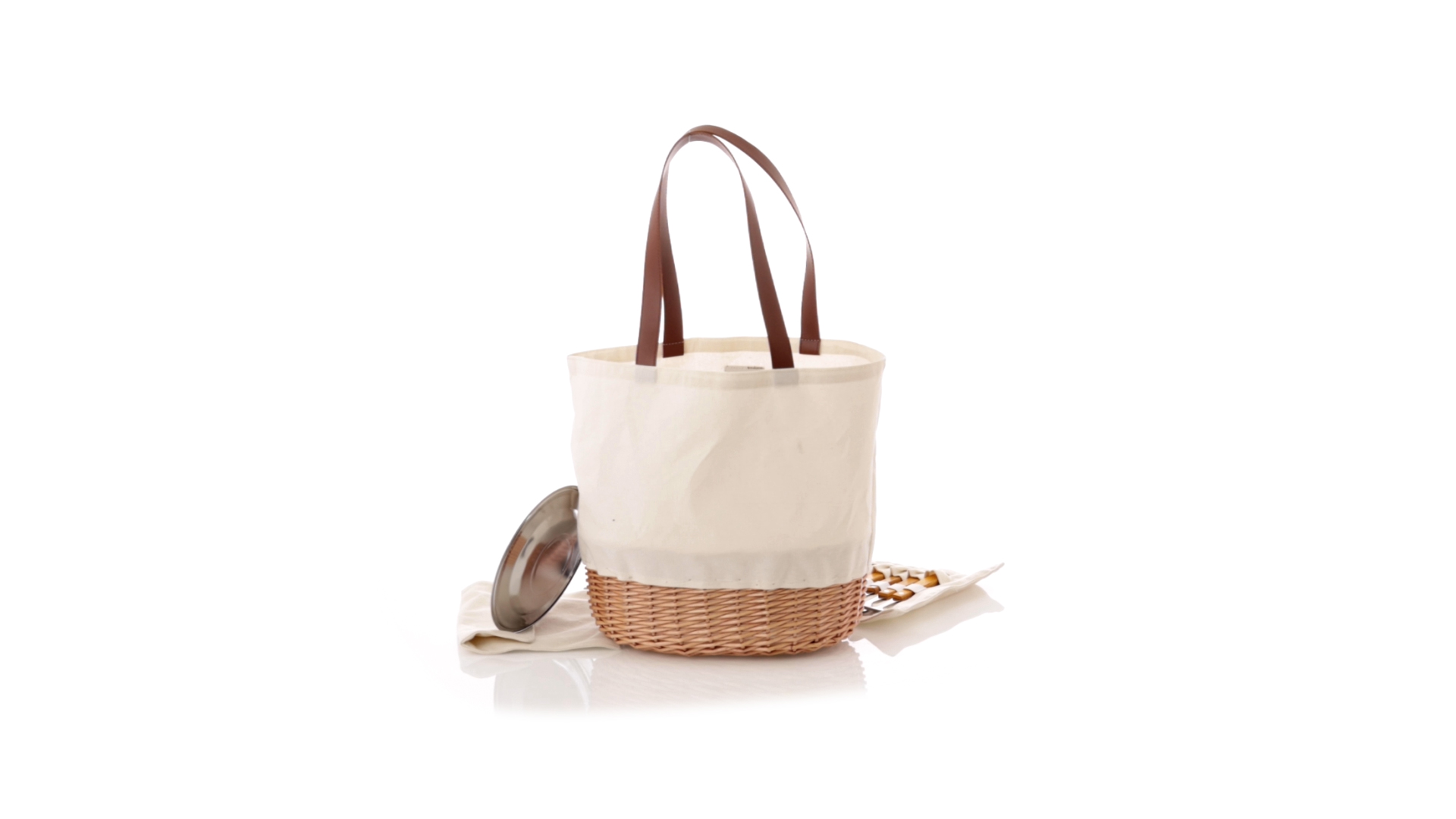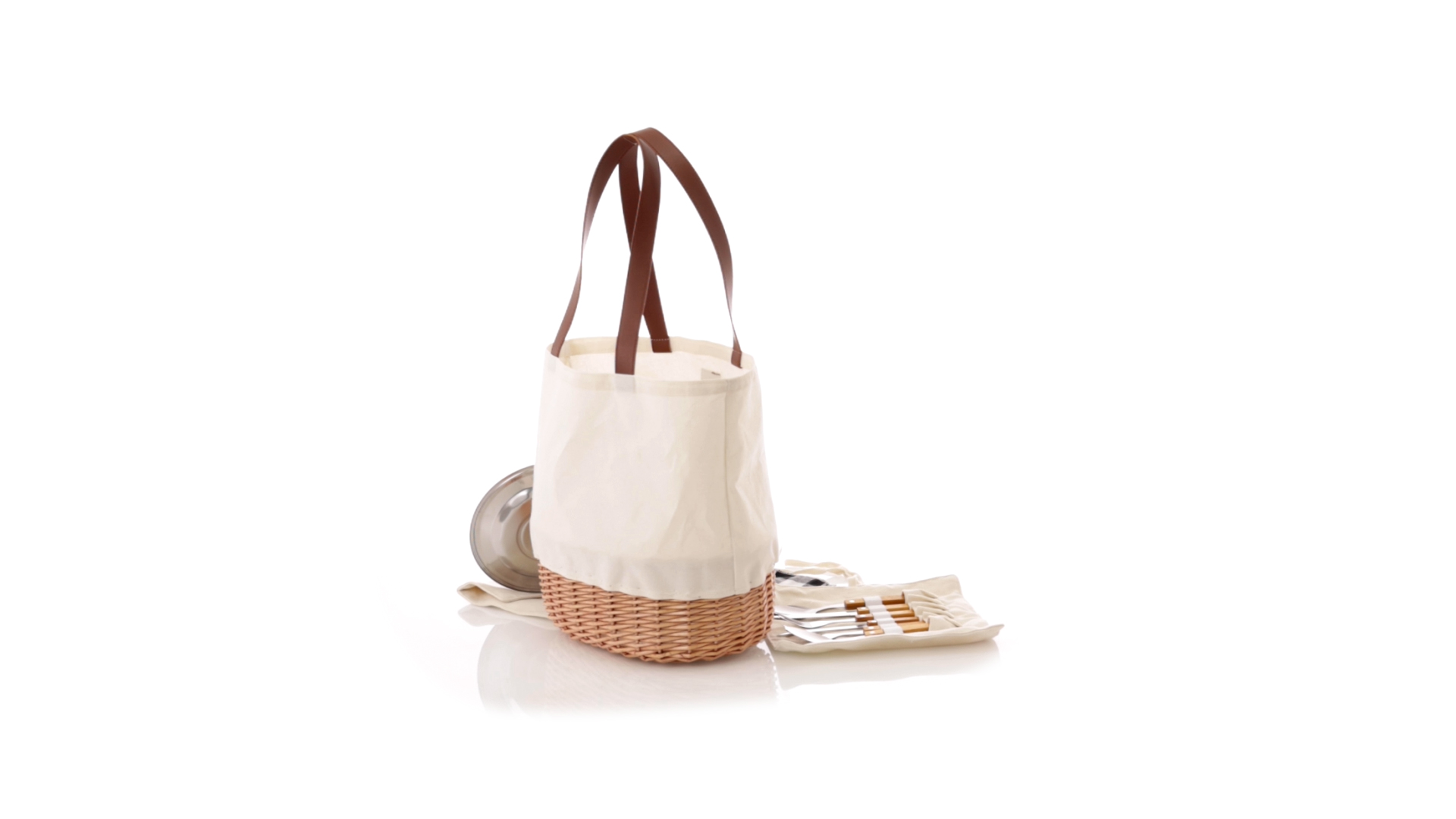 Werten Sie den Stil Ihres Picknicks mit diesem schicken Retro-Korb auf. Hergestellt aus Korbgeflecht und Baumwolle in natürlicher Ausführung, mit einem stabilen Tragegriff aus PU-Leder. Konzipiert für 2 Personen, inklusive 2 Gläser, 2 Messer, 2 Löffel, 2 Gabeln, 2 Schüsseln und 2 Stoffservietten. Präsentiert in einer einzelnen recycelten Tasche.