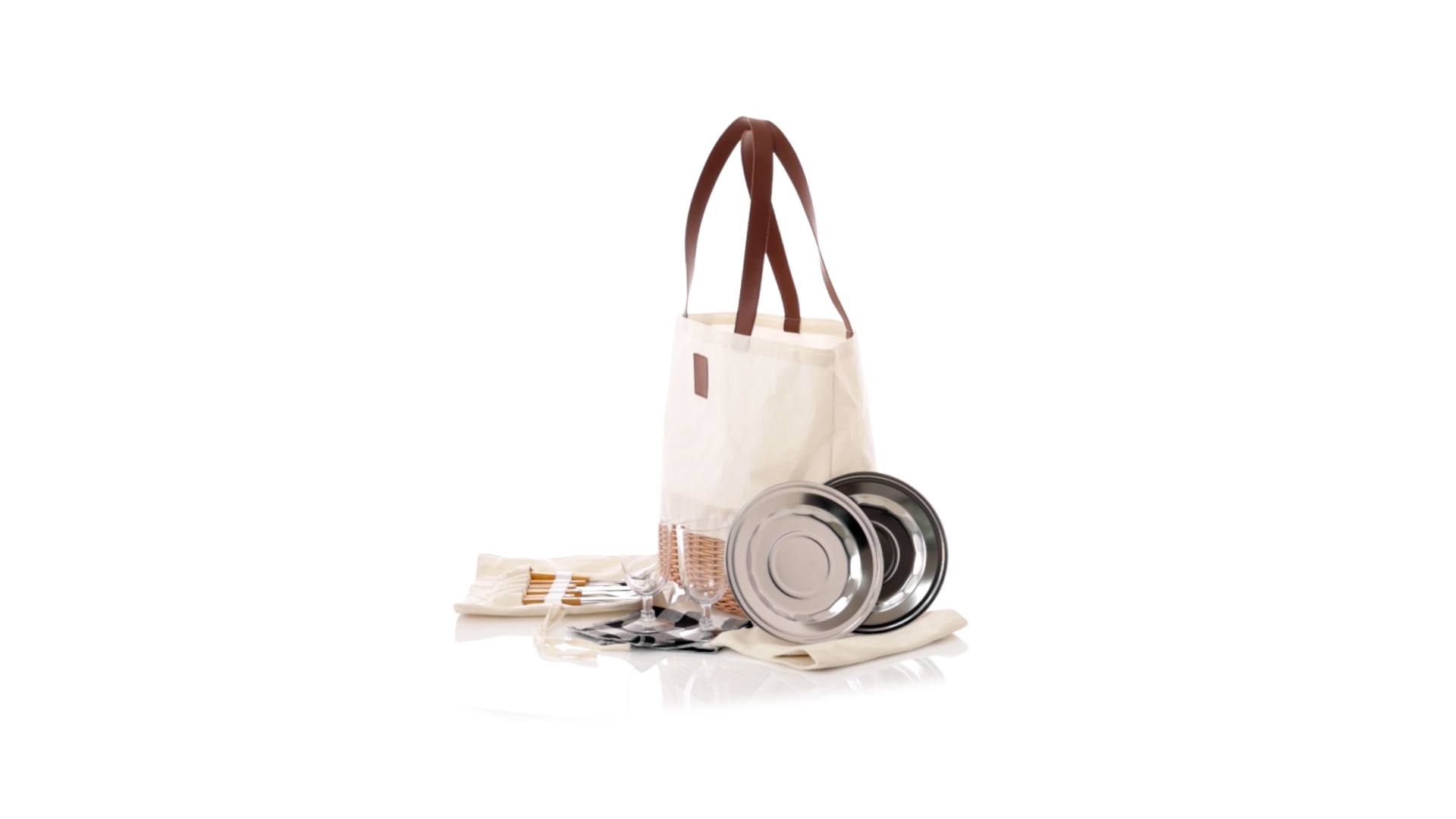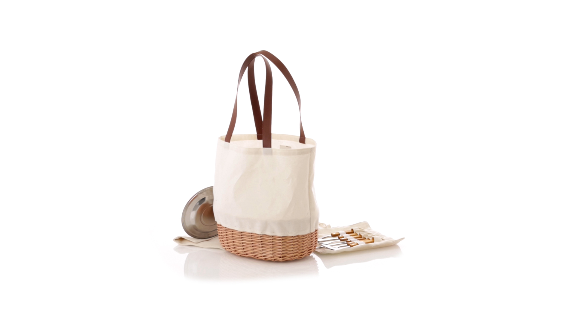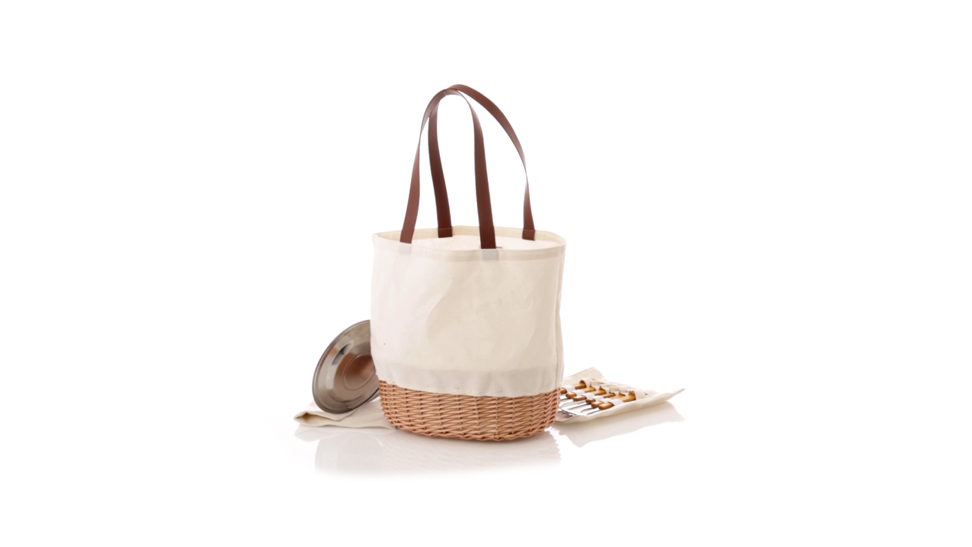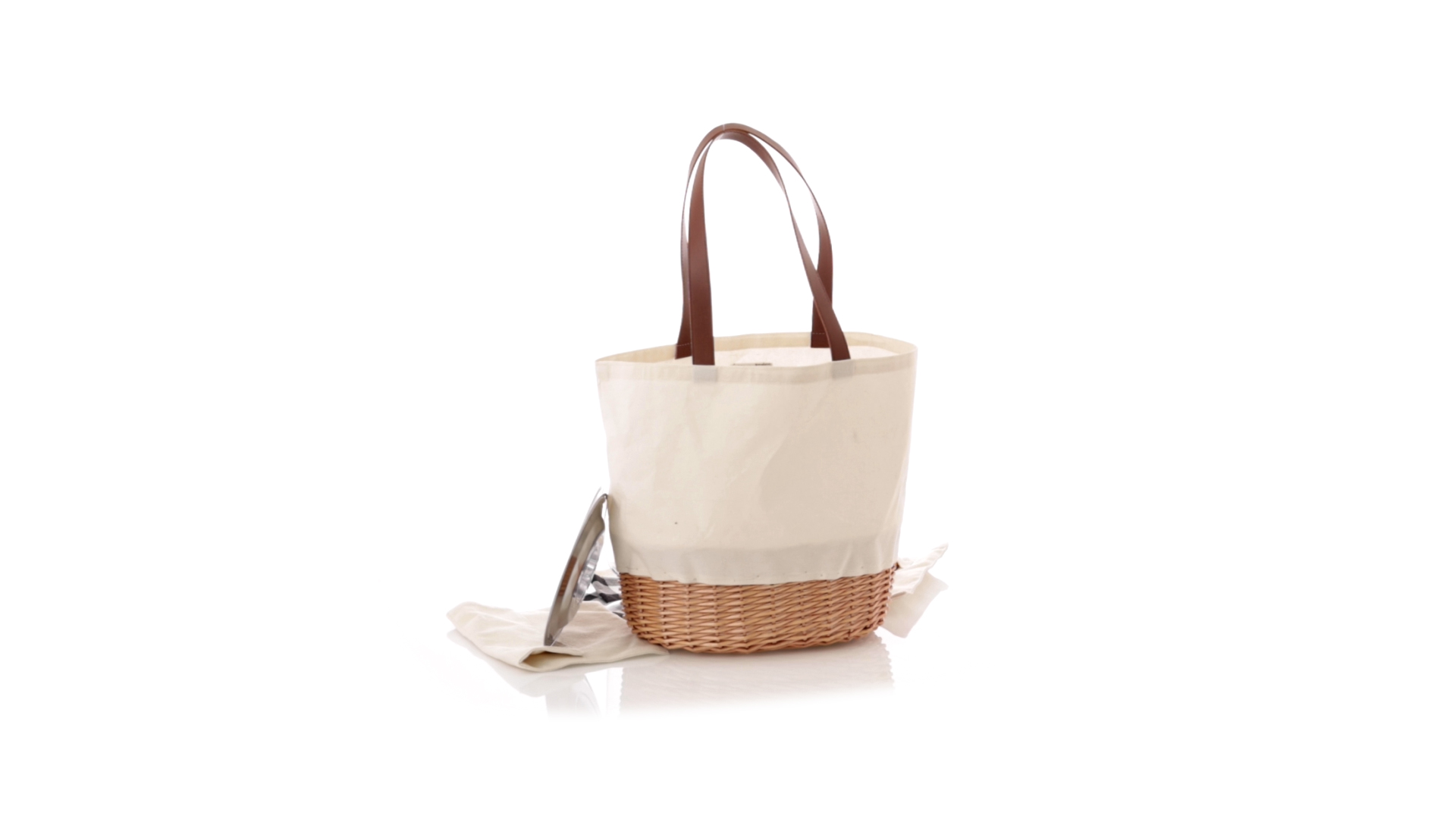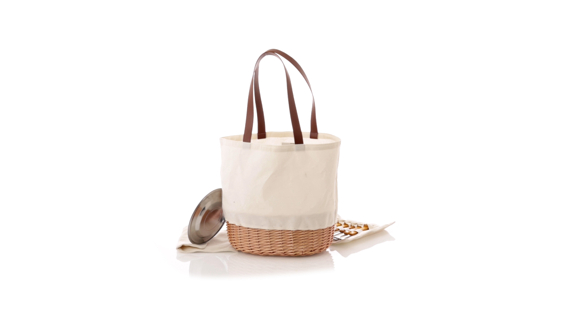 Werten Sie den Stil Ihres Picknicks mit diesem schicken Retro-Korb auf. Hergestellt aus Korbgeflecht und Baumwolle in natürlicher Ausführung, mit einem stabilen Tragegriff aus PU-Leder. Konzipiert für 2 Personen, inklusive 2 Gläser, 2 Messer, 2 Löffel, 2 Gabeln, 2 Schüsseln und 2 Stoffservietten. Präsentiert in einer einzelnen recycelten Tasche.