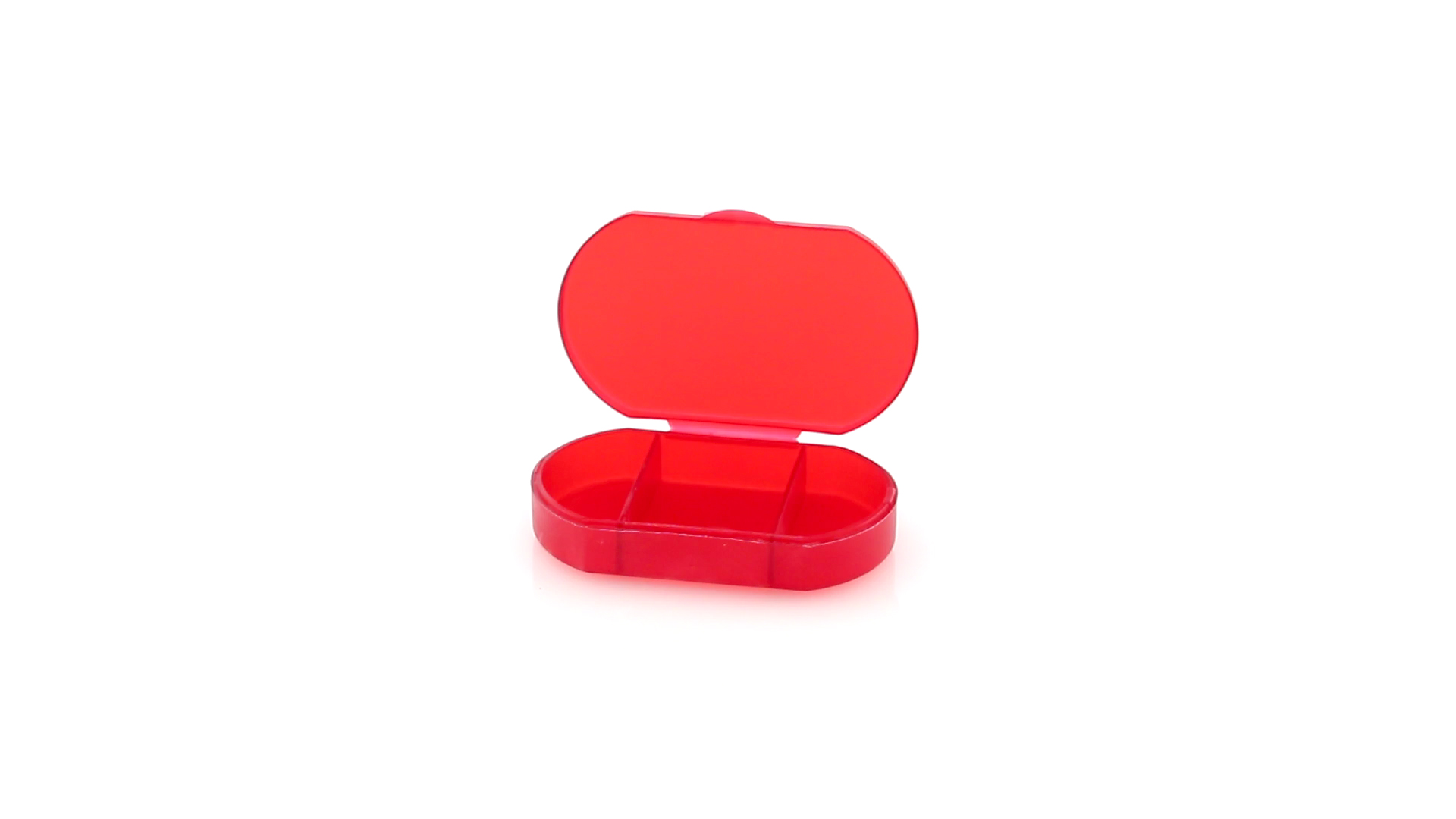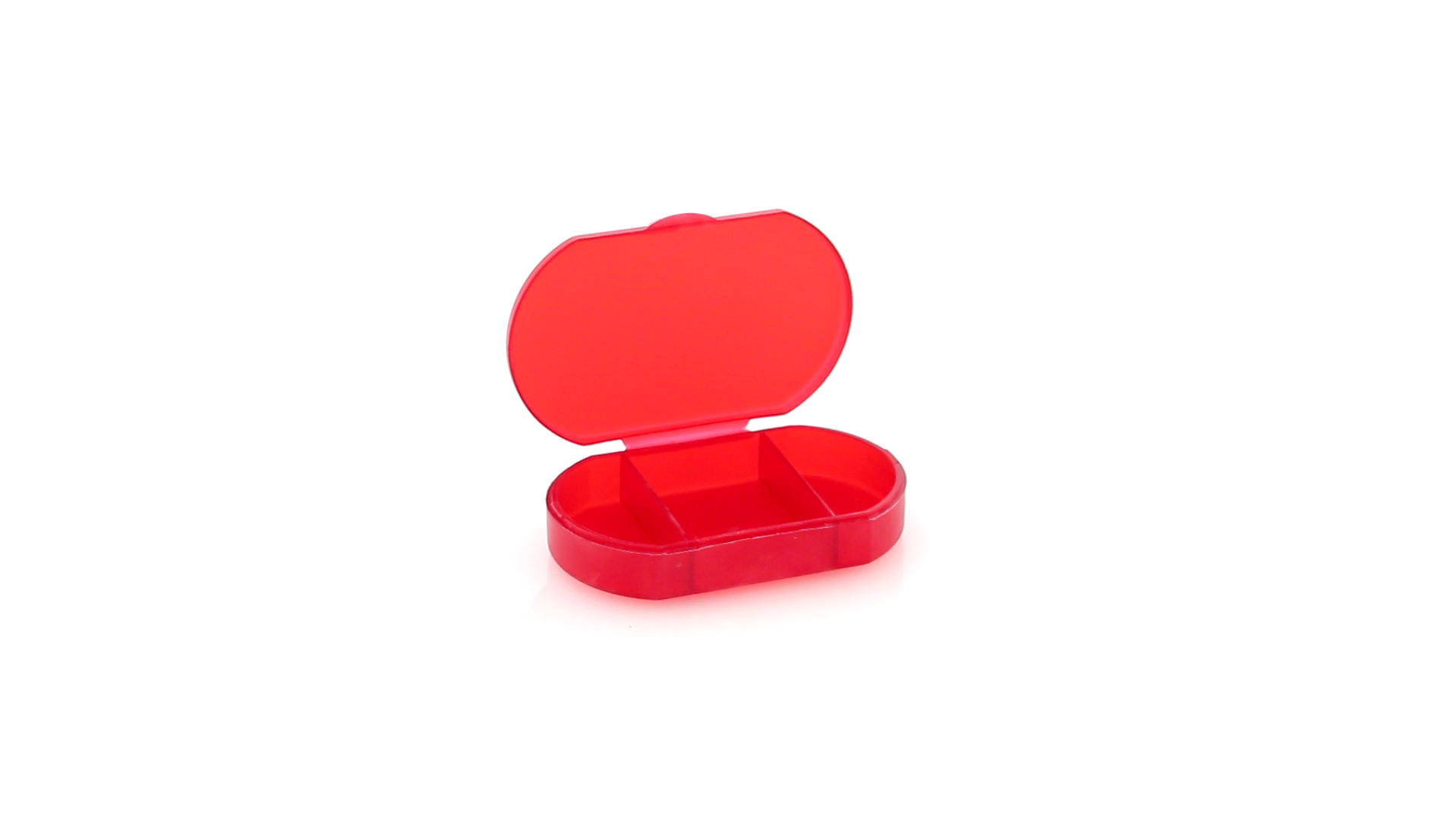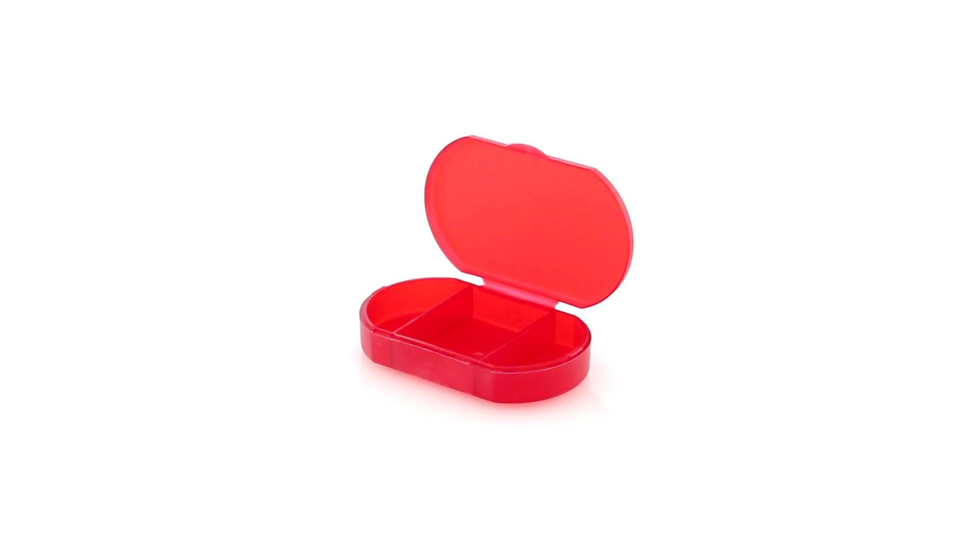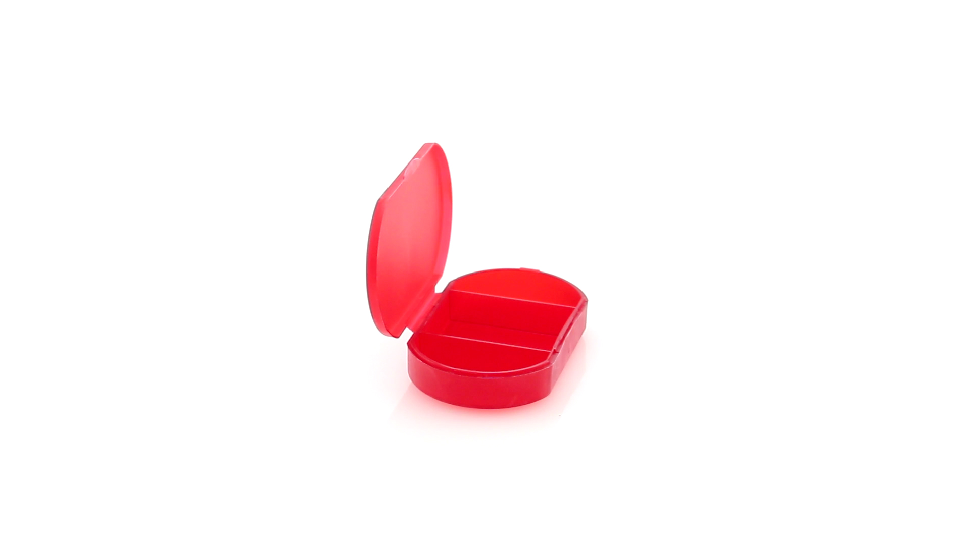 Halbtransparente Pillendose in kräftigen Farben. Mit 3 Fächern und Sicherheitsverschluss.