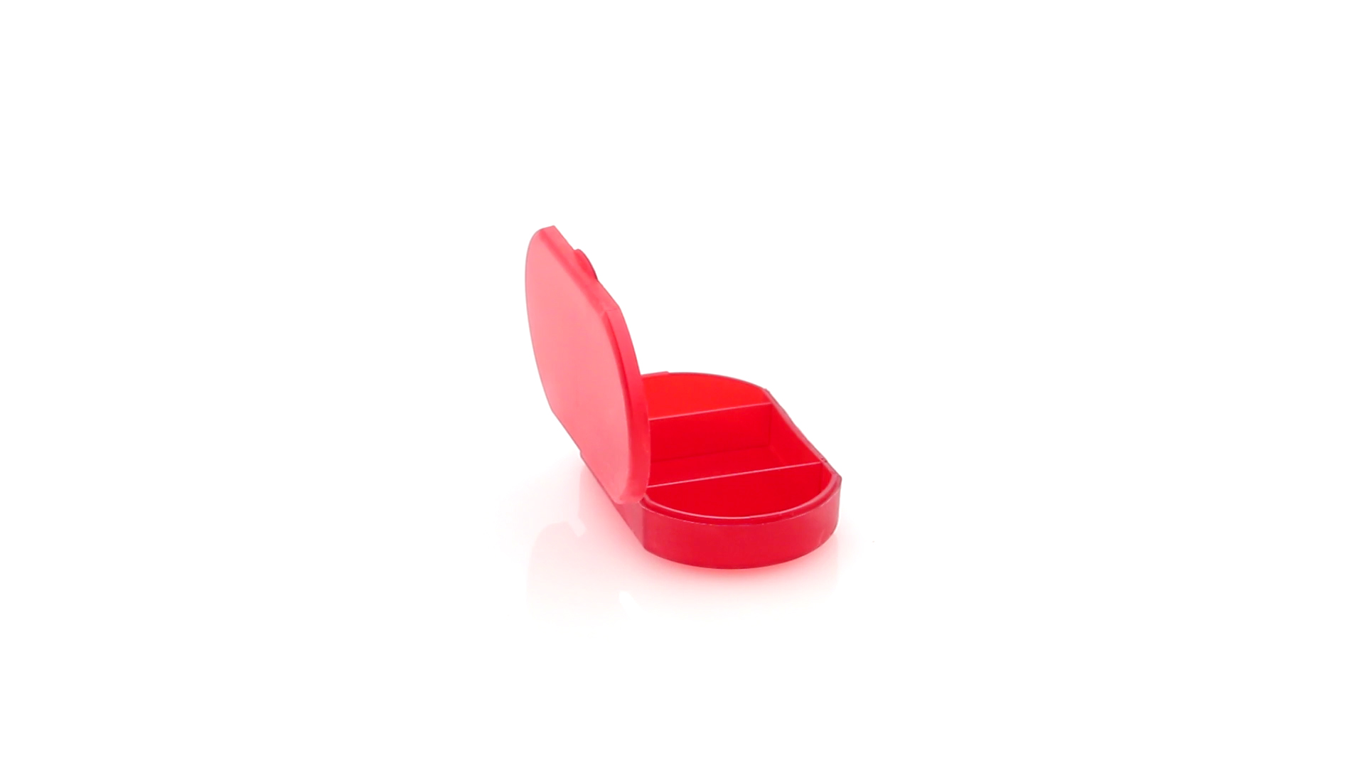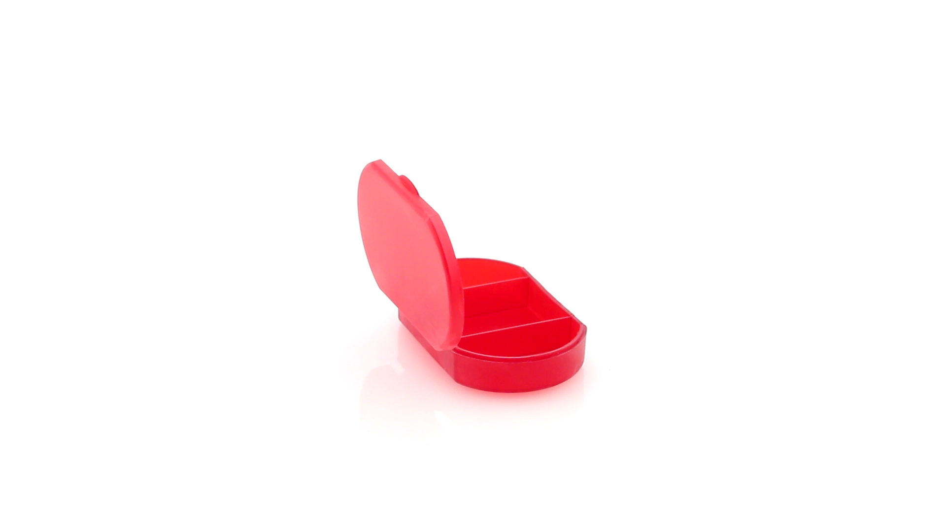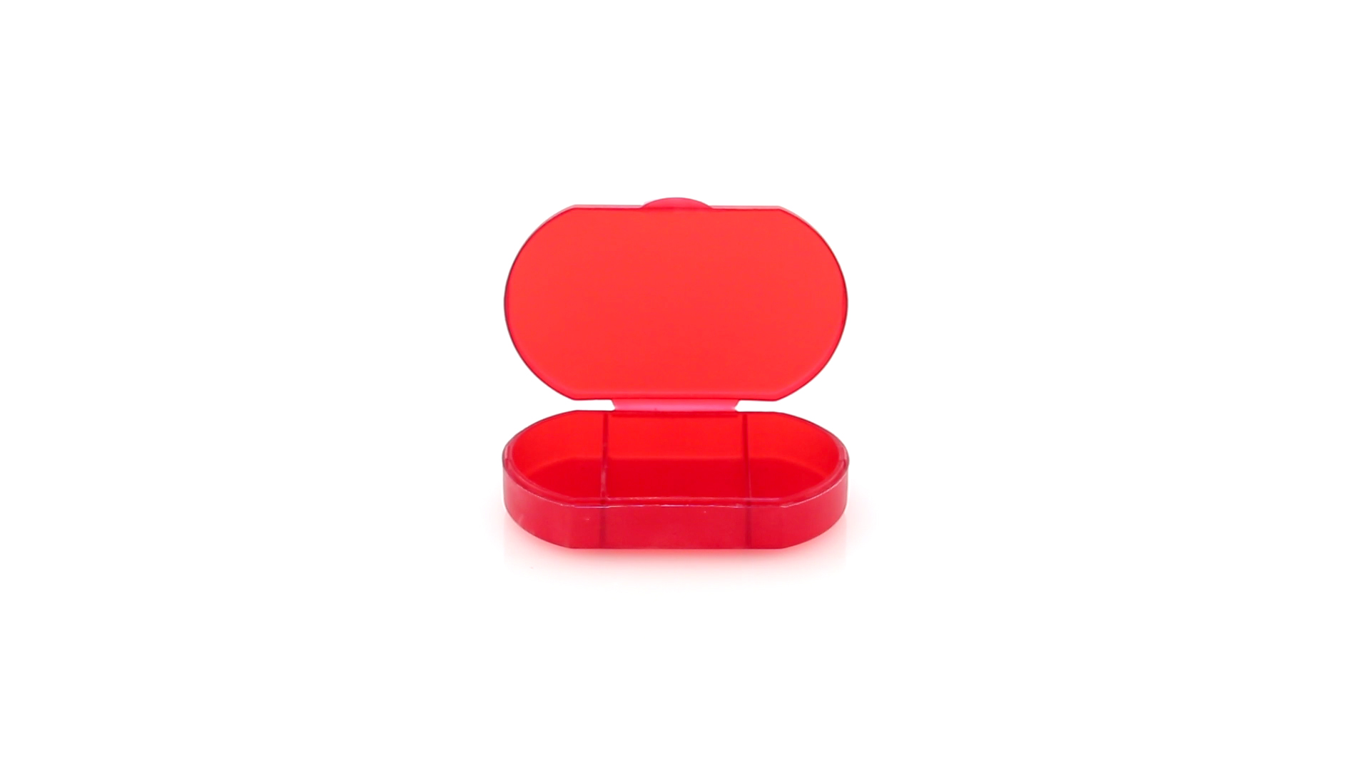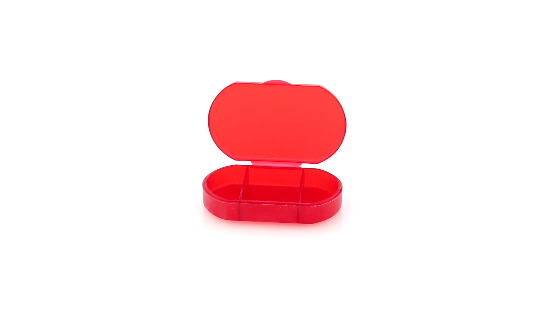 Halbtransparente Pillendose in kräftigen Farben. Mit 3 Fächern und Sicherheitsverschluss.