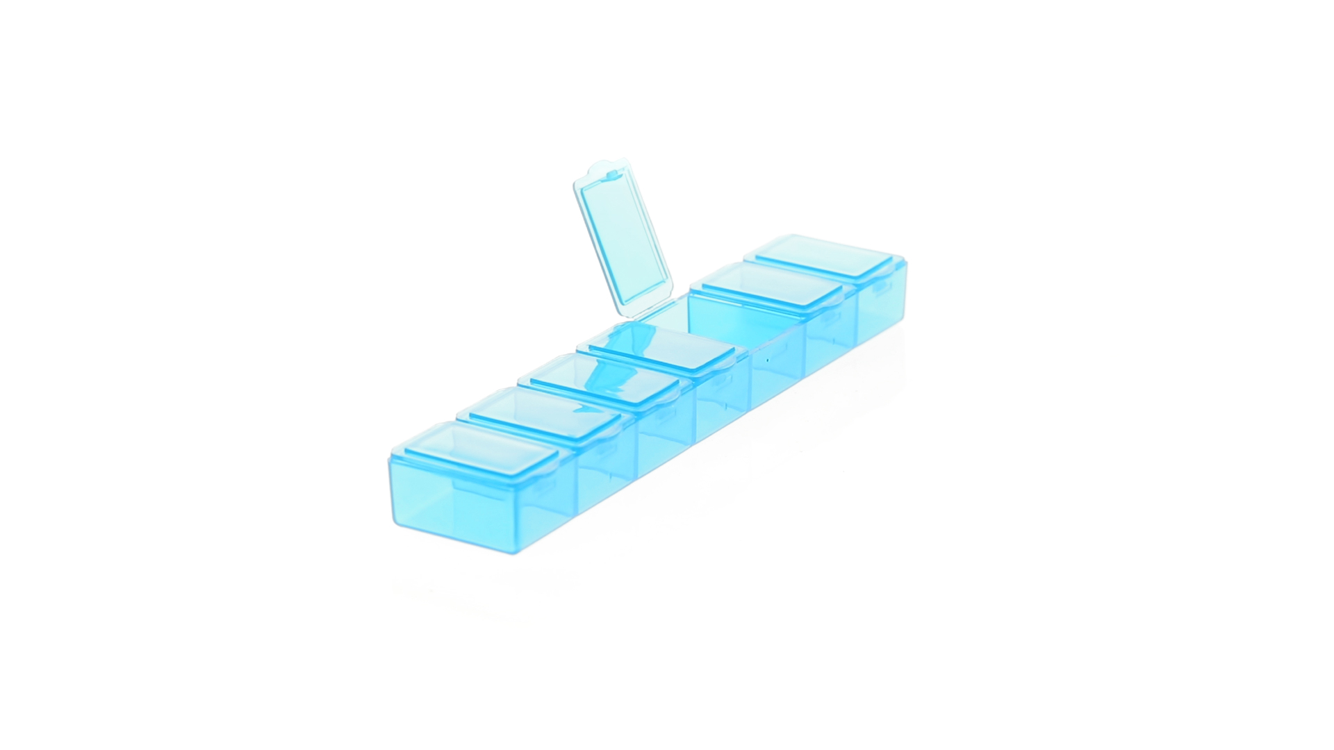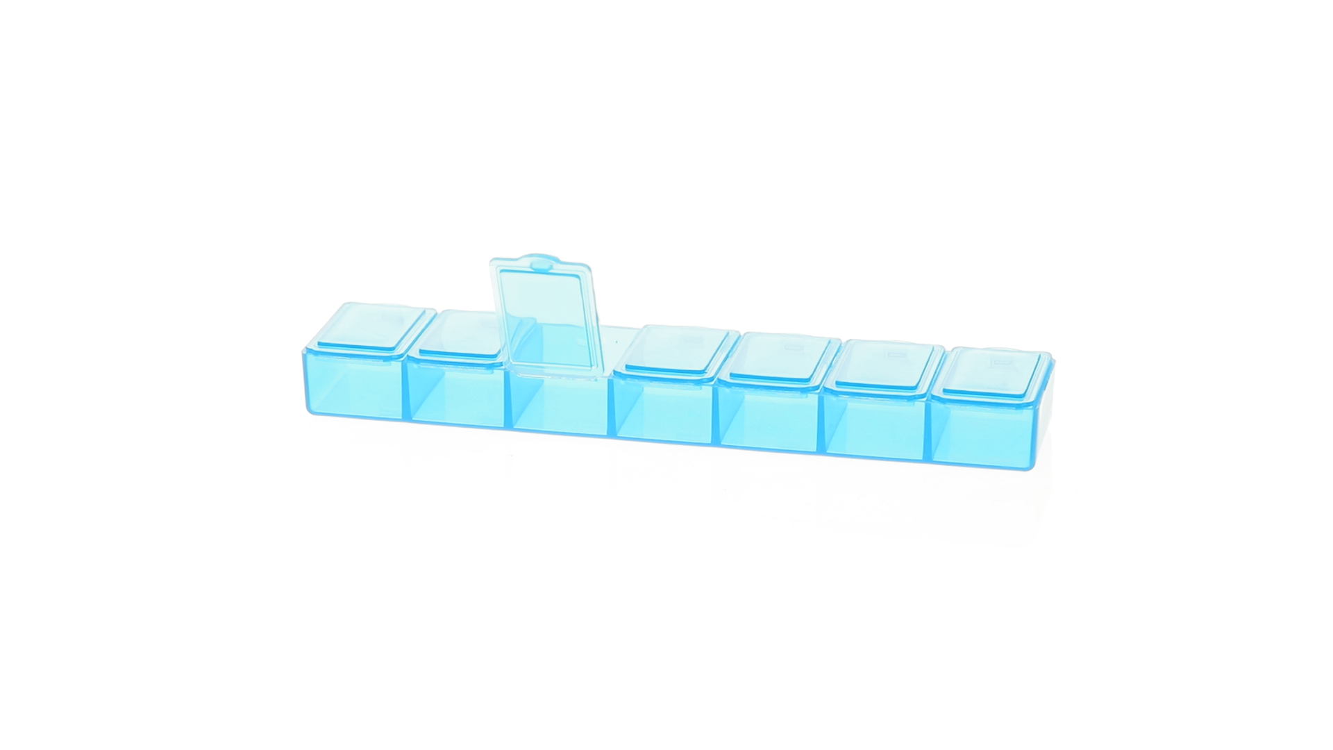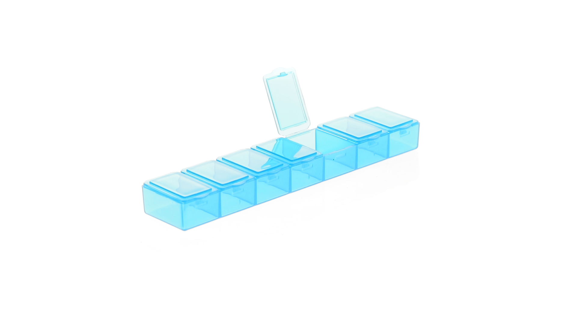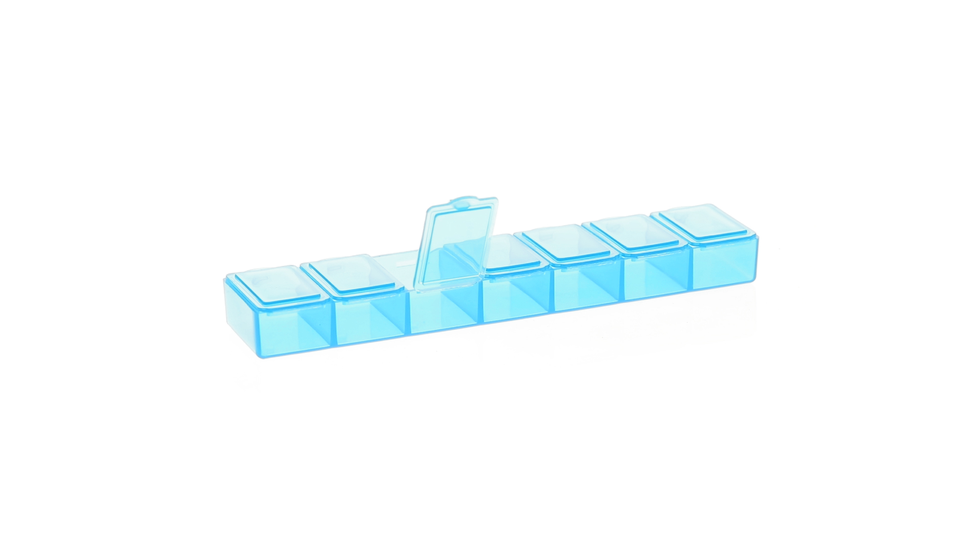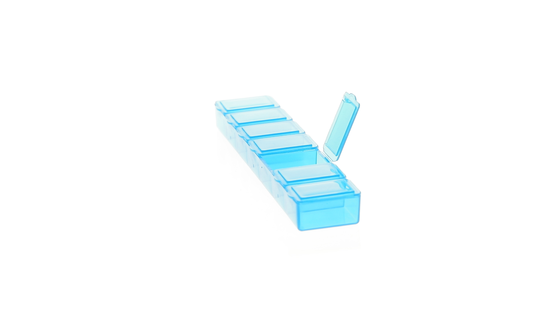 Pillendose aus robustem, halbtransparentem Material in lebendigen Farben mit einem Fach für jeden Wochentag. Mit 7 einzelnen Fächern mit Sicherheitsverschluss.