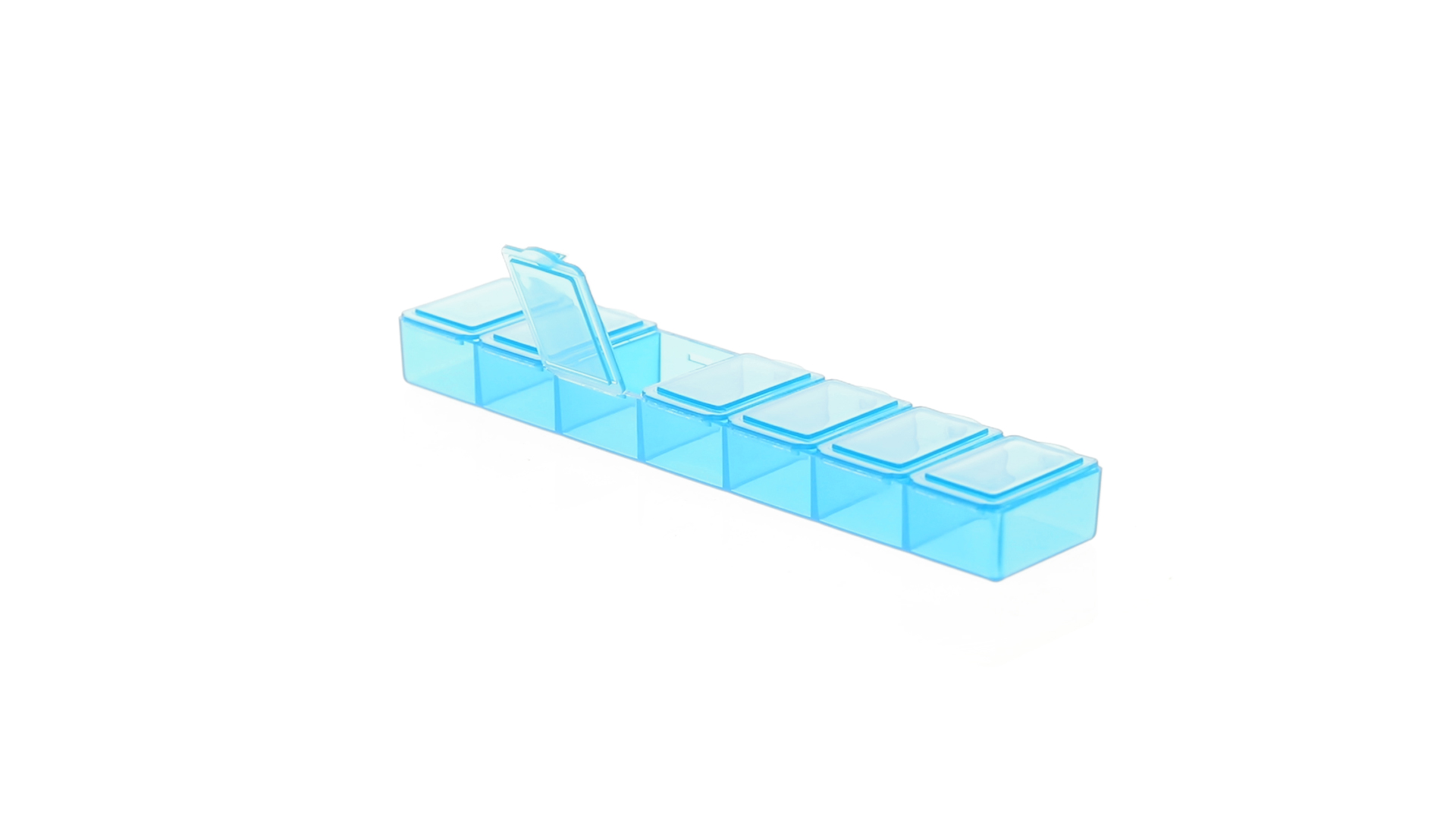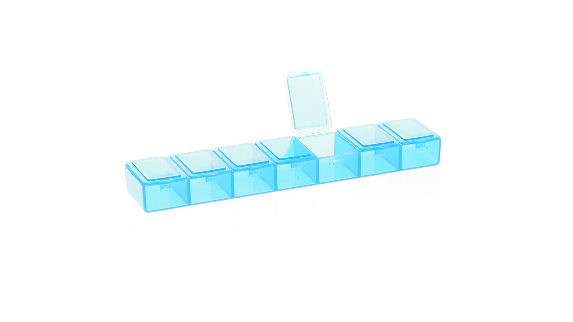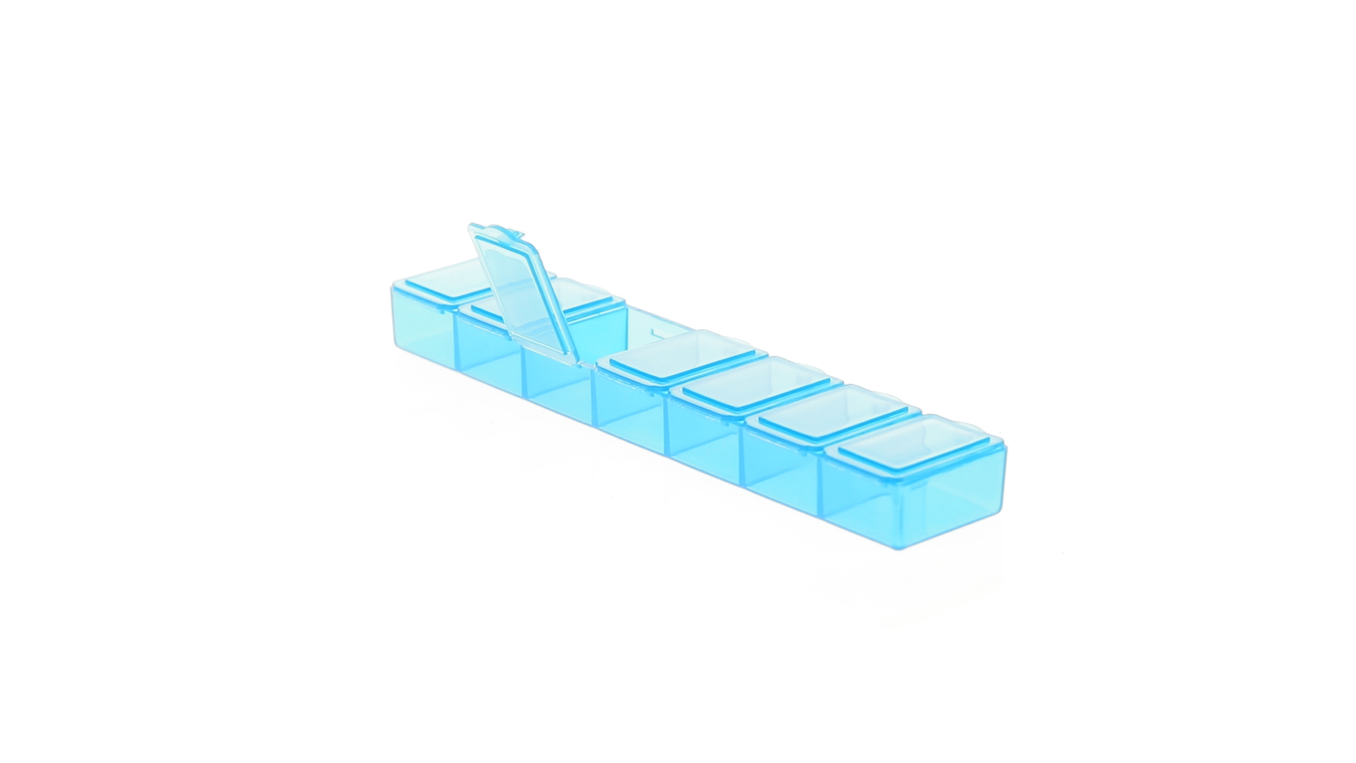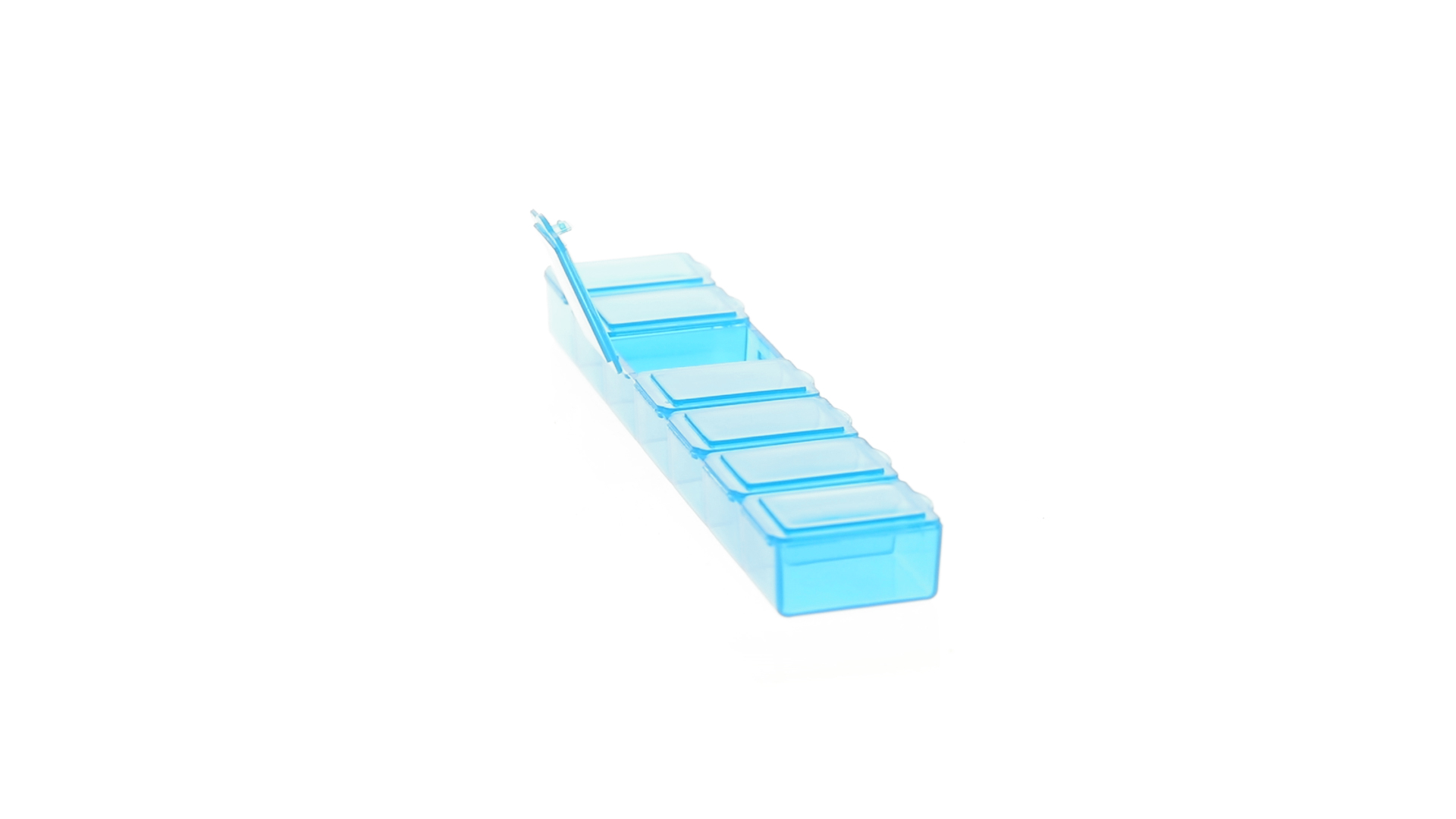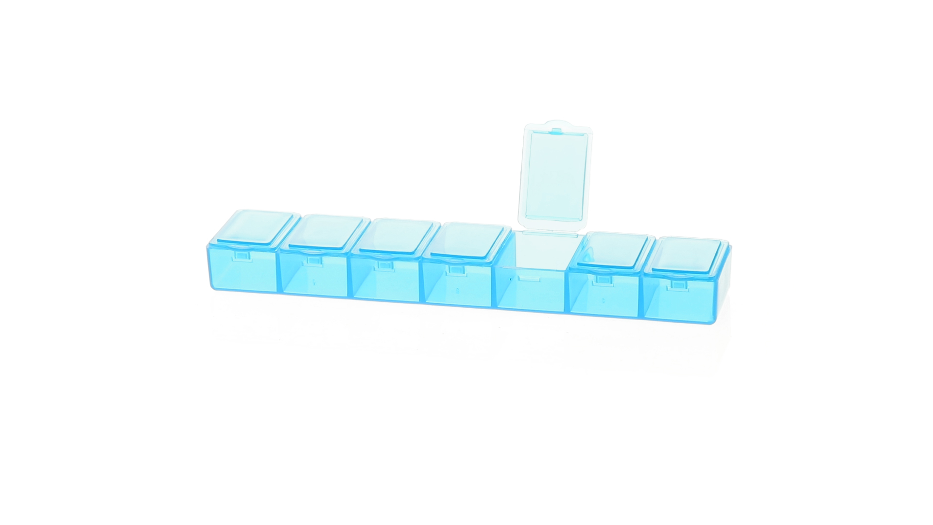 Pillendose aus robustem, halbtransparentem Material in lebendigen Farben mit einem Fach für jeden Wochentag. Mit 7 einzelnen Fächern mit Sicherheitsverschluss.