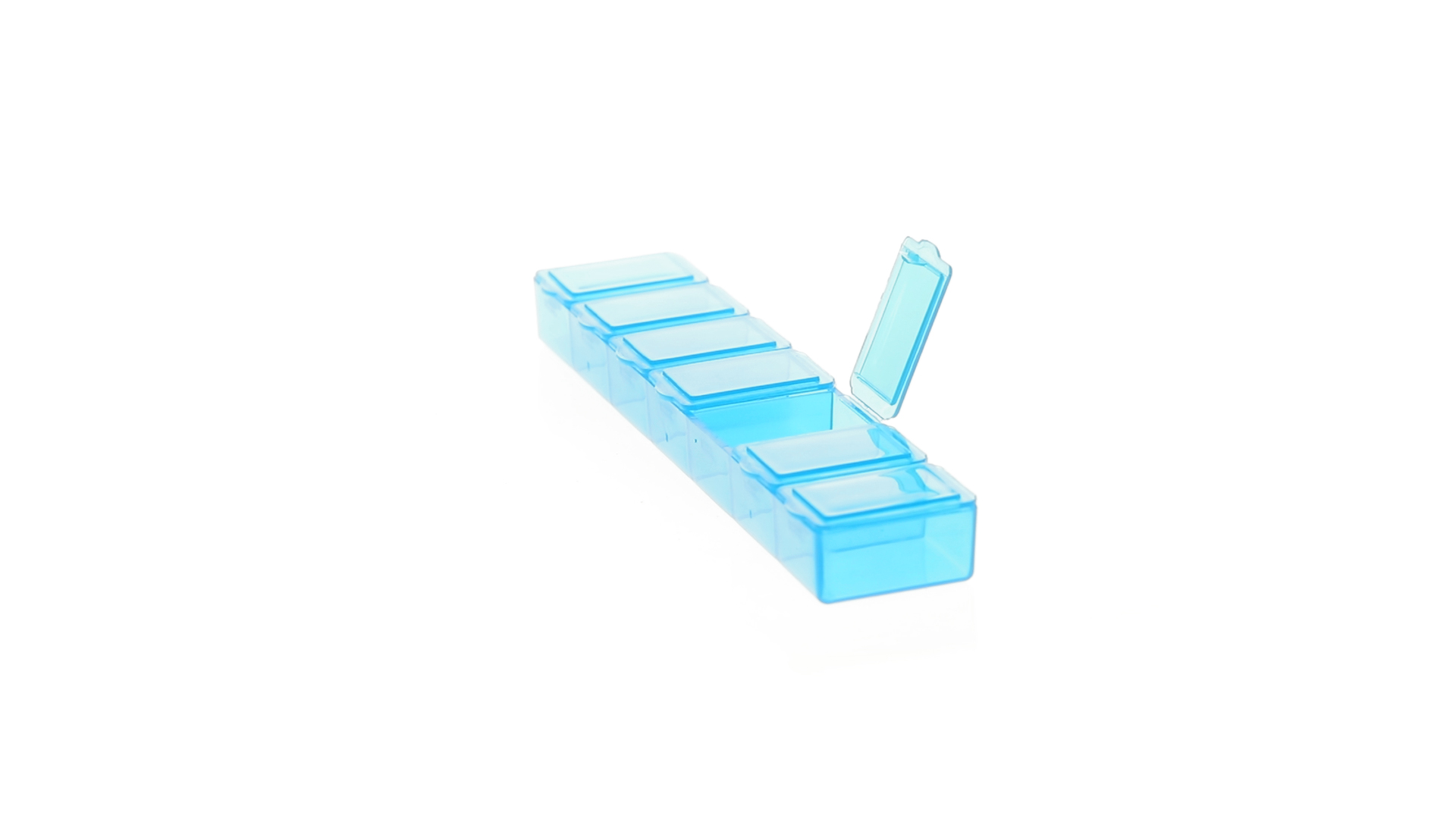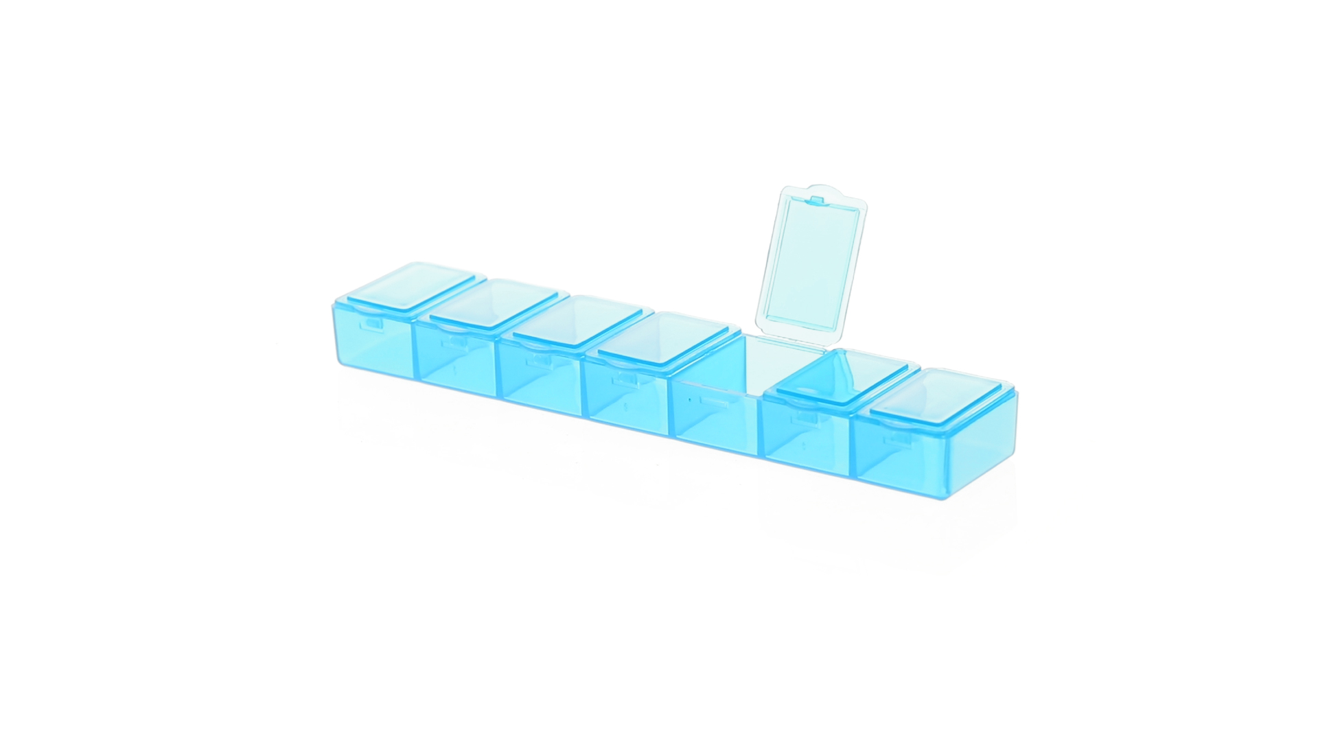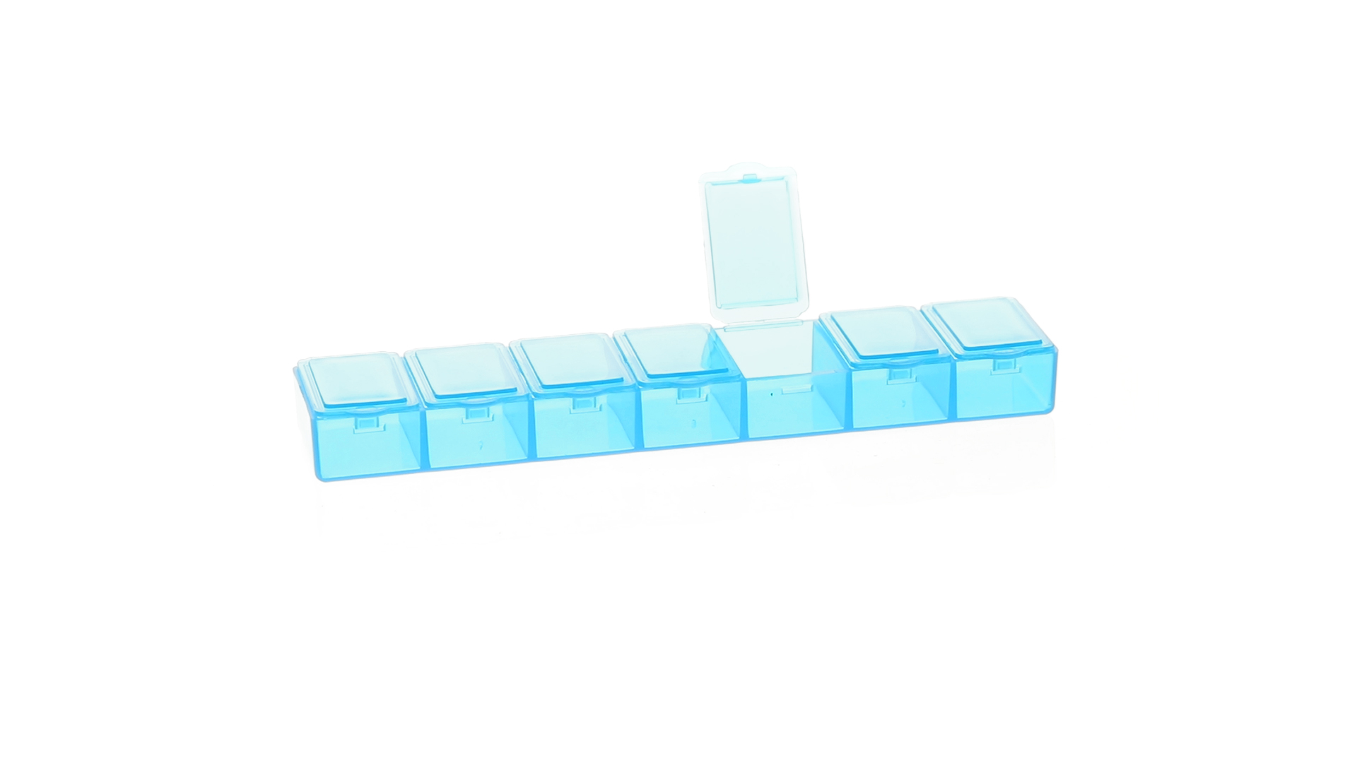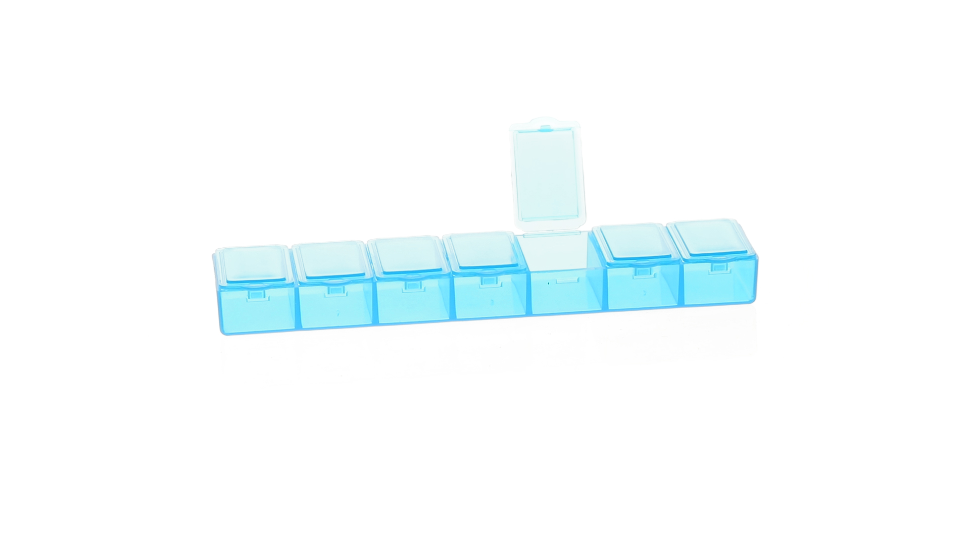 Pillendose aus robustem, halbtransparentem Material in lebendigen Farben mit einem Fach für jeden Wochentag. Mit 7 einzelnen Fächern mit Sicherheitsverschluss.