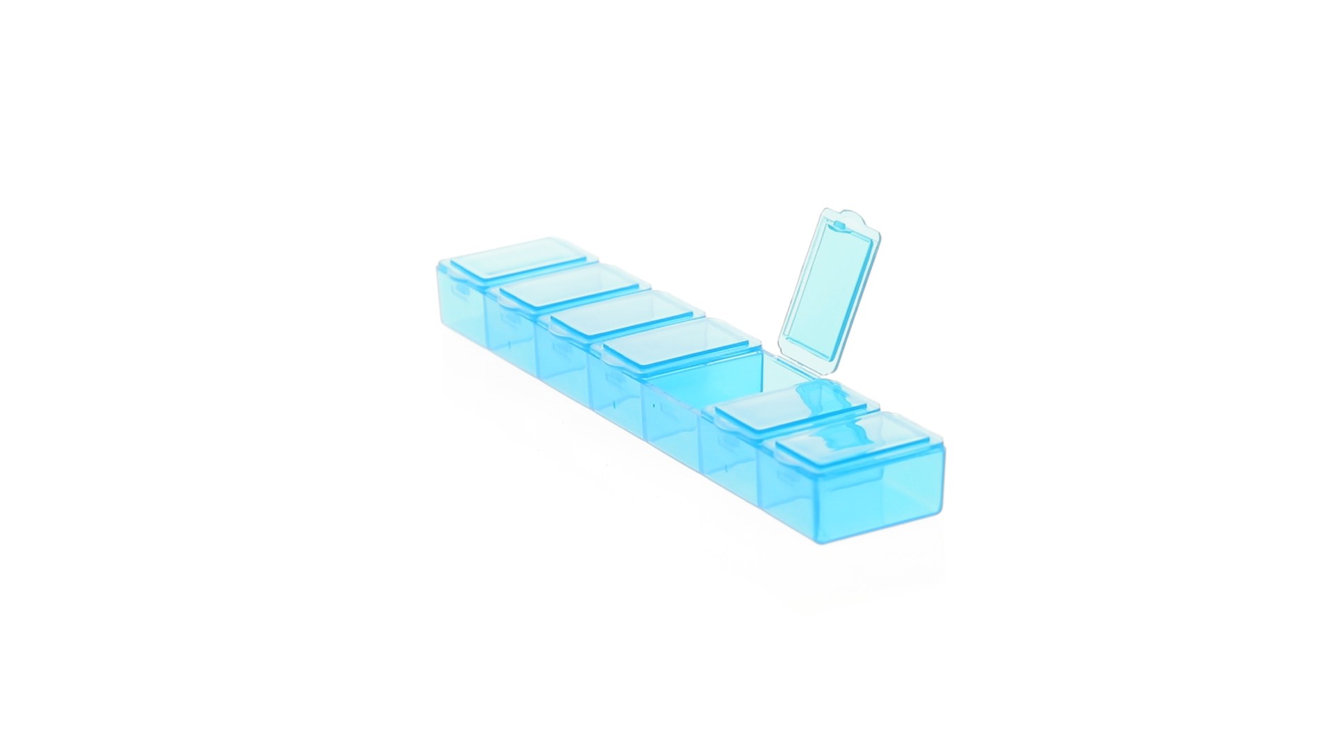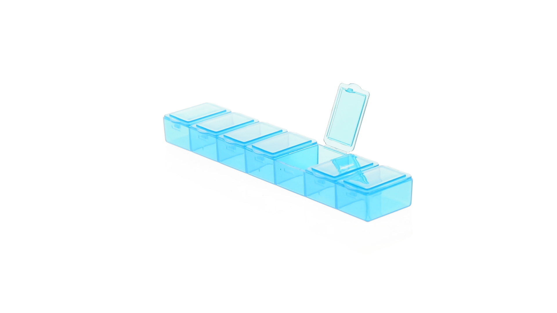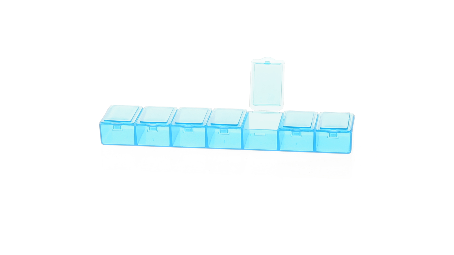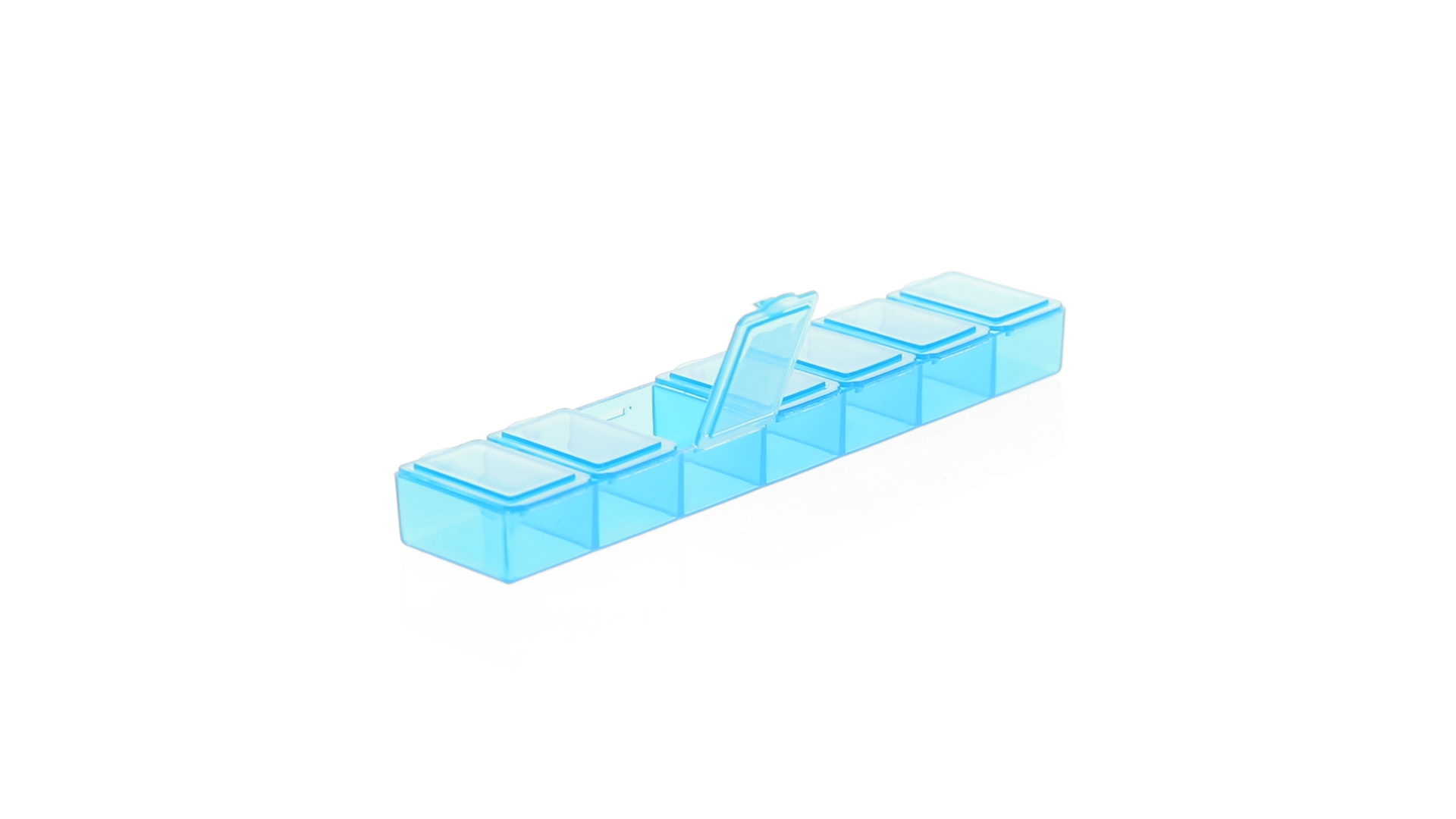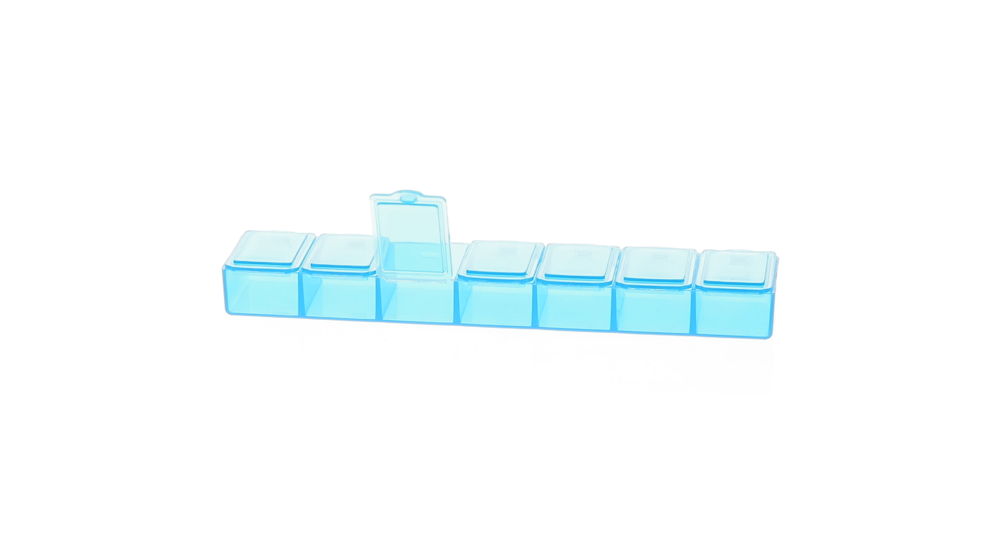 Pillendose aus robustem, halbtransparentem Material in lebendigen Farben mit einem Fach für jeden Wochentag. Mit 7 einzelnen Fächern mit Sicherheitsverschluss.