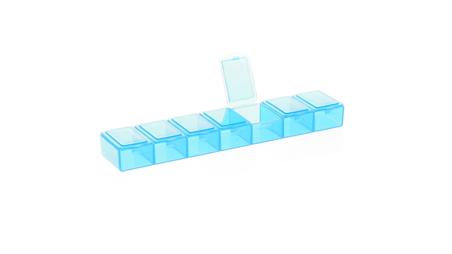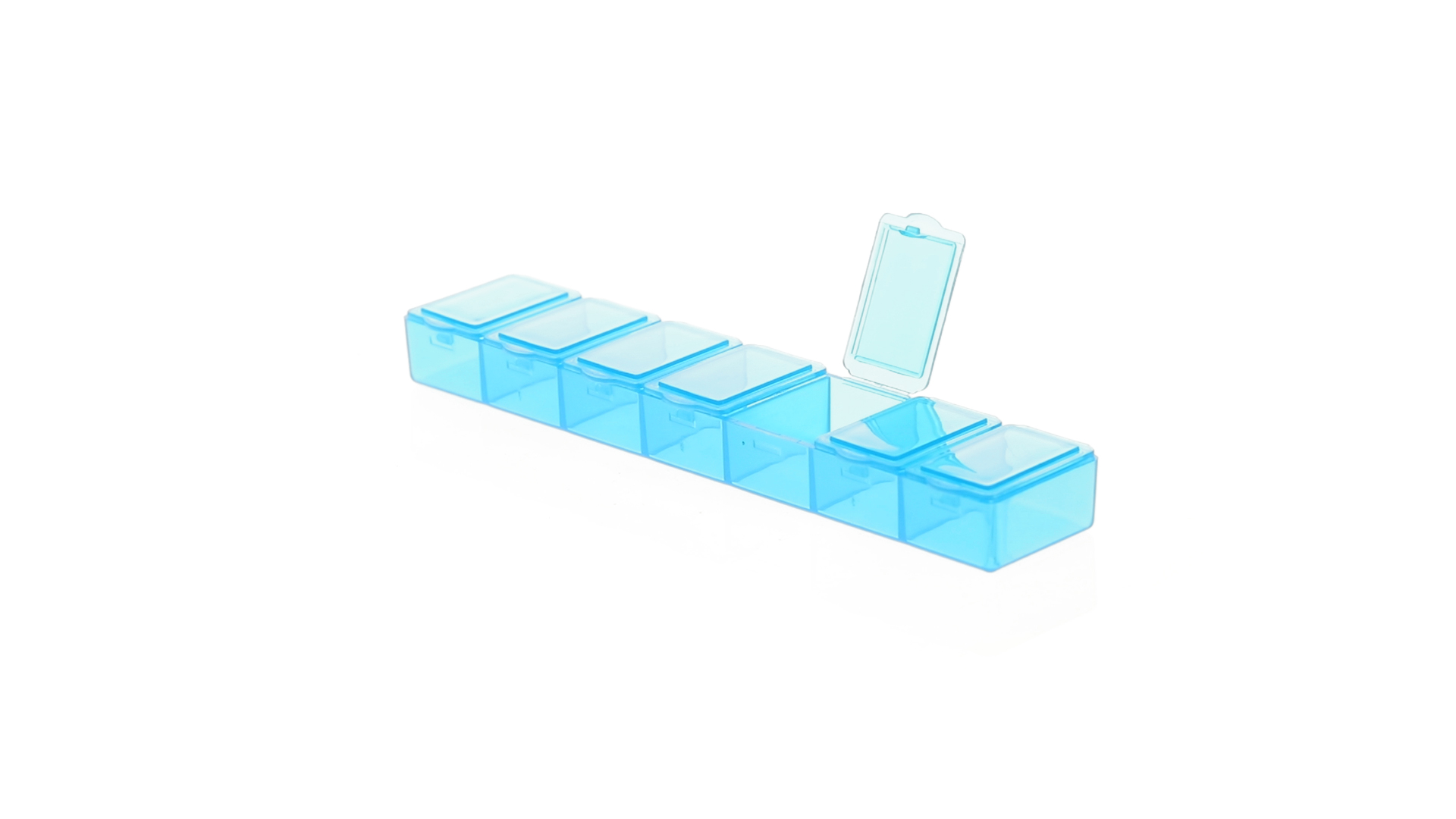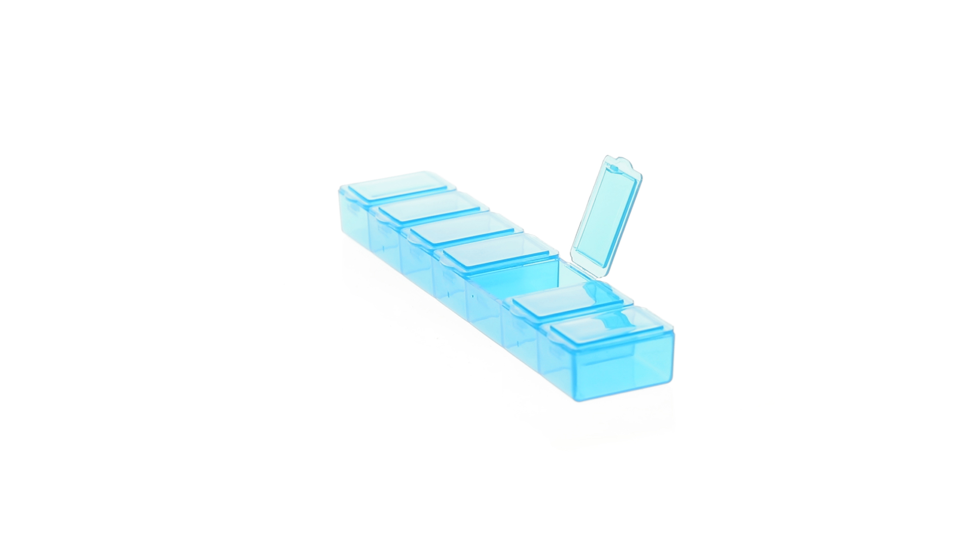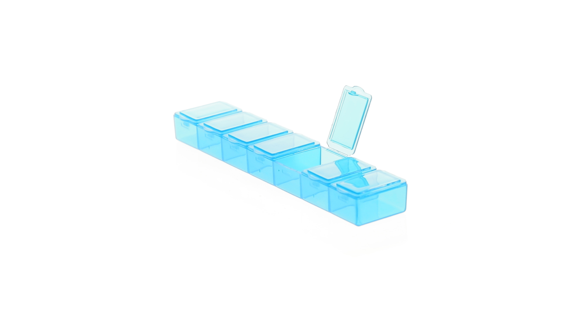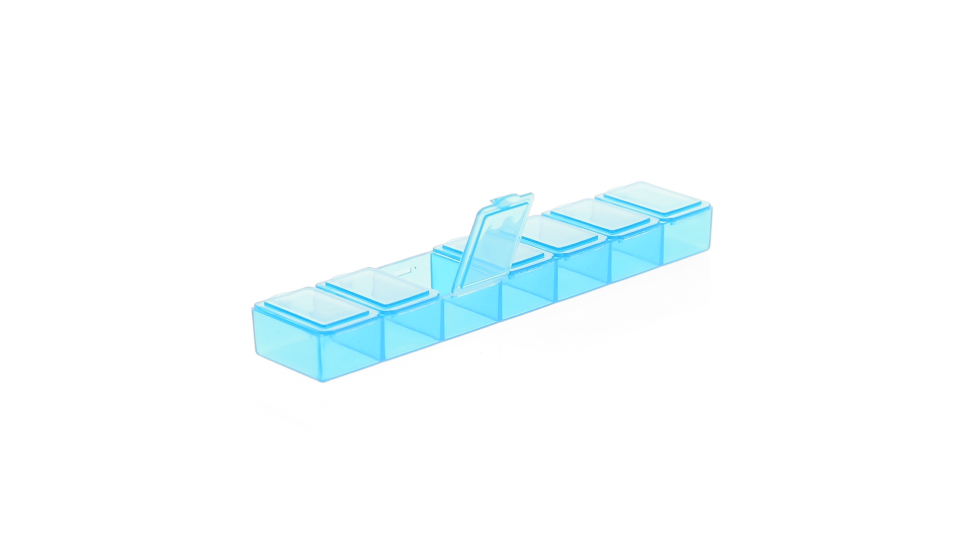 Pillendose aus robustem, halbtransparentem Material in lebendigen Farben mit einem Fach für jeden Wochentag. Mit 7 einzelnen Fächern mit Sicherheitsverschluss.