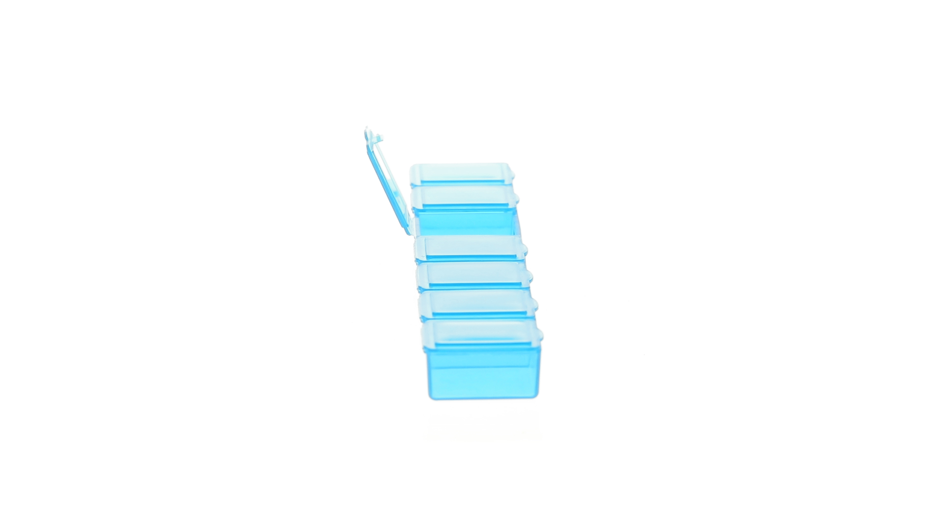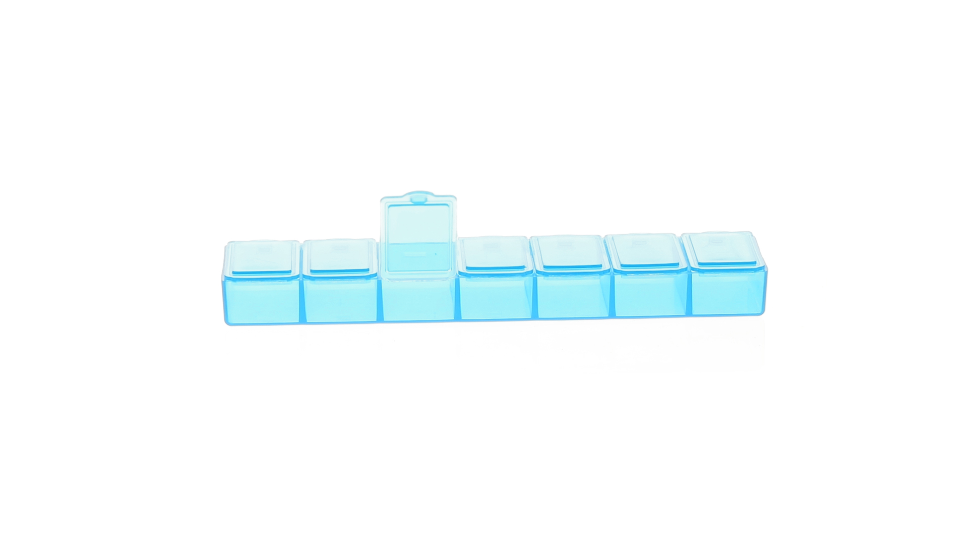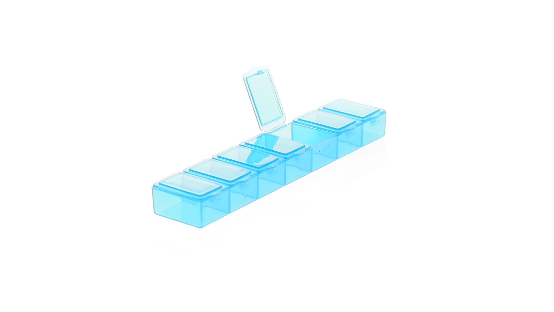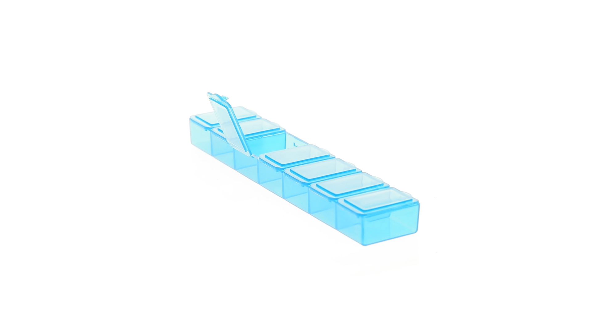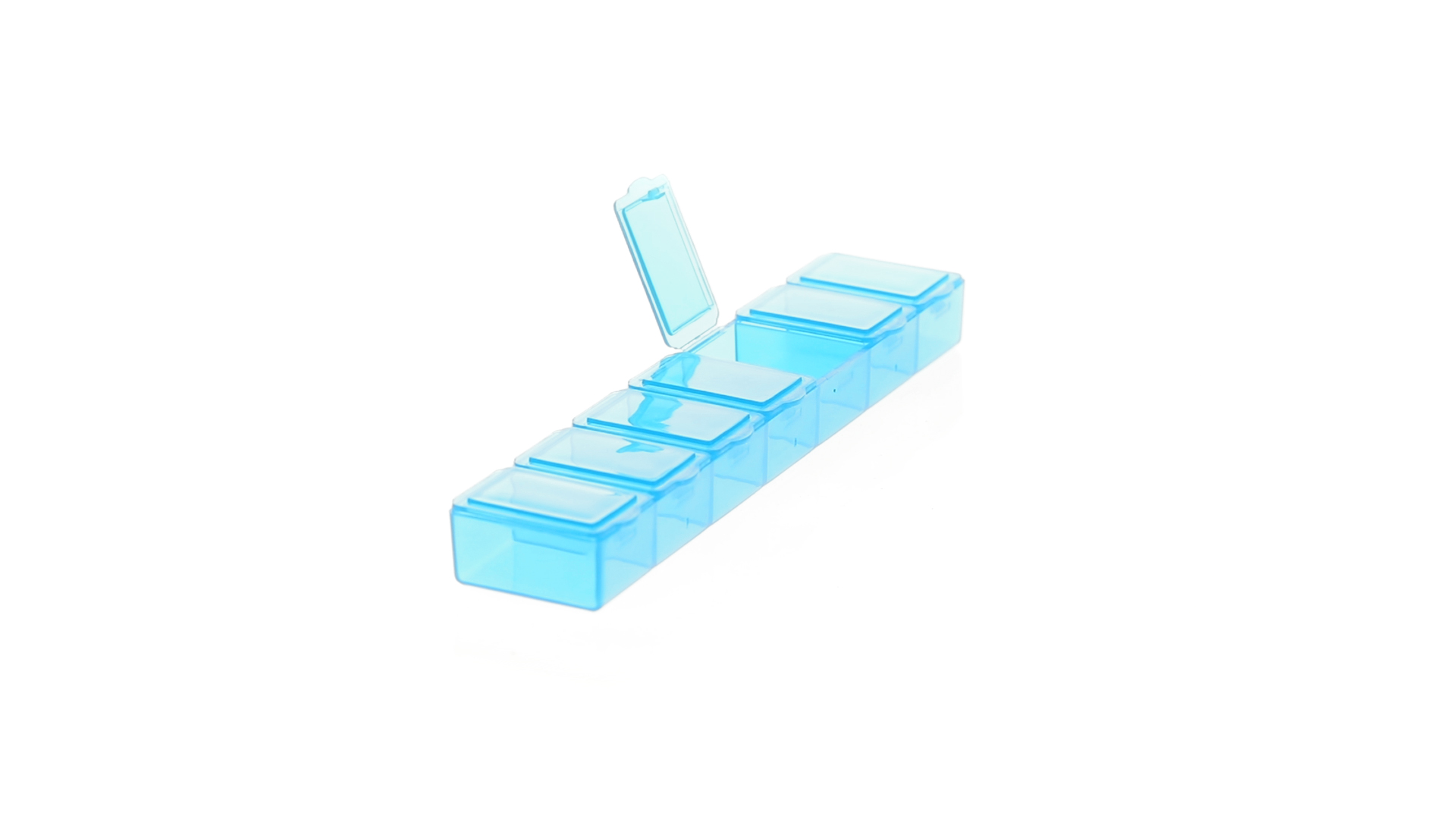 Pillendose aus robustem, halbtransparentem Material in lebendigen Farben mit einem Fach für jeden Wochentag. Mit 7 einzelnen Fächern mit Sicherheitsverschluss.