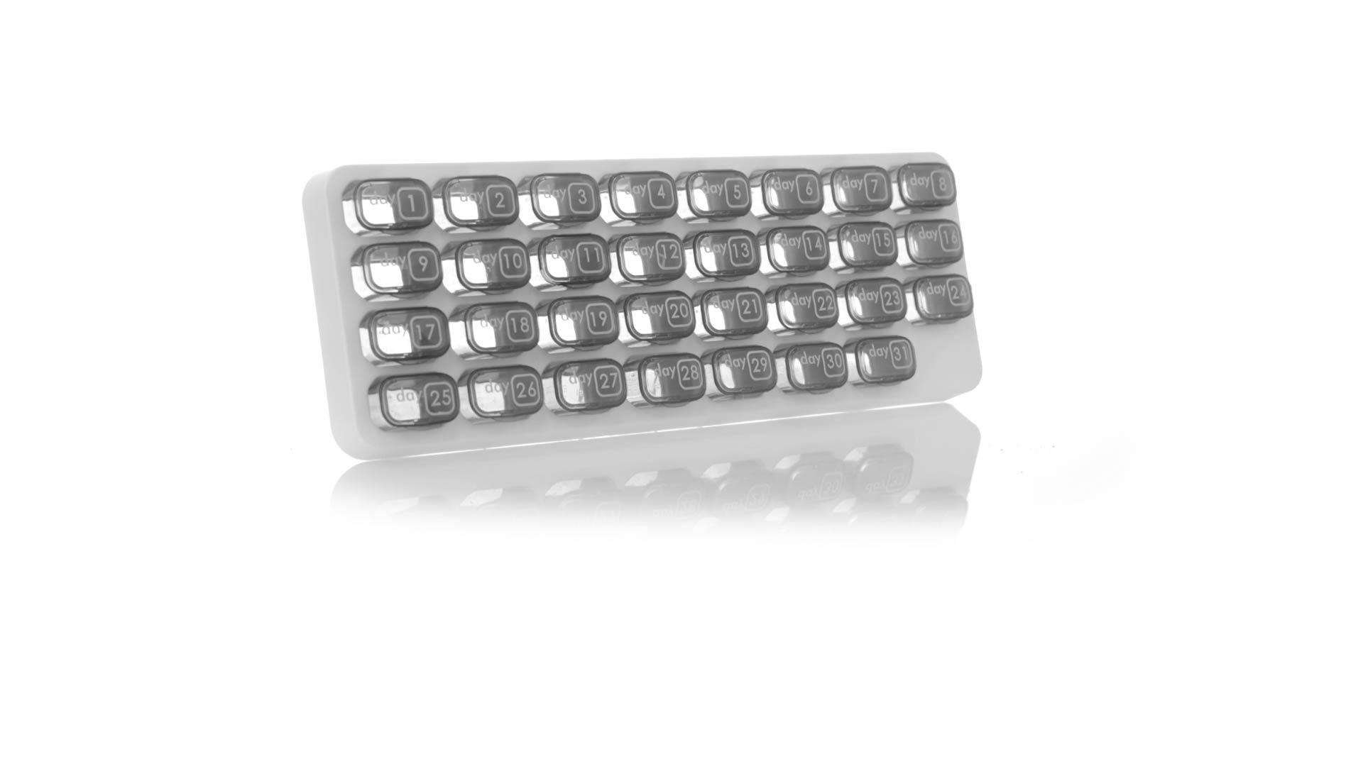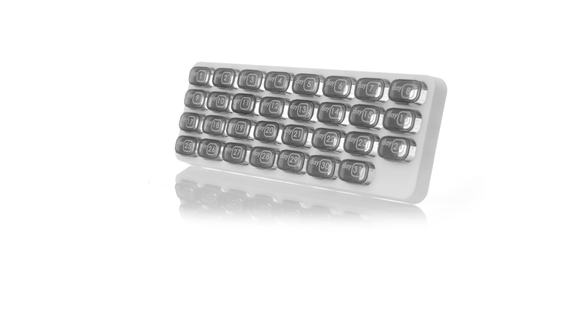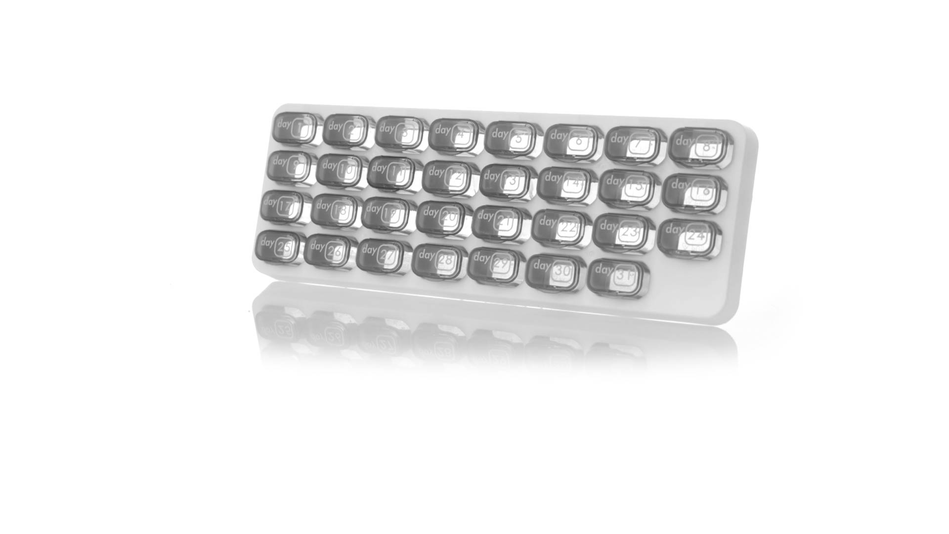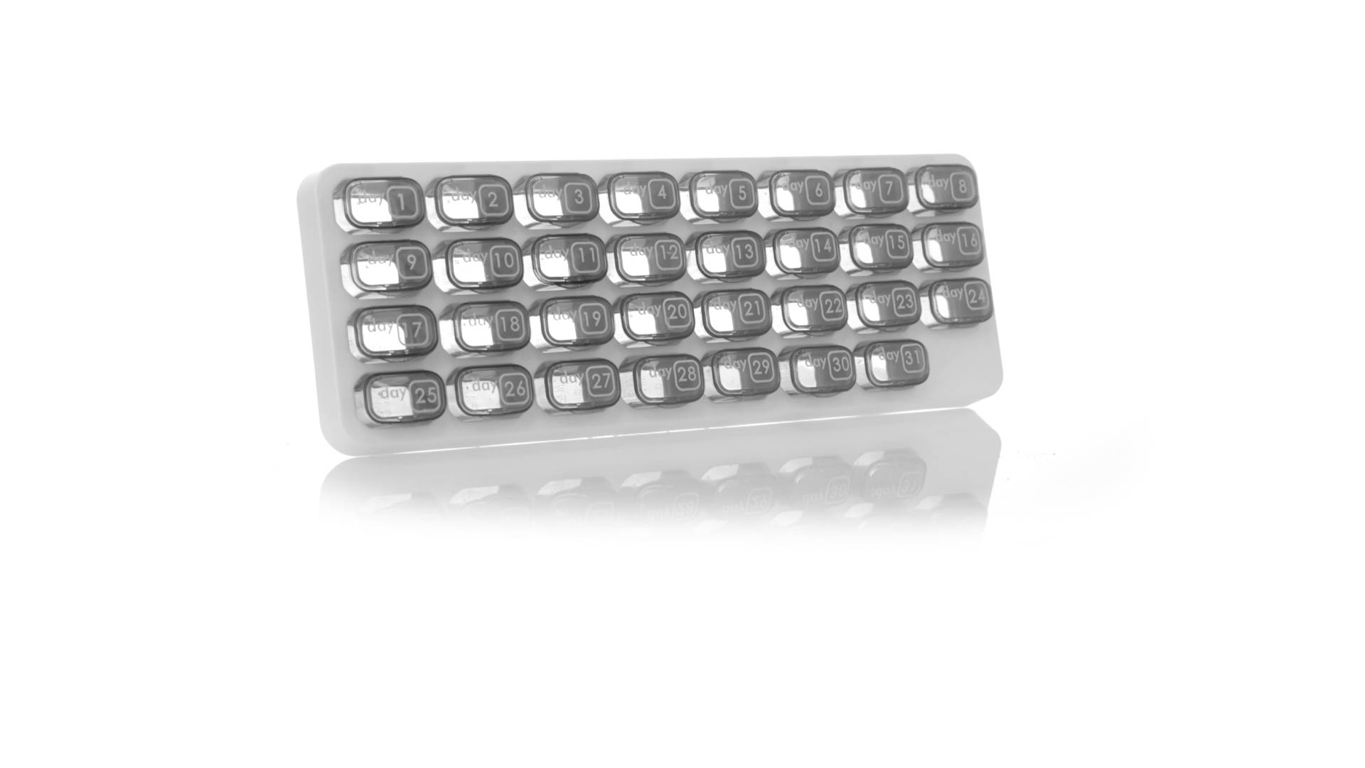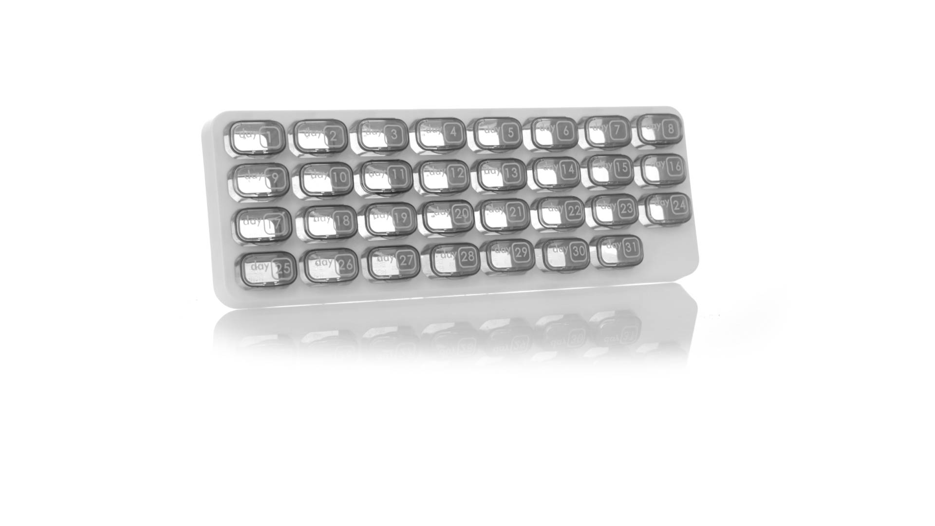 Original pastillero mensual, hergestellt aus widerstandsfähigem PP, mit 31 unabhängigen Behältern und Extras, um alle am Tag benötigten Pastillas zu schützen. Con base blanca y cajas greys impresas con el day del mes. Präsentiert in einer individuellen Tasche.
