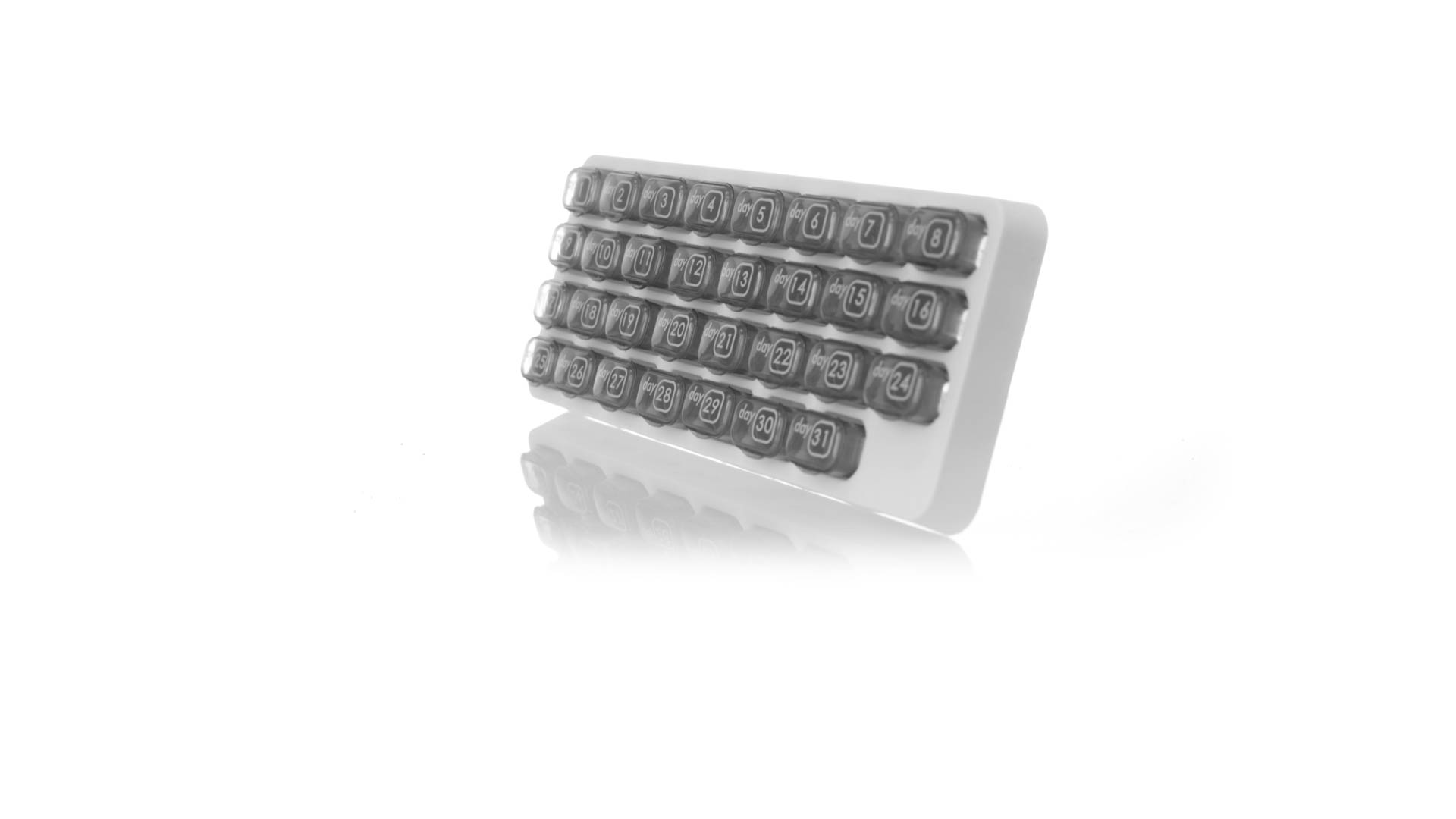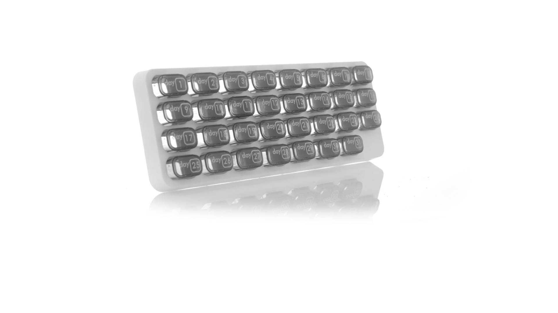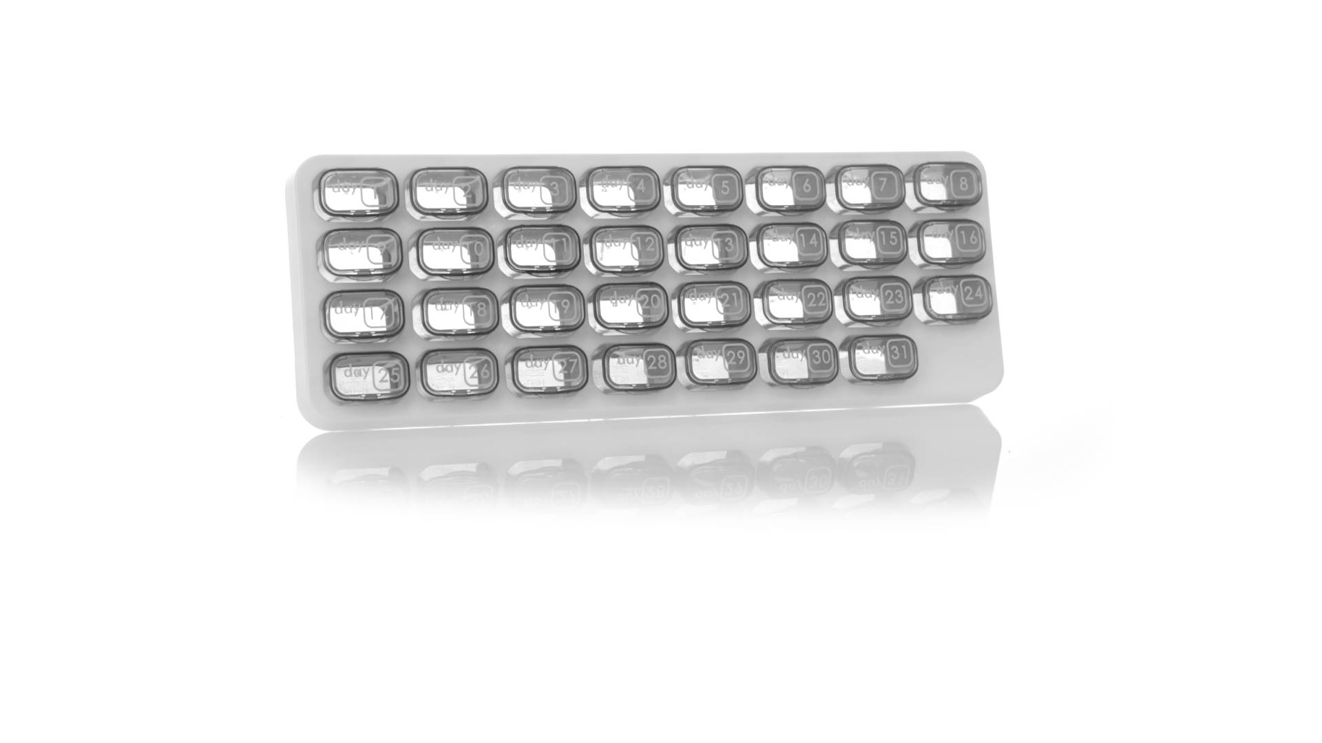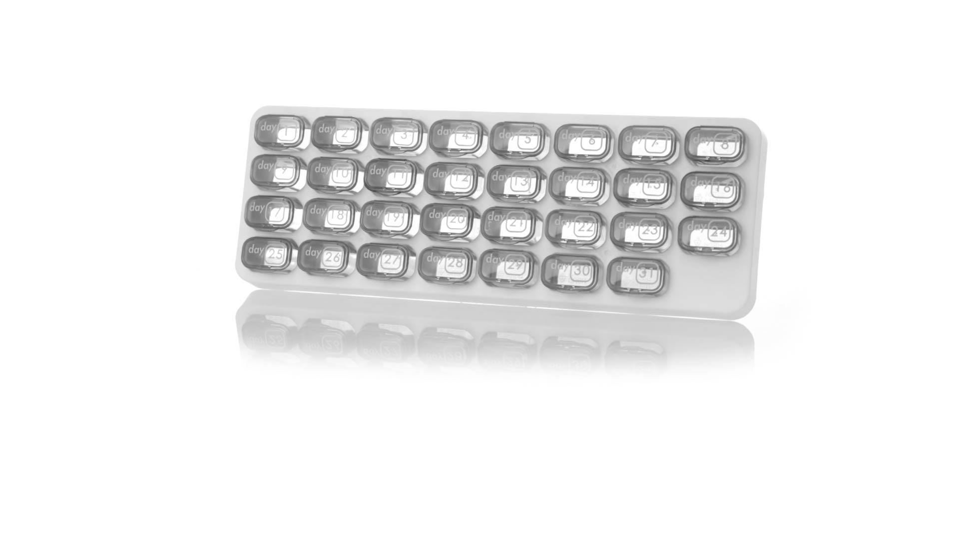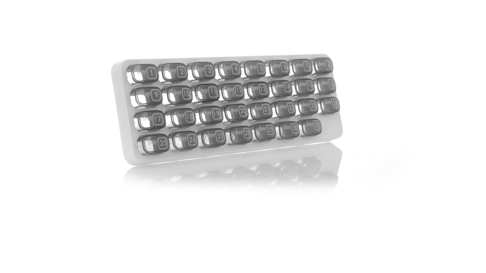 Original pastillero mensual, hergestellt aus widerstandsfähigem PP, mit 31 unabhängigen Behältern und Extras, um alle am Tag benötigten Pastillas zu schützen. Con base blanca y cajas greys impresas con el day del mes. Präsentiert in einer individuellen Tasche.