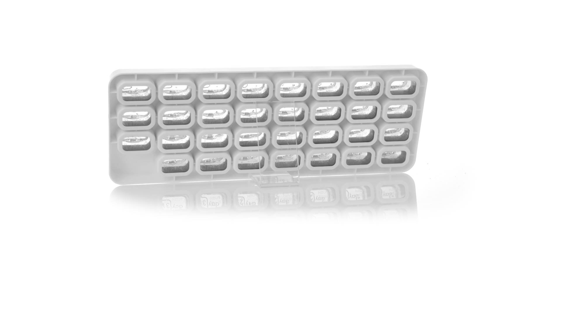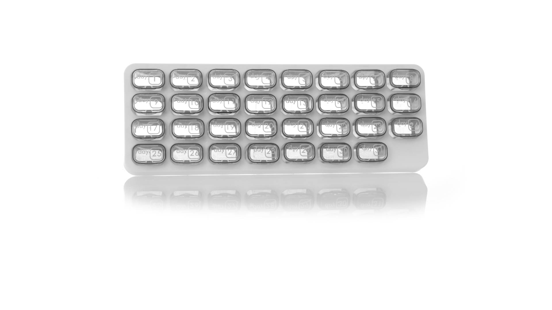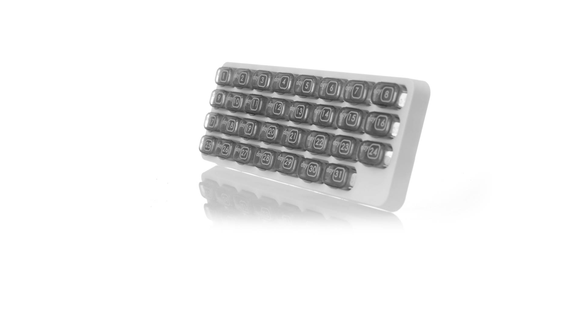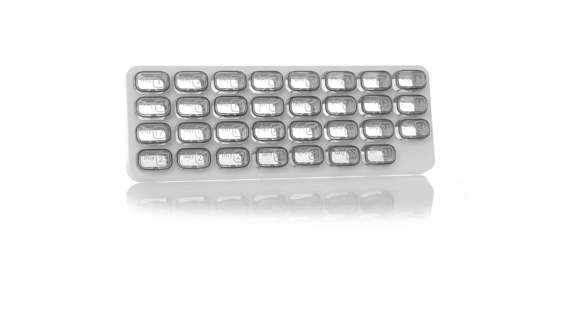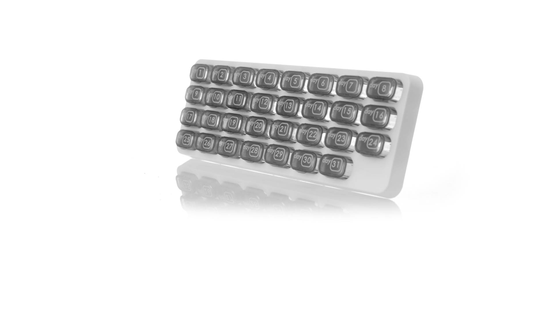 Original pastillero mensual, hergestellt aus widerstandsfähigem PP, mit 31 unabhängigen Behältern und Extras, um alle am Tag benötigten Pastillas zu schützen. Con base blanca y cajas greys impresas con el day del mes. Präsentiert in einer individuellen Tasche.